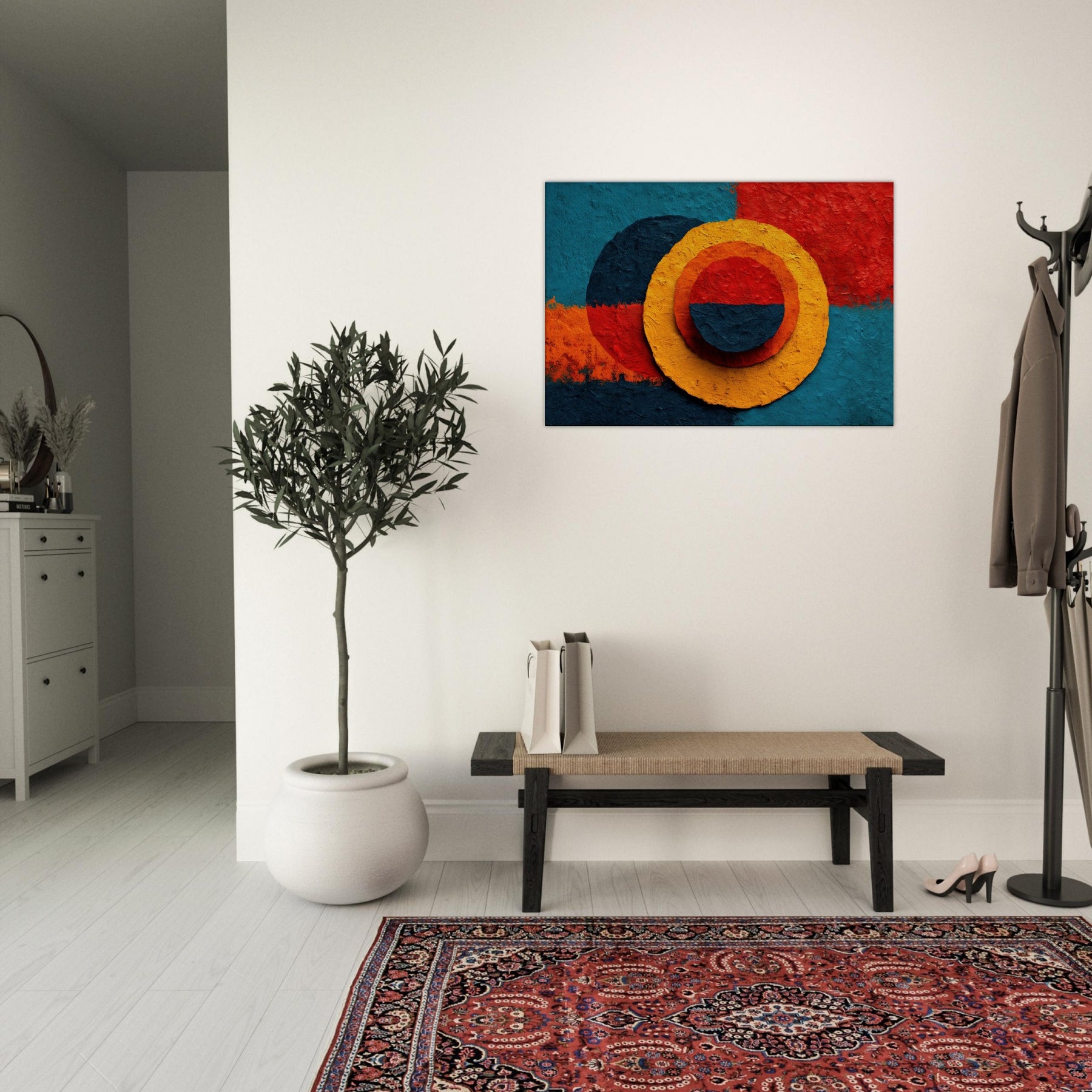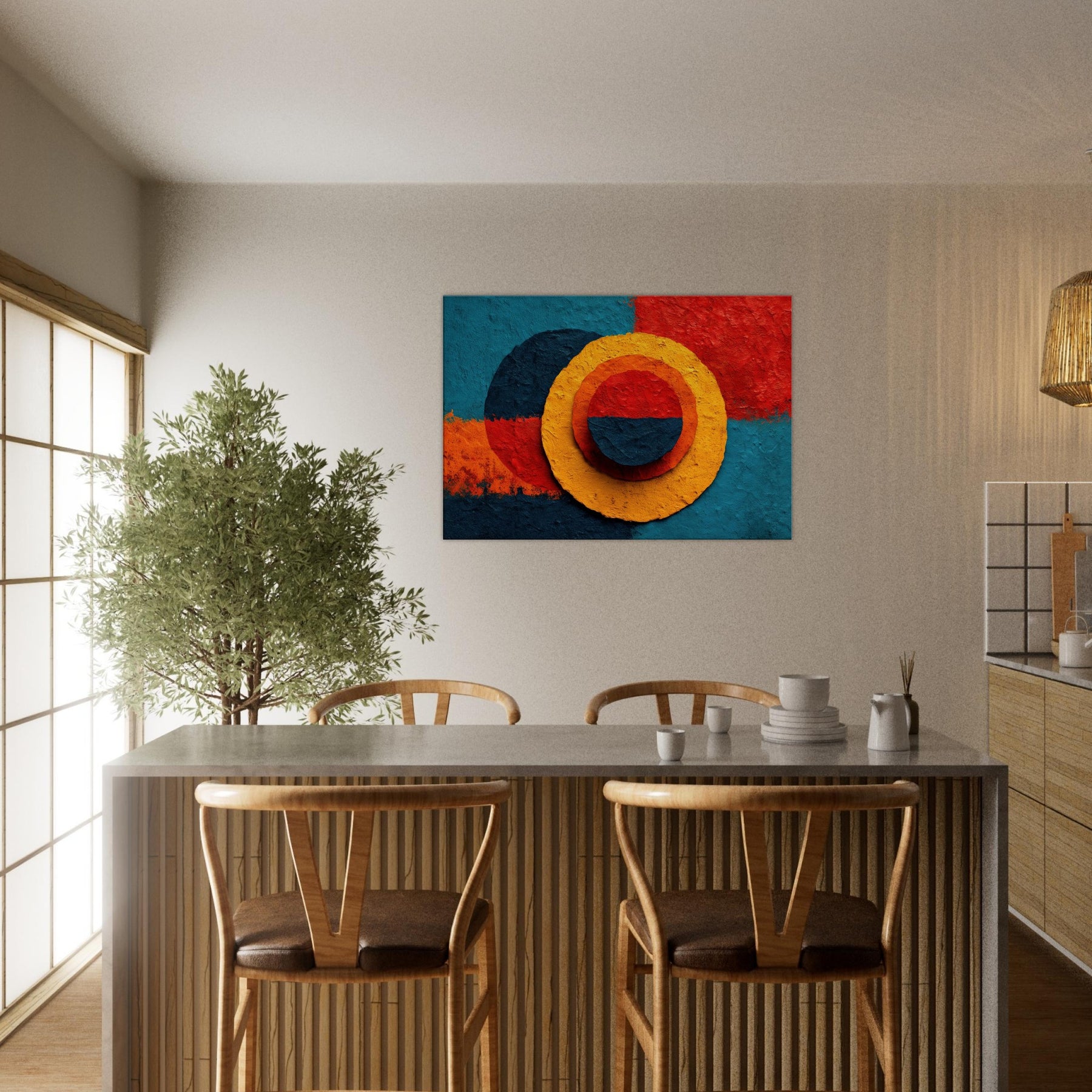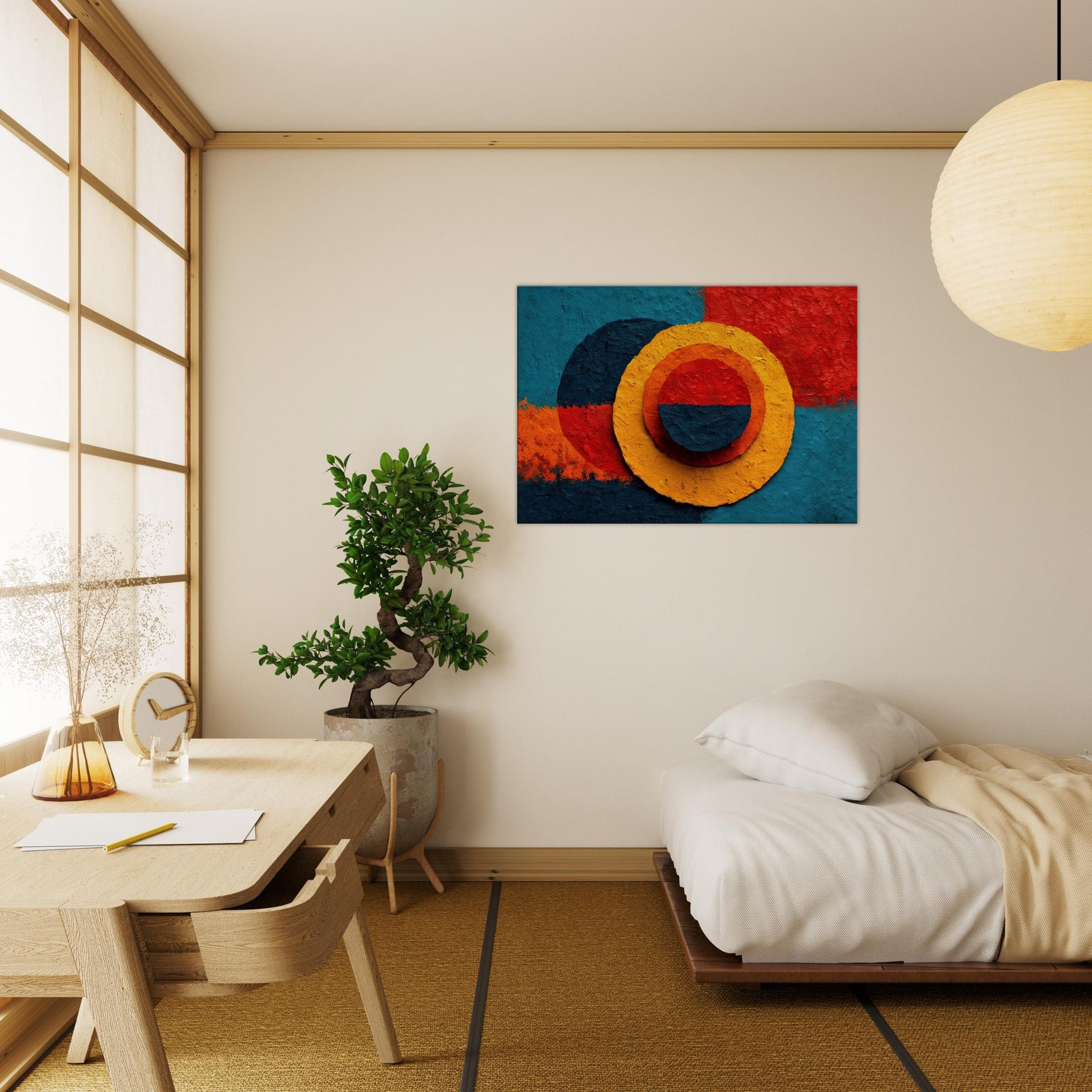 Embrace stillness and color with the Ensō, a luminous circle that suggests both completion and invitation. This abstract composition folds layers of pigment into softly hammered rings golden yellows, fiery reds, and midnight blues creating a rhythmic pulse across the wall. The tactile texture invites the eye to wander, turning a quiet corner into a sanctuary where mindfulness meets modern living. Hang it where light shifts daily, and let the circle echo your breath and space. The central subject is Ensō (Zen Circle).