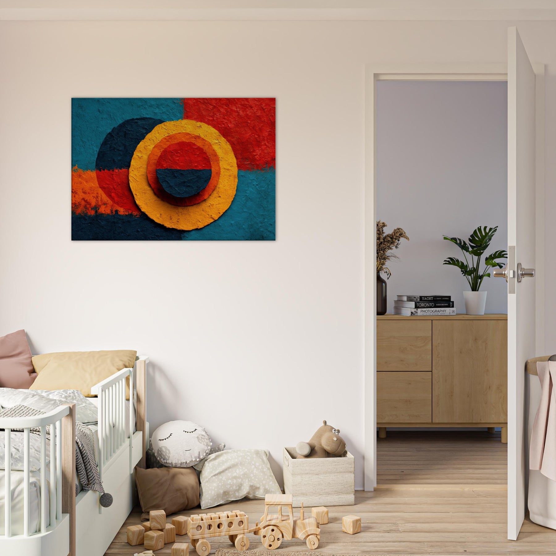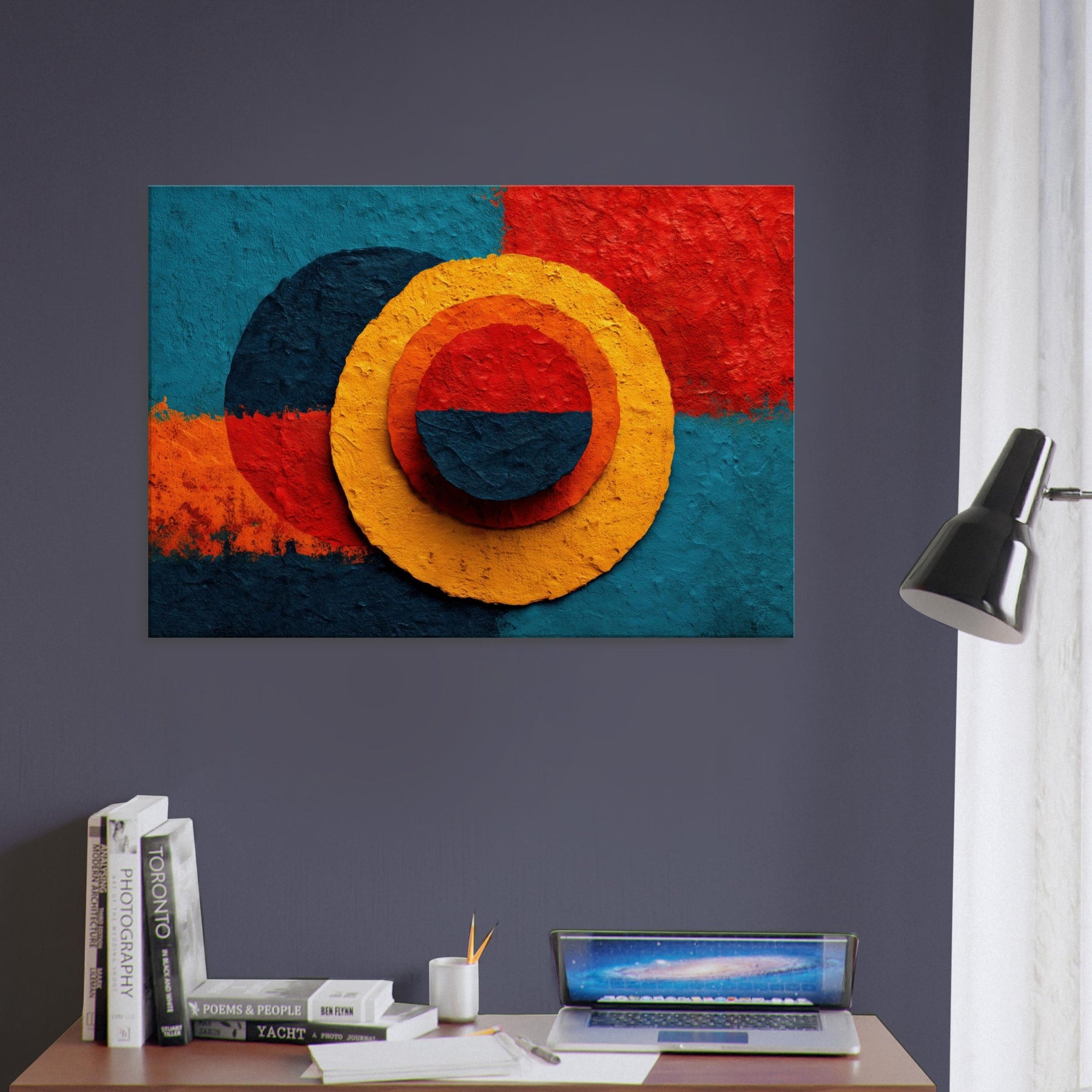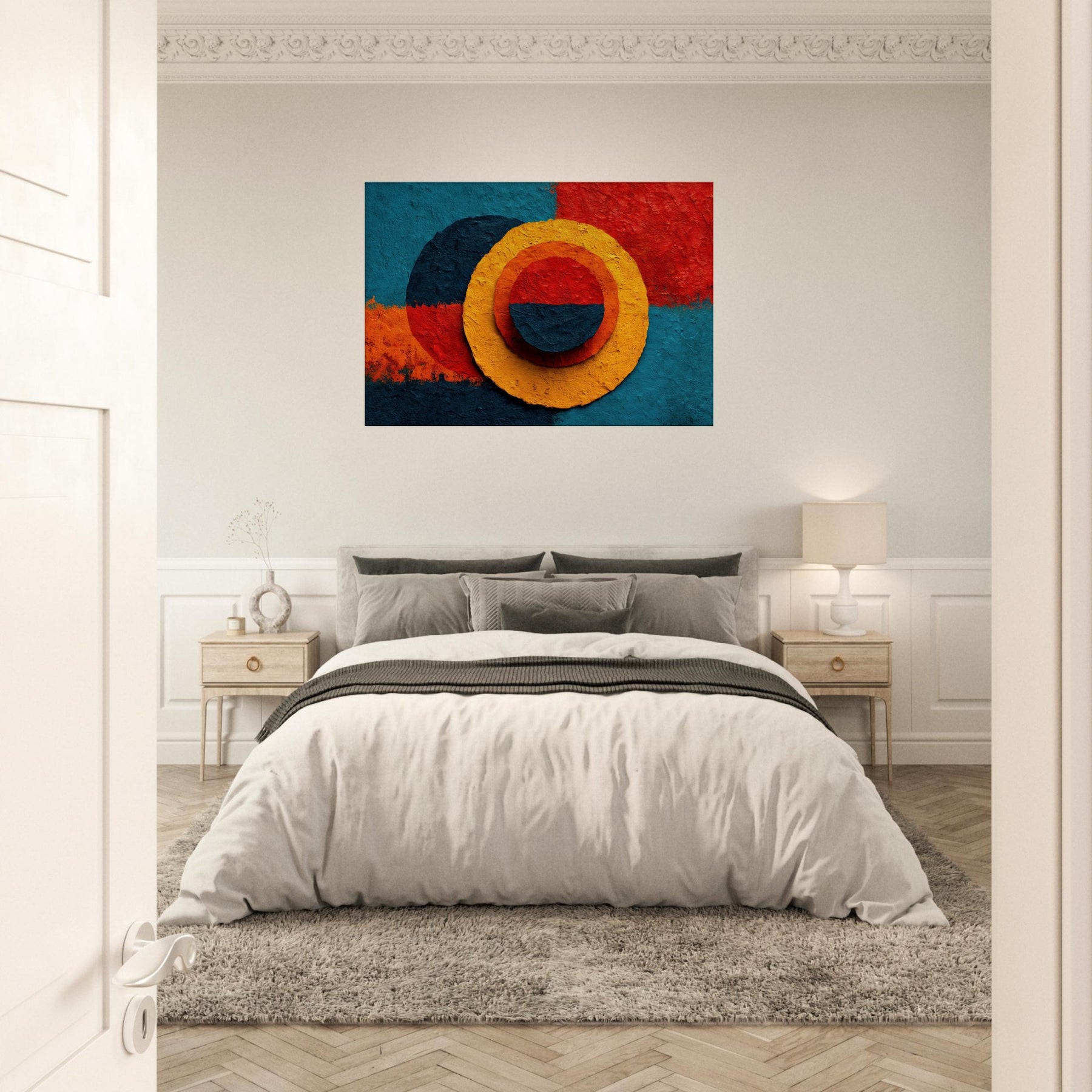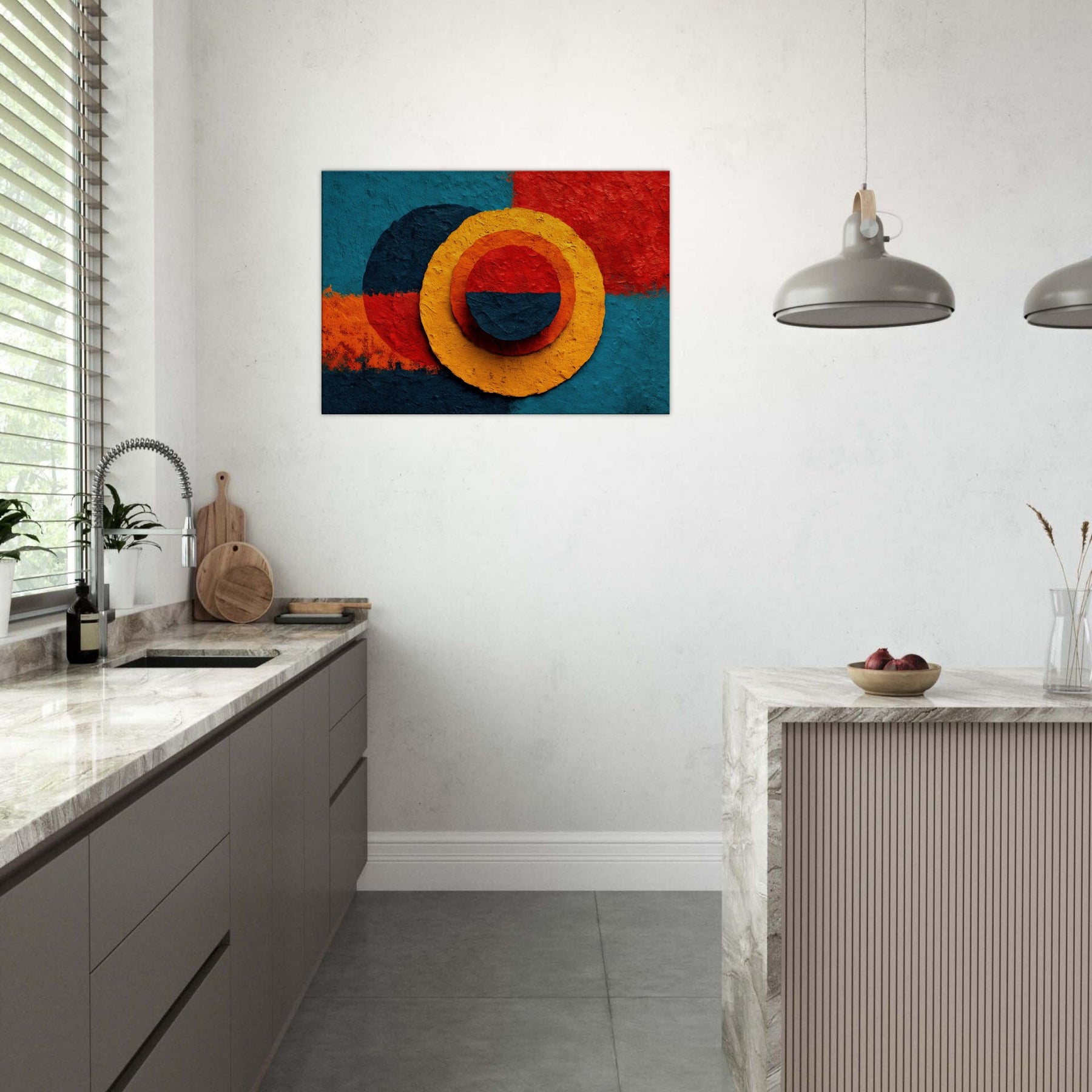 Embrace stillness and color with the Ensō, a luminous circle that suggests both completion and invitation. This abstract composition folds layers of pigment into softly hammered rings golden yellows, fiery reds, and midnight blues creating a rhythmic pulse across the wall. The tactile texture invites the eye to wander, turning a quiet corner into a sanctuary where mindfulness meets modern living. Hang it where light shifts daily, and let the circle echo your breath and space. The central subject is Ensō (Zen Circle).