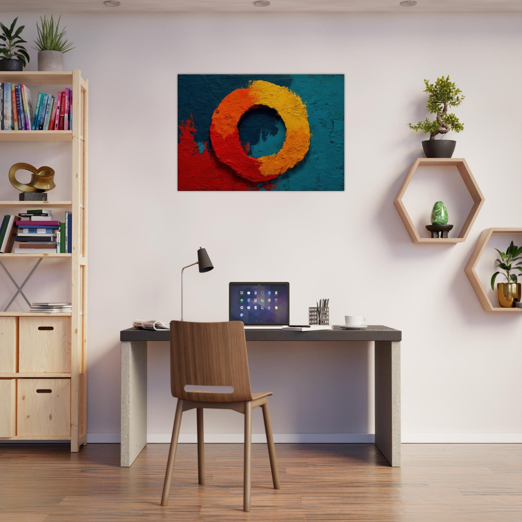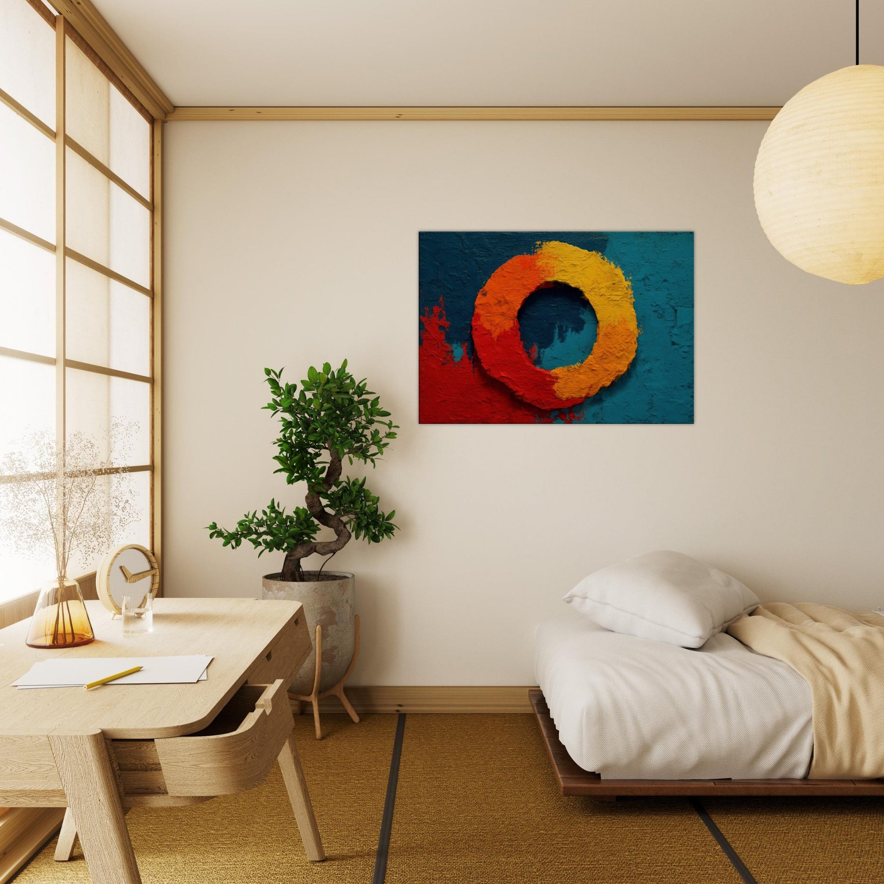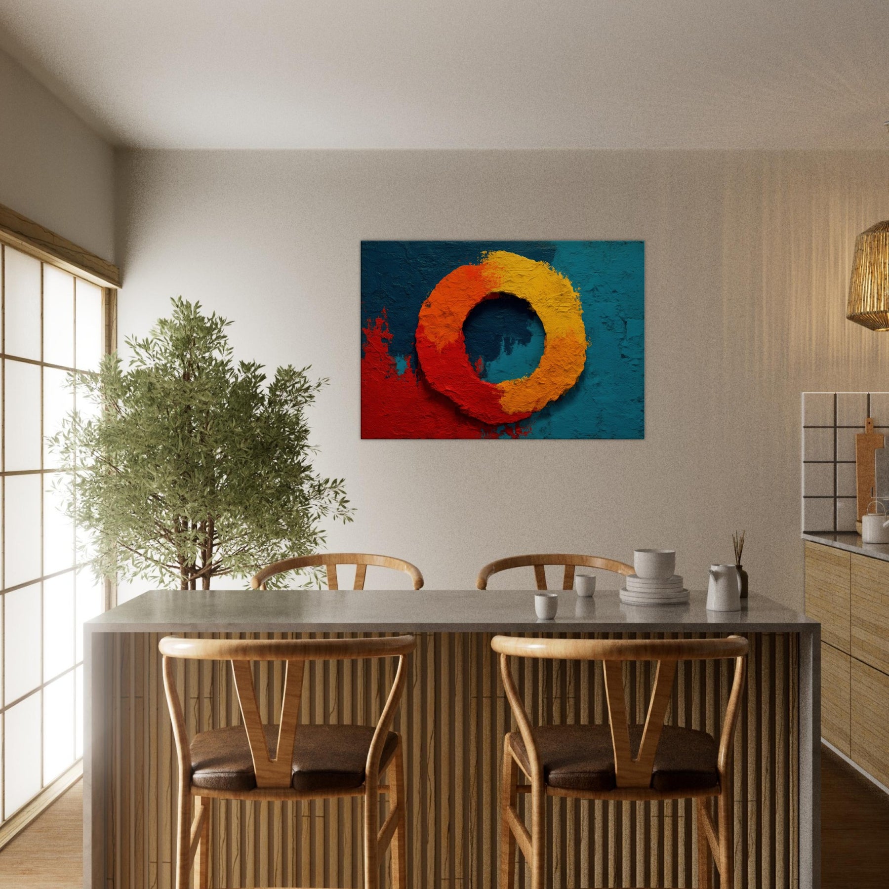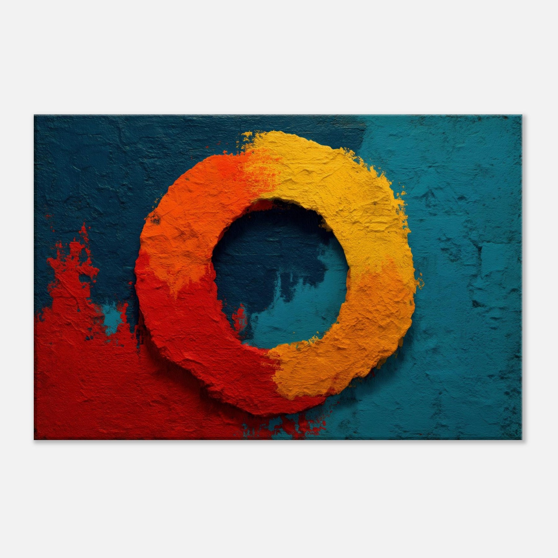 This piece centers on the Primary Subject, Ensō (Zen Circle), a luminous loop that suggests both beginning and release. The warm gradient red, orange, and yellow sits against a deep teal field, evoking sunrise and stillness in one breath. The texture is tactile, like carved stone, inviting slow study; light shifts across the ring, making the circle feel alive. Perfect for a living room or study, it brings meditative calm, subtle drama, and a mystical glow that elevates everyday space.