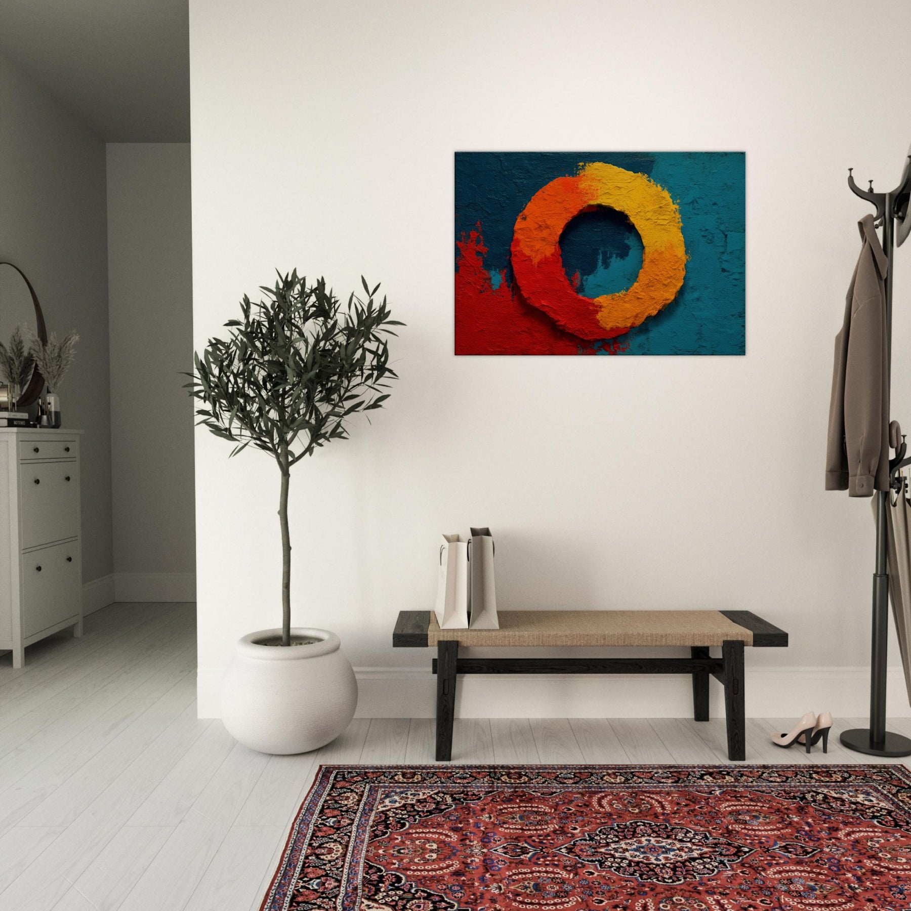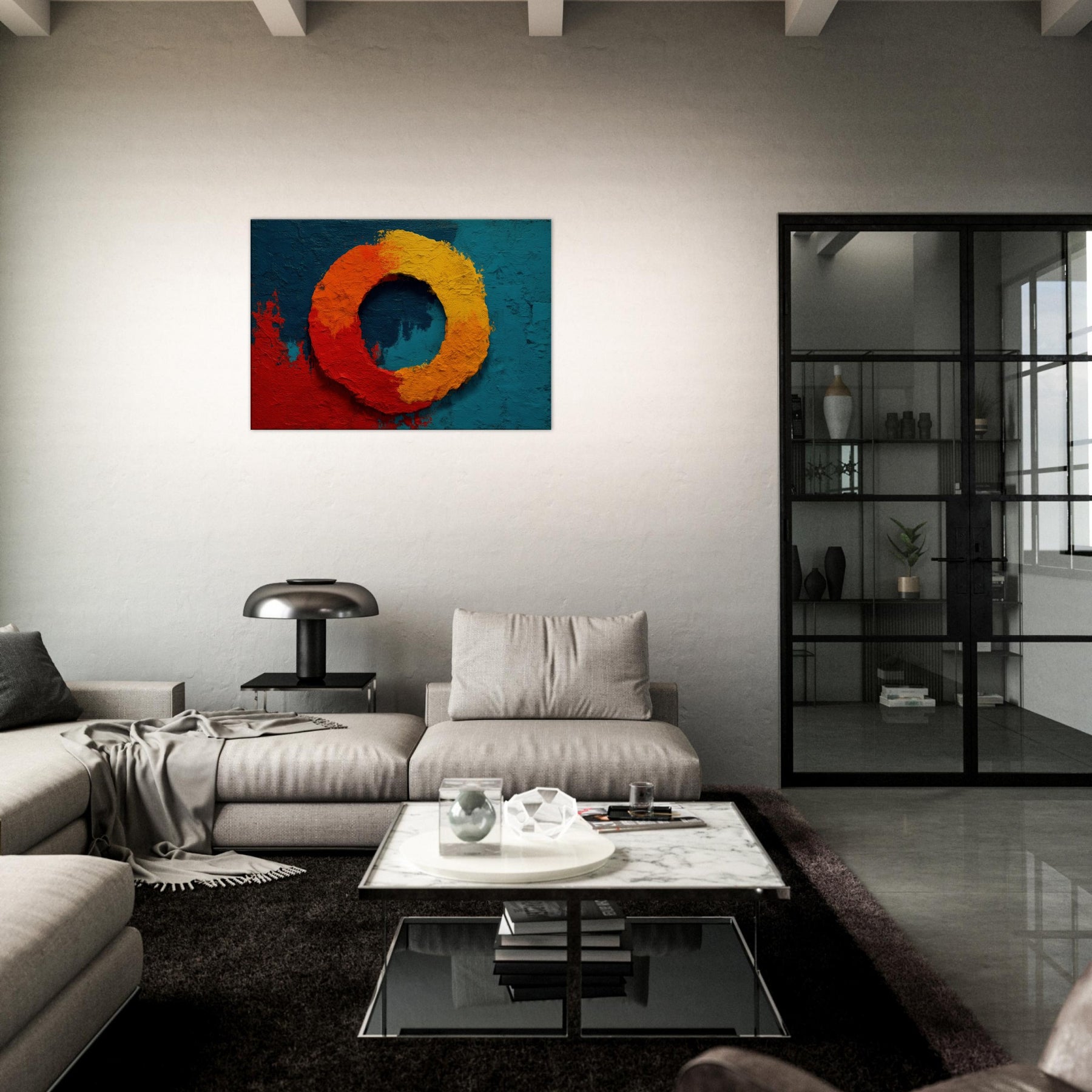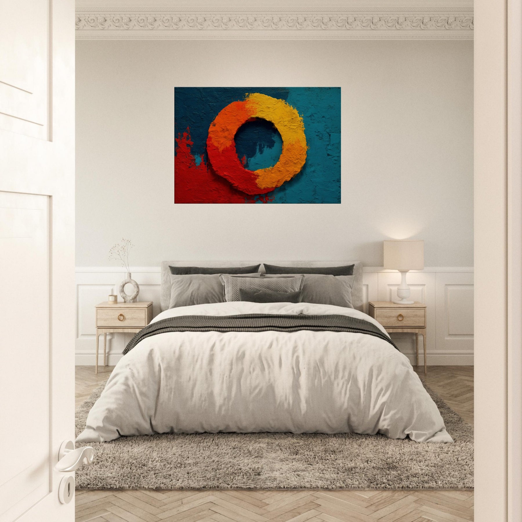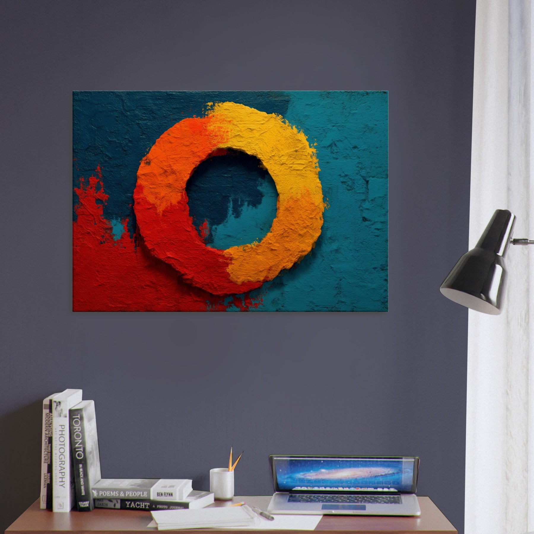 This piece centers on the Primary Subject, Ensō (Zen Circle), a luminous loop that suggests both beginning and release. The warm gradient red, orange, and yellow sits against a deep teal field, evoking sunrise and stillness in one breath. The texture is tactile, like carved stone, inviting slow study; light shifts across the ring, making the circle feel alive. Perfect for a living room or study, it brings meditative calm, subtle drama, and a mystical glow that elevates everyday space.
