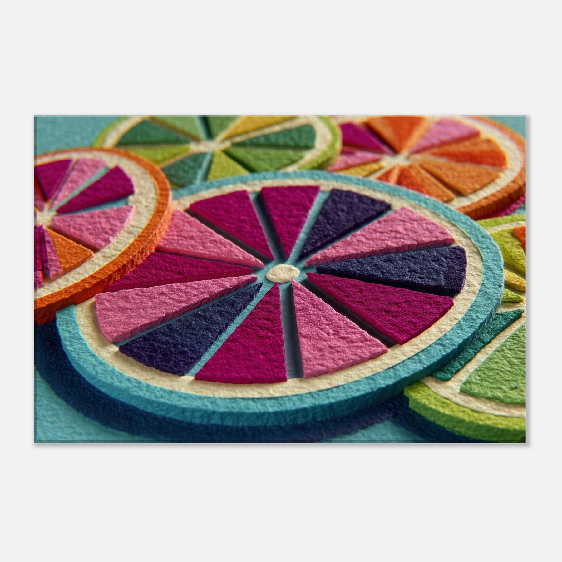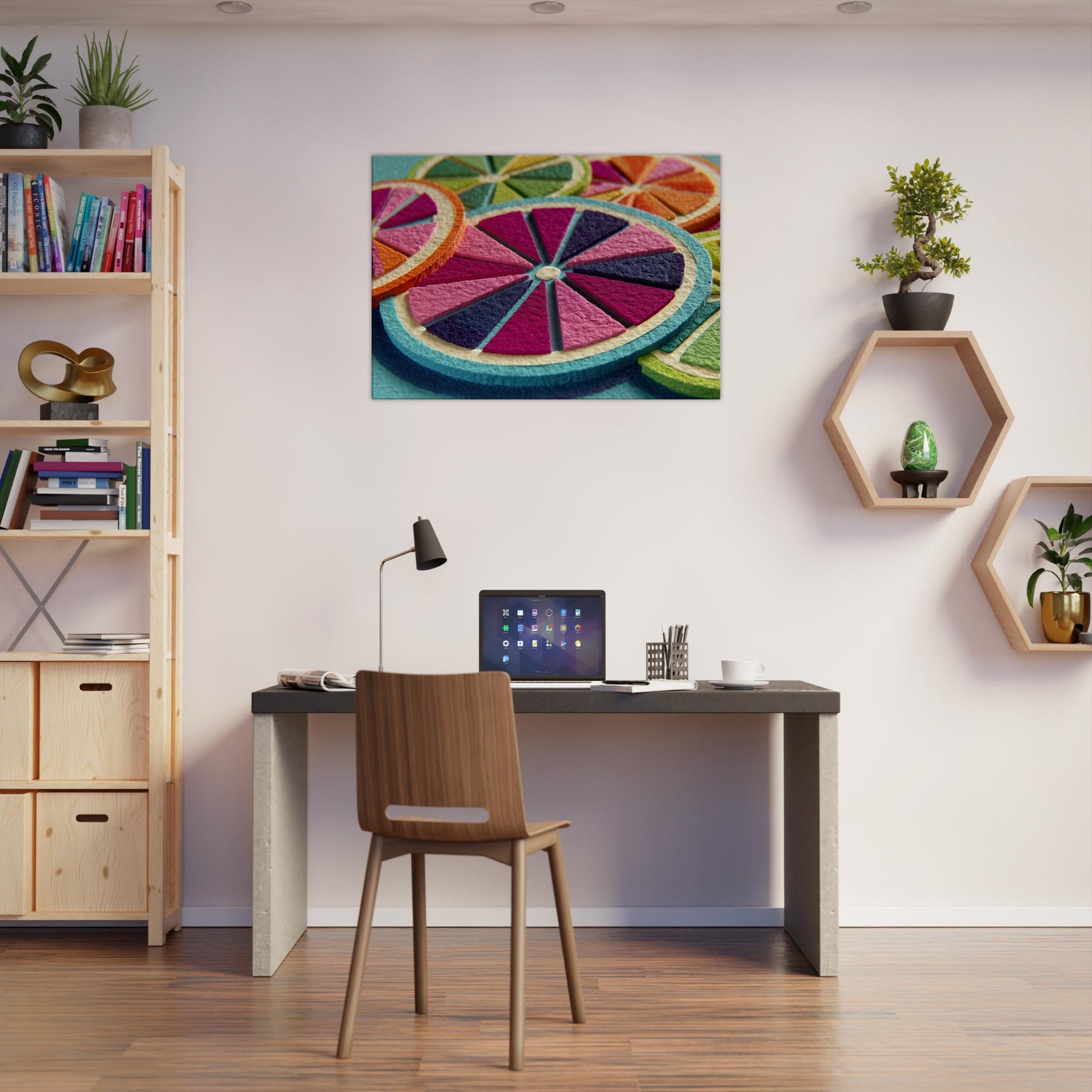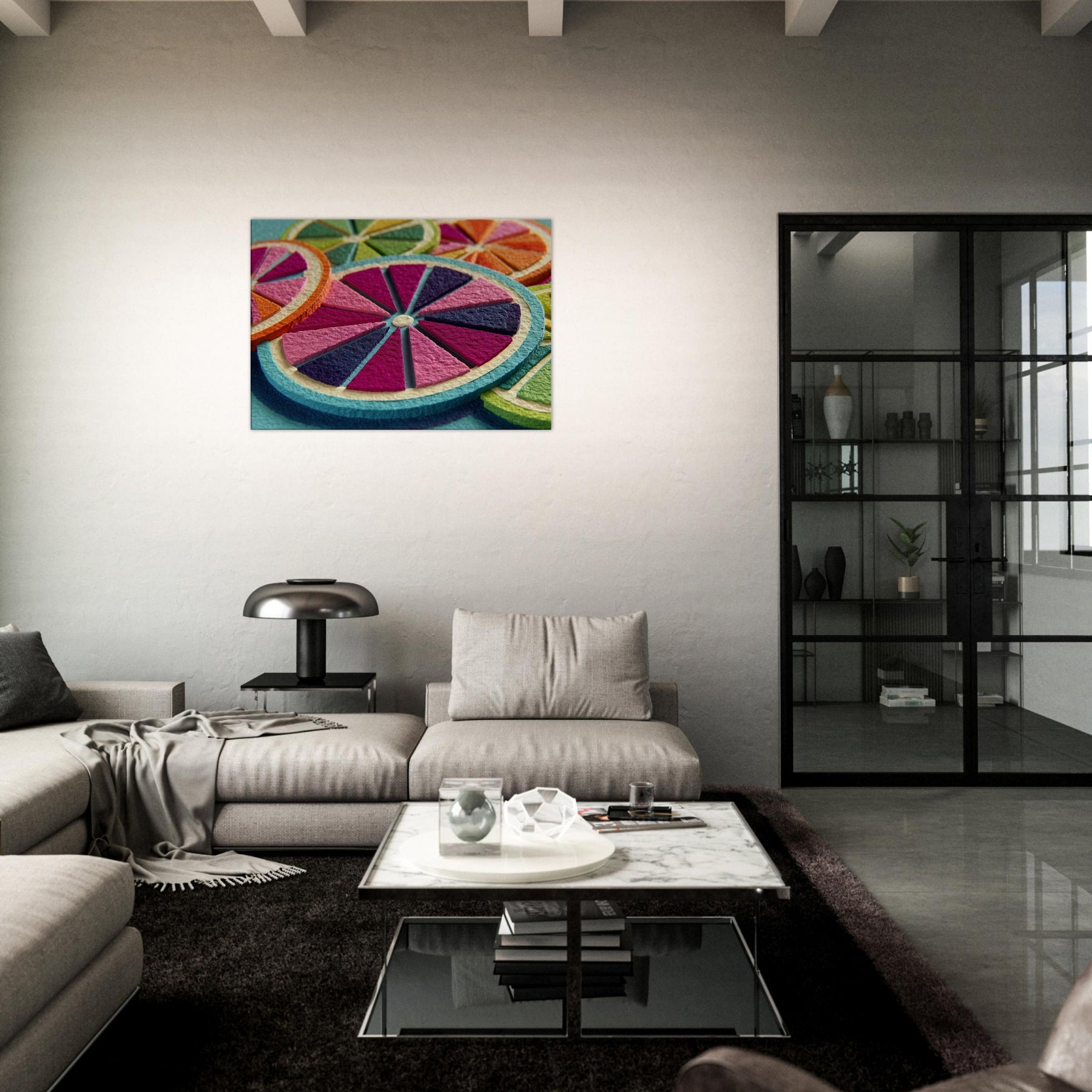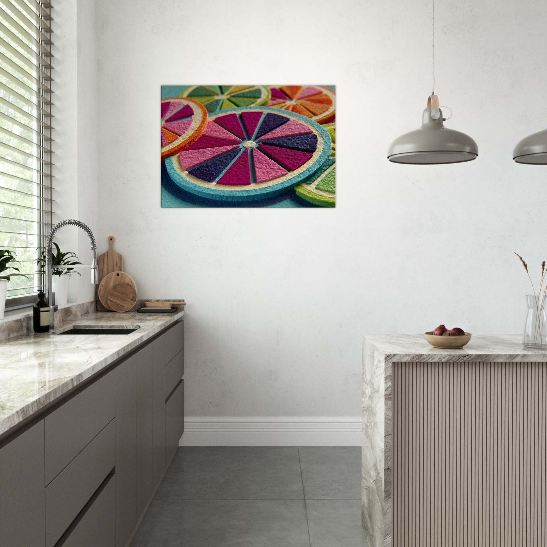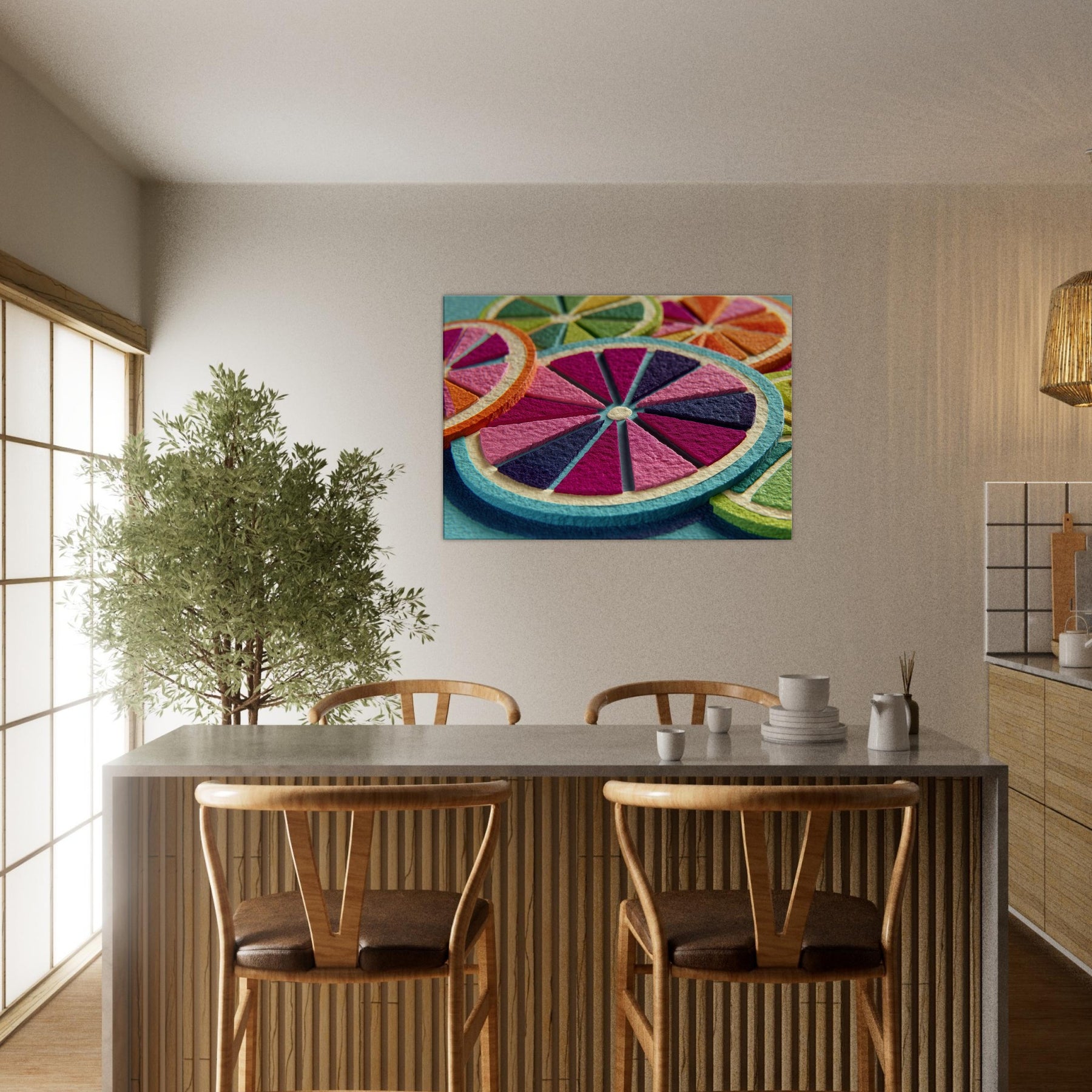 Fruit of Life unfolds as layered circles in a luminous mosaic of color and texture. This abstract composition breathes mysticism into a modern living space, inviting calm reflection as light catches each beveled edge and creates shifting shadows. The tactile relief and radiant palette evoke citrus sunrises and midnight skies alike, turning a wall into a devotional focal point. Perfect above a sofa or in a serene alcove, it transforms everyday rooms into a sanctuary of color, balance, and wonder.