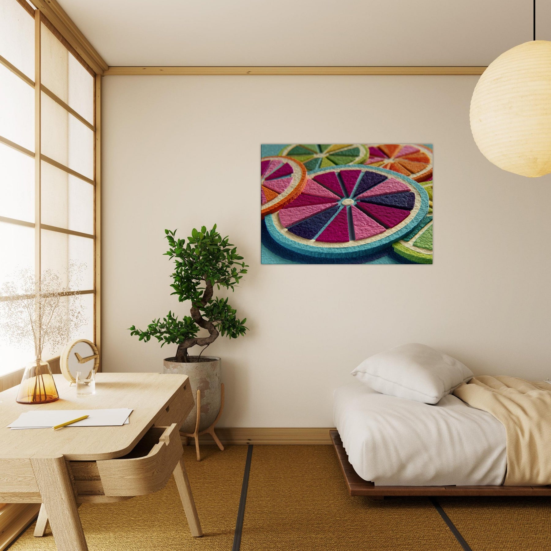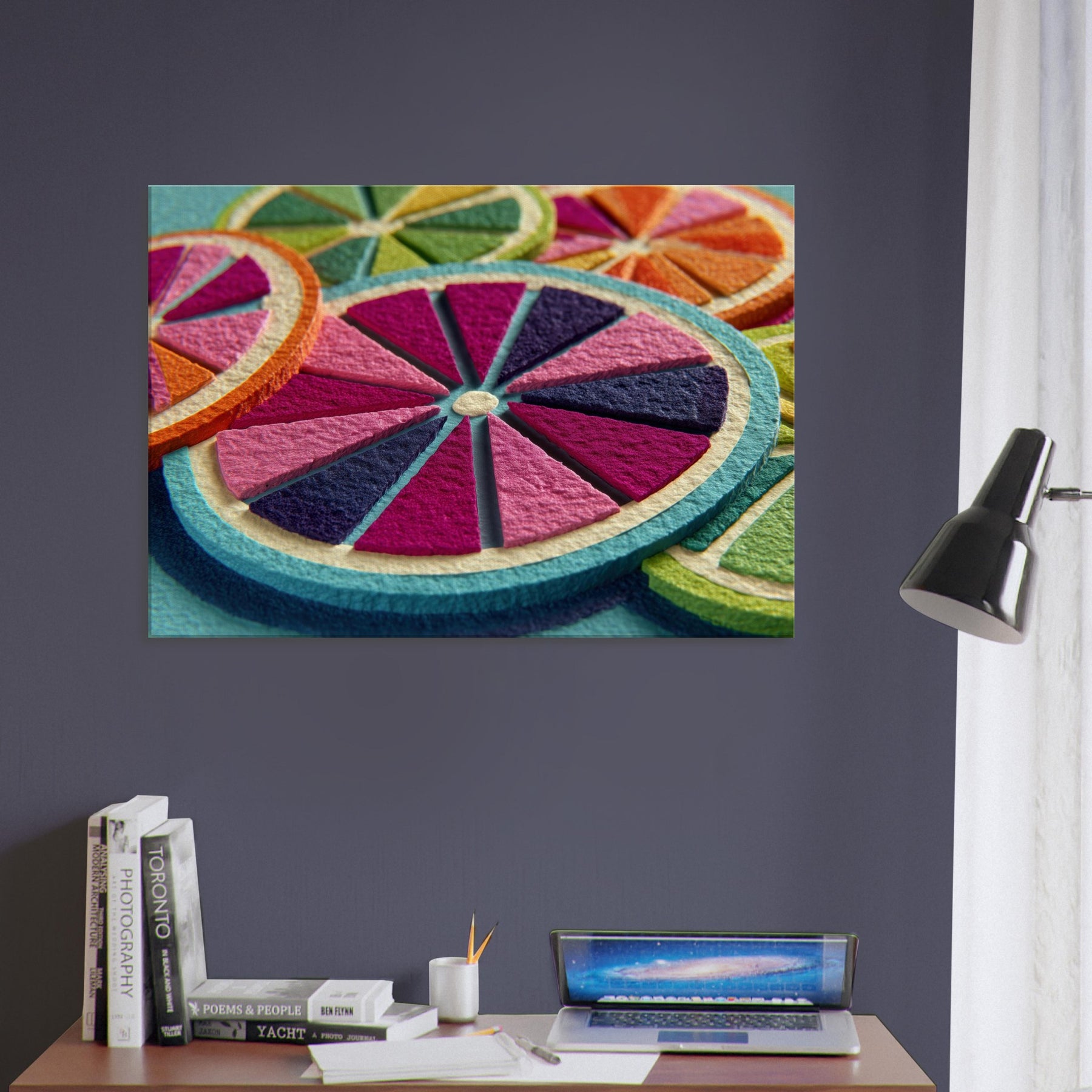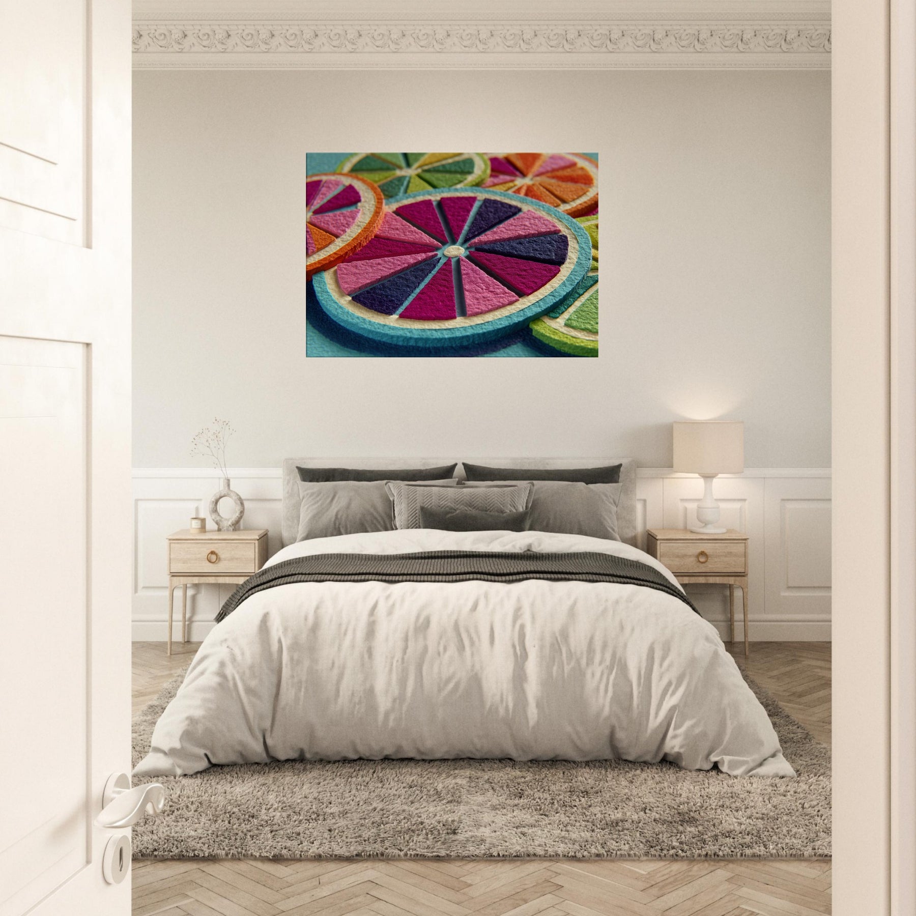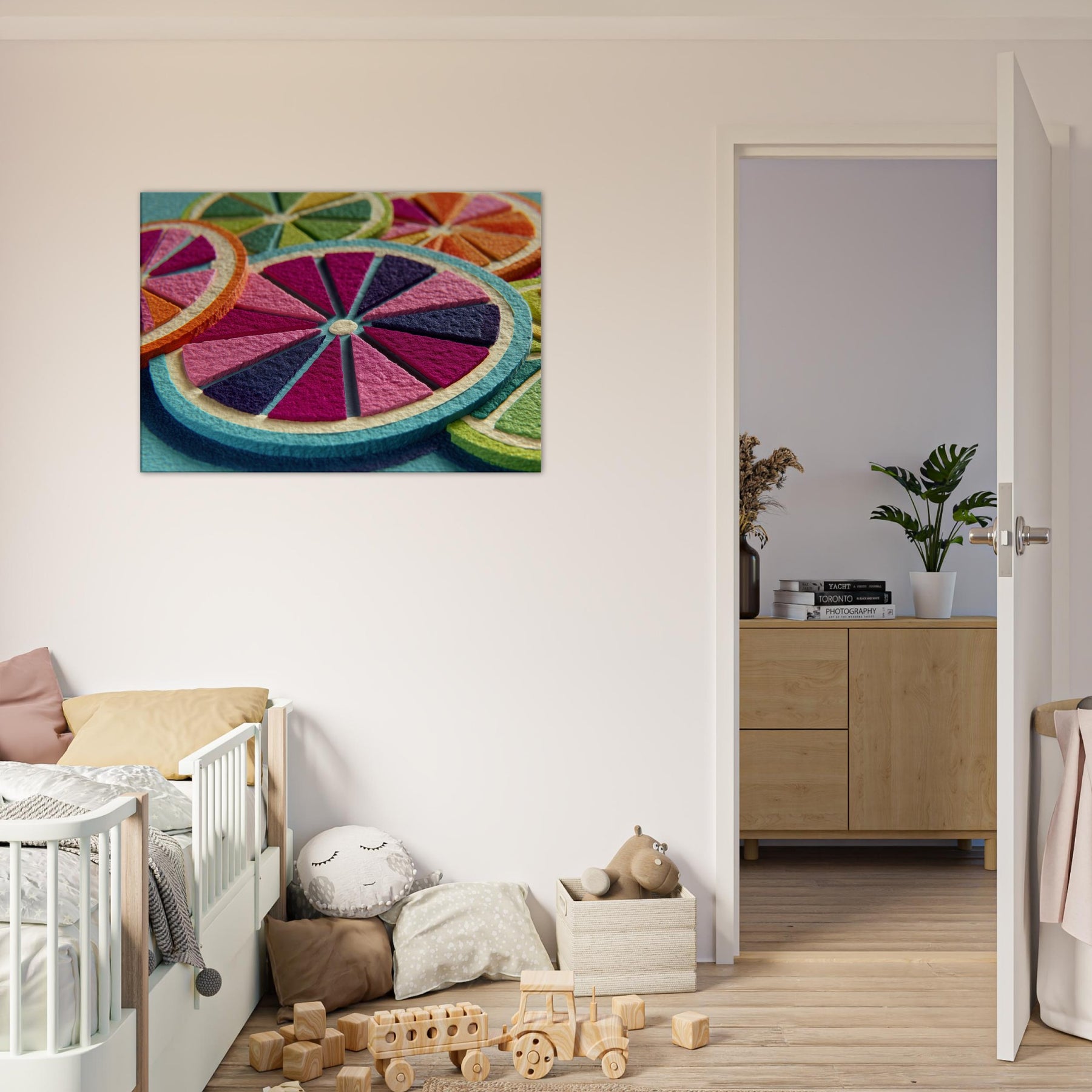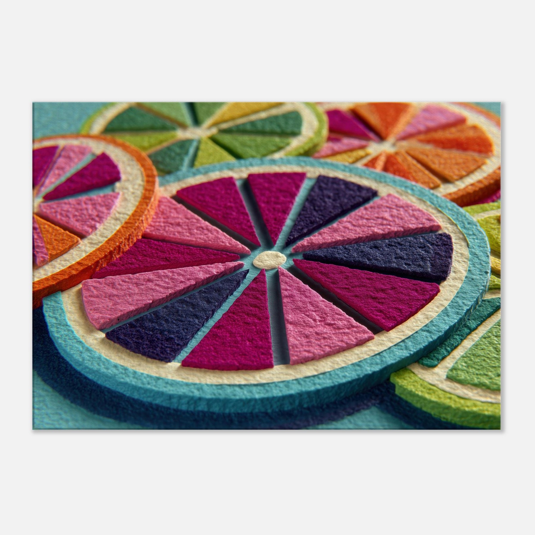 Fruit of Life unfolds as layered circles in a luminous mosaic of color and texture. This abstract composition breathes mysticism into a modern living space, inviting calm reflection as light catches each beveled edge and creates shifting shadows. The tactile relief and radiant palette evoke citrus sunrises and midnight skies alike, turning a wall into a devotional focal point. Perfect above a sofa or in a serene alcove, it transforms everyday rooms into a sanctuary of color, balance, and wonder.