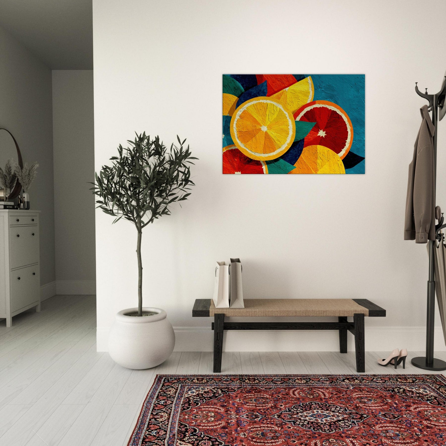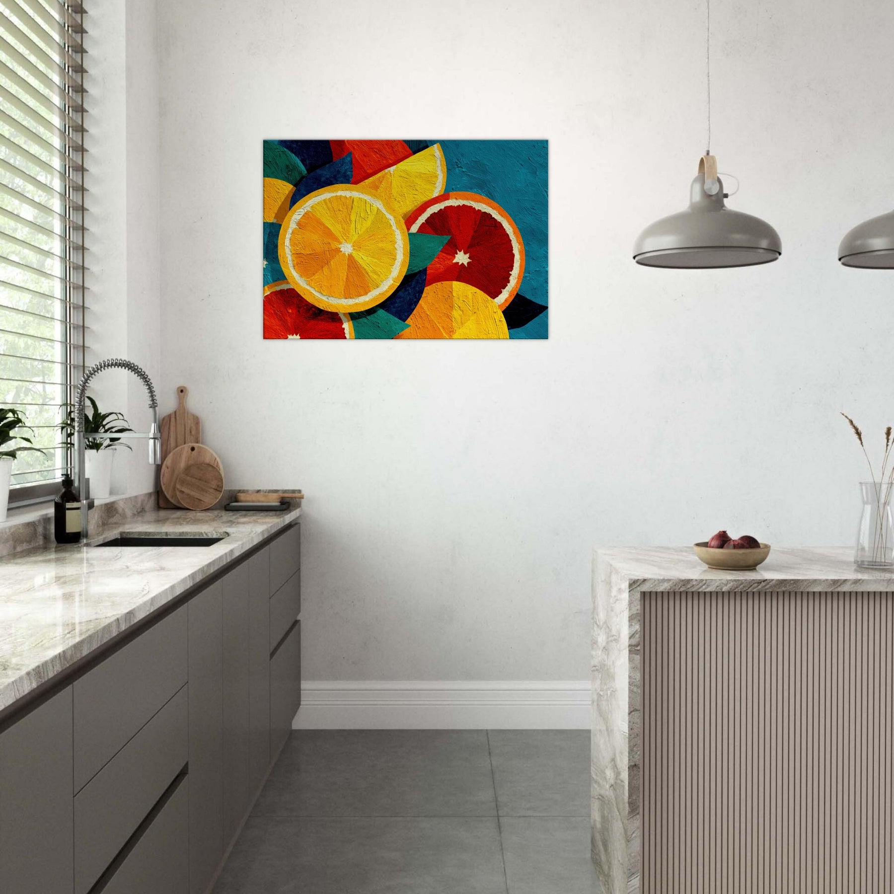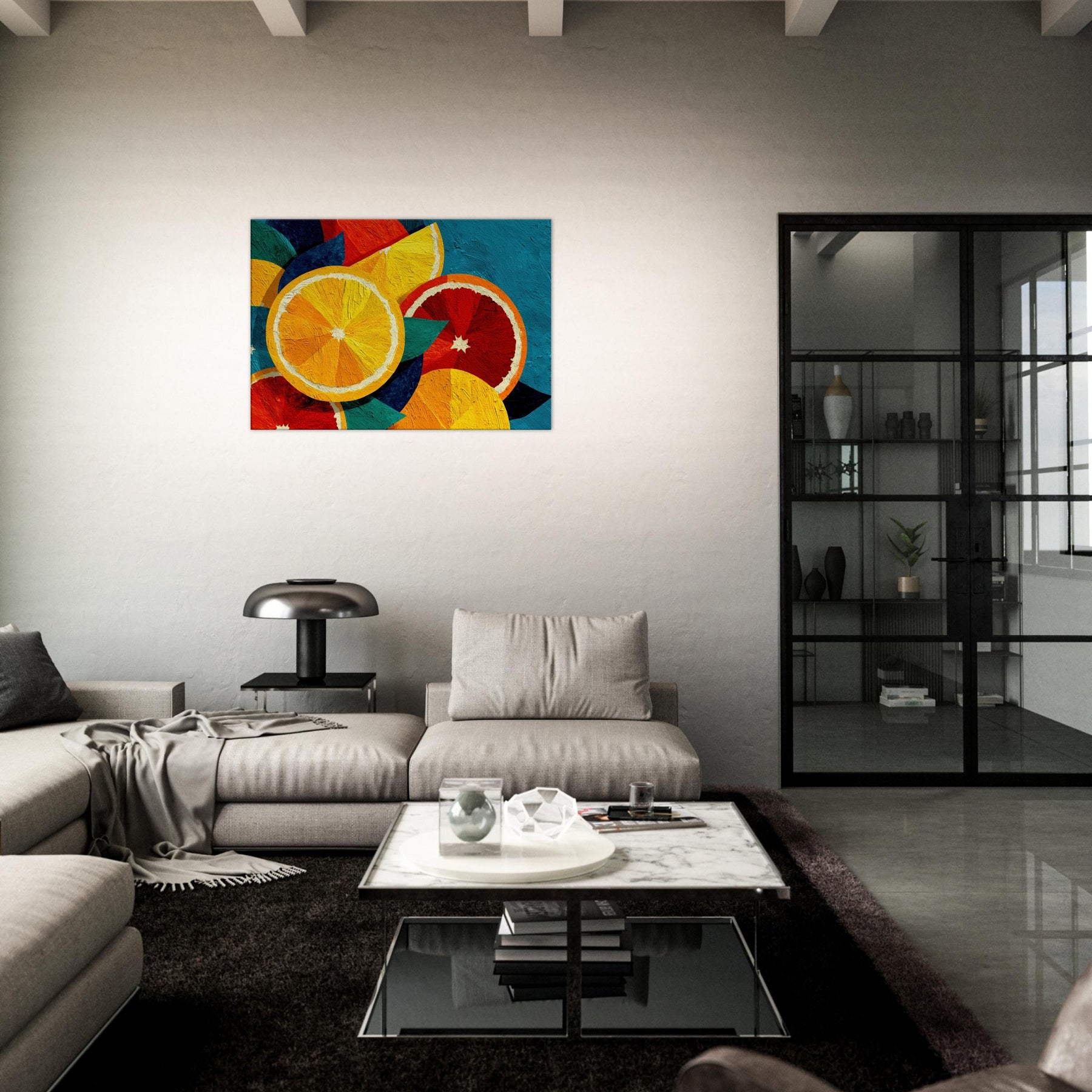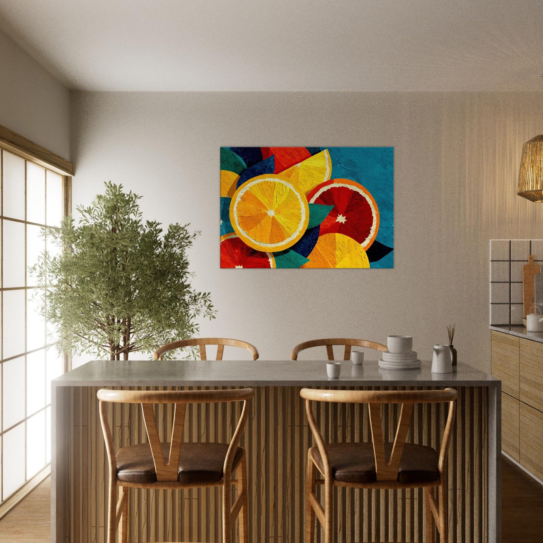 Bright, kinetic, and warm, this piece turns a kitchen moment into a radiant wall story. The Citrus Halves drift across a field of sun drenched color, where rind, pulp, and light become generous blocks of texture and tone. Layered brushwork and bold contrast invite a lingering glance, while the piece hums with a sunny energy that can elevate a living space. Perfect above a sofa or dining area, it awakens walls with lift and aroma of citrus summers.