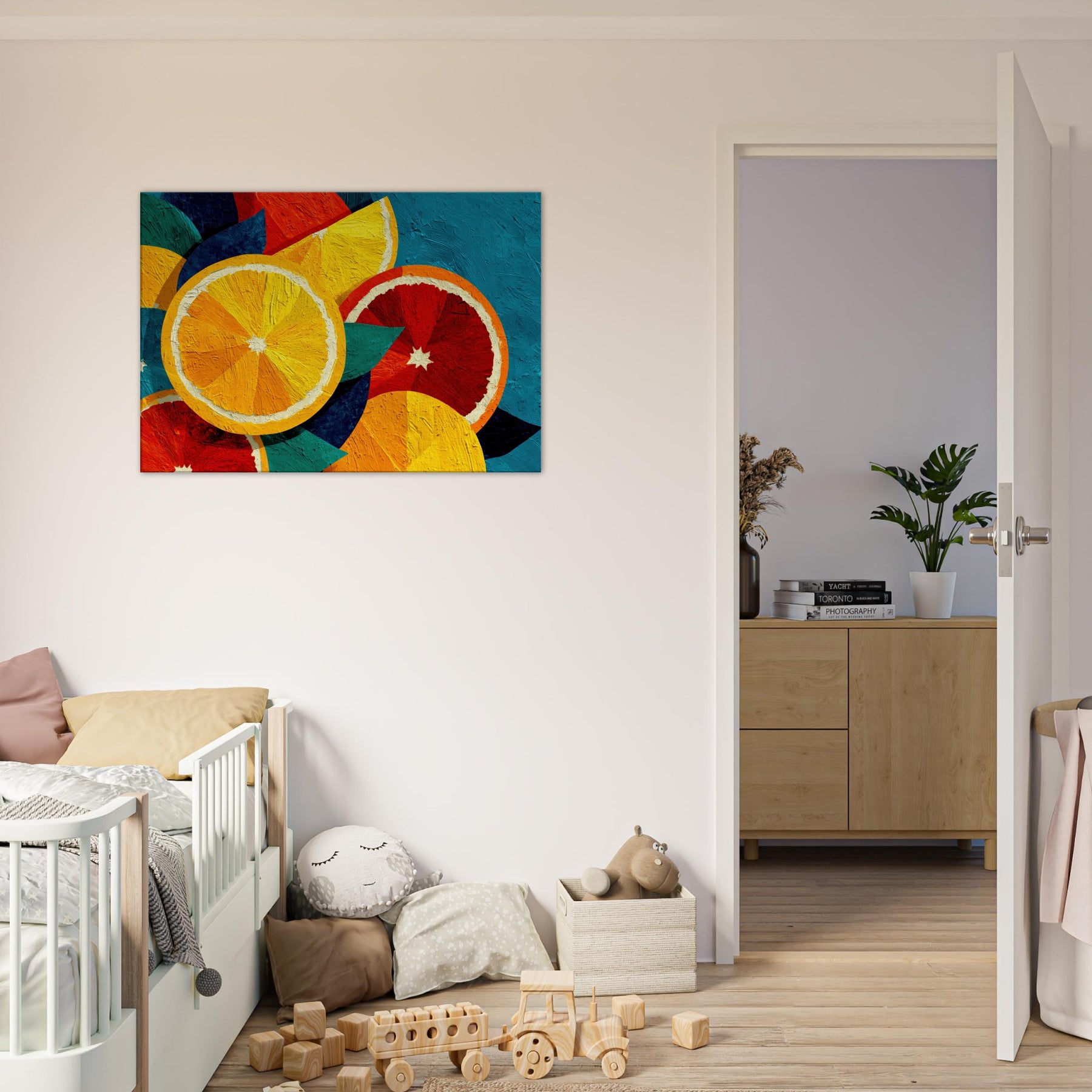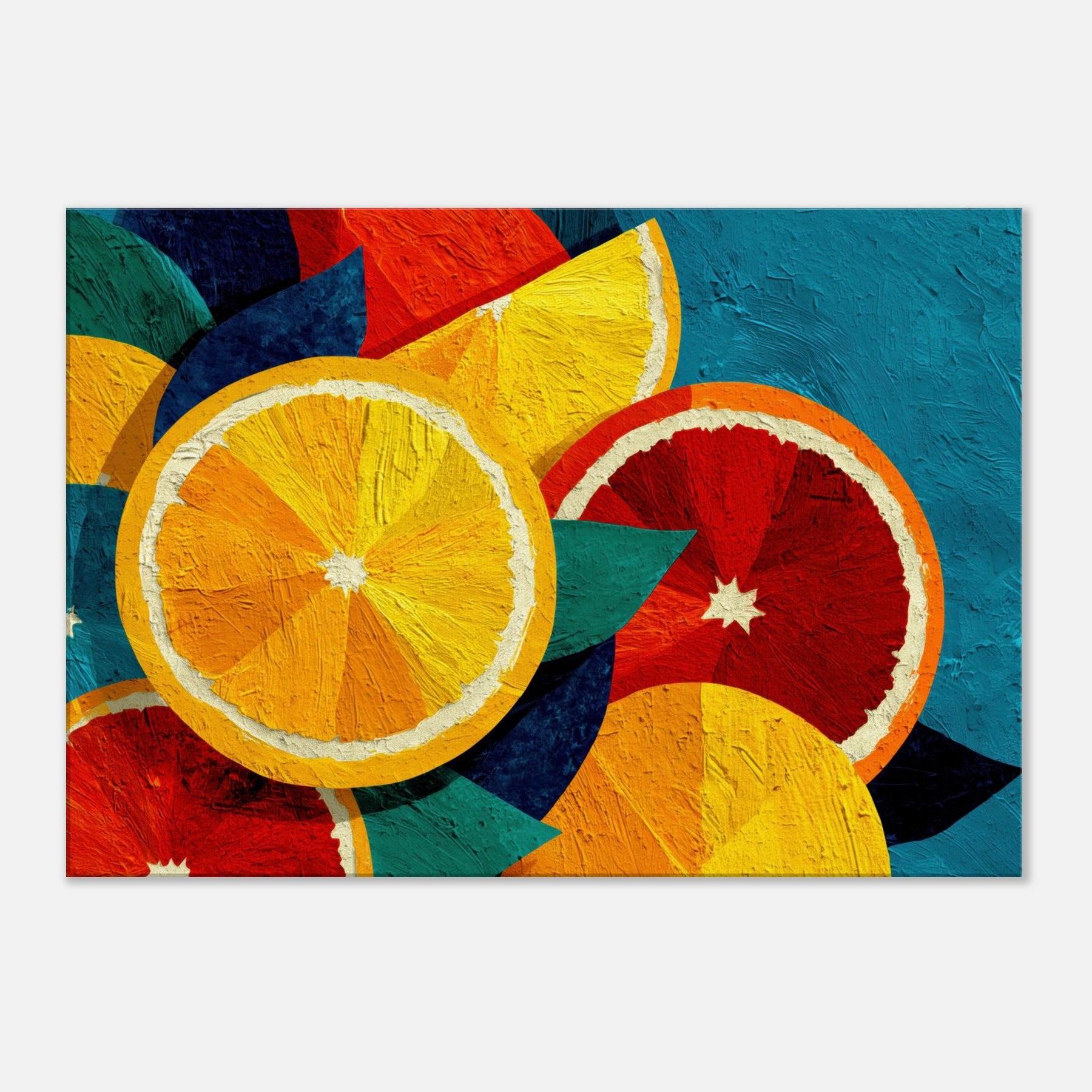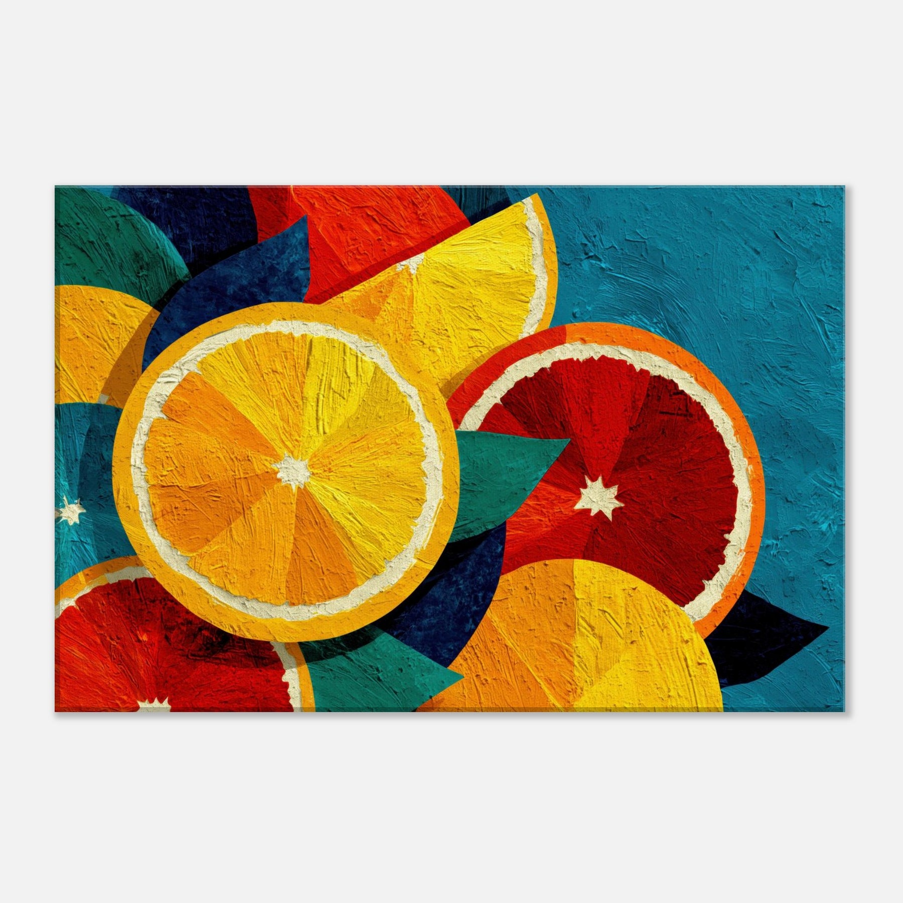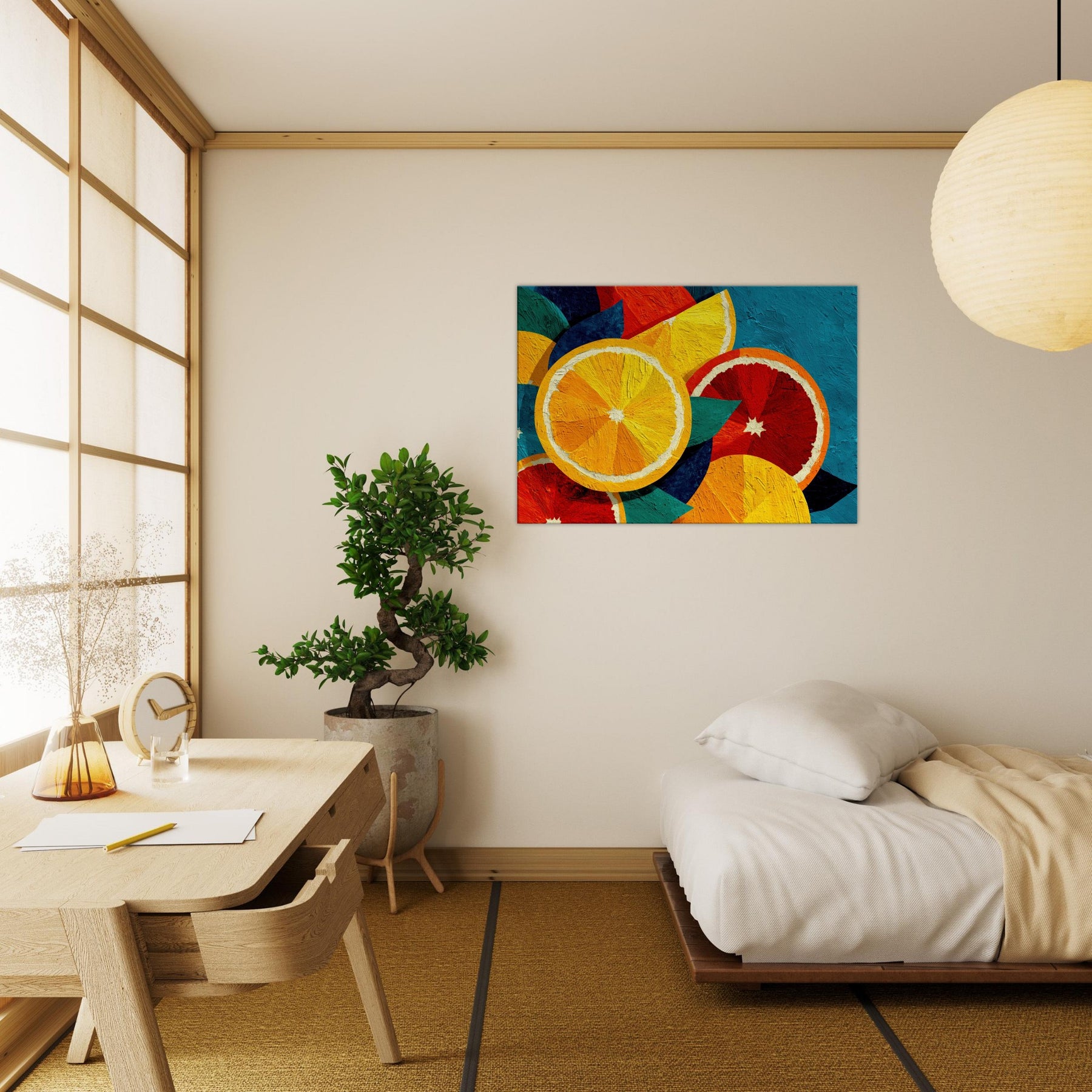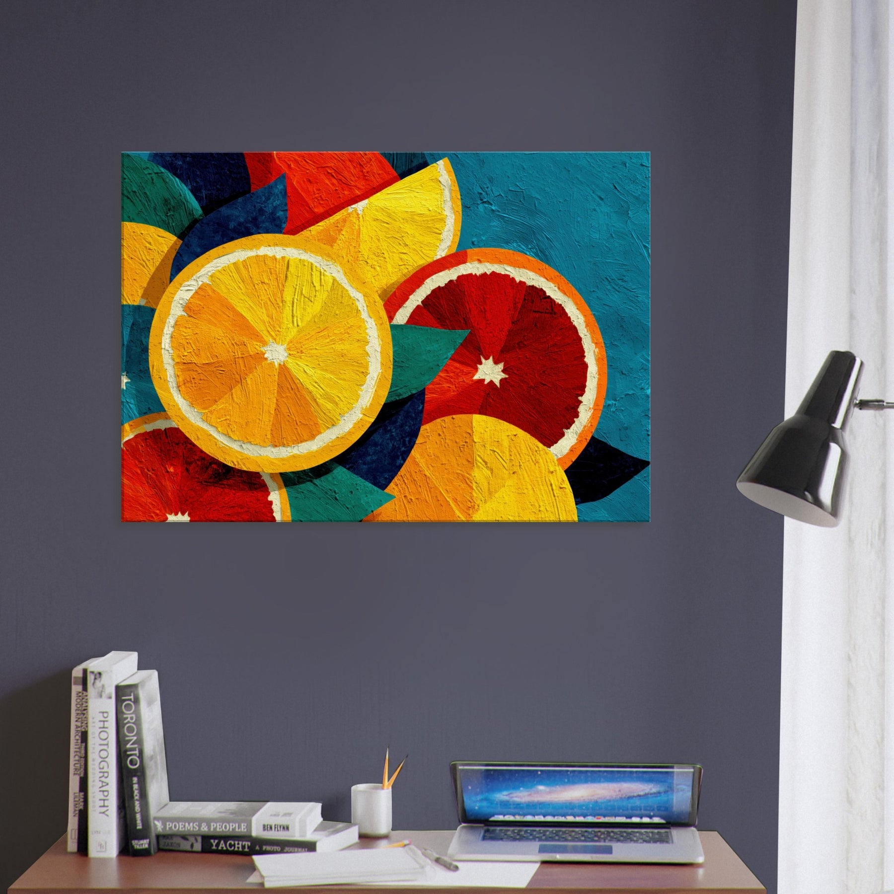 Bright, kinetic, and warm, this piece turns a kitchen moment into a radiant wall story. The Citrus Halves drift across a field of sun drenched color, where rind, pulp, and light become generous blocks of texture and tone. Layered brushwork and bold contrast invite a lingering glance, while the piece hums with a sunny energy that can elevate a living space. Perfect above a sofa or dining area, it awakens walls with lift and aroma of citrus summers.