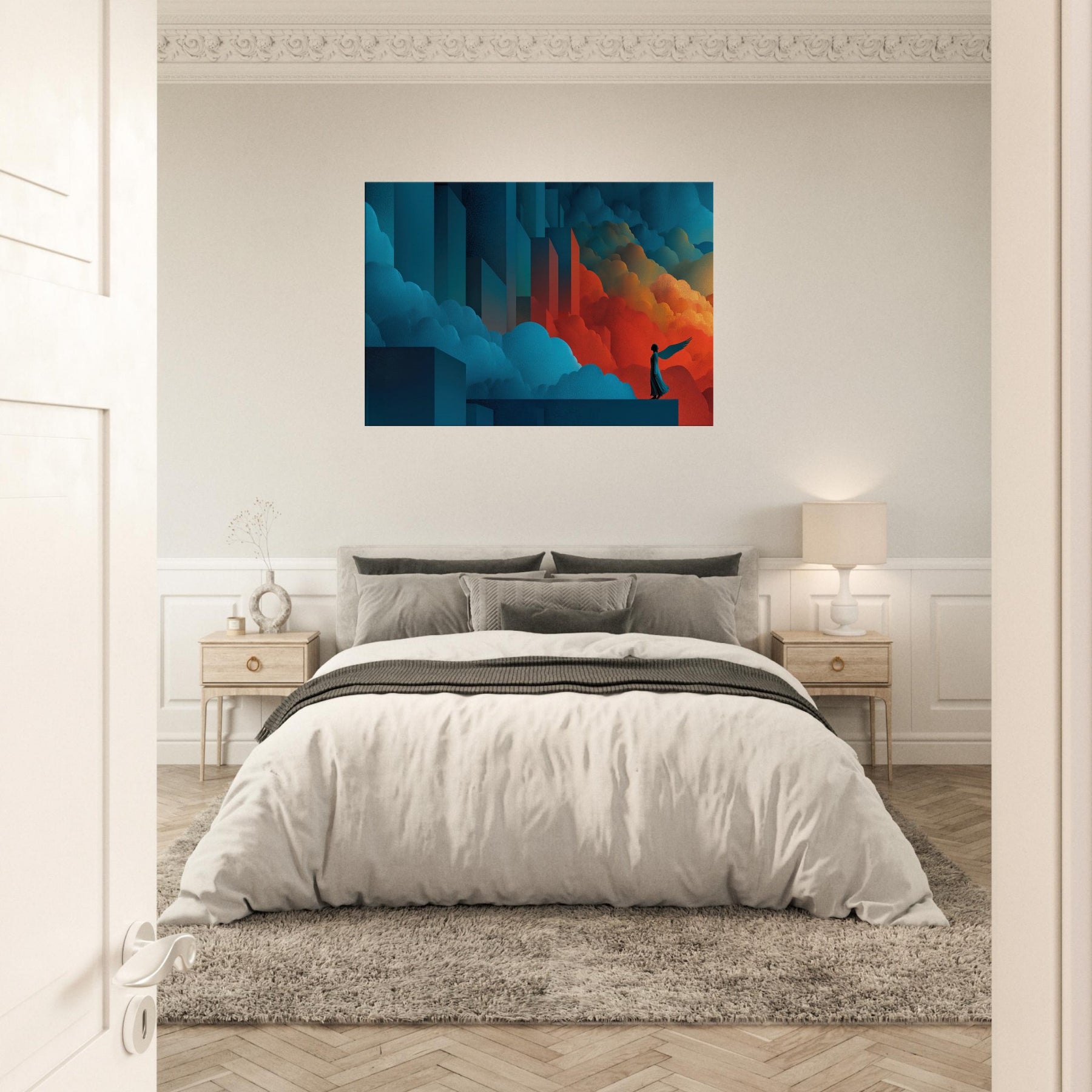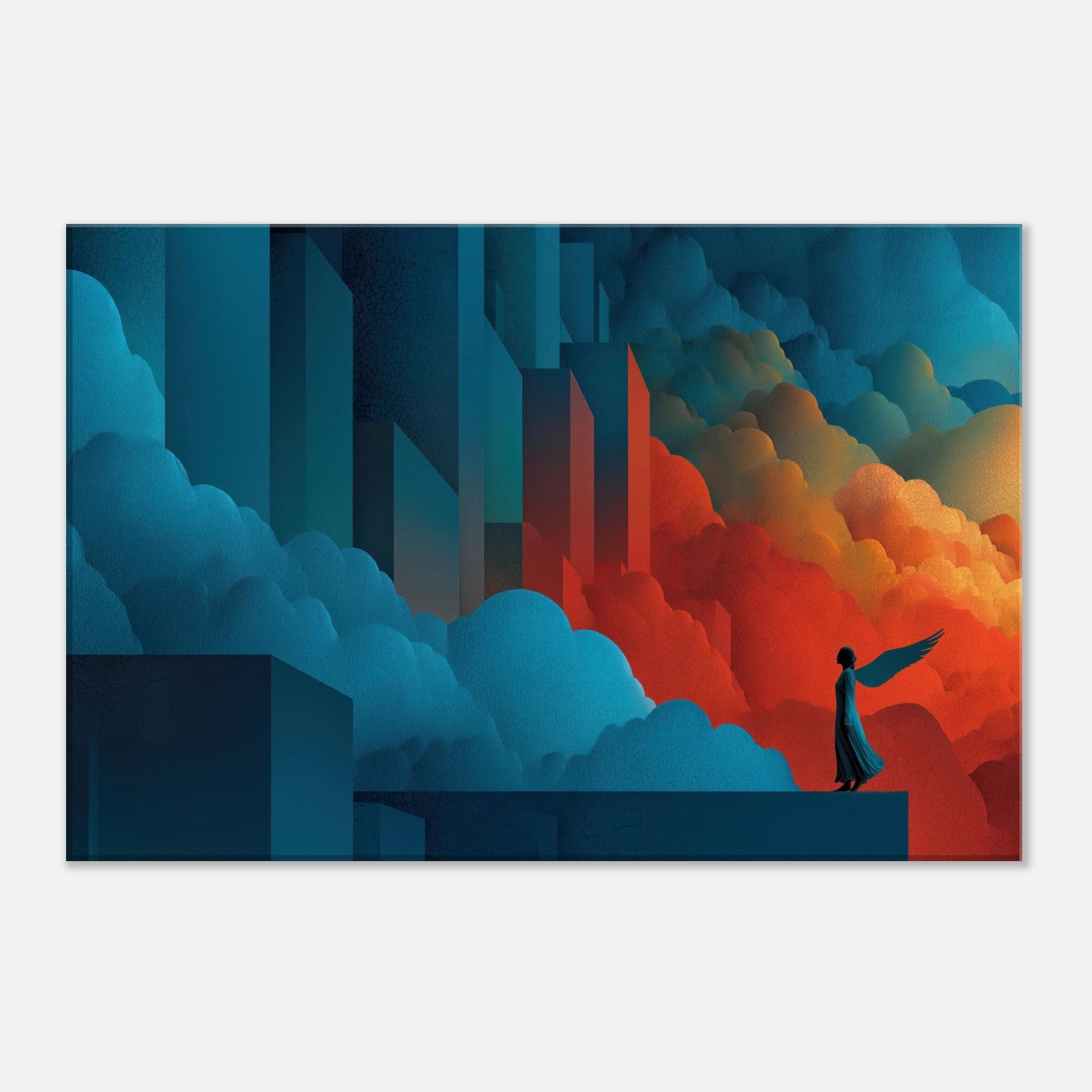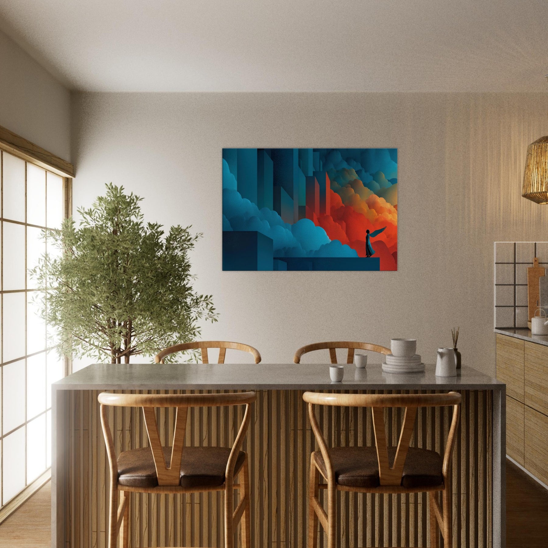 An otherworldly vista unfolds as the Floating City in the Sky drifts above velvet clouds, inviting quiet contemplation. This abstract scene balances crystalline towers with billowing color, where cool blues collide with a warm ember glow. A solitary figure stands on a ledge, wings poised to lift the moment into memory. The piece transforms living spaces into a doorway to dreamlike altitude, offering serenity, imagination, and a subtle drama that enriches walls with atmosphere.