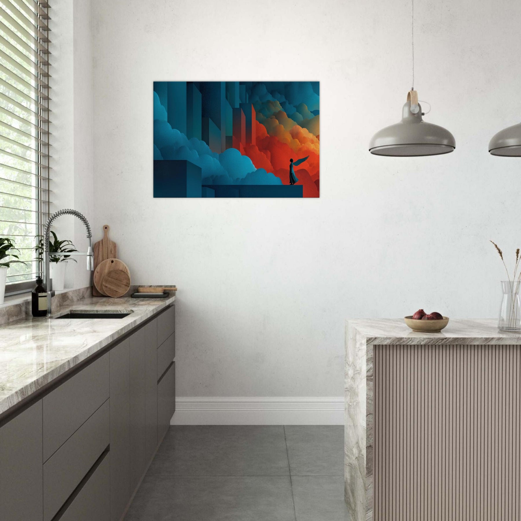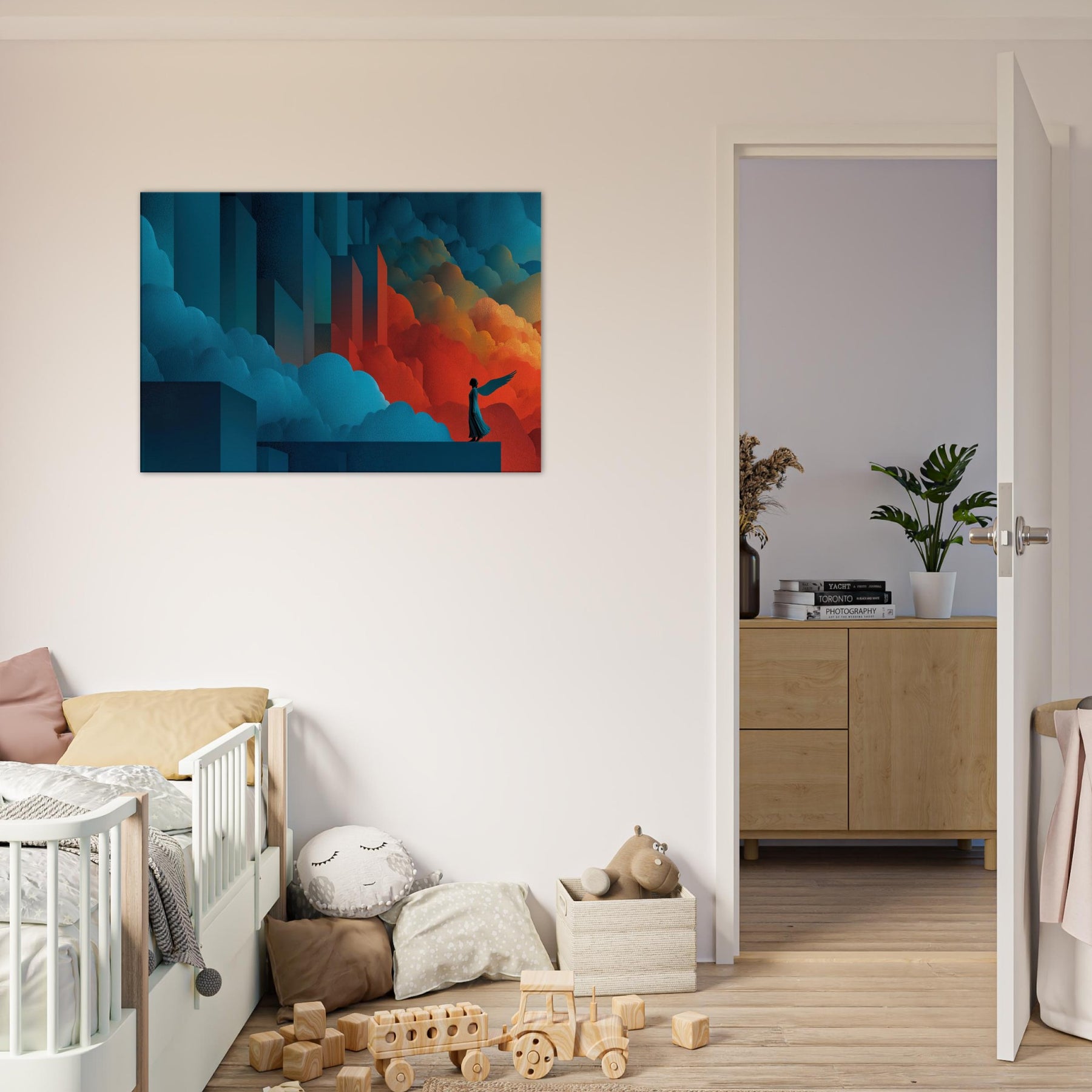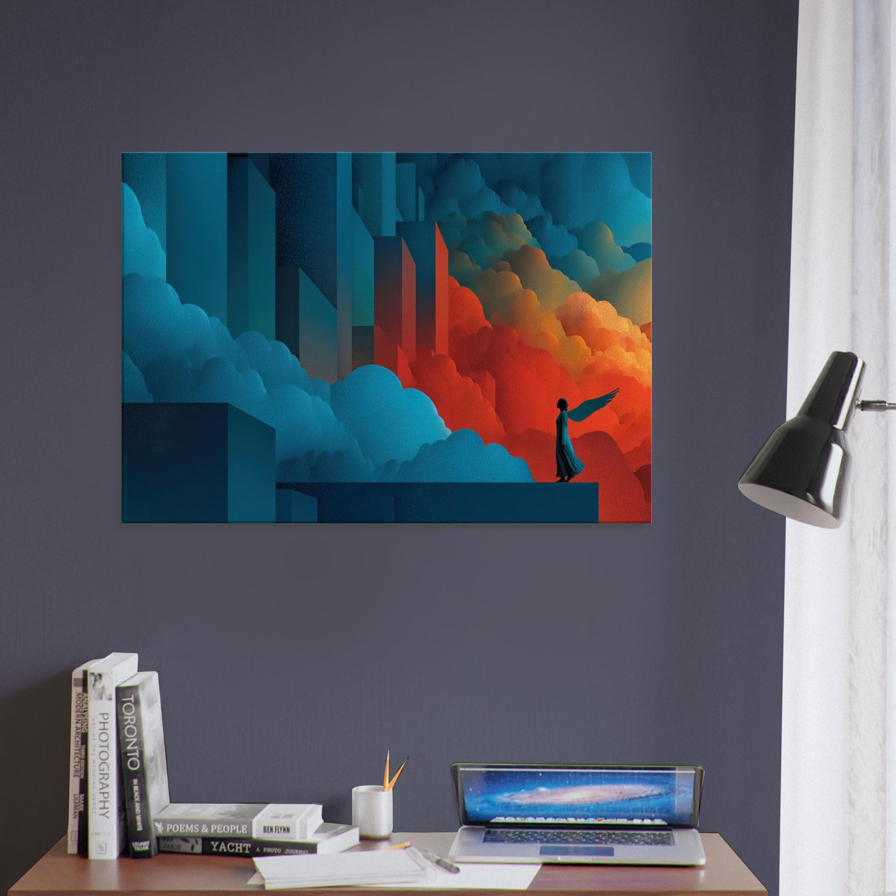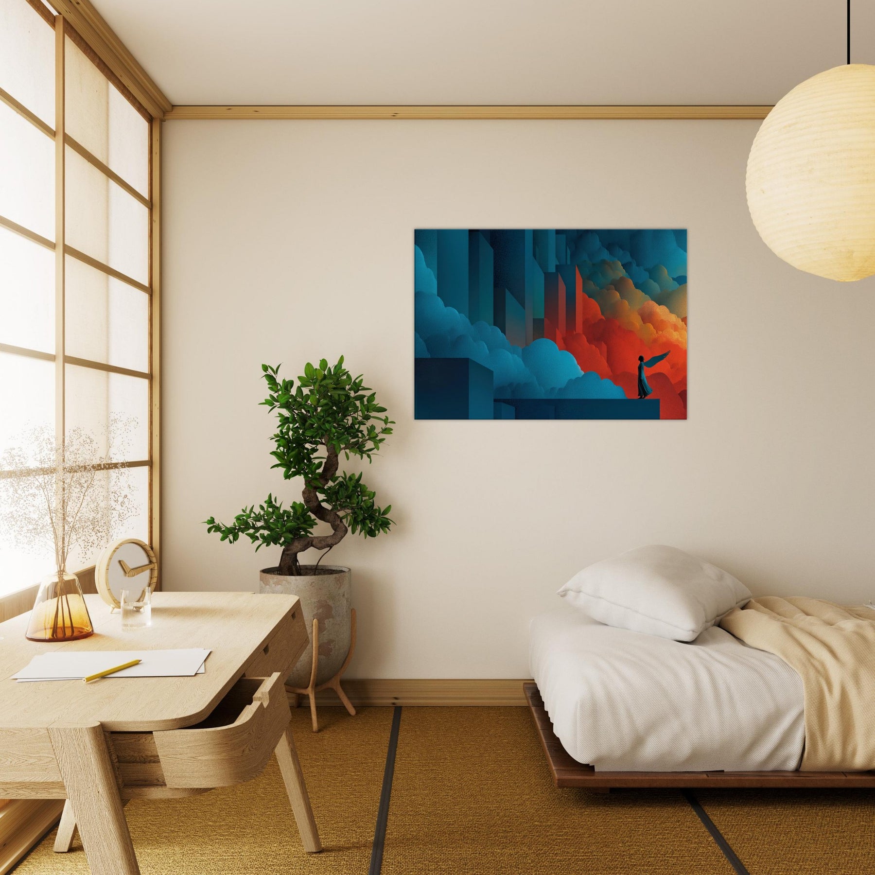 An otherworldly vista unfolds as the Floating City in the Sky drifts above velvet clouds, inviting quiet contemplation. This abstract scene balances crystalline towers with billowing color, where cool blues collide with a warm ember glow. A solitary figure stands on a ledge, wings poised to lift the moment into memory. The piece transforms living spaces into a doorway to dreamlike altitude, offering serenity, imagination, and a subtle drama that enriches walls with atmosphere.