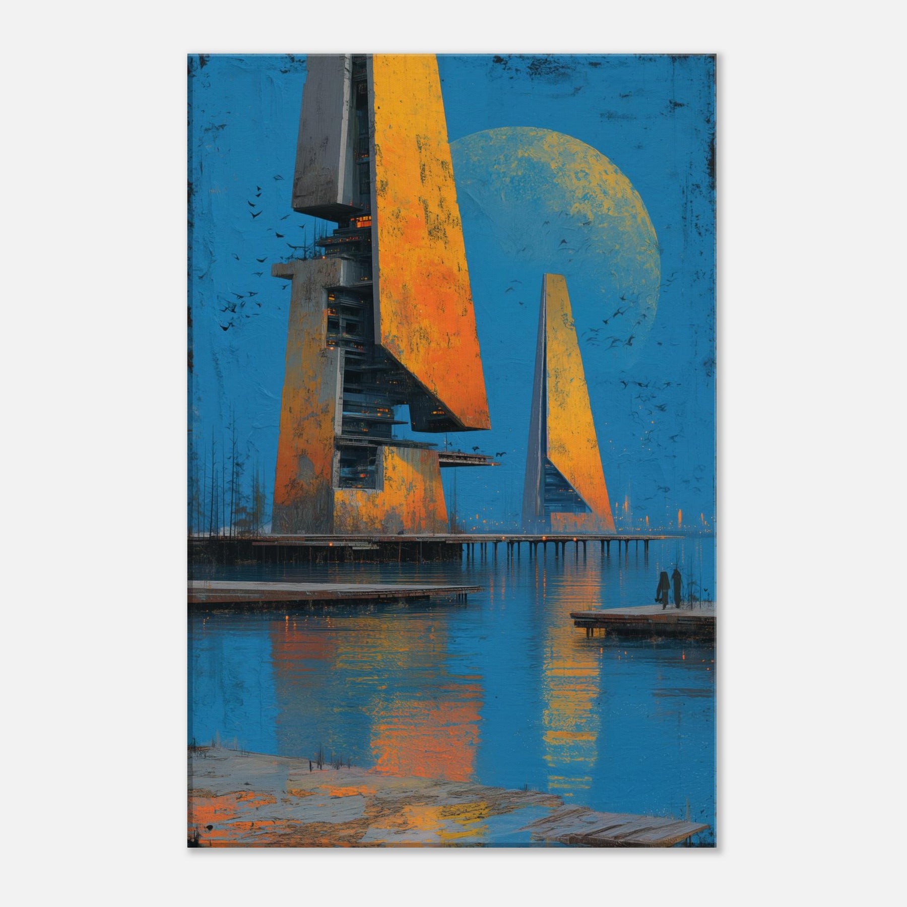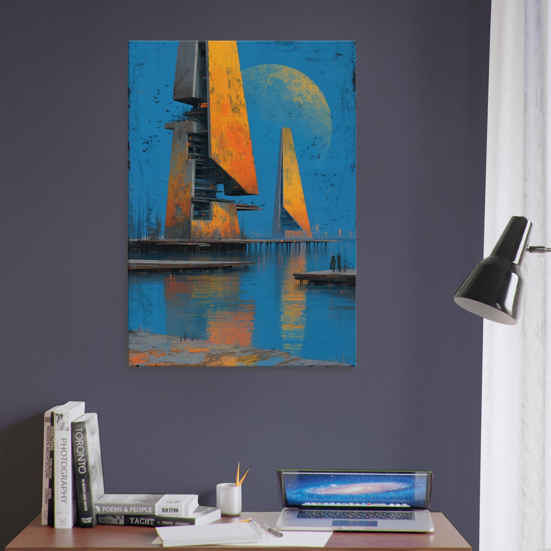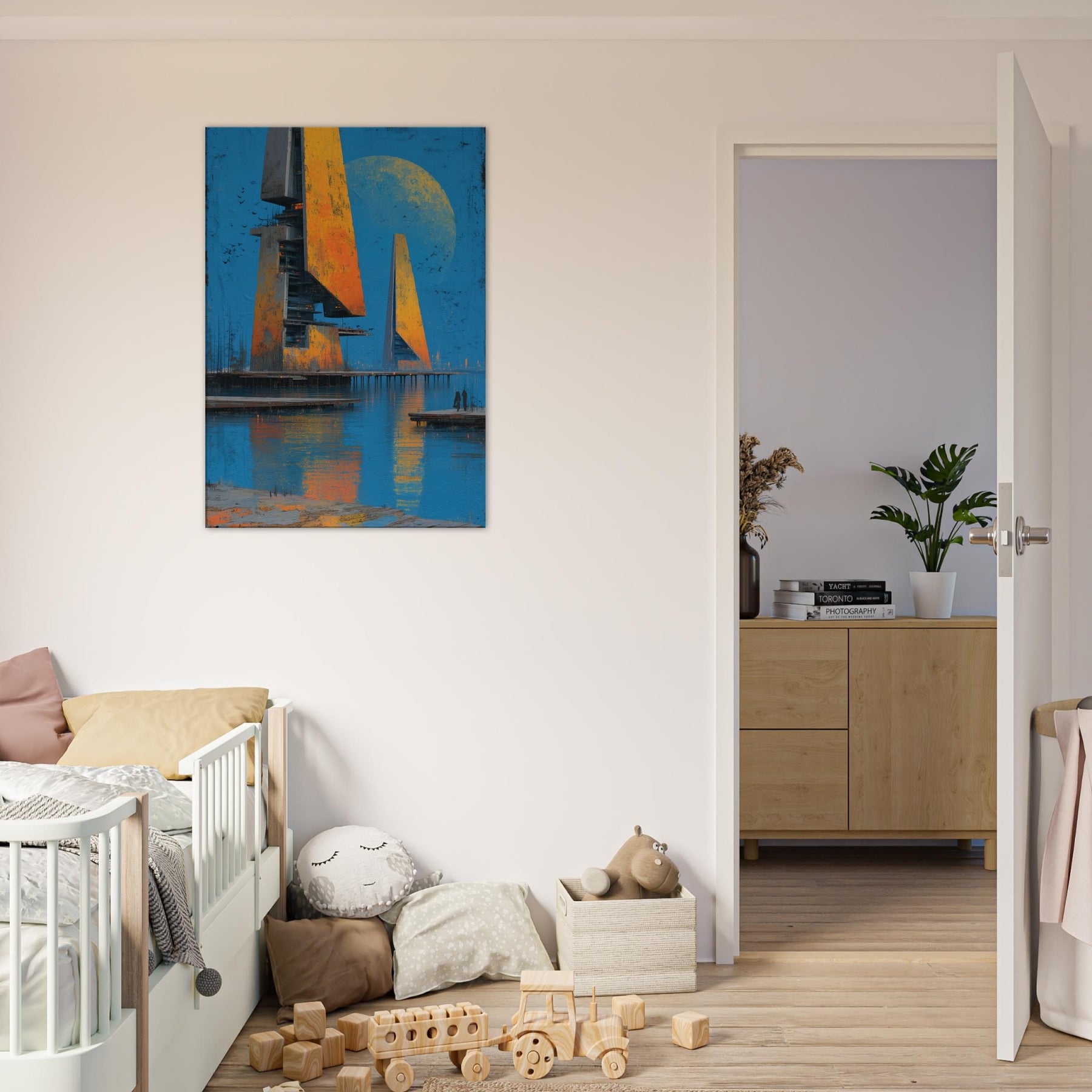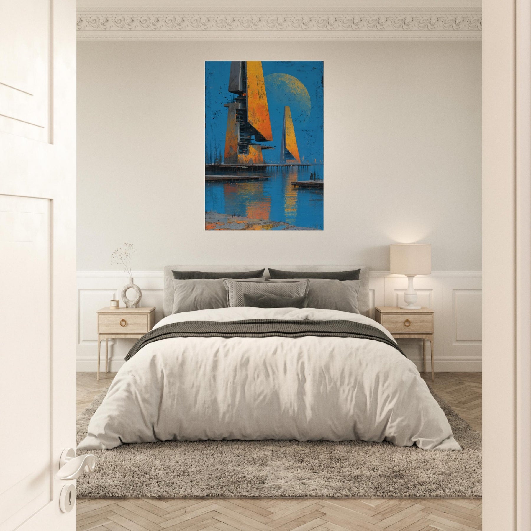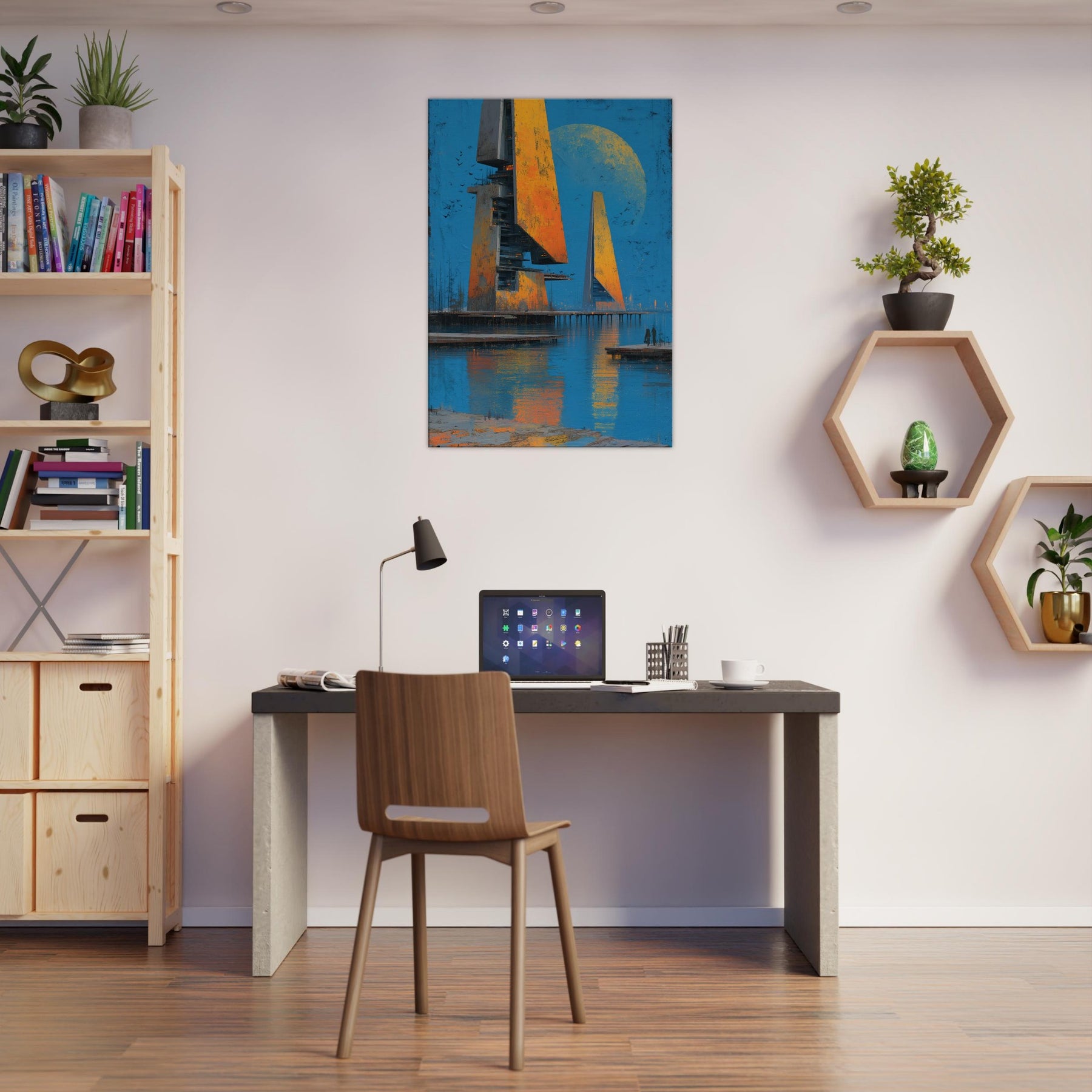 Let the Floating City rise in your living space, a dreamscape where geometry and light collide. This abstract fusion of architecture and myth glows with sunlit amber and cool ocean blues, its jagged towers leaning toward possibility. The scene hums with the whisper of water, reflections skimming a quiet evening, inviting calm and curiosity. Hang it where you relax let the atmosphere shift, spark conversations, and turn a room into a harbor of imagination.
