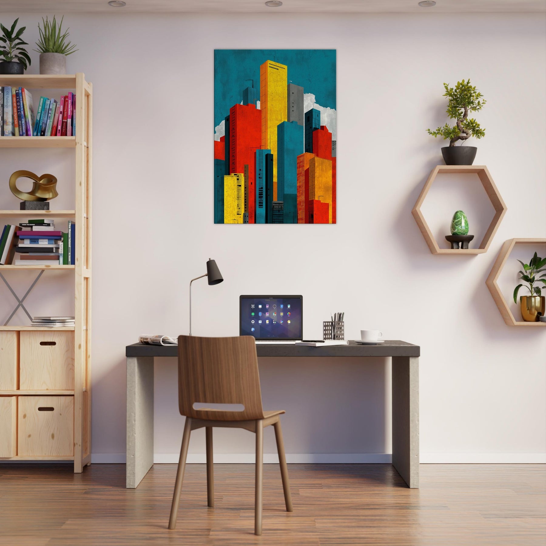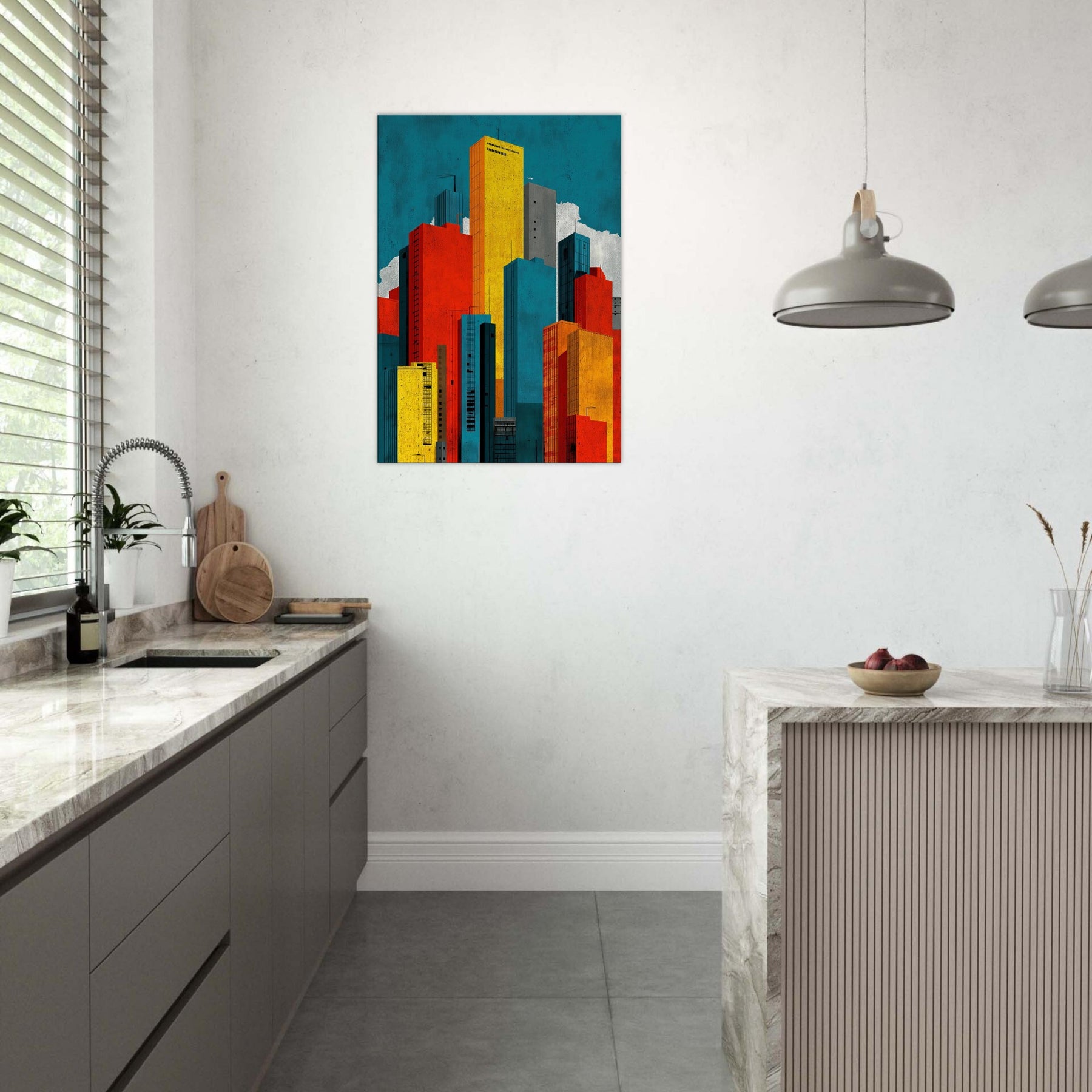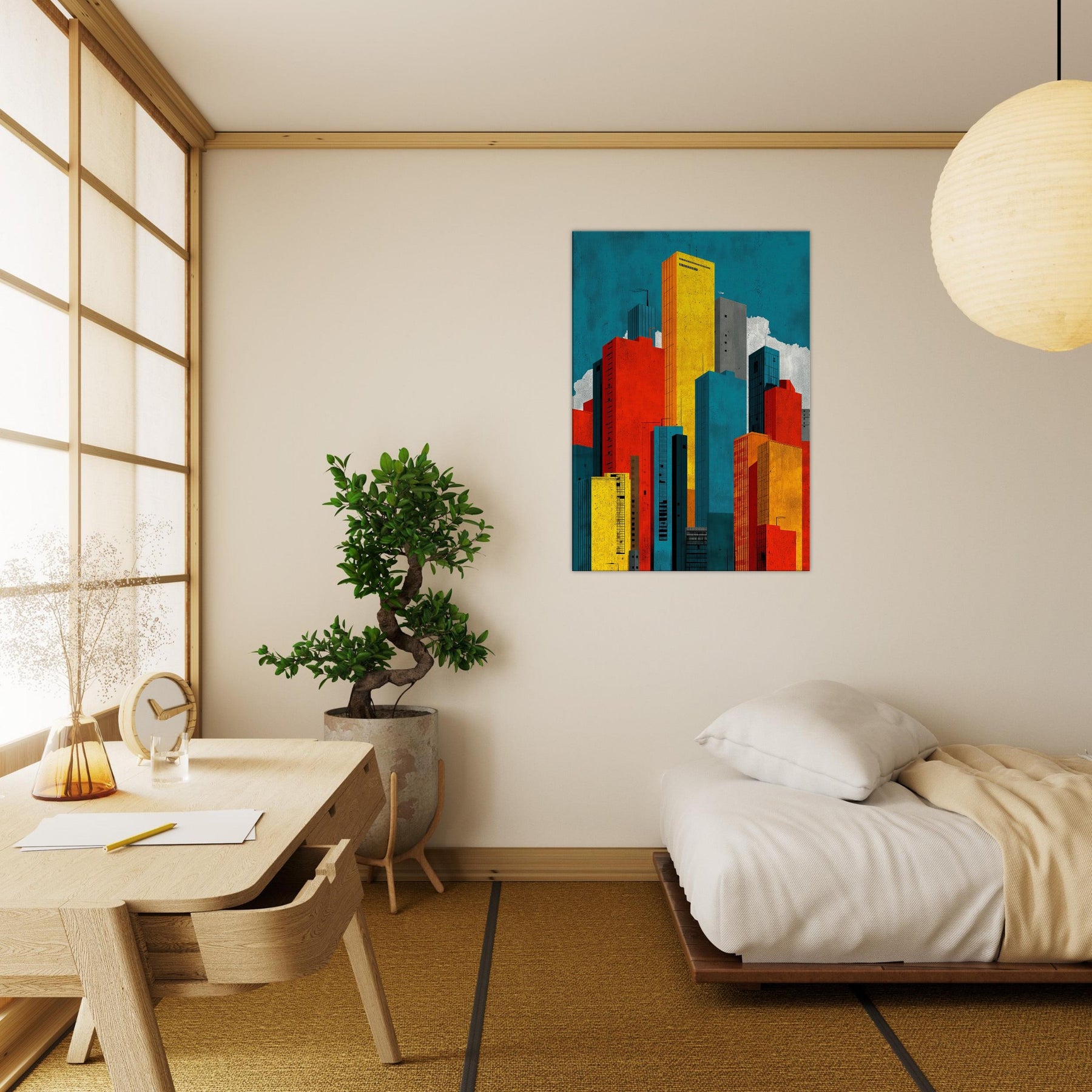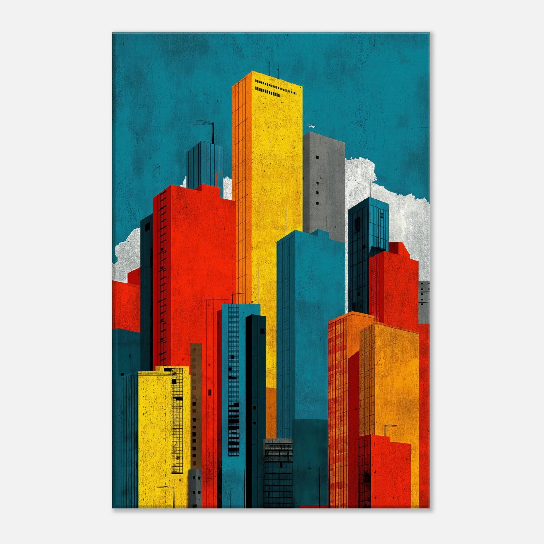 Minimal City Map invites you to breathe with the skyline. This abstract composition dissolves streets into luminous blocks of teal, gold, red, and charcoal, creating a quiet map of memory rather than a literal view. Hang it to lift a room with urban tempo, the way light shifts at day's end, the hum of distant traffic, the scent of rain on pavement. A bold, contemplative centerpiece that anchors a living space in modern clarity.