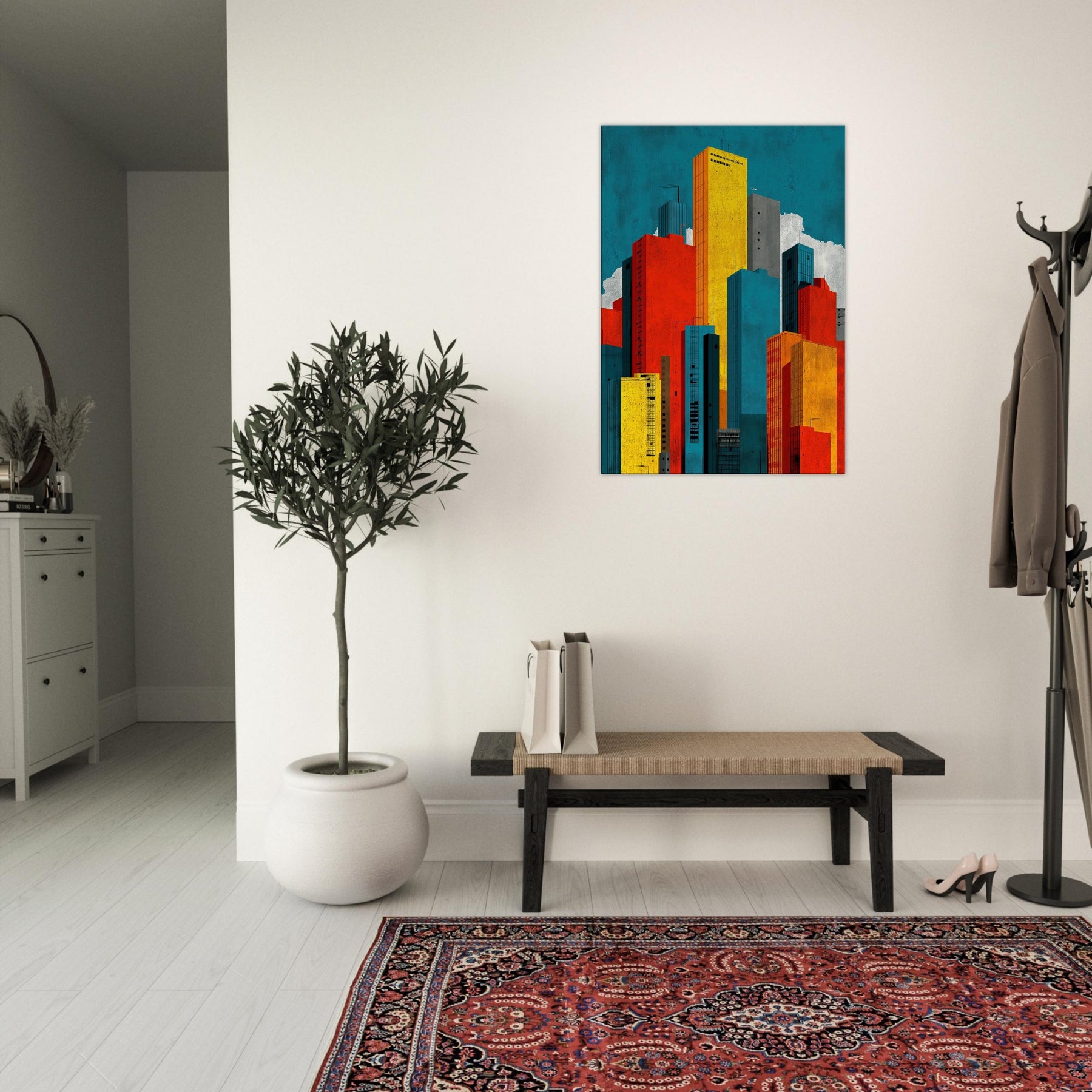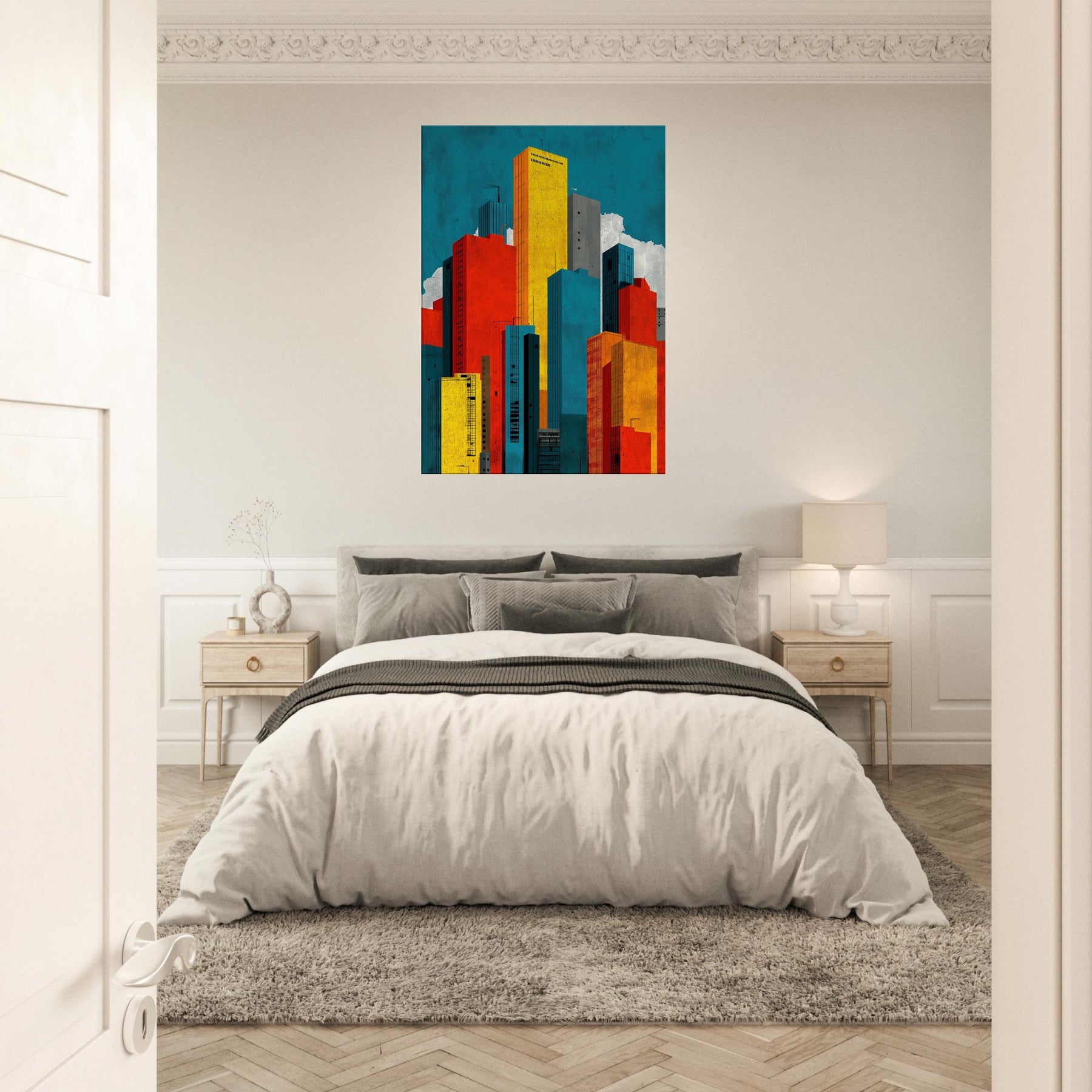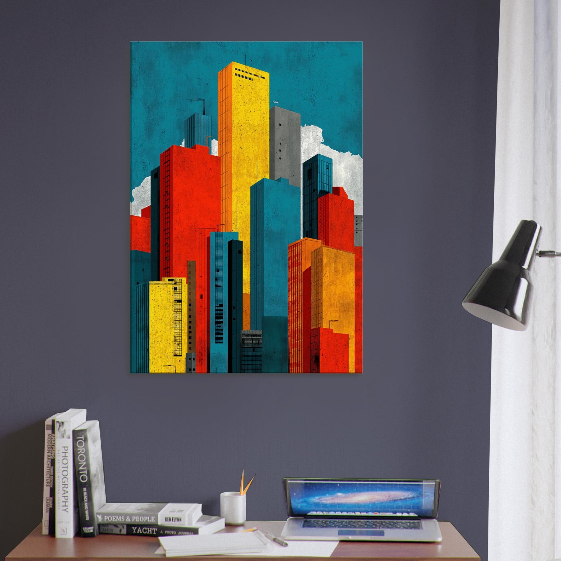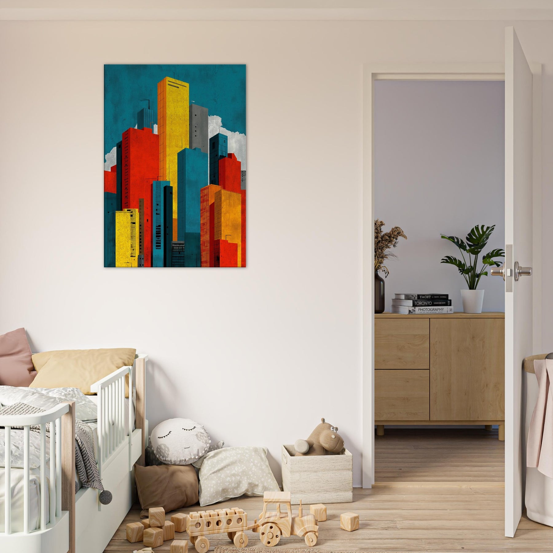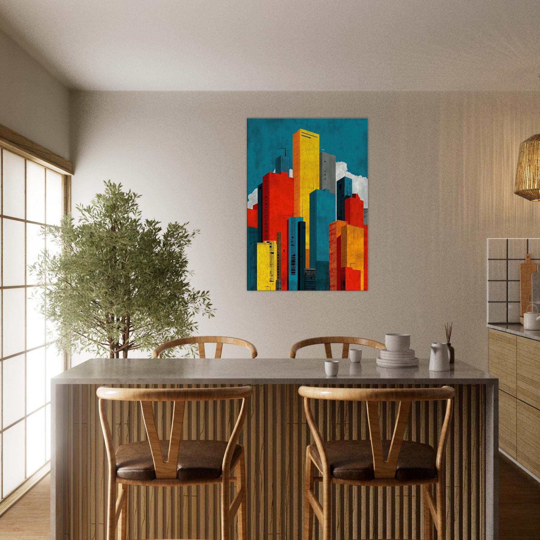 Minimal City Map invites you to breathe with the skyline. This abstract composition dissolves streets into luminous blocks of teal, gold, red, and charcoal, creating a quiet map of memory rather than a literal view. Hang it to lift a room with urban tempo, the way light shifts at day's end, the hum of distant traffic, the scent of rain on pavement. A bold, contemplative centerpiece that anchors a living space in modern clarity.
