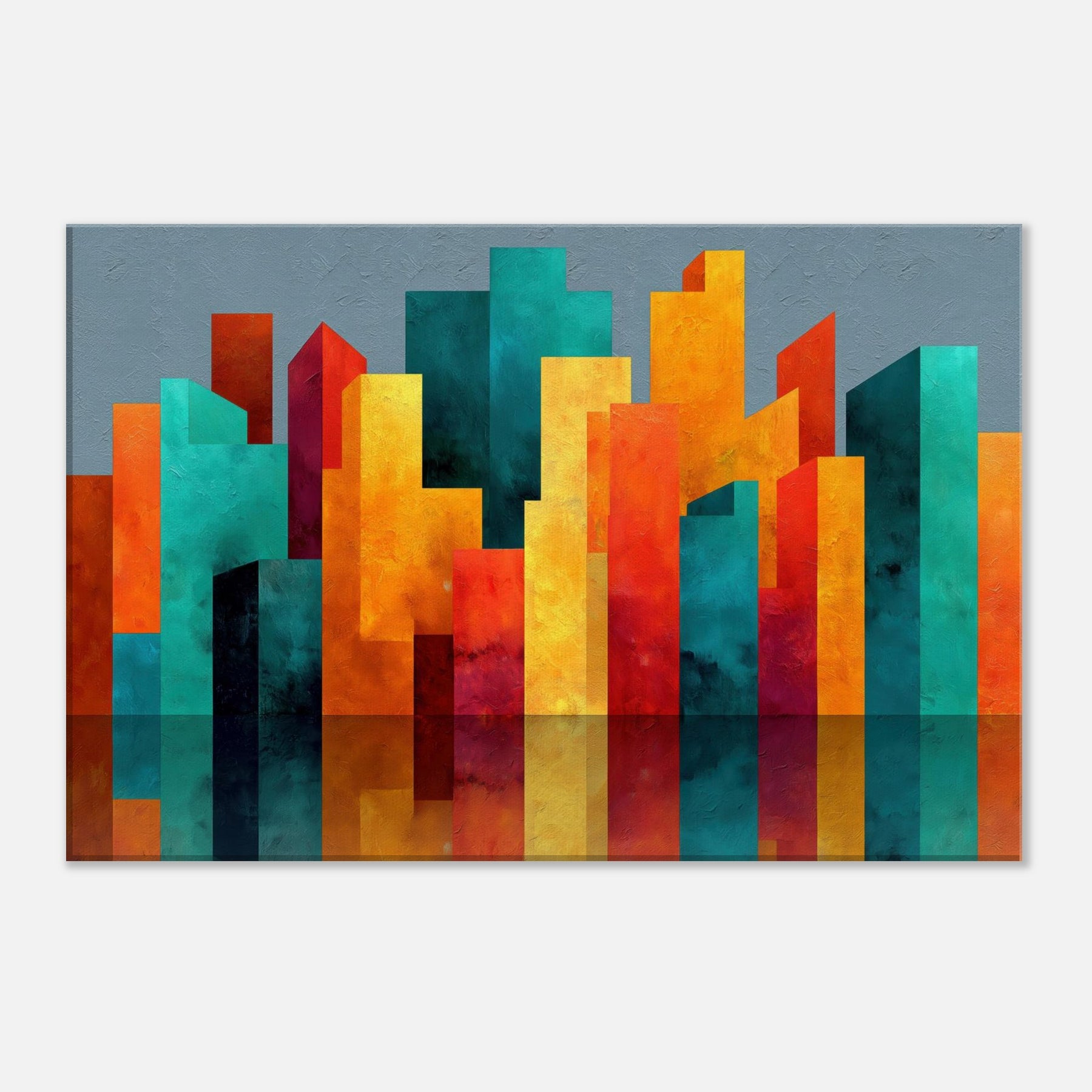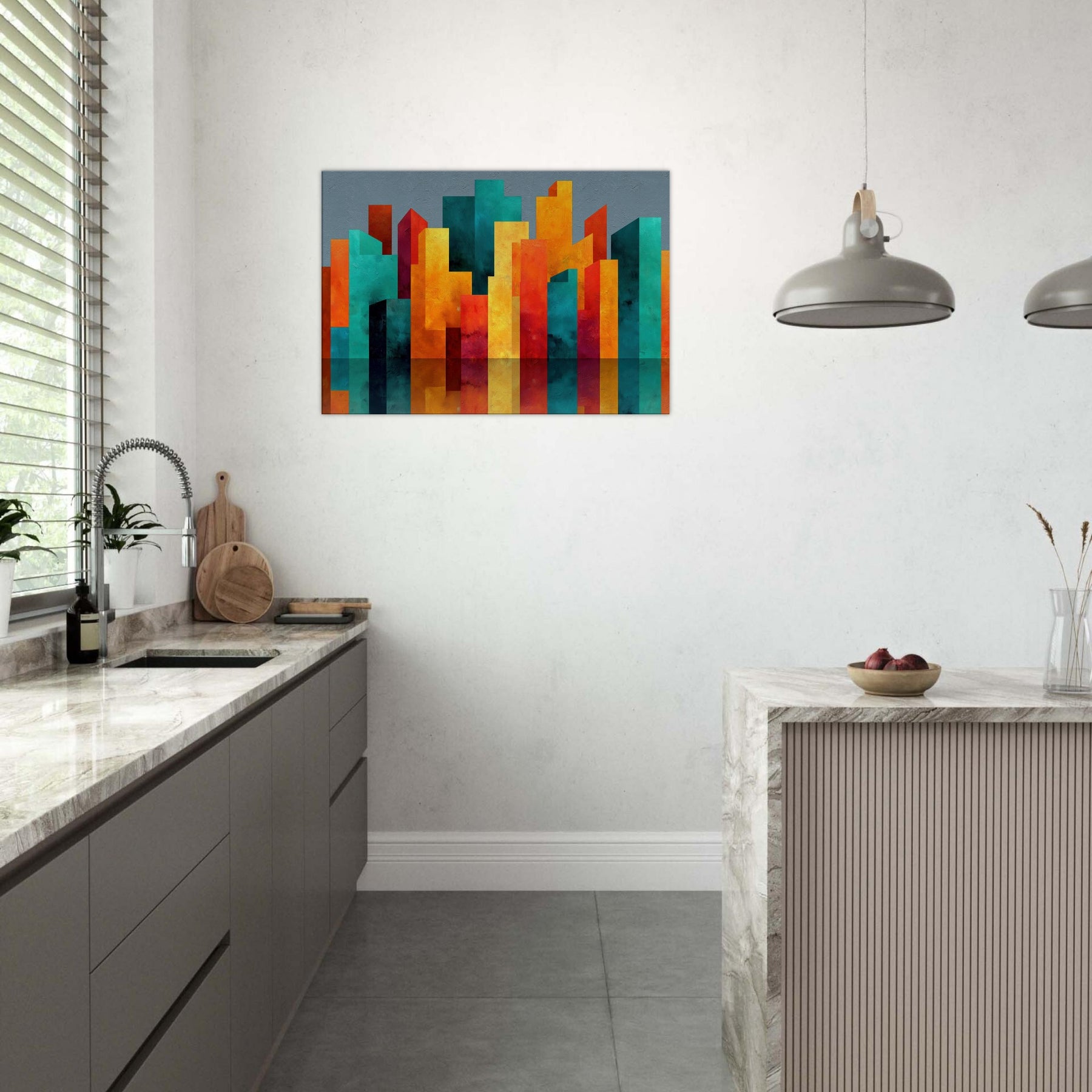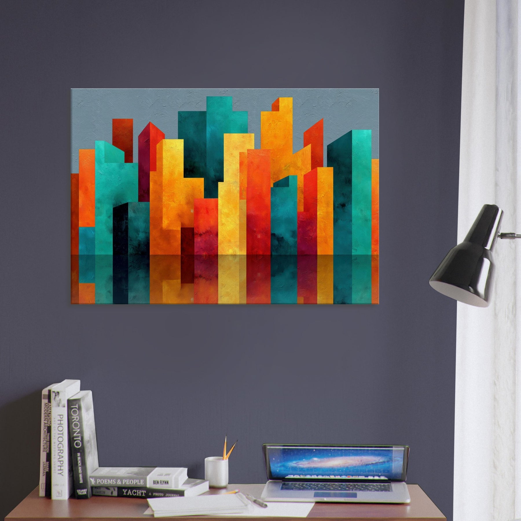 Let the City Skyline Silhouette awaken your room with a chorus of color and quiet momentum. This abstract composition threads bold blocks of teal, sunlit amber, and cobalt through a skyline of simplified towers, casting a warm, ambient glow across walls and surfaces. The layered geometry creates depth and movement, while the mirrored base evokes city reflections at dusk. Perfect for living rooms or offices, it elevates modern decor with energy, balance, and a sense of urban poetry.