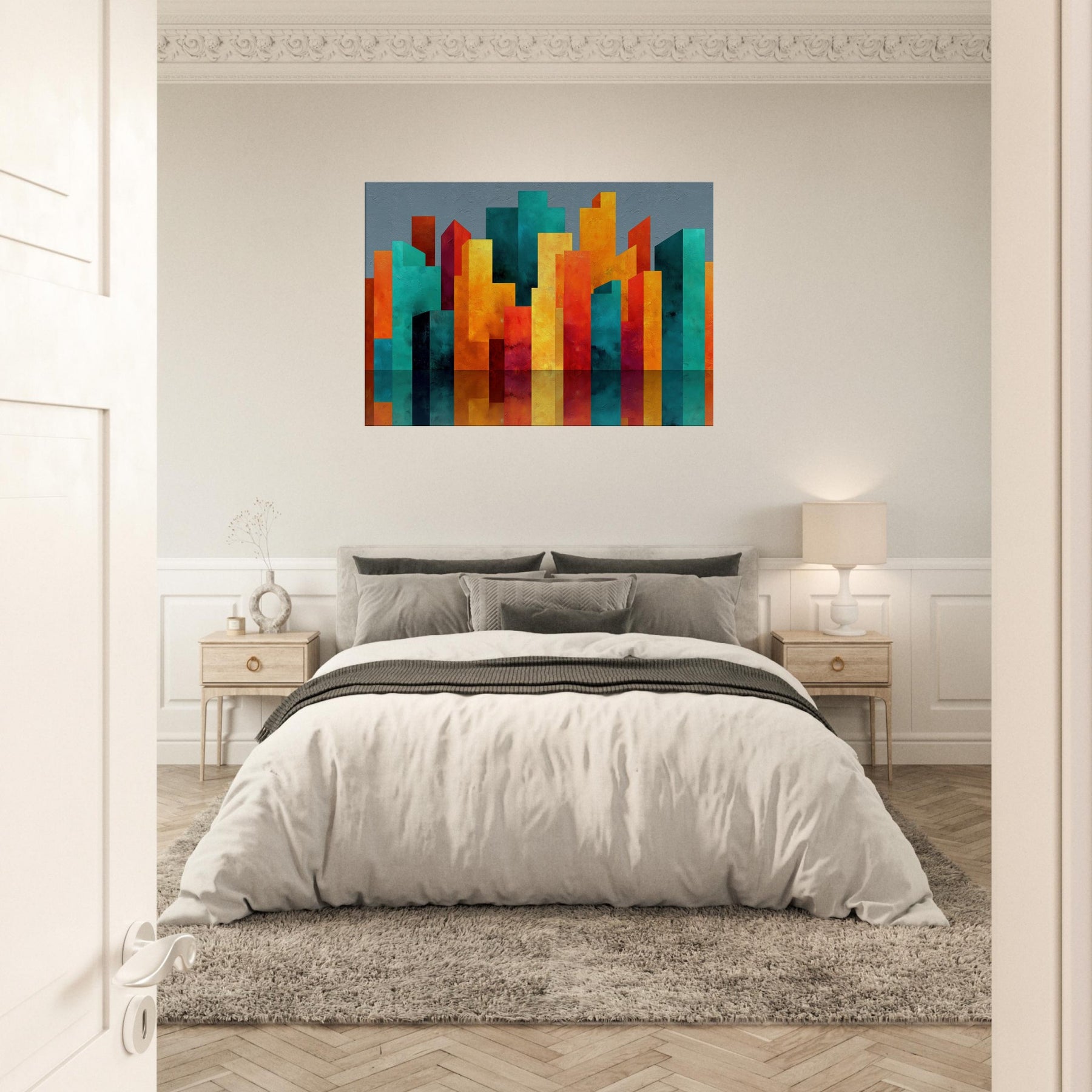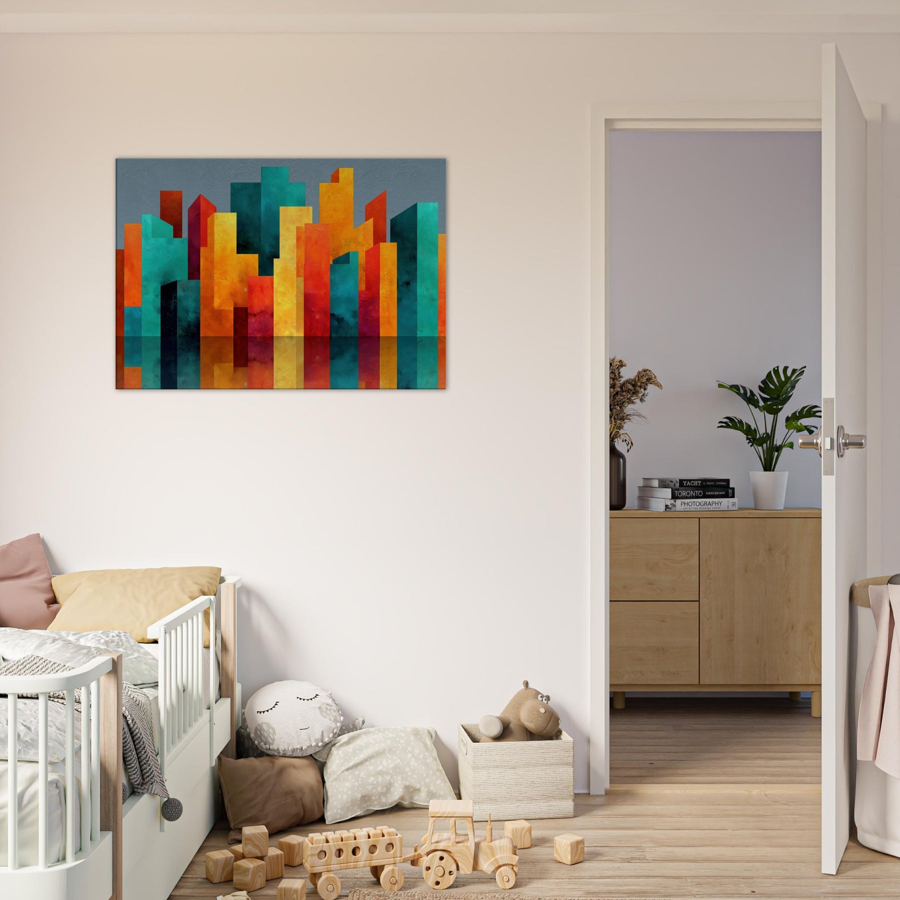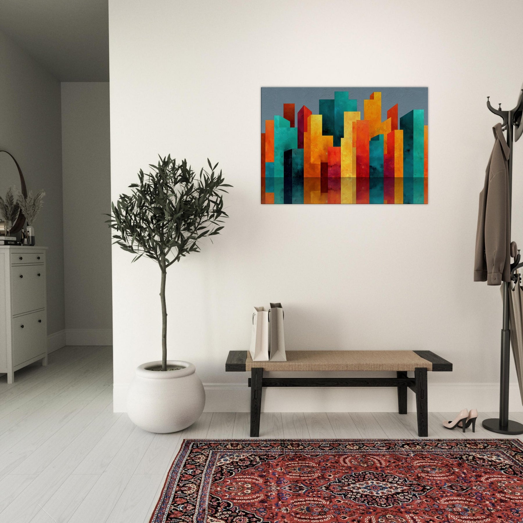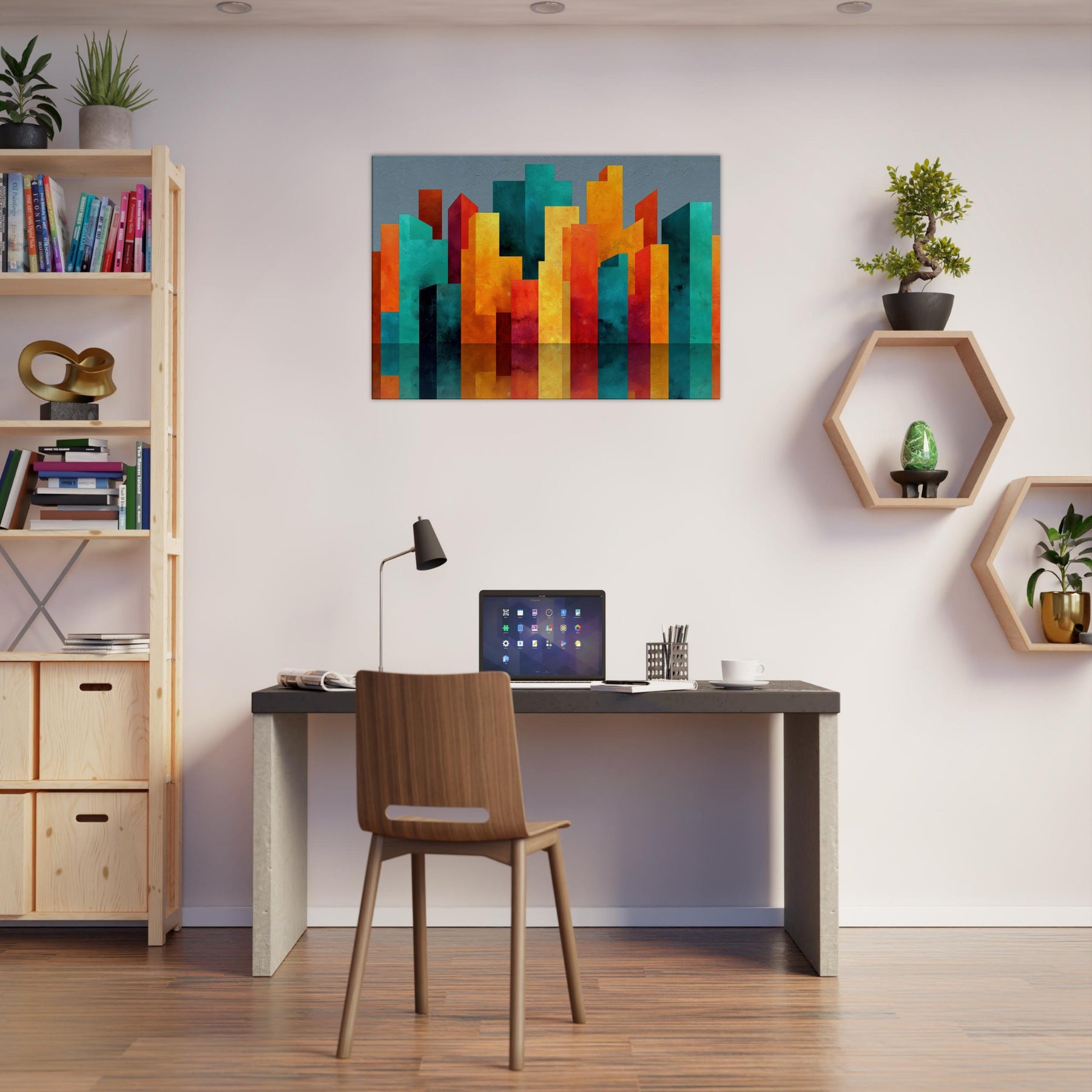 Let the City Skyline Silhouette awaken your room with a chorus of color and quiet momentum. This abstract composition threads bold blocks of teal, sunlit amber, and cobalt through a skyline of simplified towers, casting a warm, ambient glow across walls and surfaces. The layered geometry creates depth and movement, while the mirrored base evokes city reflections at dusk. Perfect for living rooms or offices, it elevates modern decor with energy, balance, and a sense of urban poetry.