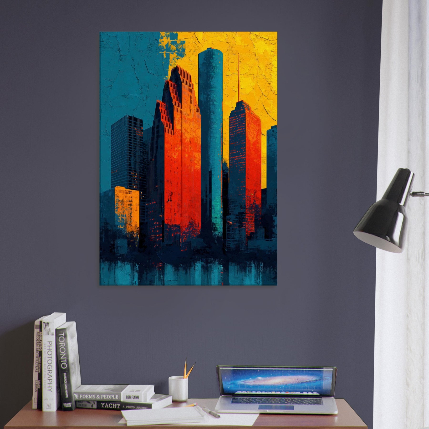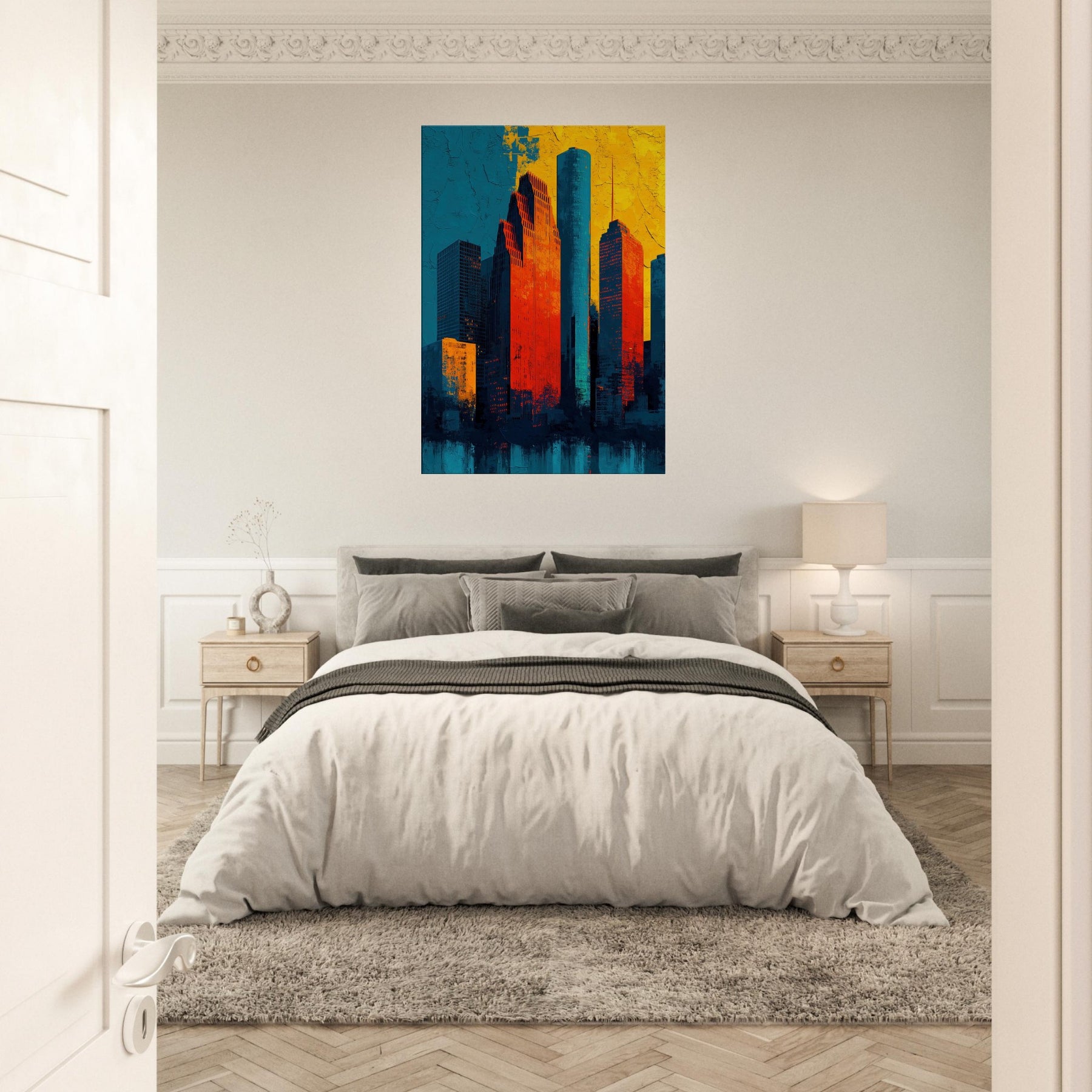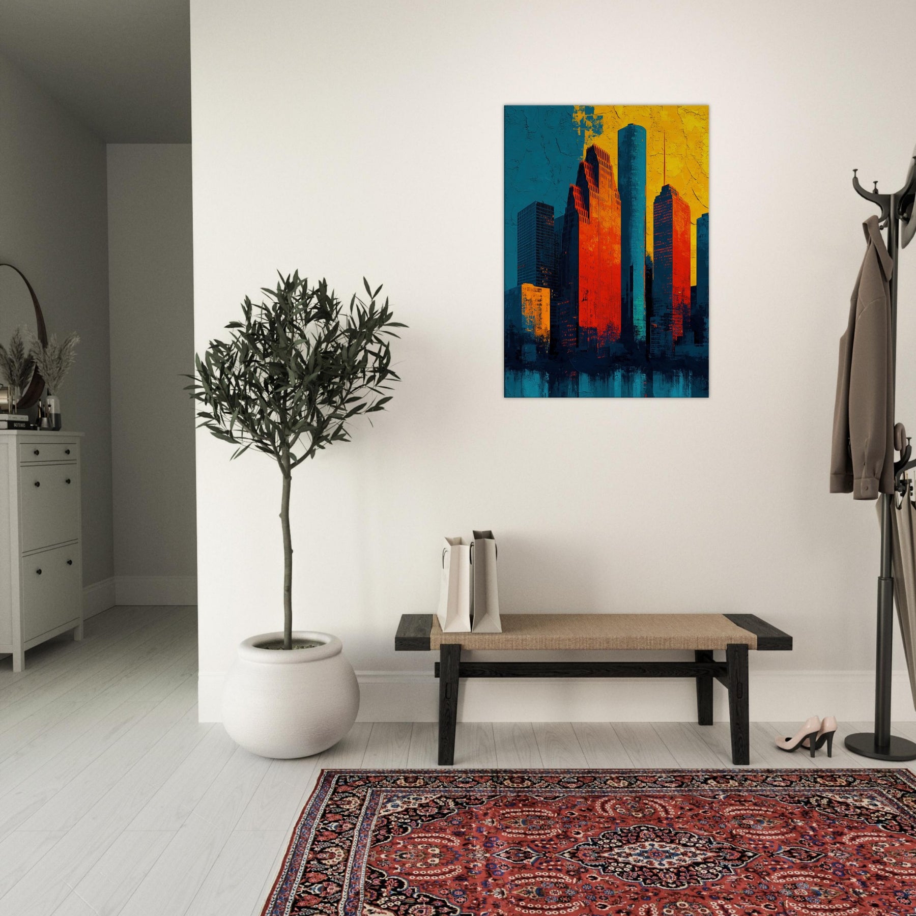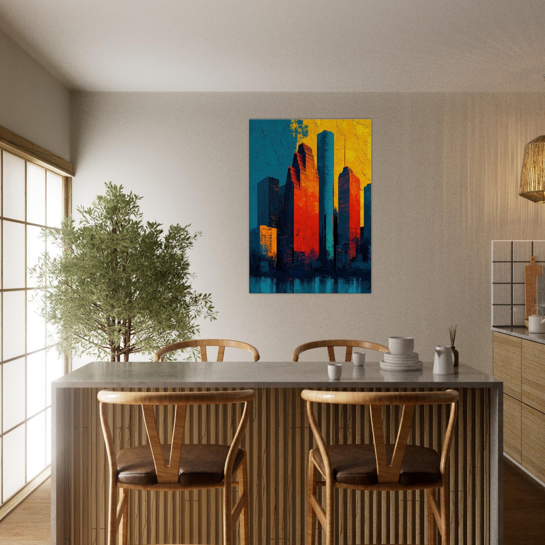 Let Houston rise in color and contour, a cityscape that breathes with electric blue and molten orange. This abstract composition fuses towers and horizons into a tactile, sunlit hum that warms living spaces and fuels conversation. The artwork invites quiet reflection at dawn, bold energy at night, and a sense of urban movement in between. A focal point above a sofa or console, it transforms a room into a nocturnal skyline of memory and possibility.