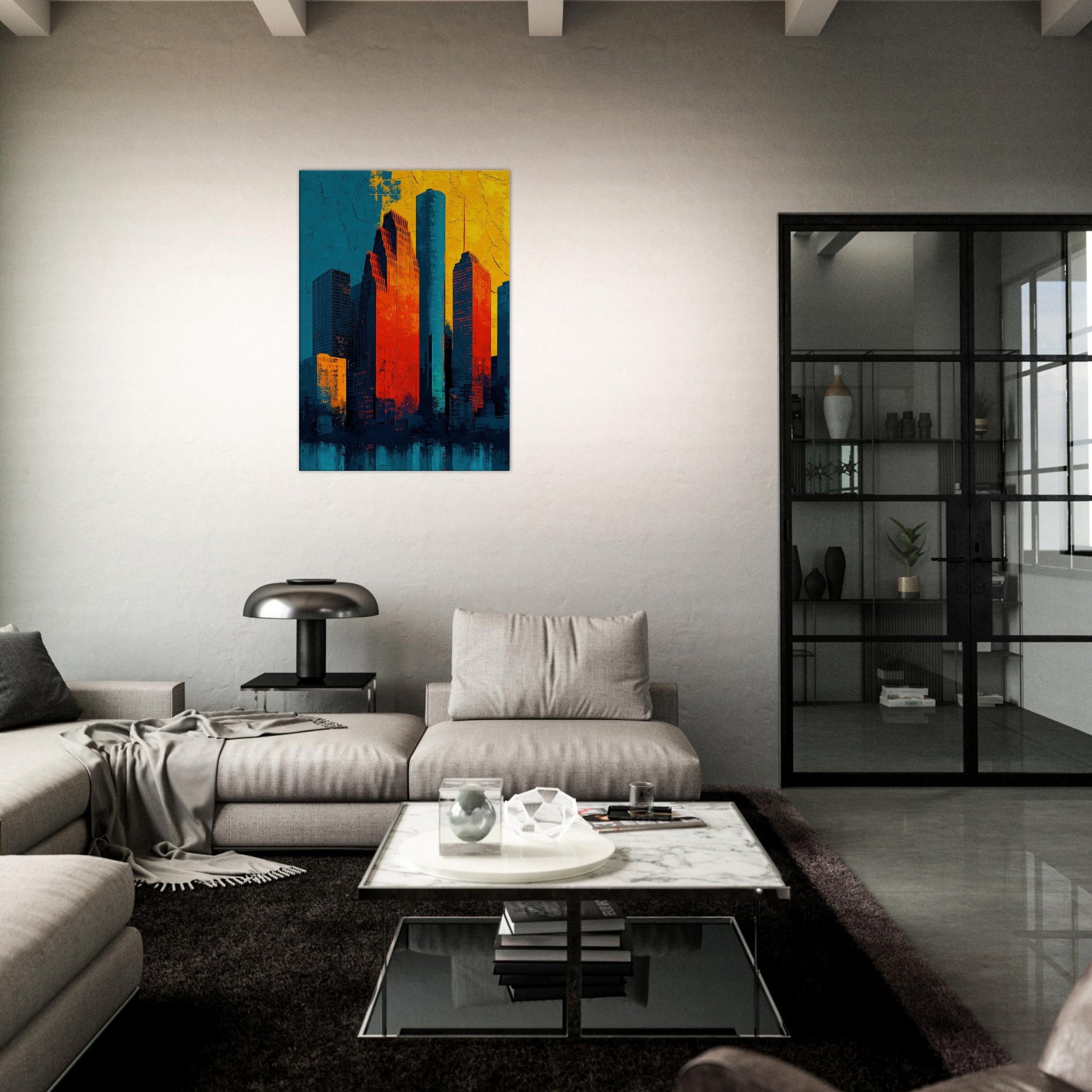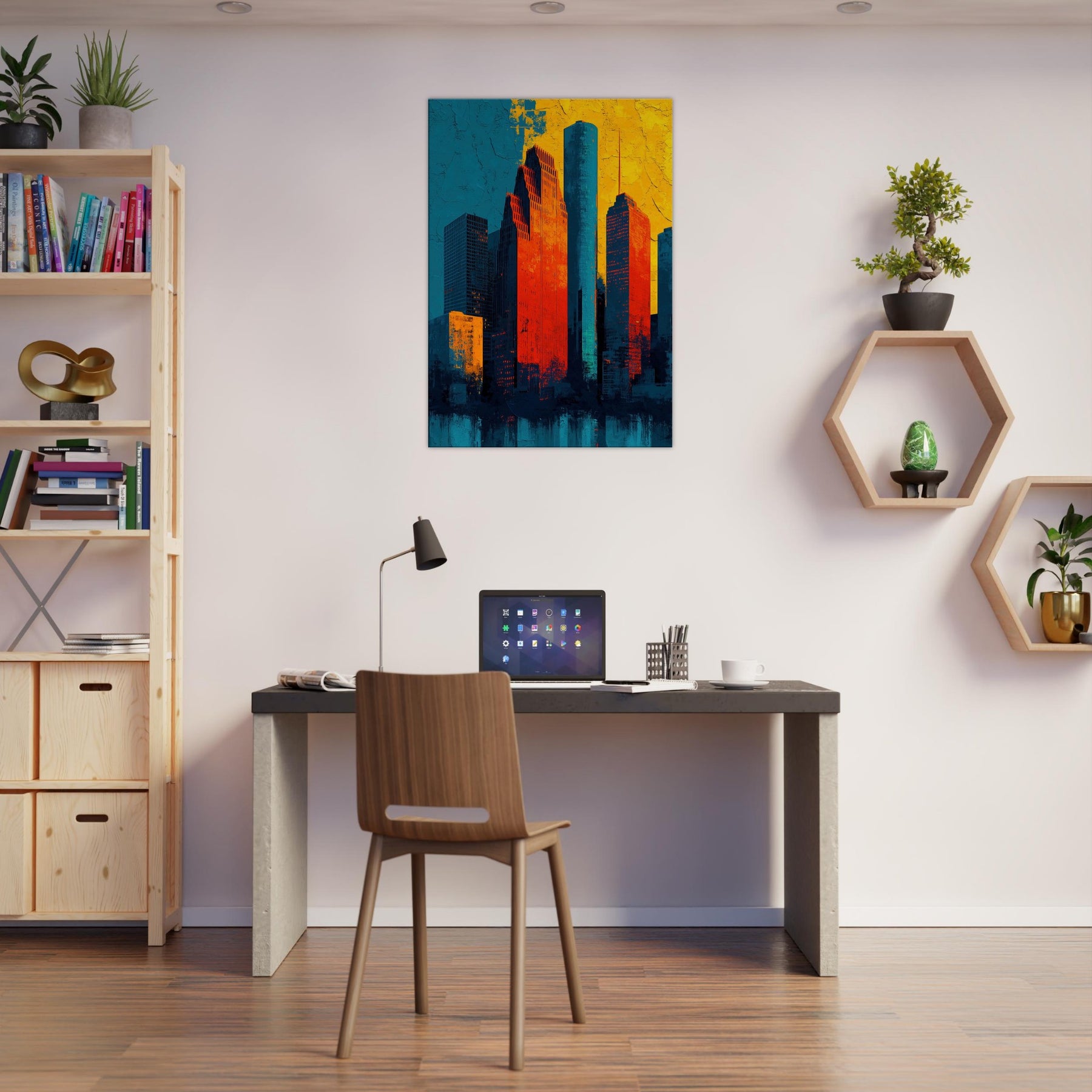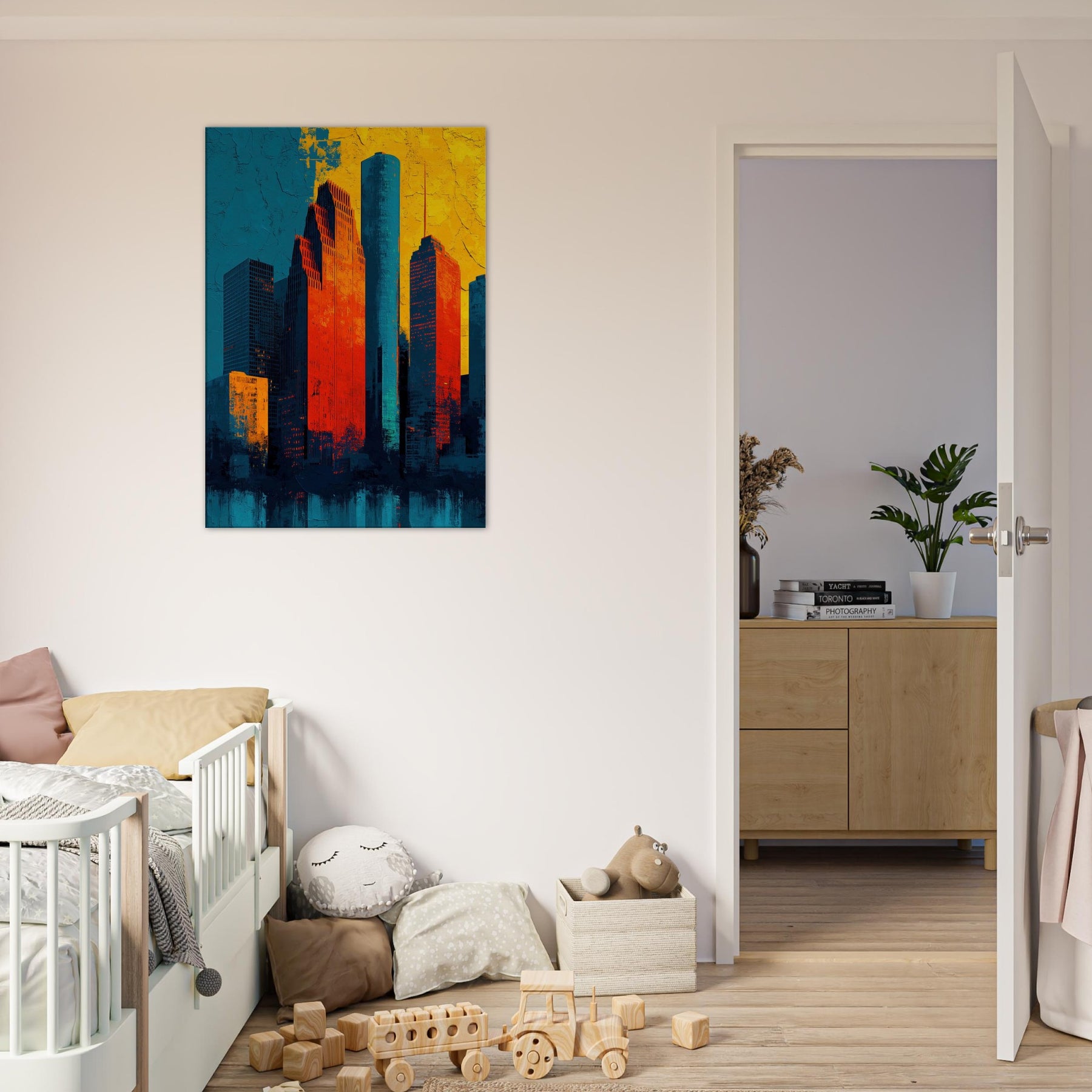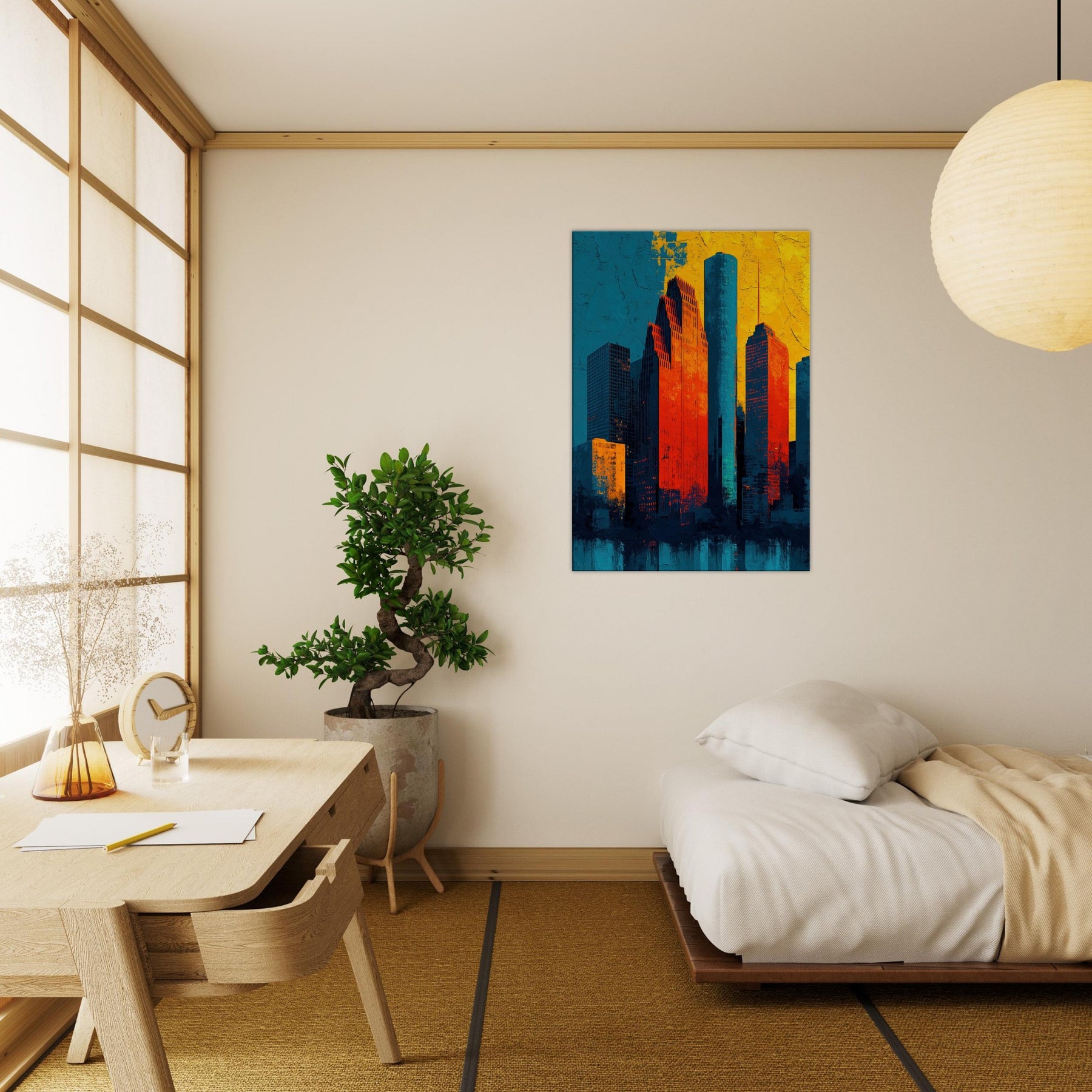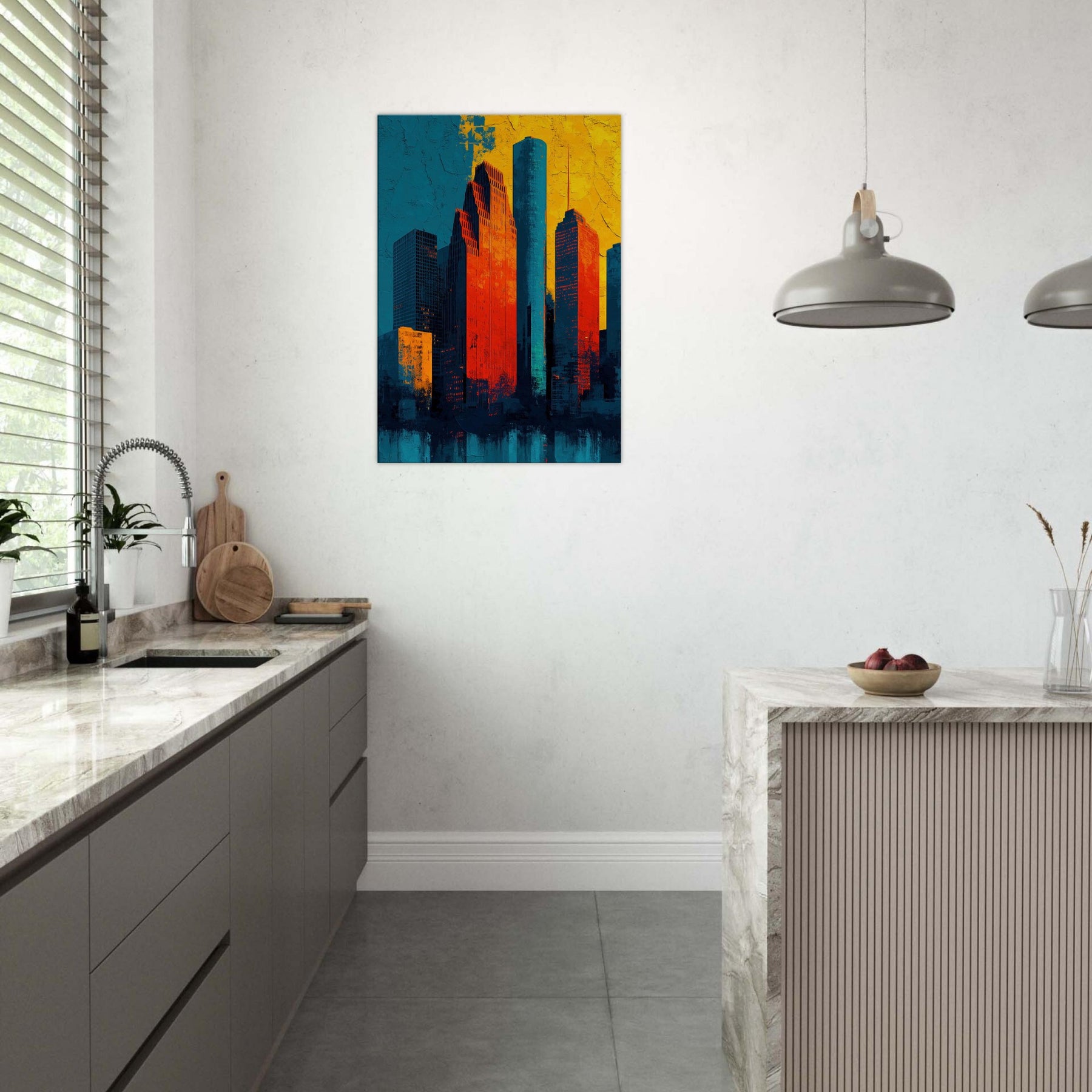 Let Houston rise in color and contour, a cityscape that breathes with electric blue and molten orange. This abstract composition fuses towers and horizons into a tactile, sunlit hum that warms living spaces and fuels conversation. The artwork invites quiet reflection at dawn, bold energy at night, and a sense of urban movement in between. A focal point above a sofa or console, it transforms a room into a nocturnal skyline of memory and possibility.
