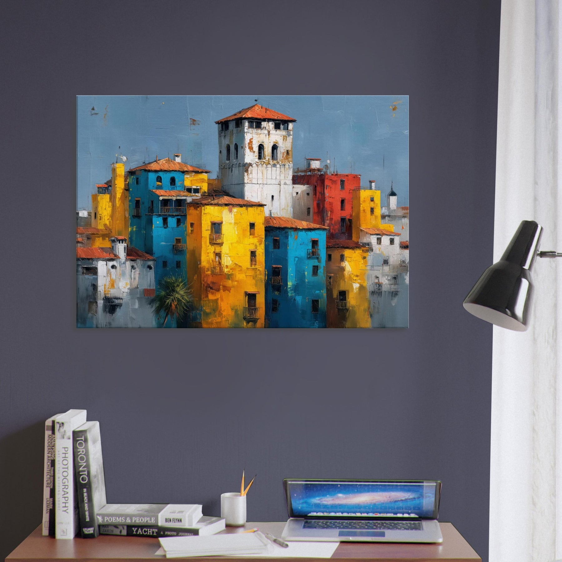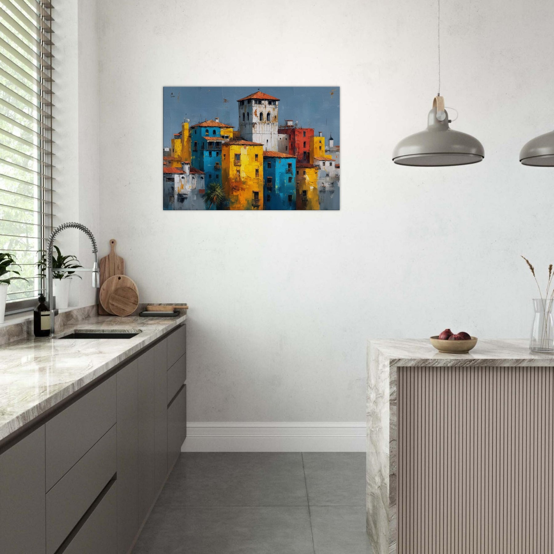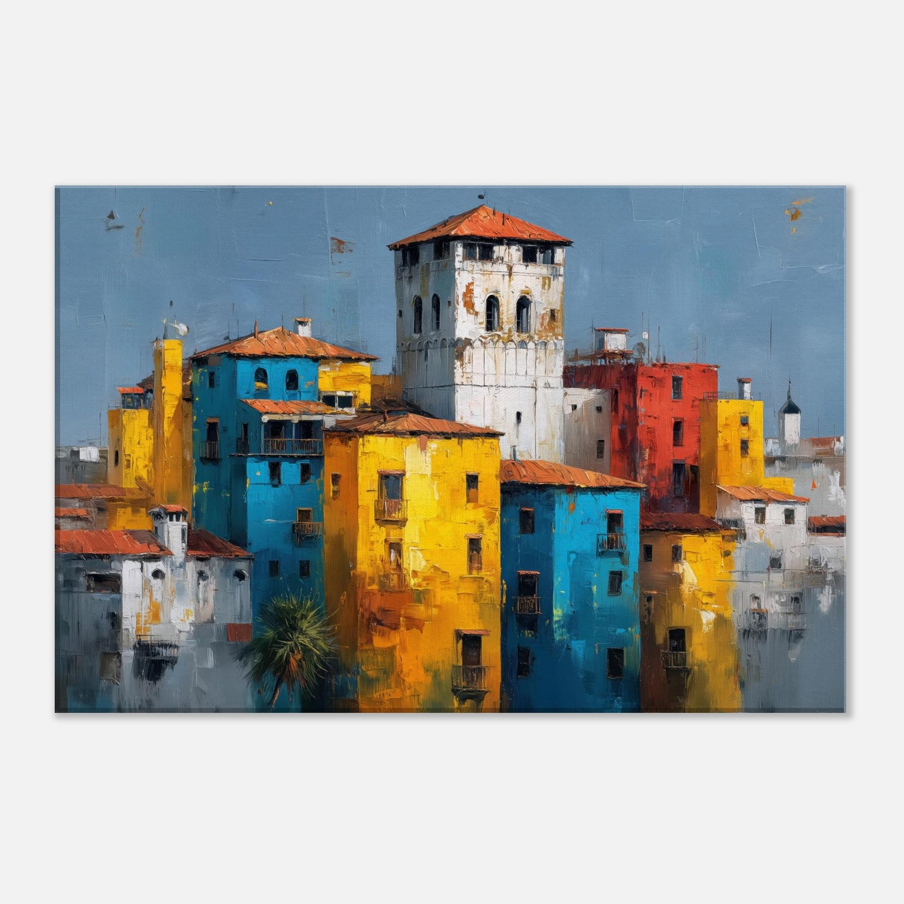 This painting hums with sunlit façades and confiding shadows, a Venice skyline reimagined in bold blocks of color. Tall yellows mingle with electric blues, whitewashed towers rise like distant bells, and a brick red heartbeat keeps time with the canal’s memory. The abstract composition invites the eye to drift and linger, turning a living room into a sun drenched terrace where laughter, warmth, and the scent of salt air linger. Hang it to frame conversations with travel, memory, and elegant city light.