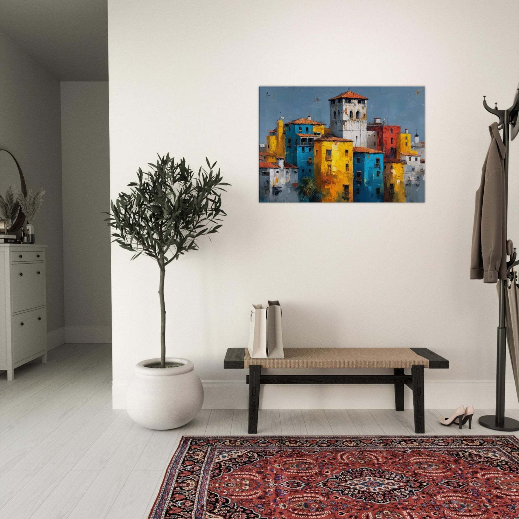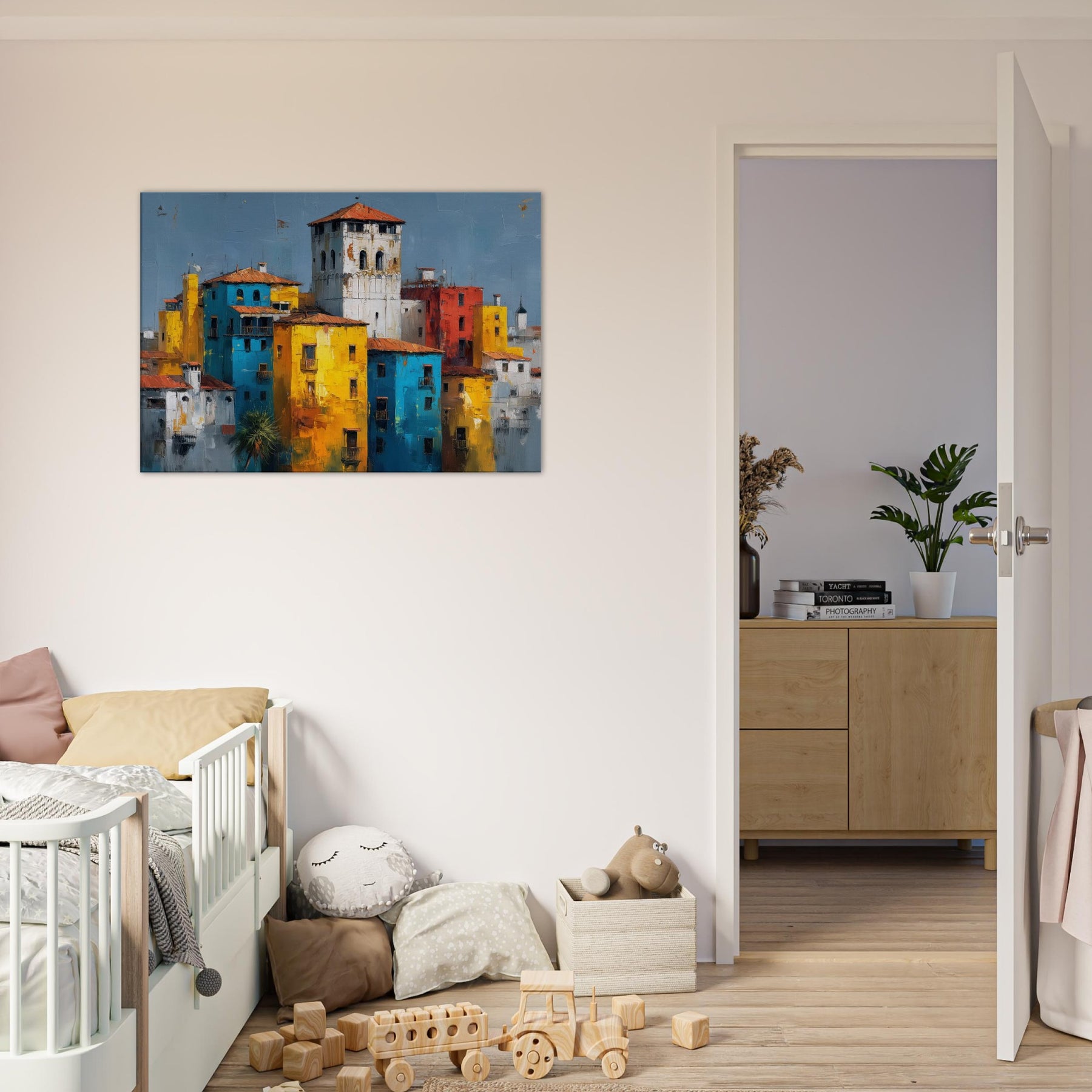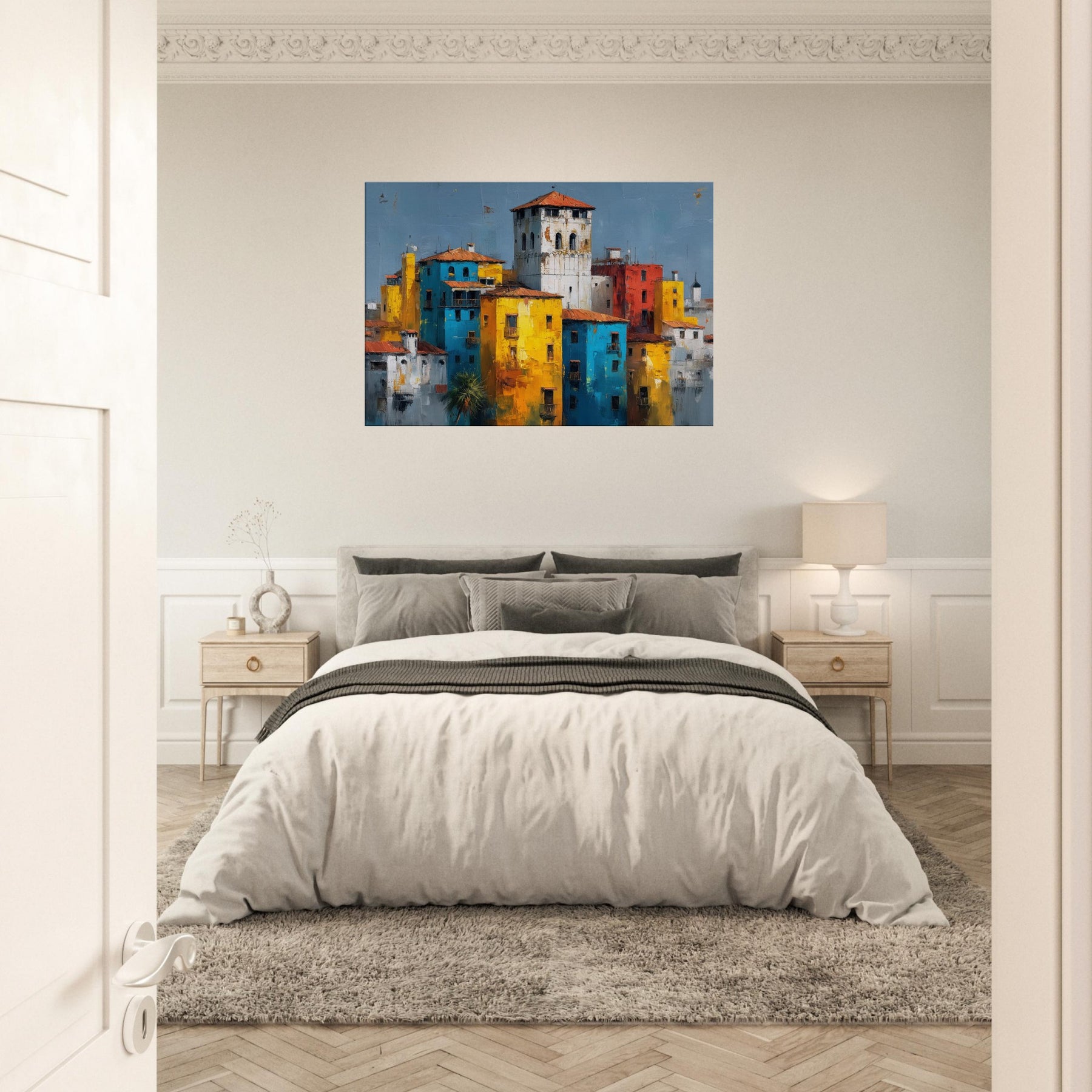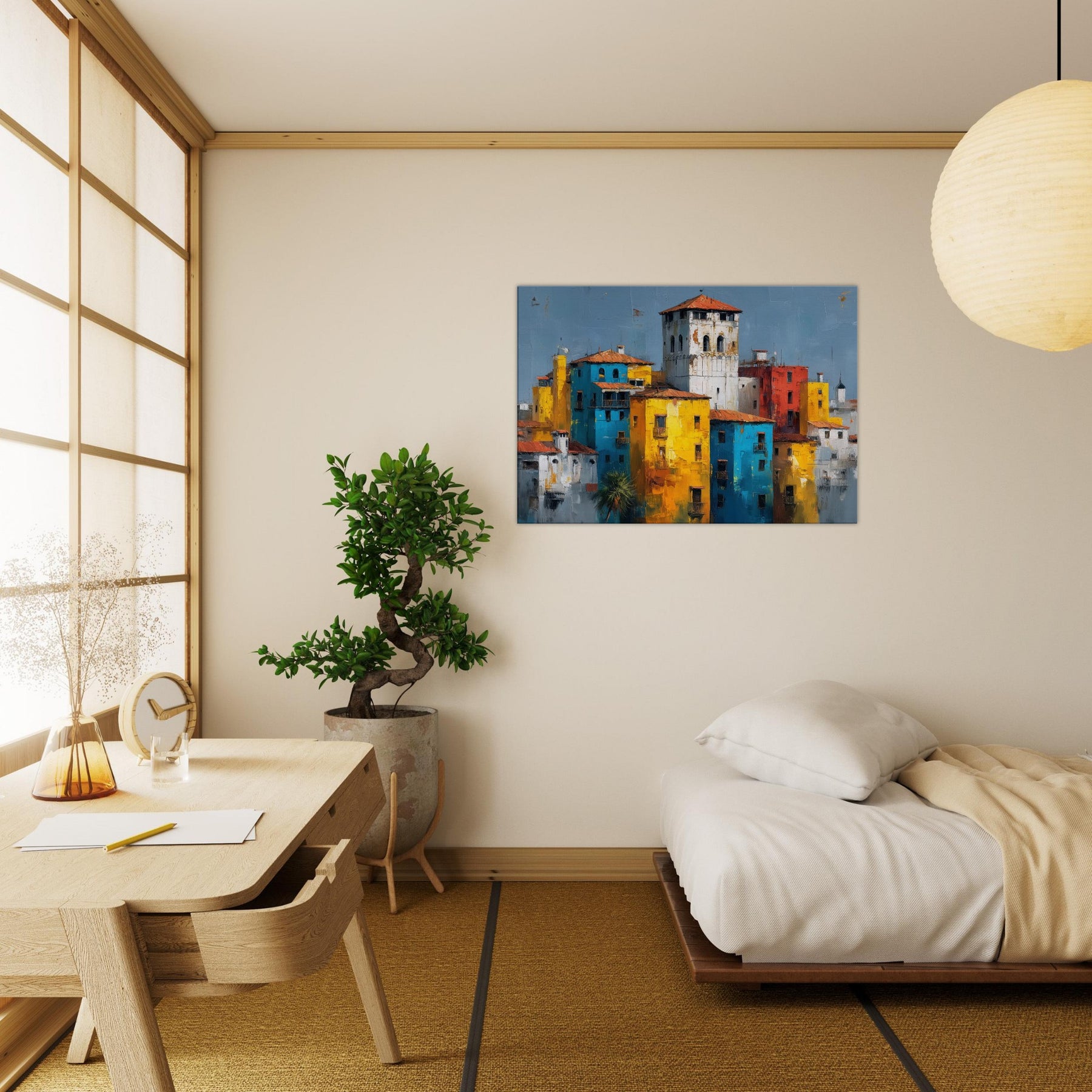 This painting hums with sunlit façades and confiding shadows, a Venice skyline reimagined in bold blocks of color. Tall yellows mingle with electric blues, whitewashed towers rise like distant bells, and a brick red heartbeat keeps time with the canal’s memory. The abstract composition invites the eye to drift and linger, turning a living room into a sun drenched terrace where laughter, warmth, and the scent of salt air linger. Hang it to frame conversations with travel, memory, and elegant city light.