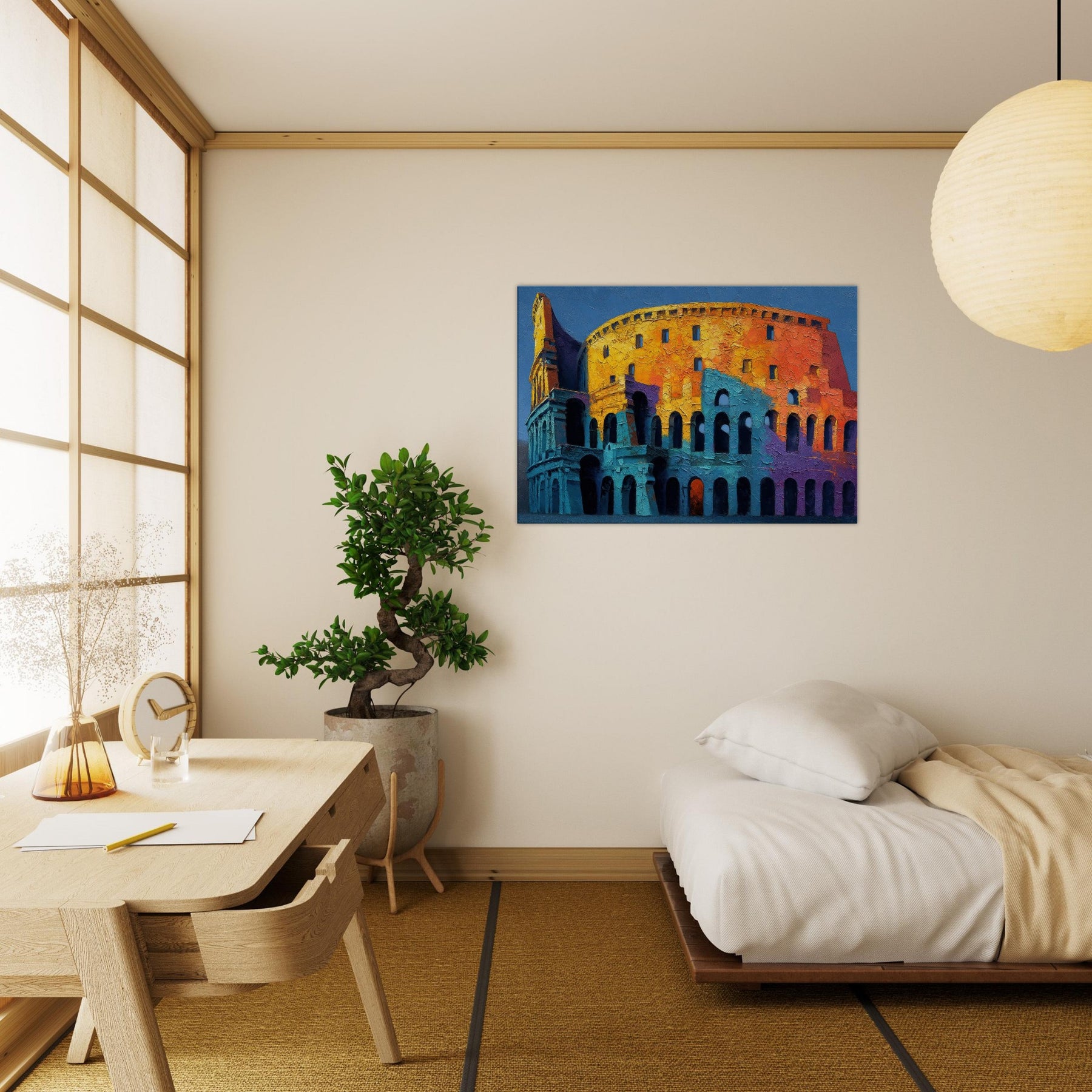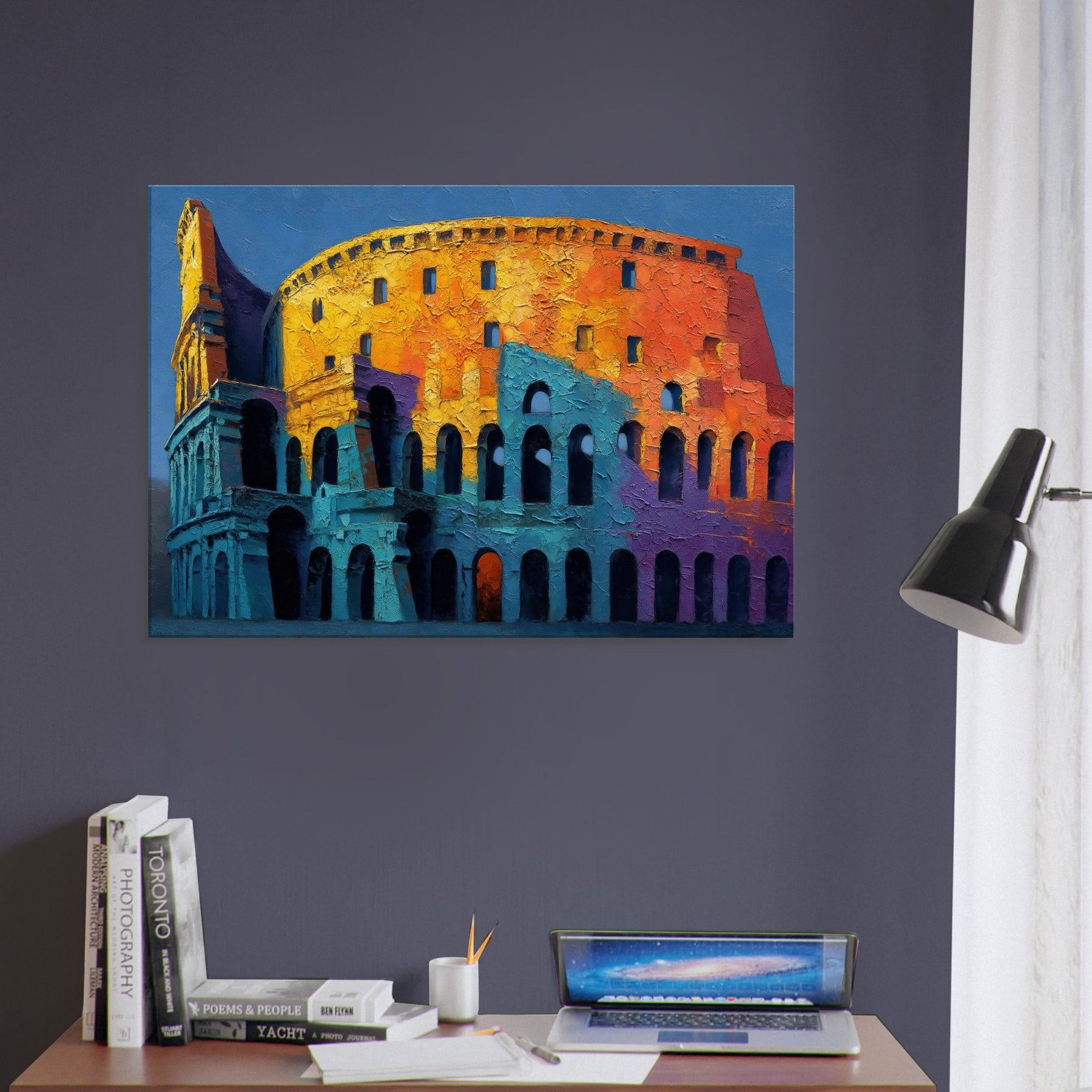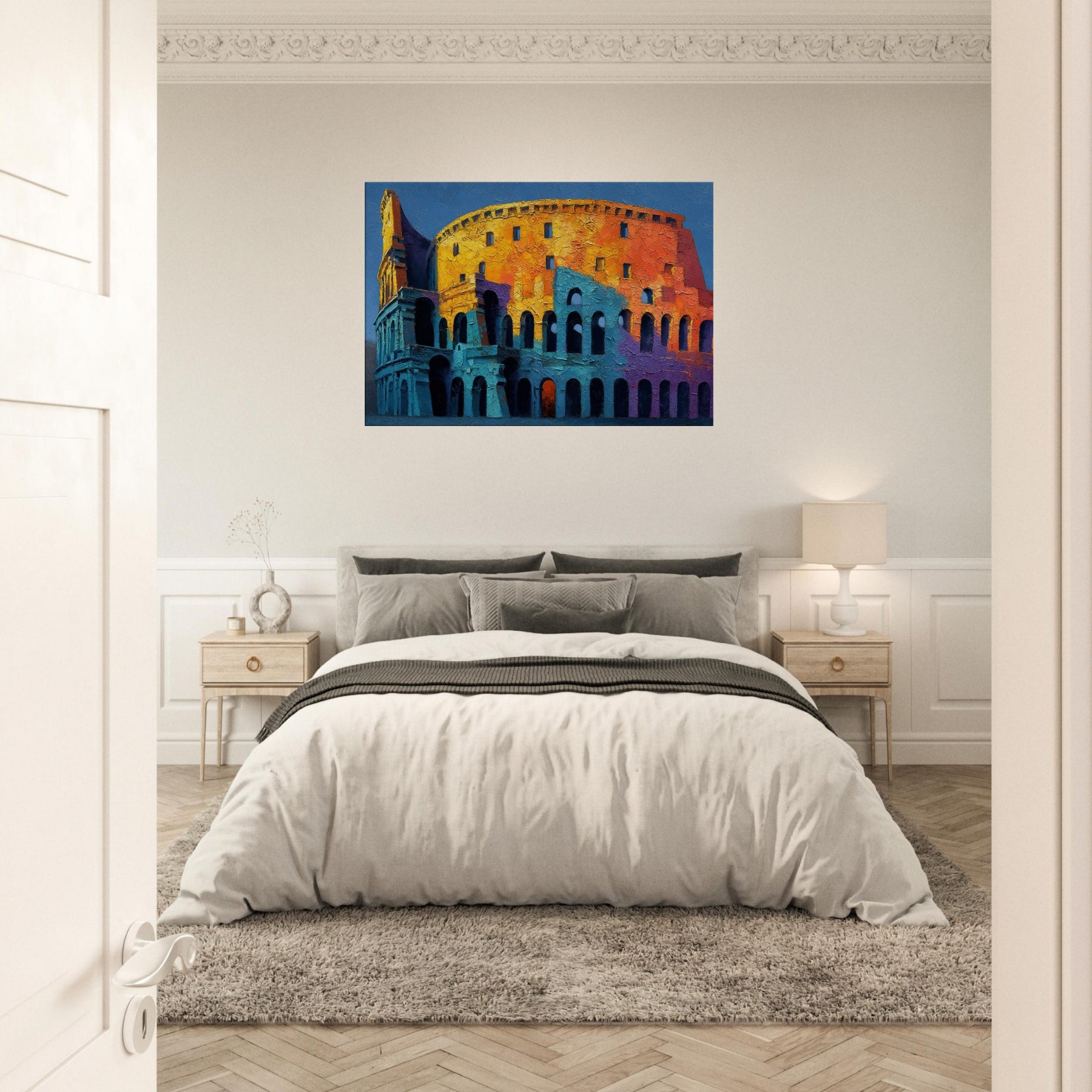 Colosseum in Dawn awakens the room with a chorus of color and memory. Thick impasto textures catch the light and shift from sunlit yellows to oceanic teals, leaving shadows that feel like corridors of an ancient arena. This piece pours warmth into a living room or study, inviting the eye to wander and the mind to dream of centuries of crowds. Its bold, architectural rhythm anchors modern furniture, turning walls into a narrative of city and stone.