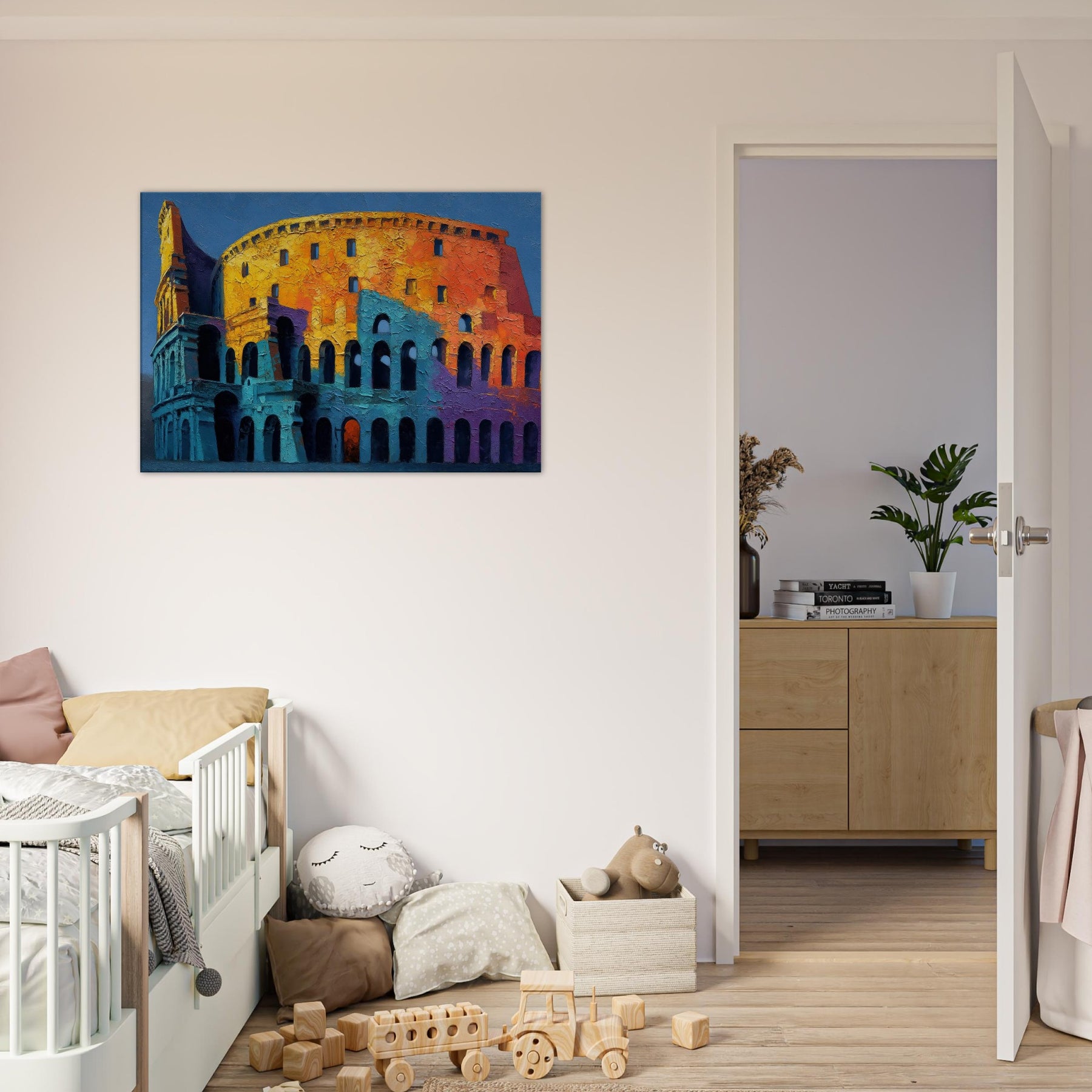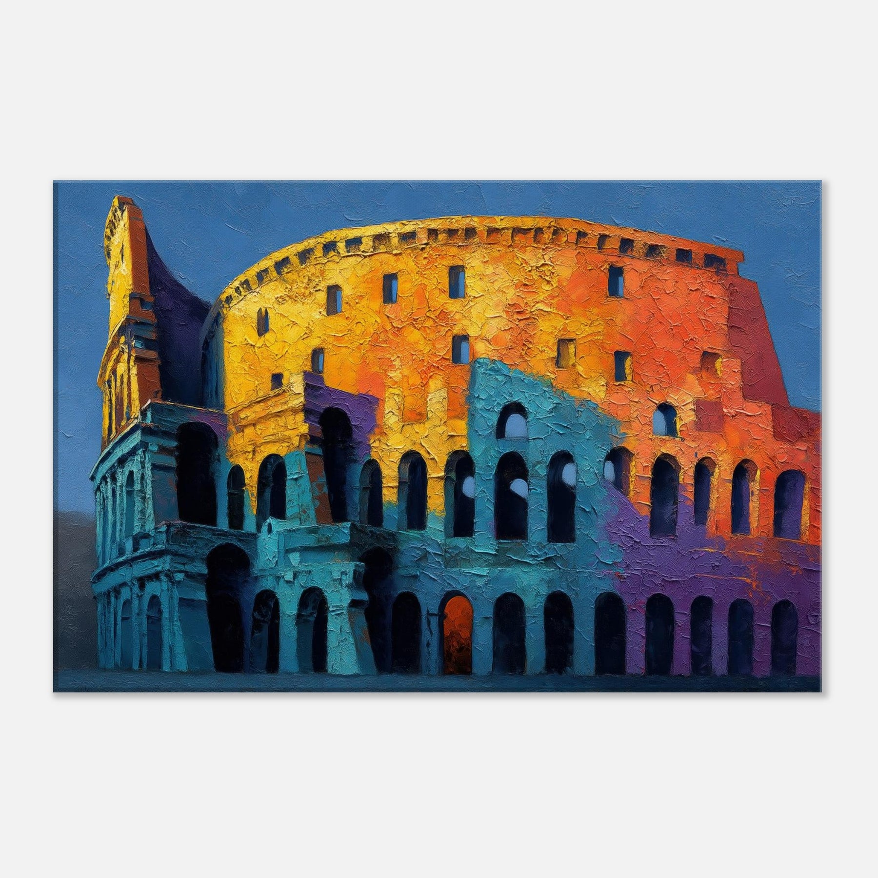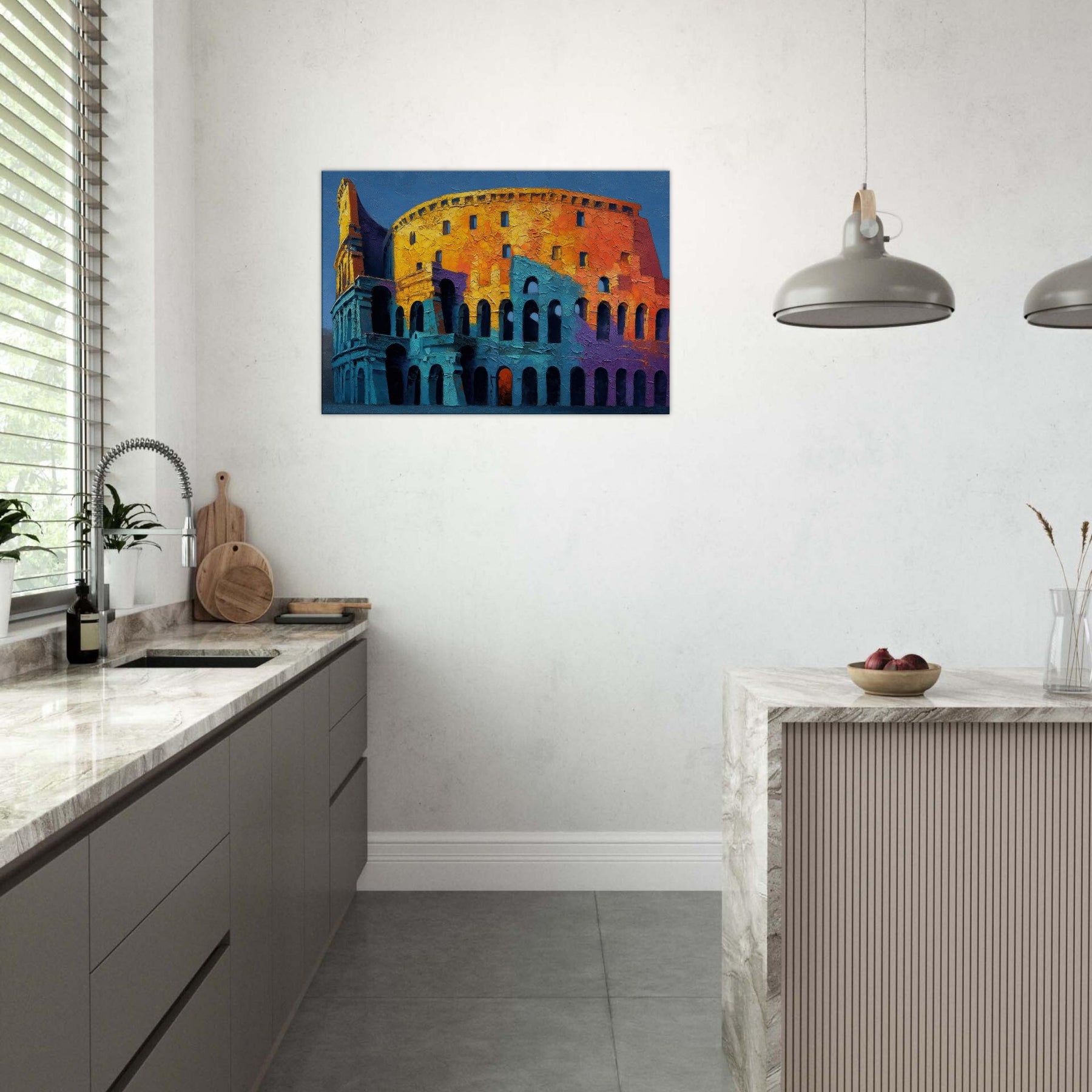 Colosseum in Dawn awakens the room with a chorus of color and memory. Thick impasto textures catch the light and shift from sunlit yellows to oceanic teals, leaving shadows that feel like corridors of an ancient arena. This piece pours warmth into a living room or study, inviting the eye to wander and the mind to dream of centuries of crowds. Its bold, architectural rhythm anchors modern furniture, turning walls into a narrative of city and stone.