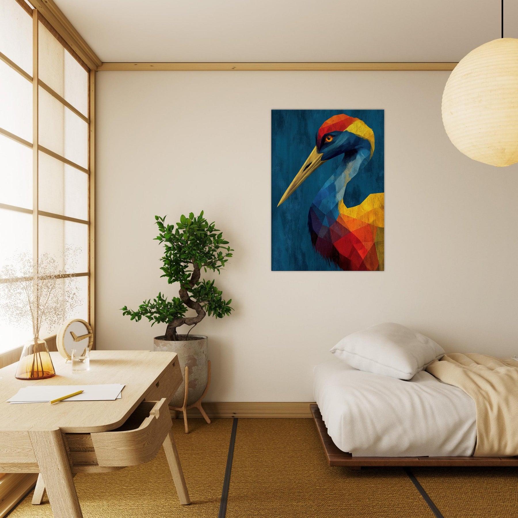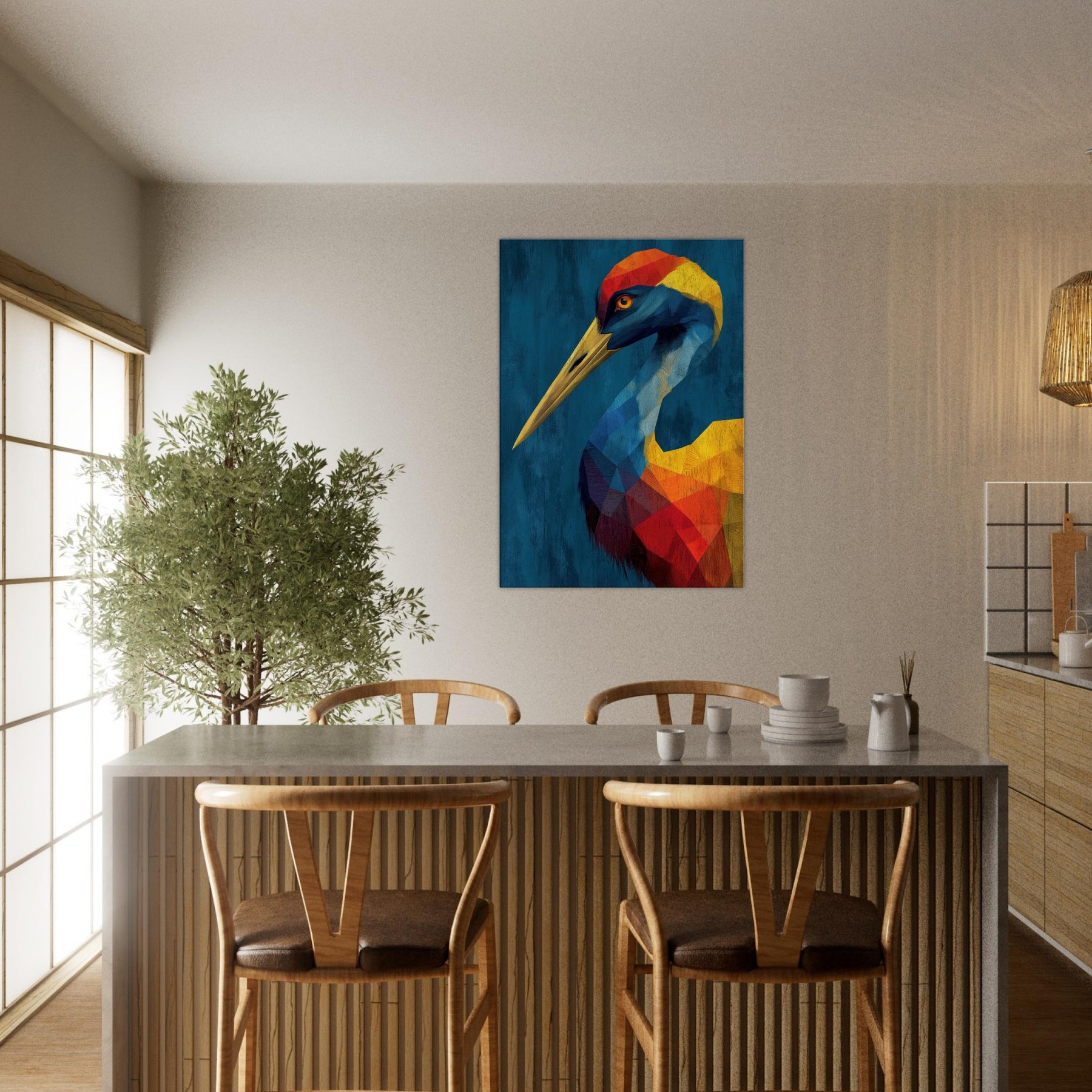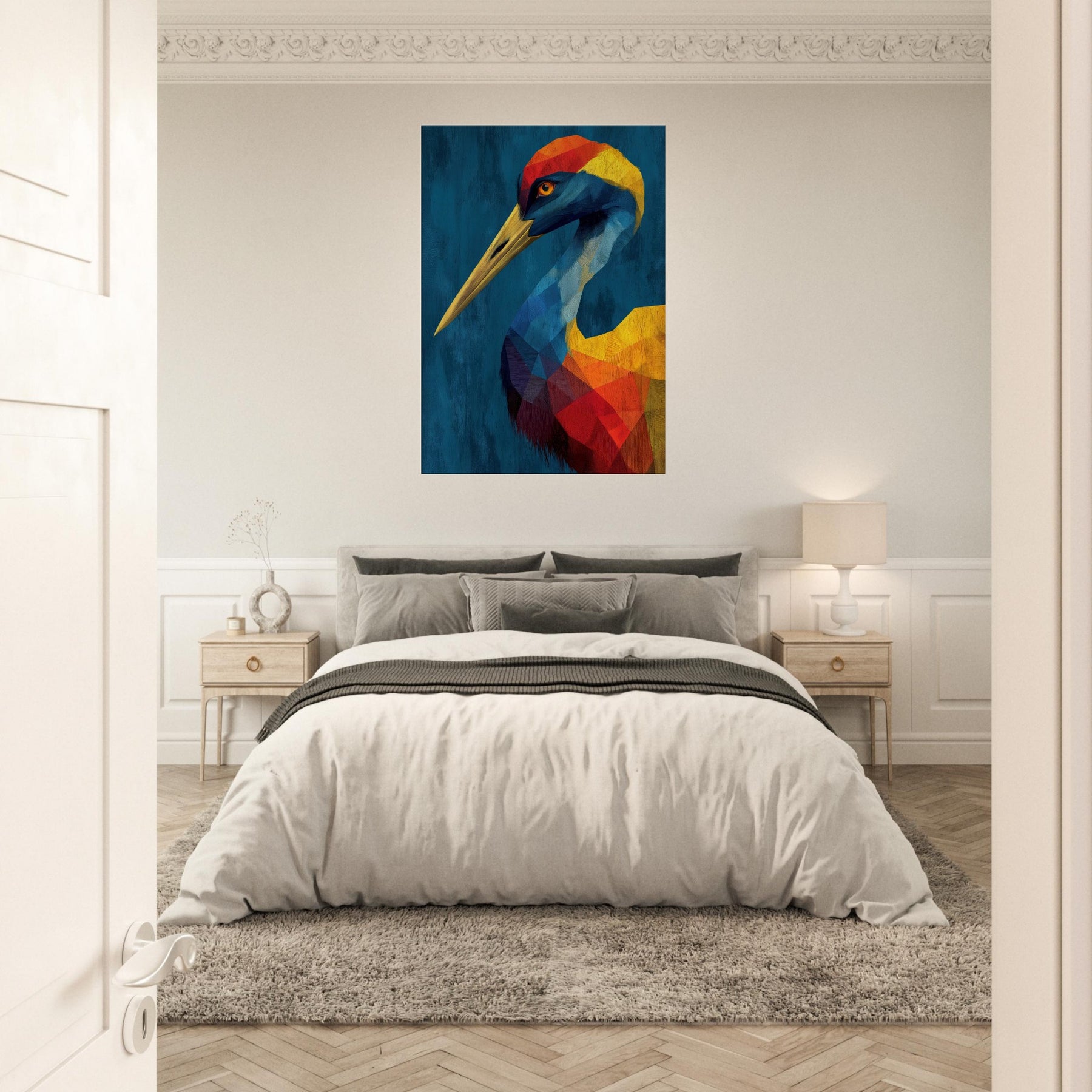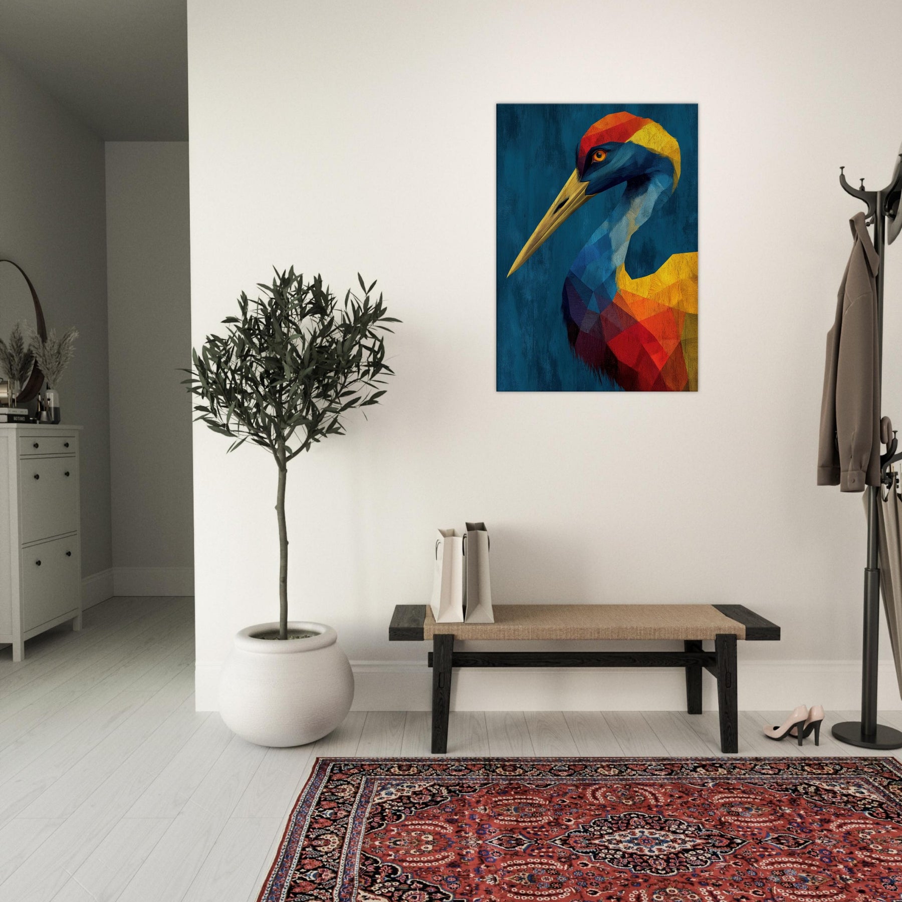 Let this Crane Prism Echo drift into your living space as a pulse of light and movement. The abstract facets catch sun and lamp glow, scattering warmth across walls, while the bird's elongated beak becomes a directional sculpture guiding the room's rhythm. Each angular facet invites touch and imagination, turning a corner into a quiet sanctuary. The painting's blue depths and fiery bursts harmonize with wood, metal, and textiles, conjuring a serene wilderness within the home.