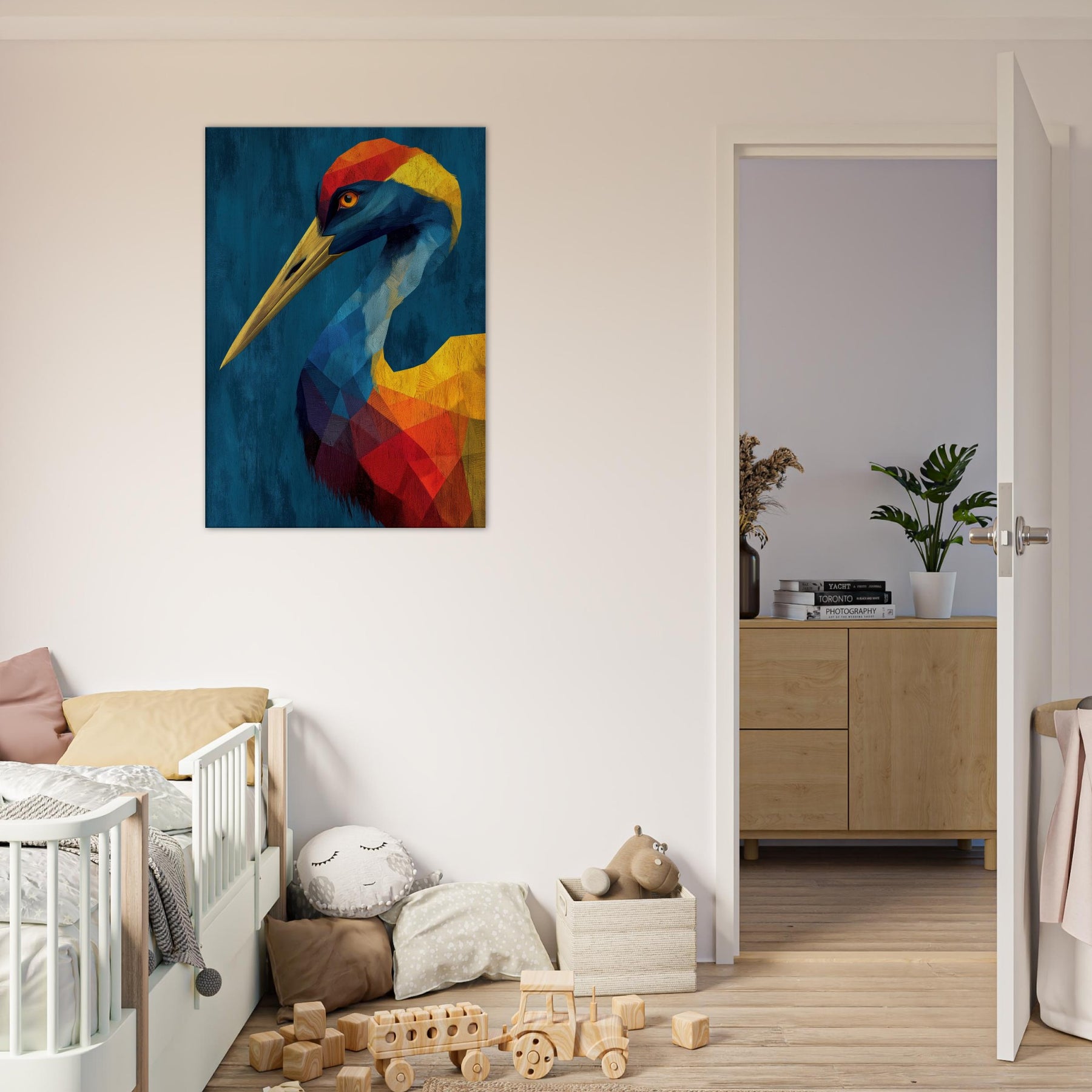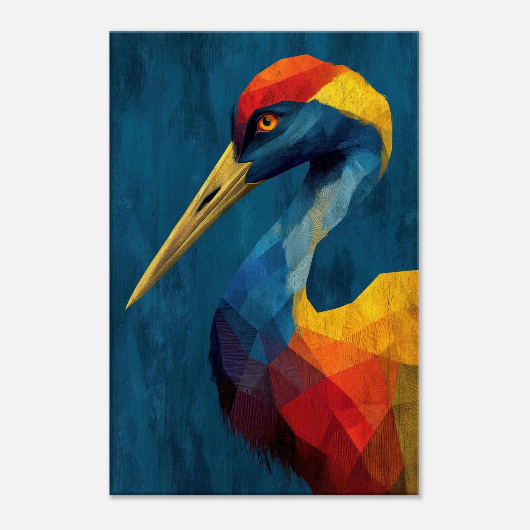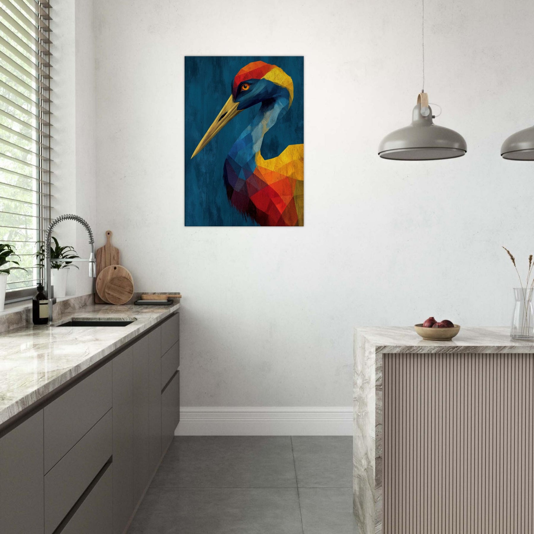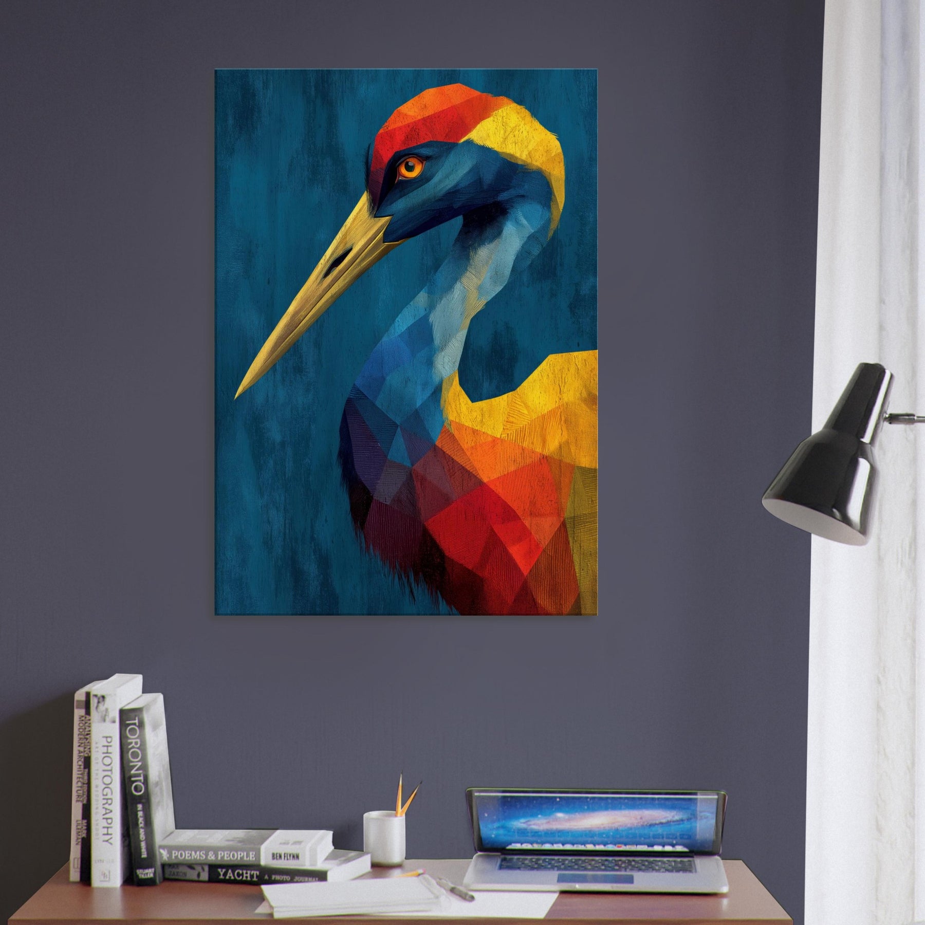 Let this Crane Prism Echo drift into your living space as a pulse of light and movement. The abstract facets catch sun and lamp glow, scattering warmth across walls, while the bird's elongated beak becomes a directional sculpture guiding the room's rhythm. Each angular facet invites touch and imagination, turning a corner into a quiet sanctuary. The painting's blue depths and fiery bursts harmonize with wood, metal, and textiles, conjuring a serene wilderness within the home.