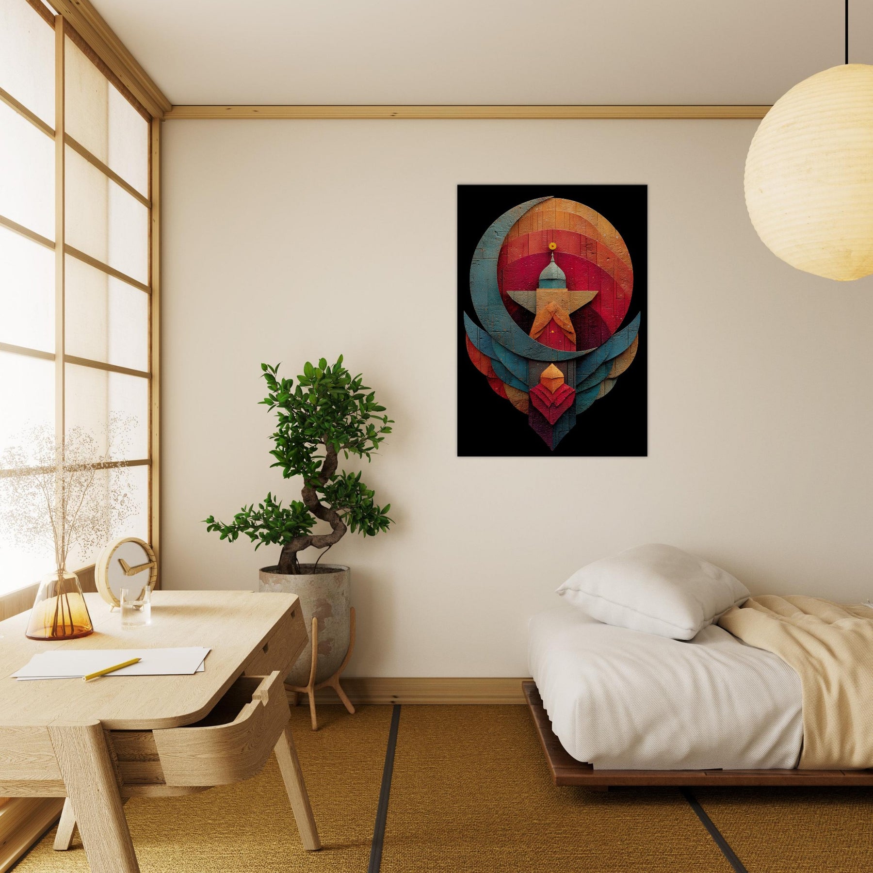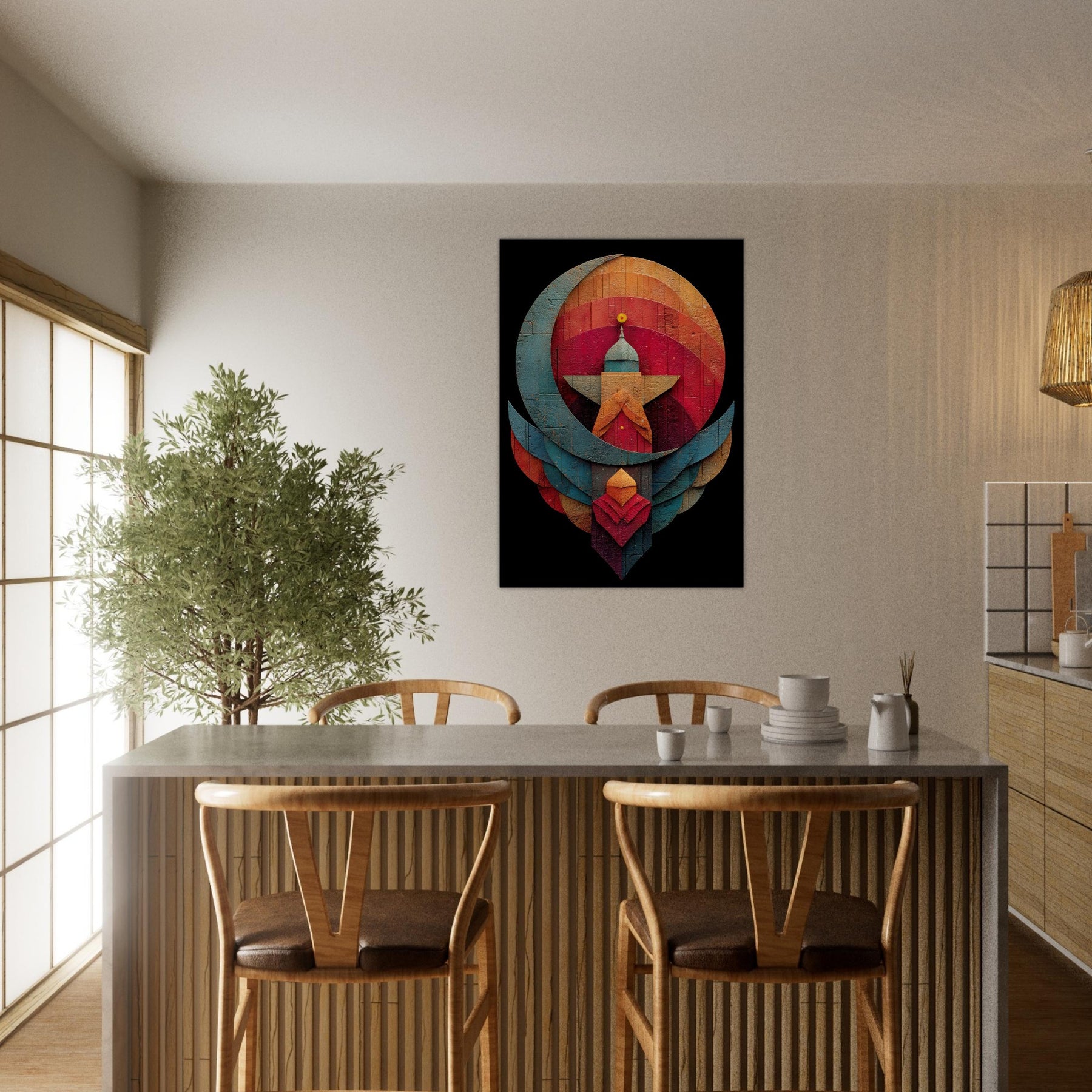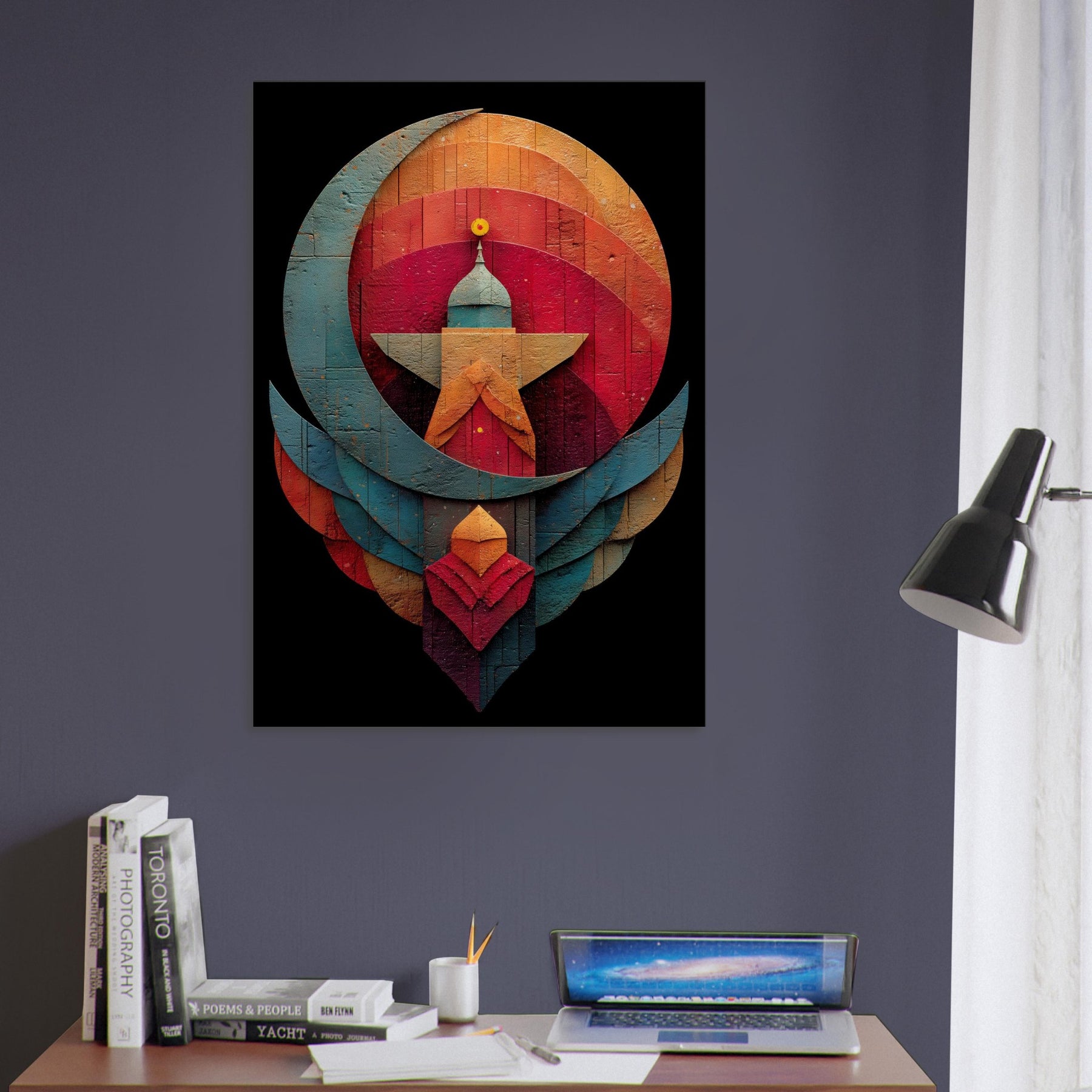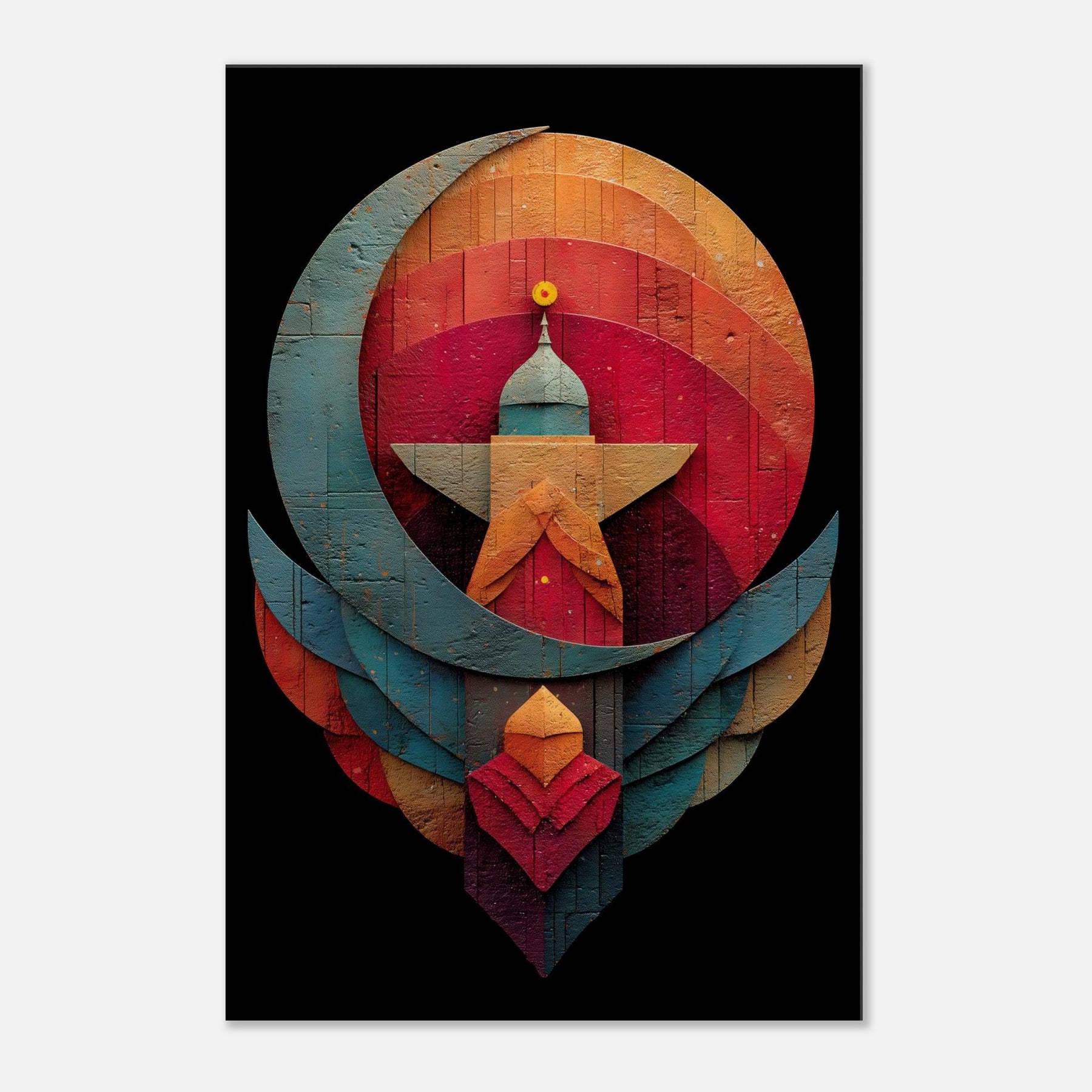 Like a whispered constellation, this Crescent & Star artwork unfurls a tranquil, mystical atmosphere across your living space. Layered arcs and a bold central beacon draw the eye with quiet gravity, while warm and cool tones mingle in a velvet dusk glow. The abstract composition invites reflection, turning a wall into a sanctuary where light seems to bloom and shift. Hang it above a sofa or in a reading nook to soften edges, spark conversation, and invite mindful stillness. The central subject is Crescent & Star (Minimal).