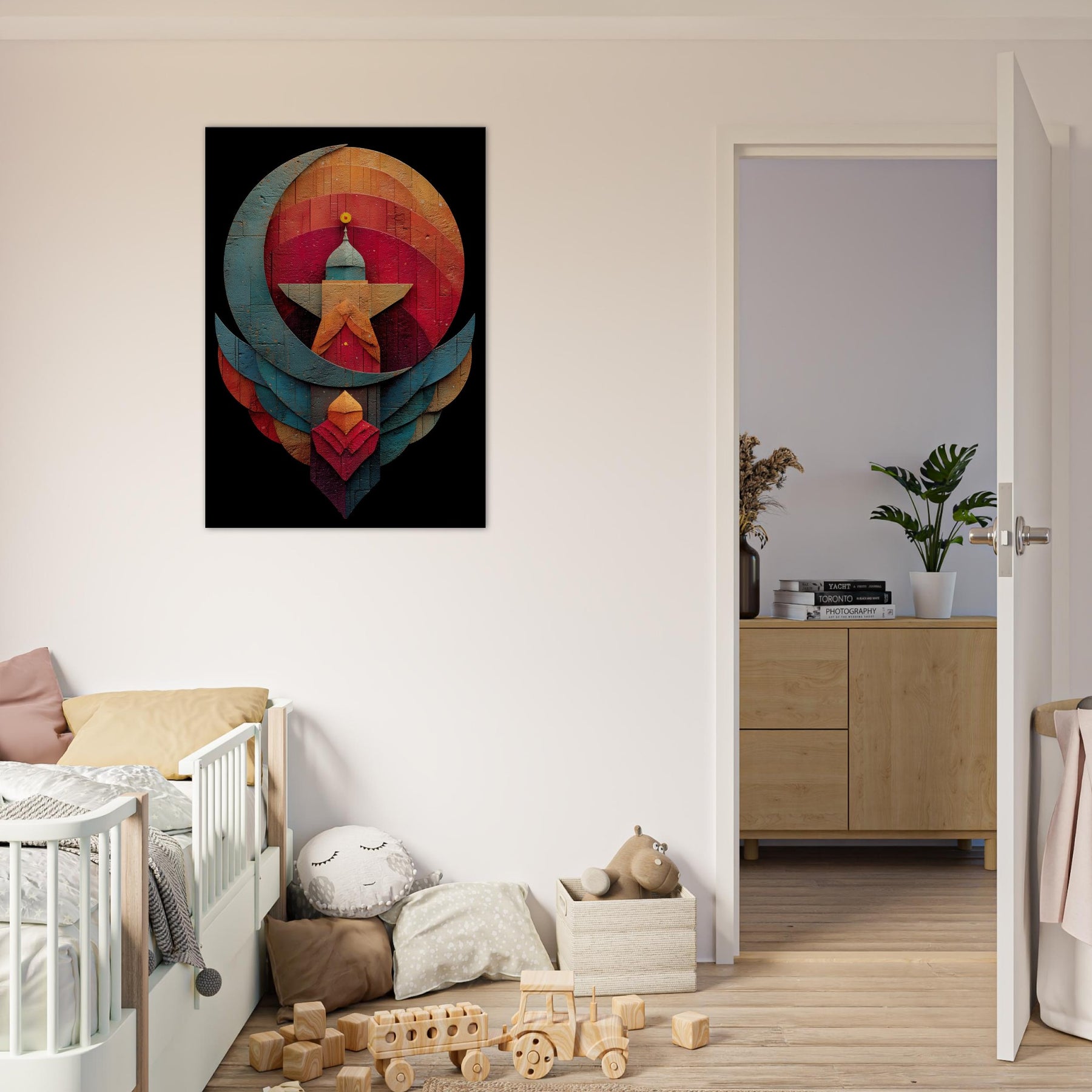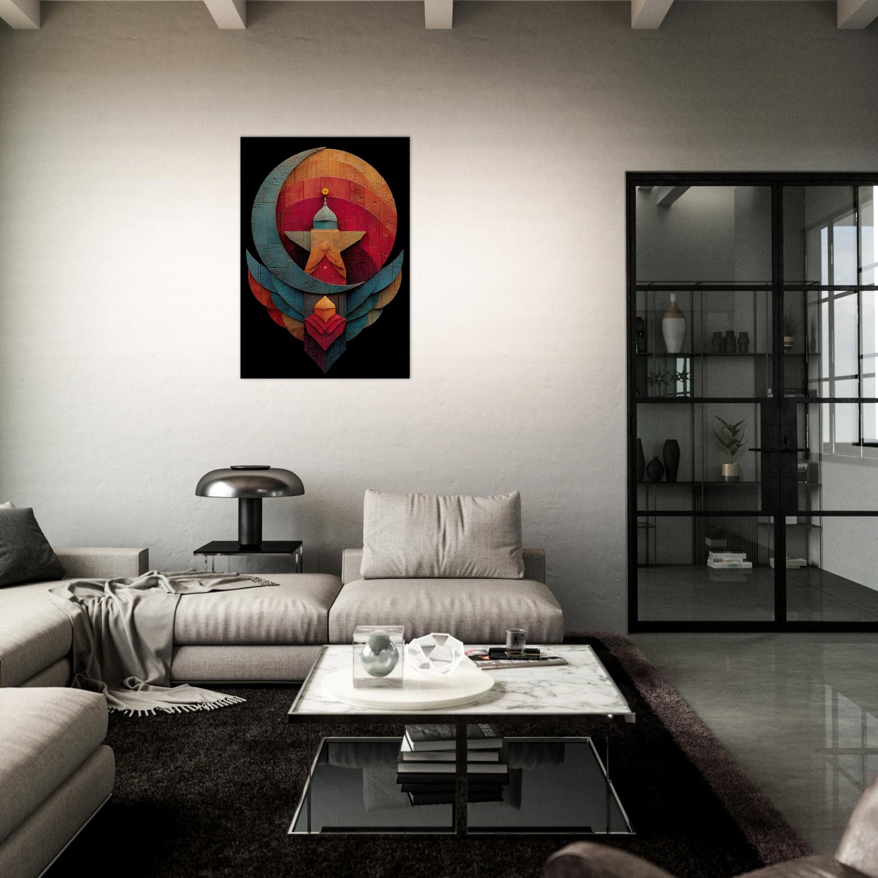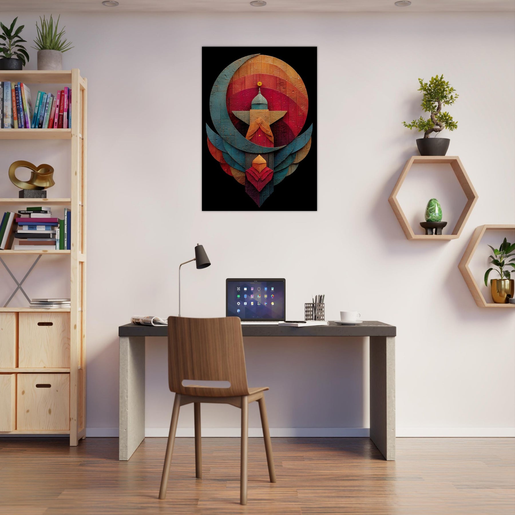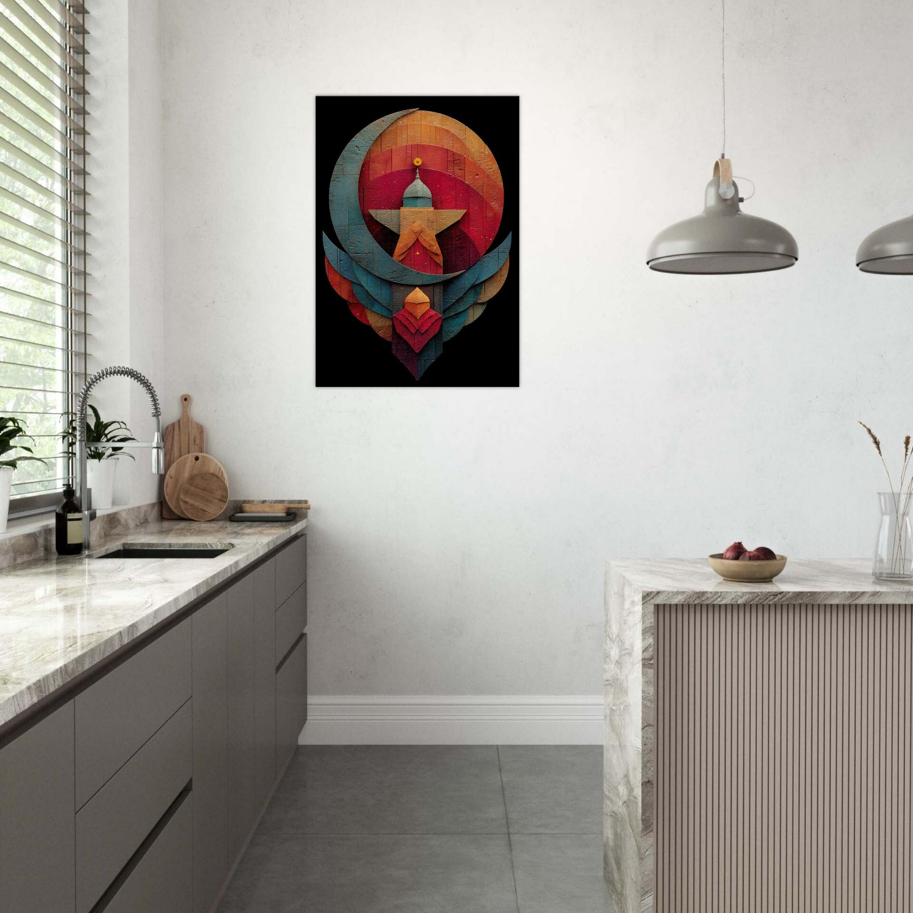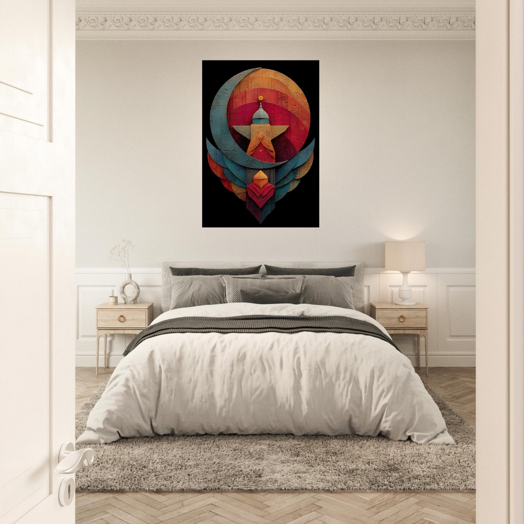 Like a whispered constellation, this Crescent & Star artwork unfurls a tranquil, mystical atmosphere across your living space. Layered arcs and a bold central beacon draw the eye with quiet gravity, while warm and cool tones mingle in a velvet dusk glow. The abstract composition invites reflection, turning a wall into a sanctuary where light seems to bloom and shift. Hang it above a sofa or in a reading nook to soften edges, spark conversation, and invite mindful stillness. The central subject is Crescent & Star (Minimal).