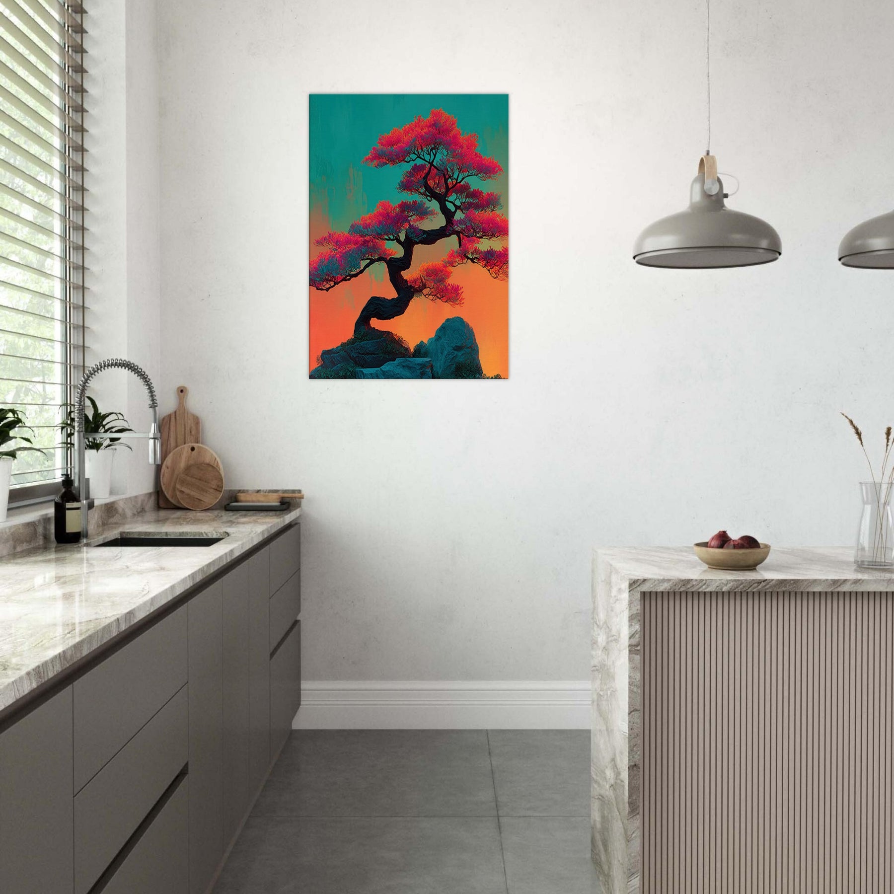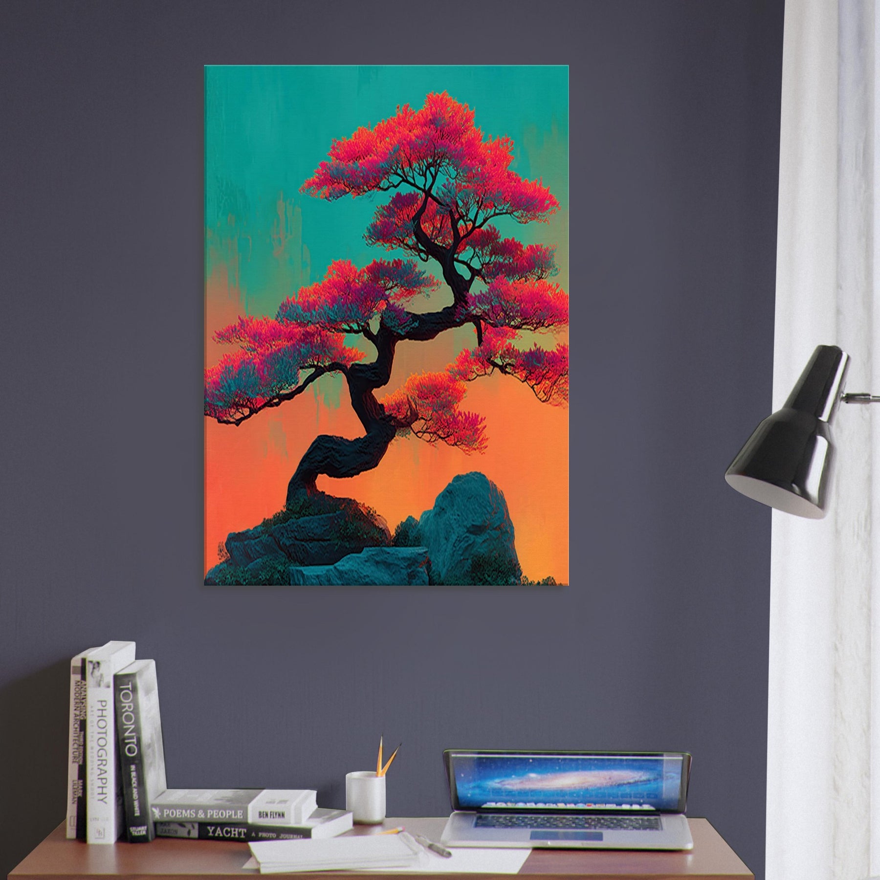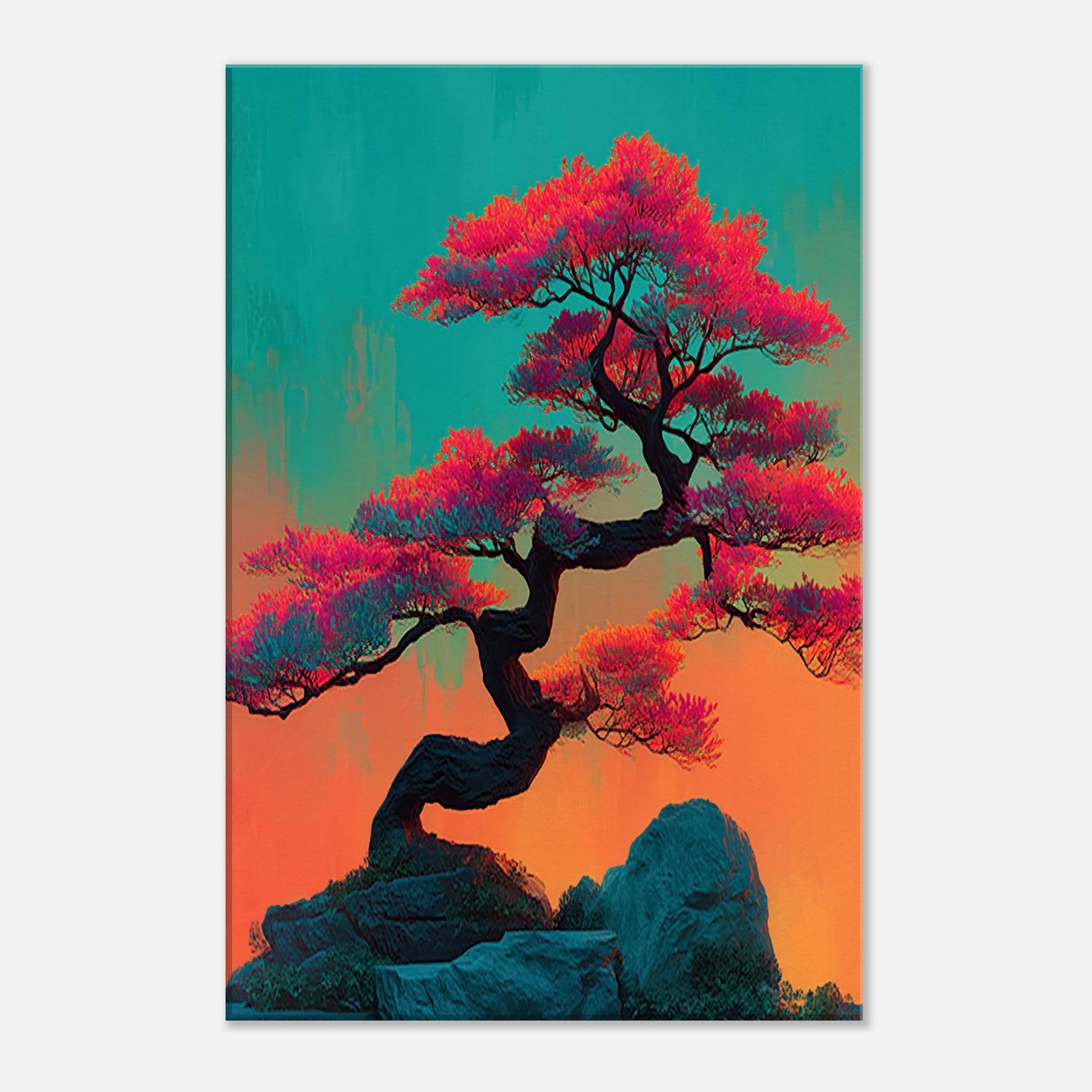 Let the Bonsai Silhouette hover above a dreamlike gradient, a calm, wind swept form set against teal skies and coral dawn. This abstract silhouette exudes quiet resilience and poetic grace, turning any room into a sanctuary of focus and warmth. Its bold contrast and delicate branches invite lingering gaze at eye level, while the luminous backdrop nourishes mood and conversation. Perfect for living spaces, studios, or entryways seeking timeless elegance and a whisper of wonder.