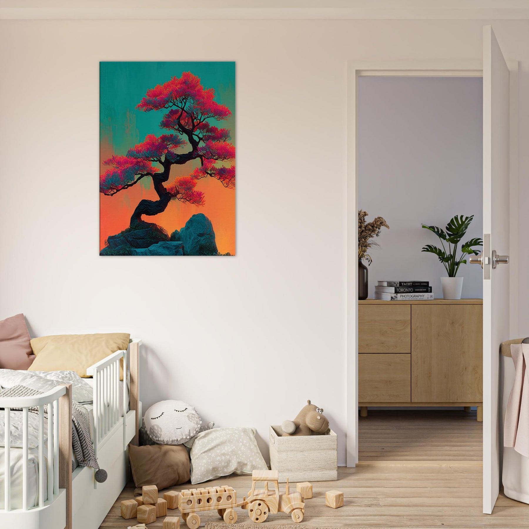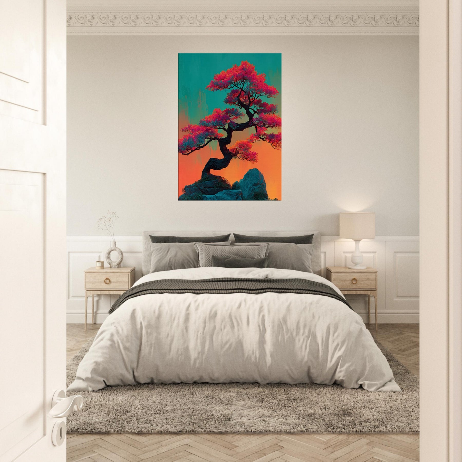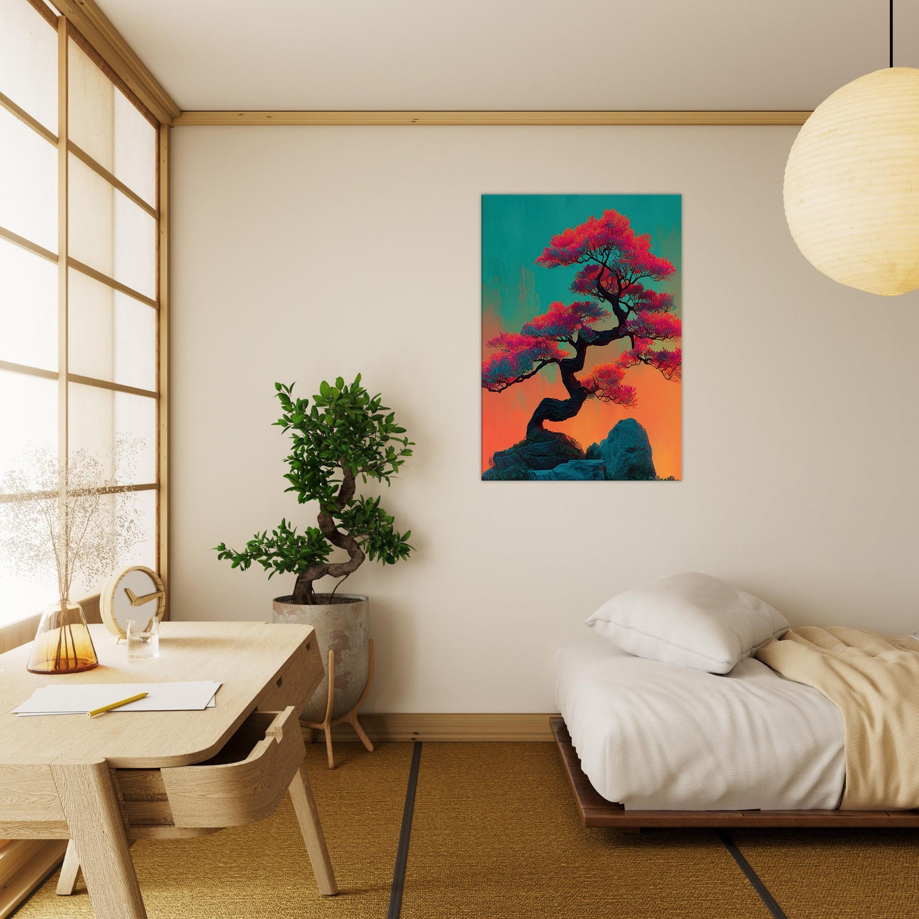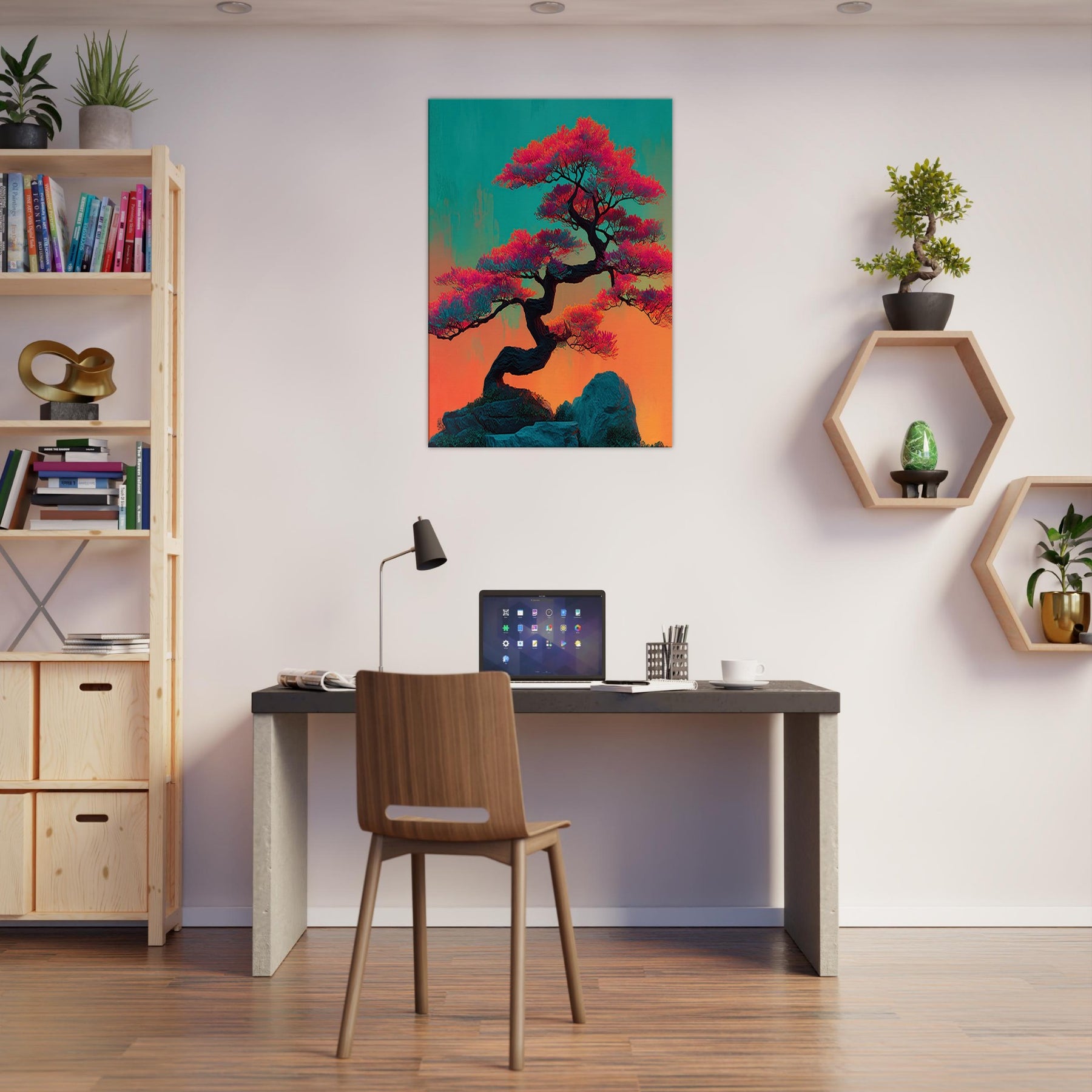 Let the Bonsai Silhouette hover above a dreamlike gradient, a calm, wind swept form set against teal skies and coral dawn. This abstract silhouette exudes quiet resilience and poetic grace, turning any room into a sanctuary of focus and warmth. Its bold contrast and delicate branches invite lingering gaze at eye level, while the luminous backdrop nourishes mood and conversation. Perfect for living spaces, studios, or entryways seeking timeless elegance and a whisper of wonder.