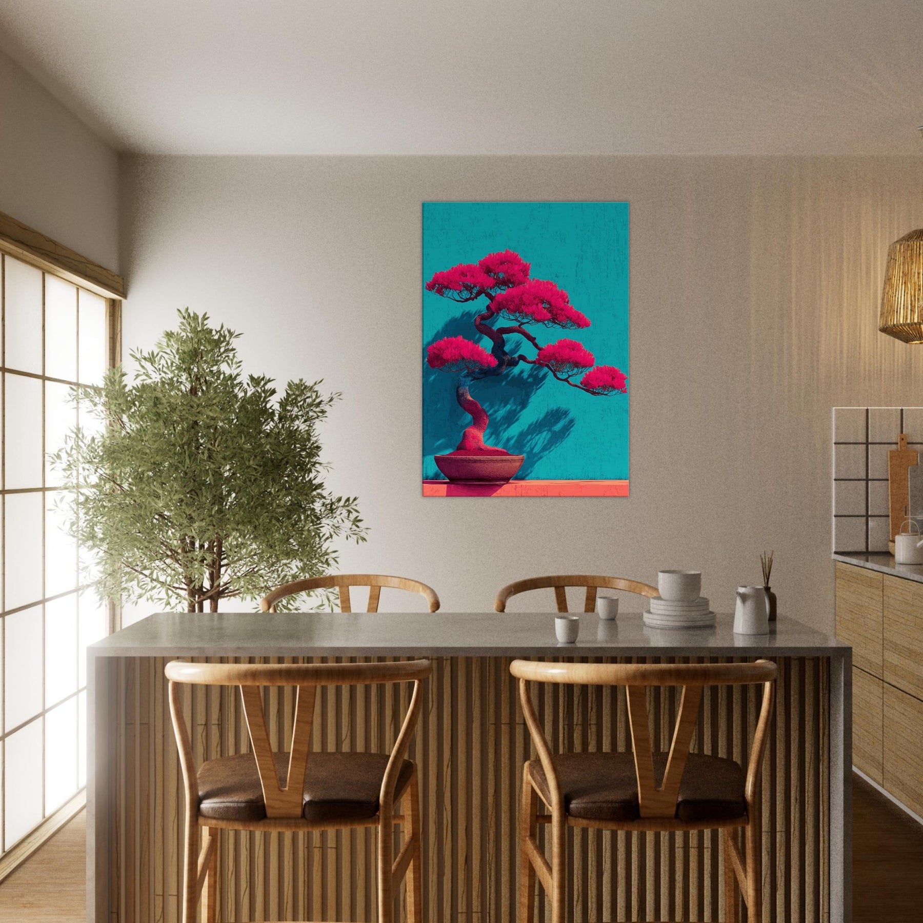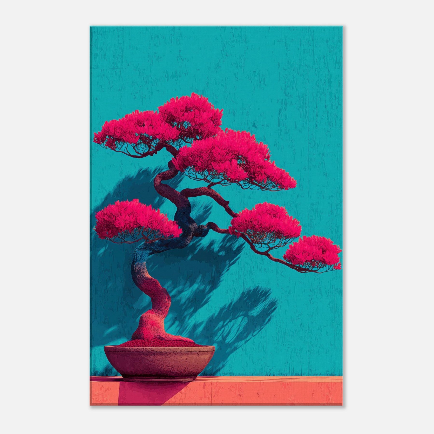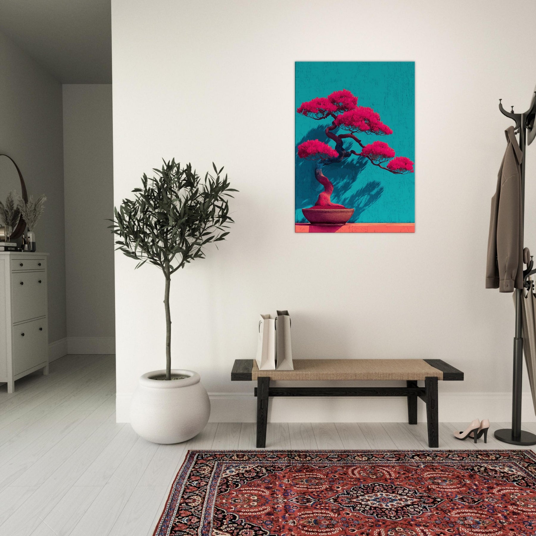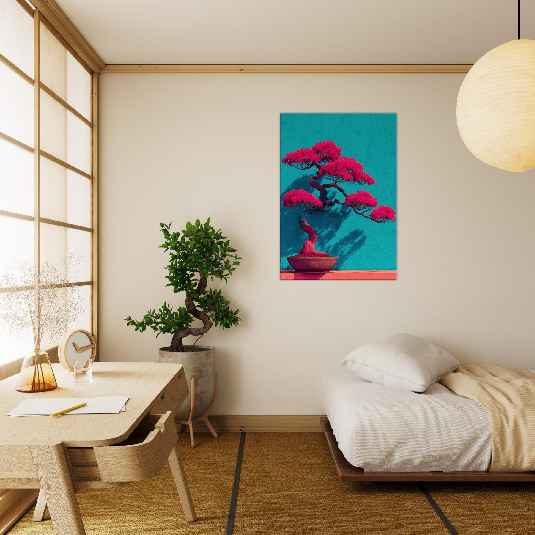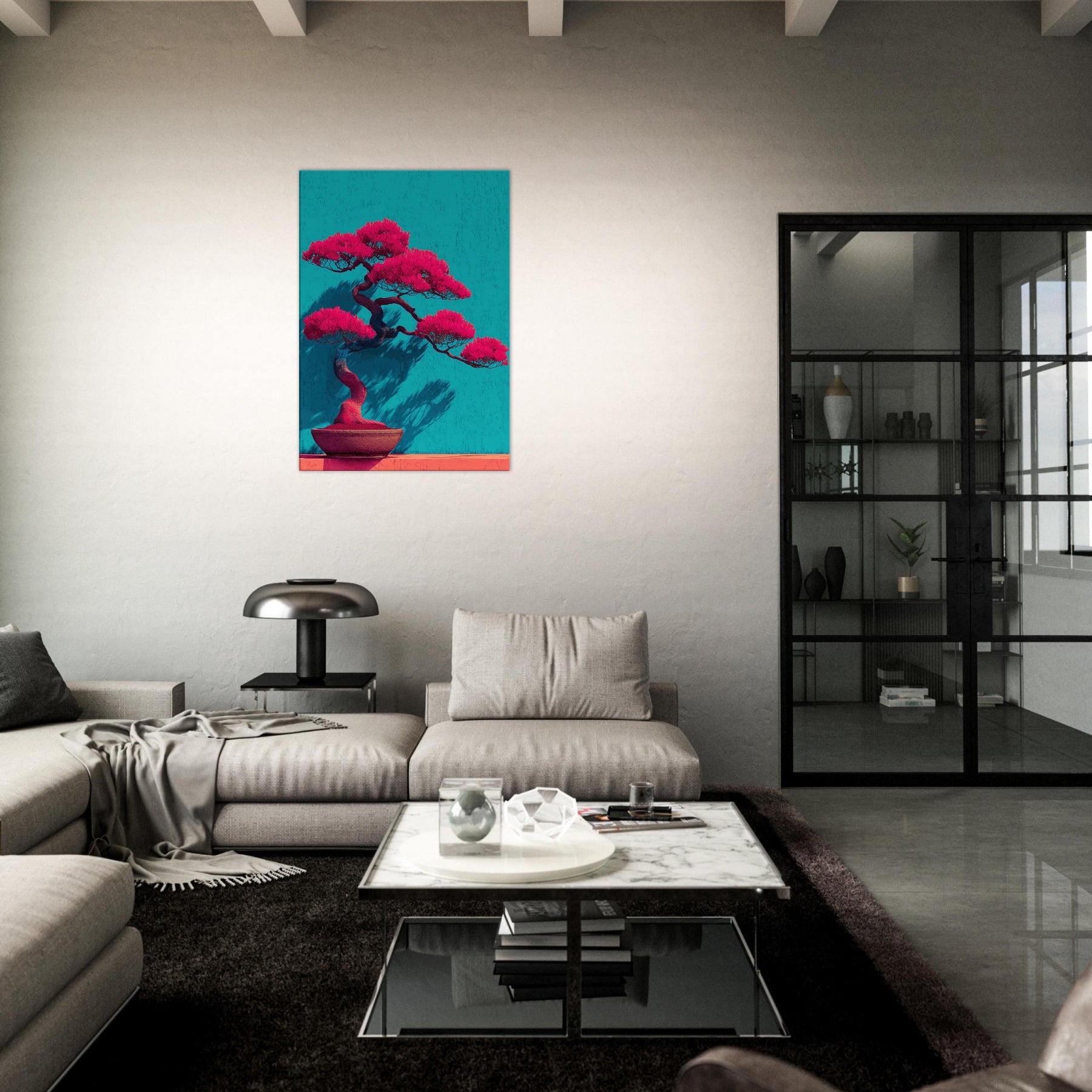 Bonsai Silhouette ascends from a simple pot into a wind carved crown of pink, set against a bold turquoise field. This composition moves with a quiet bravery a restrained, sculptural line that catches light and casts long, painterly shadows across the wall. It invites meditative calm into any living space, turning a sofa or desk into a stage for reflection and gentle energy. The piece pairs modern furnishings with a nod to nature, memory, and the art of presence.
