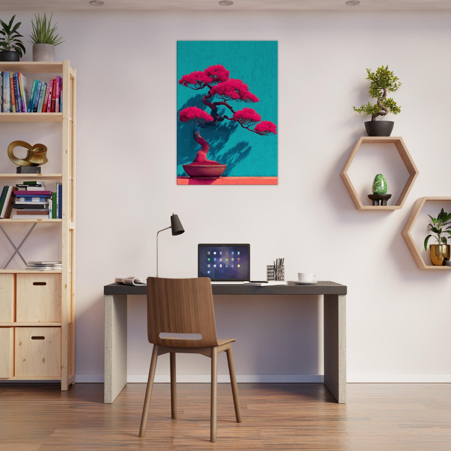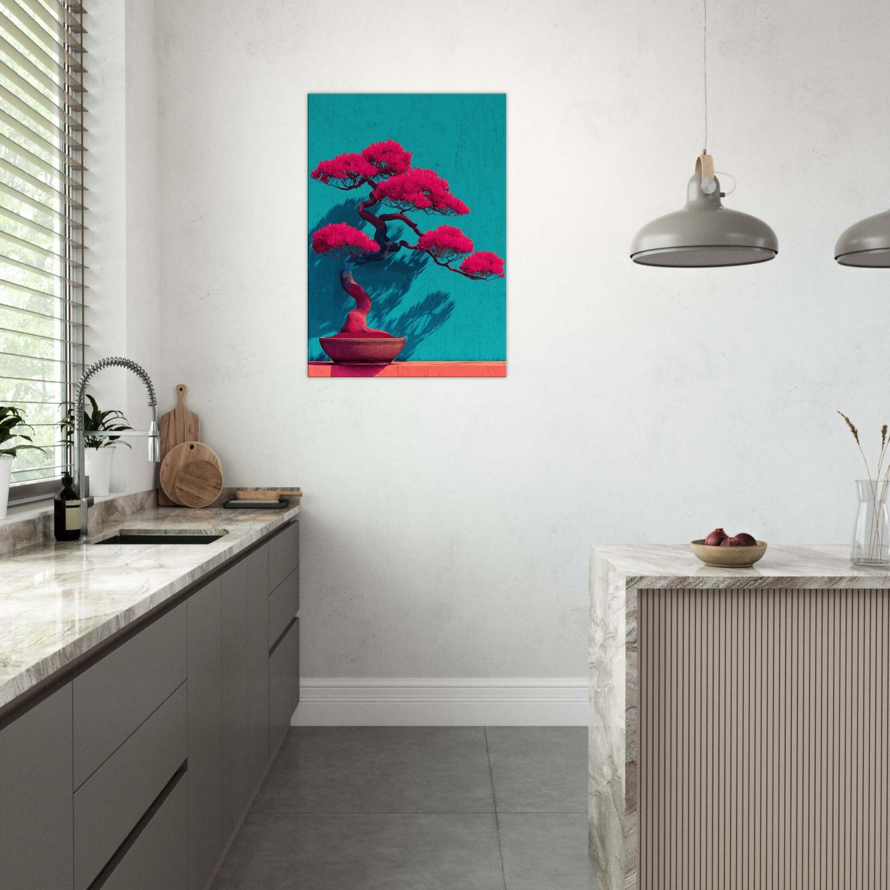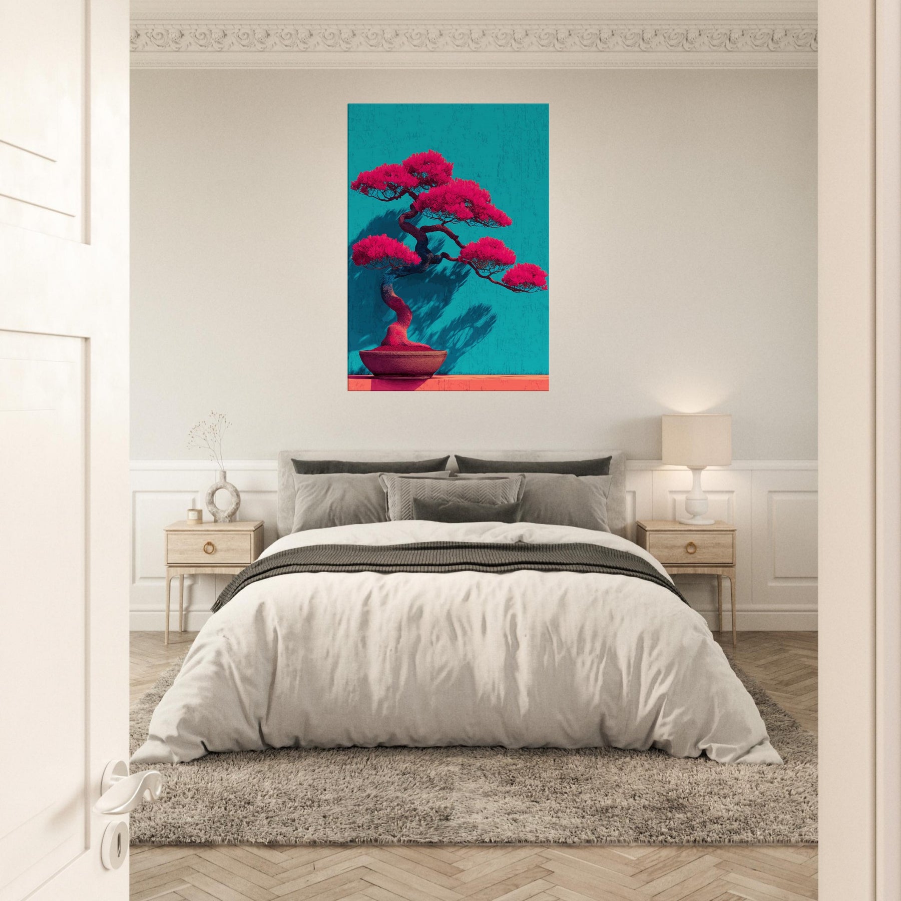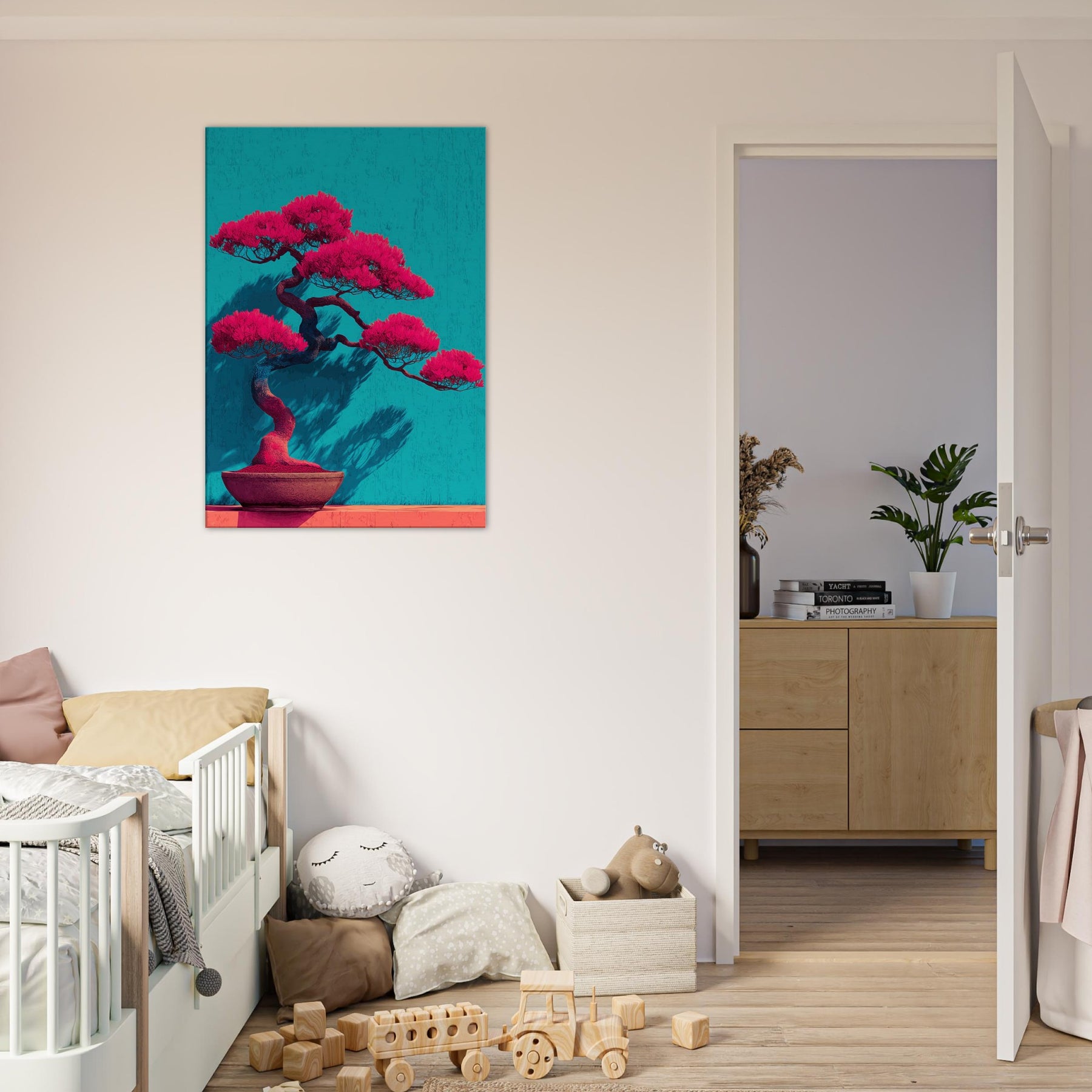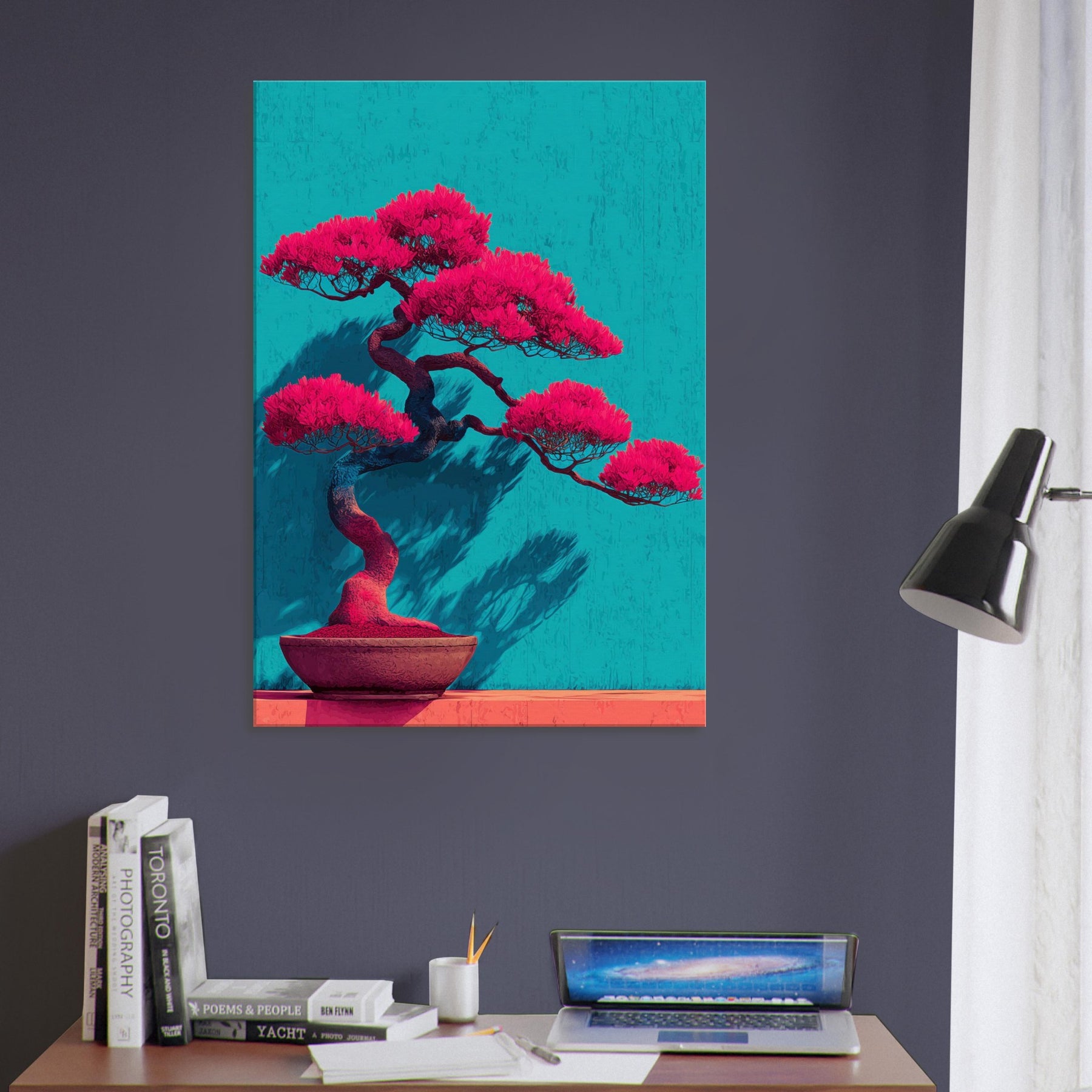 Bonsai Silhouette ascends from a simple pot into a wind carved crown of pink, set against a bold turquoise field. This composition moves with a quiet bravery a restrained, sculptural line that catches light and casts long, painterly shadows across the wall. It invites meditative calm into any living space, turning a sofa or desk into a stage for reflection and gentle energy. The piece pairs modern furnishings with a nod to nature, memory, and the art of presence.