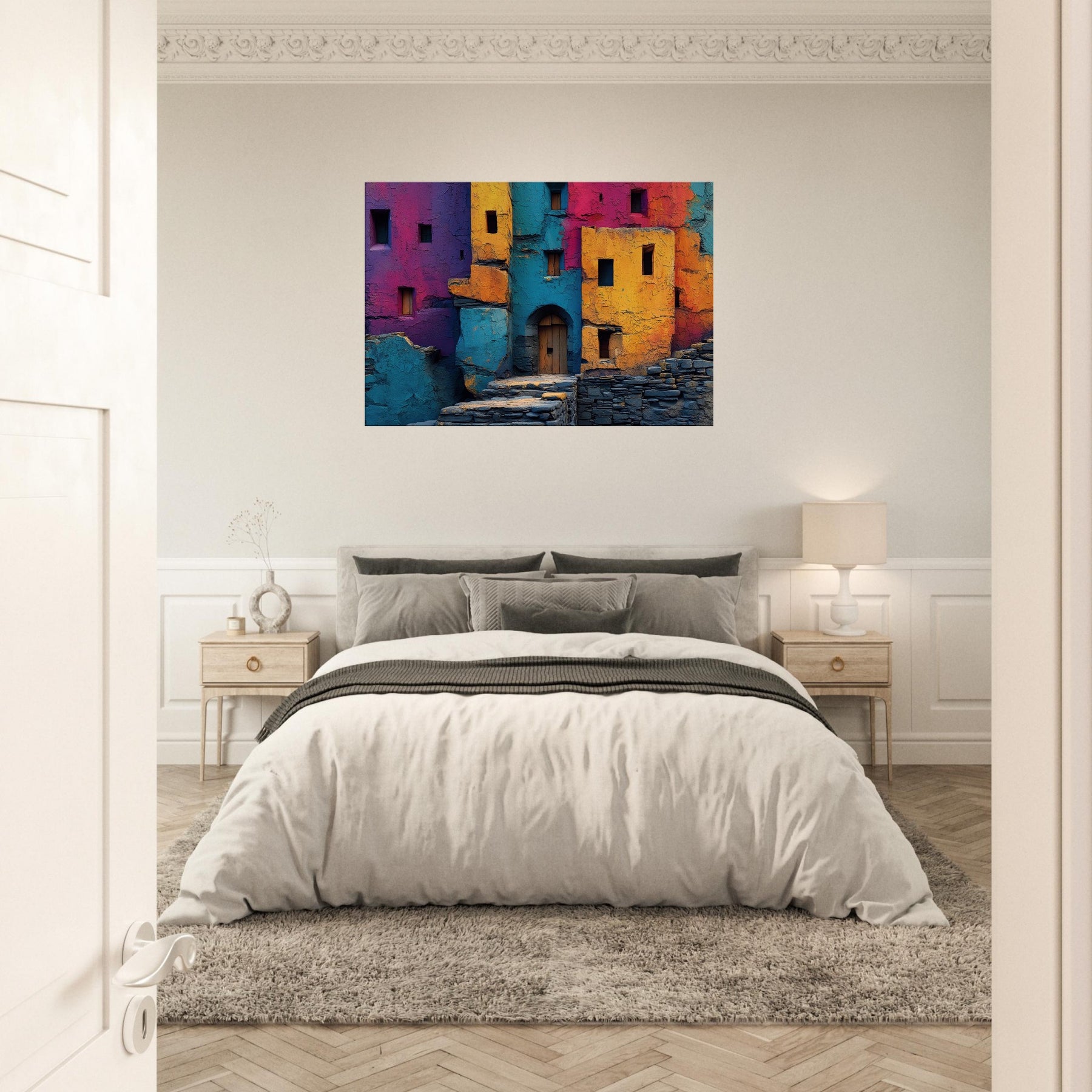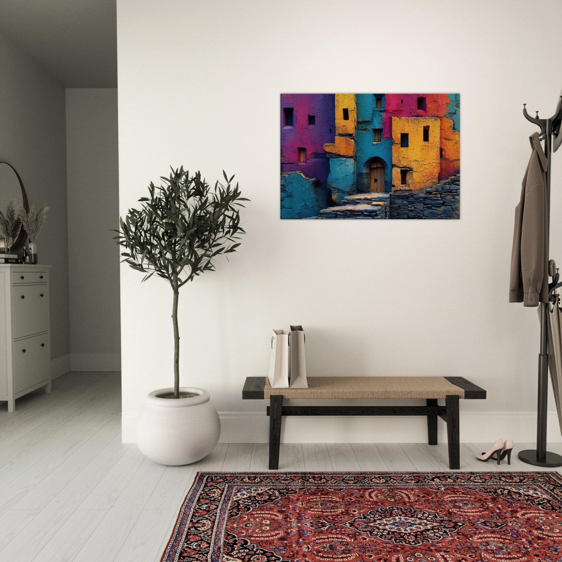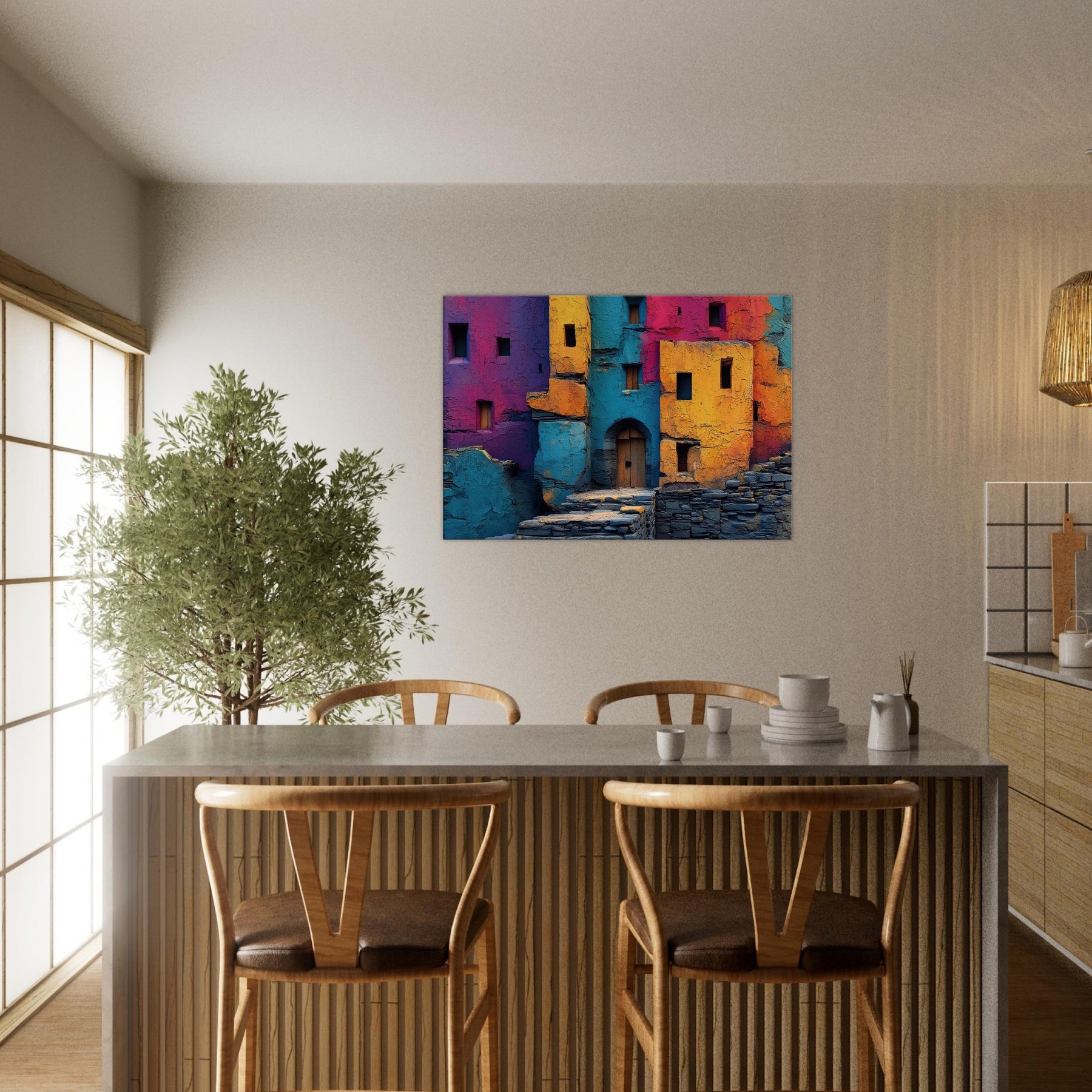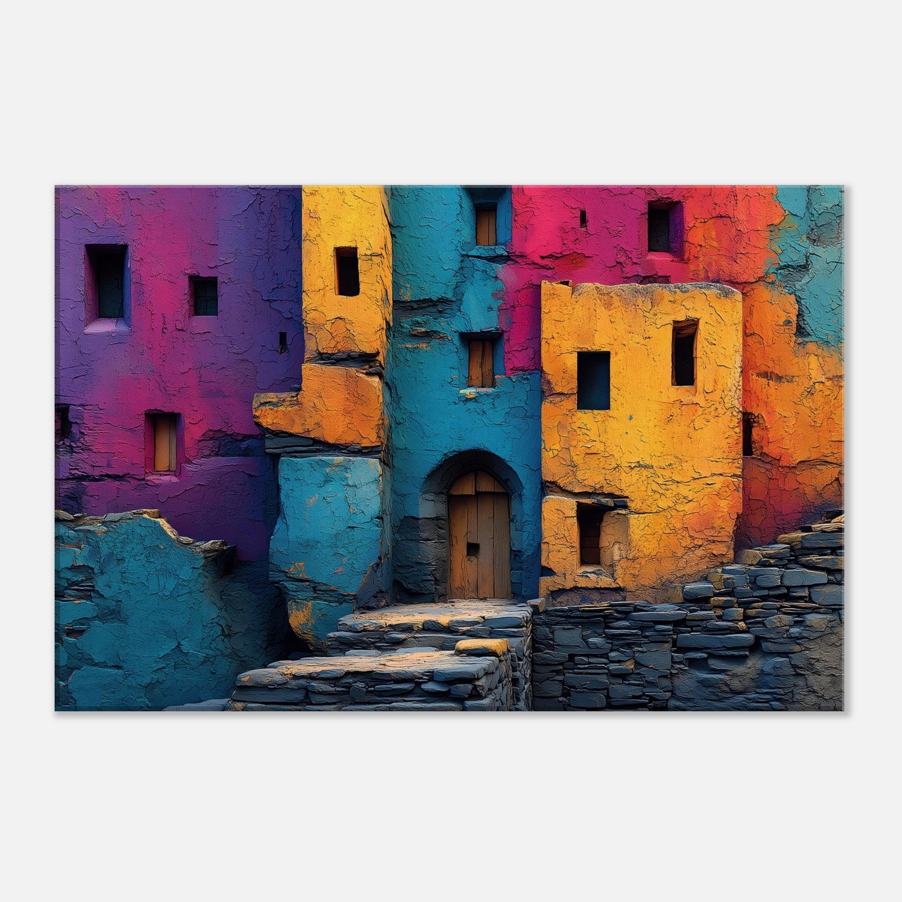 This painting invites you into a sun washed hillside where a Medieval Castle rises in bold color and textured memory. Abstract shapes swirl around weathered doors, evoking mystery and quiet grandeur. Ochre, teal, and violet mingle like a living , while stone steps lead your gaze upward to imagined battlements. It adds drama and warmth to a living space, turning walls into a narrative of discovery a striking focal point that invites conversation, reflection, and a sense of timeless adventure.