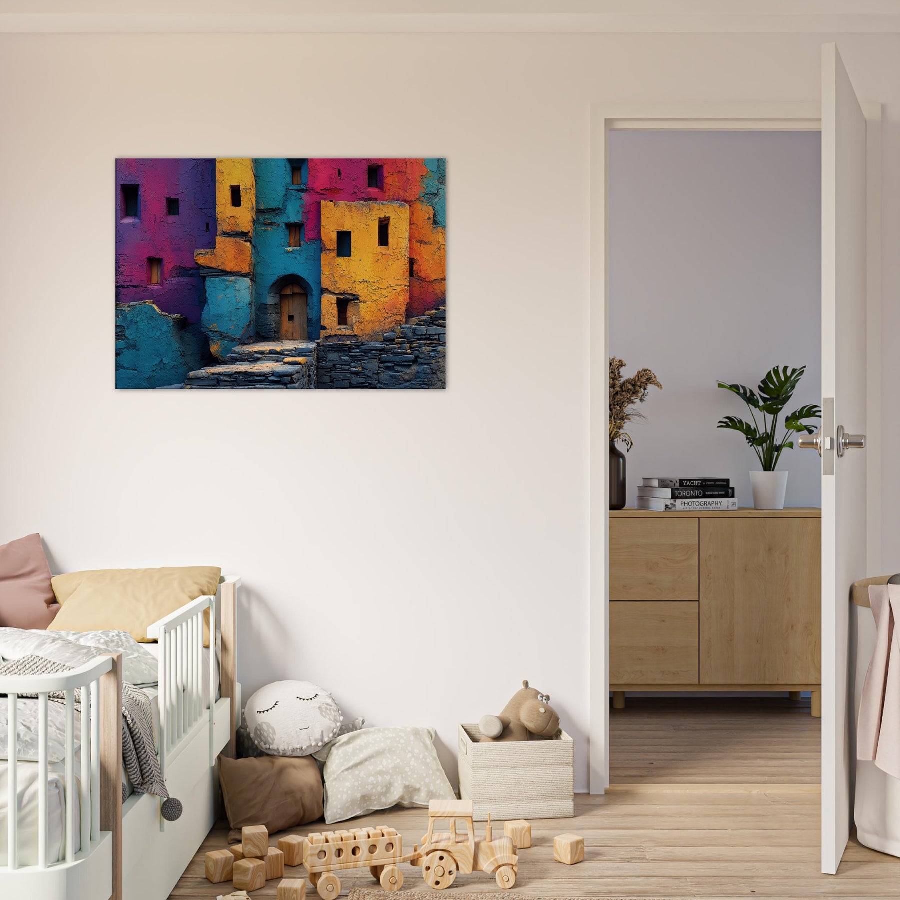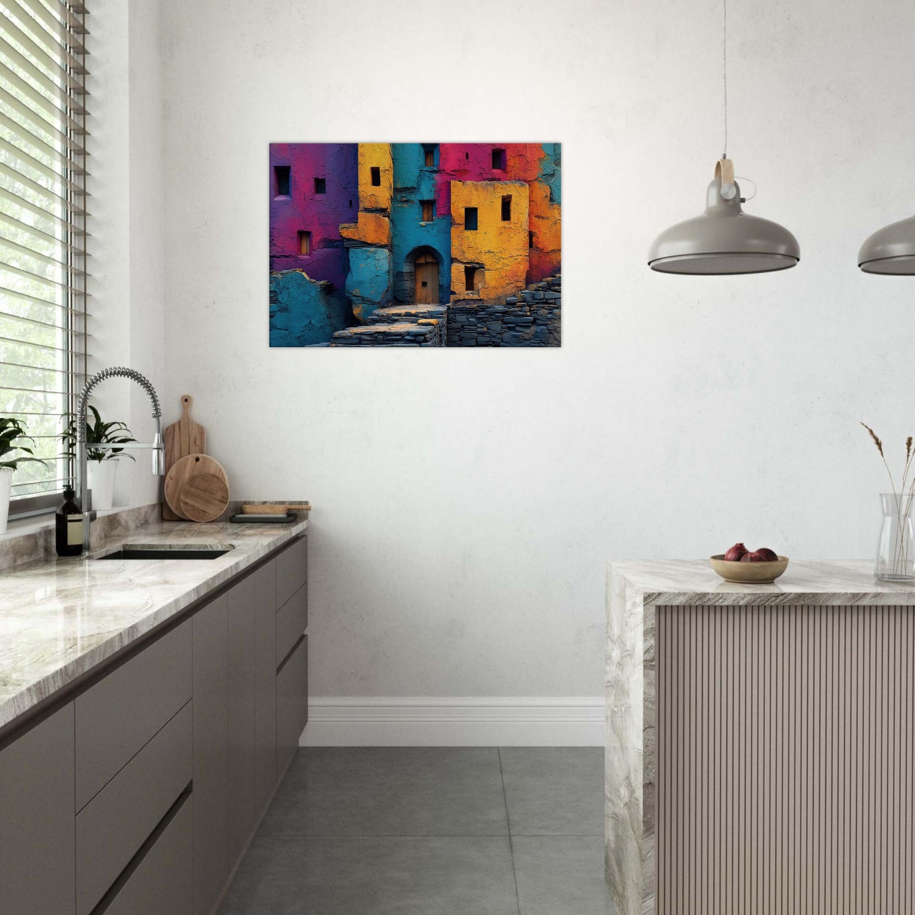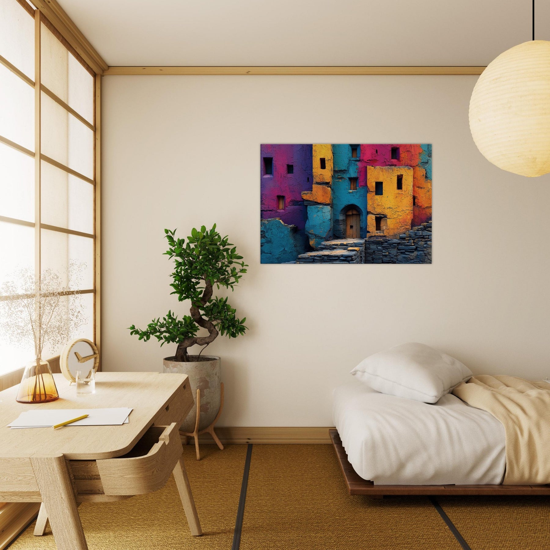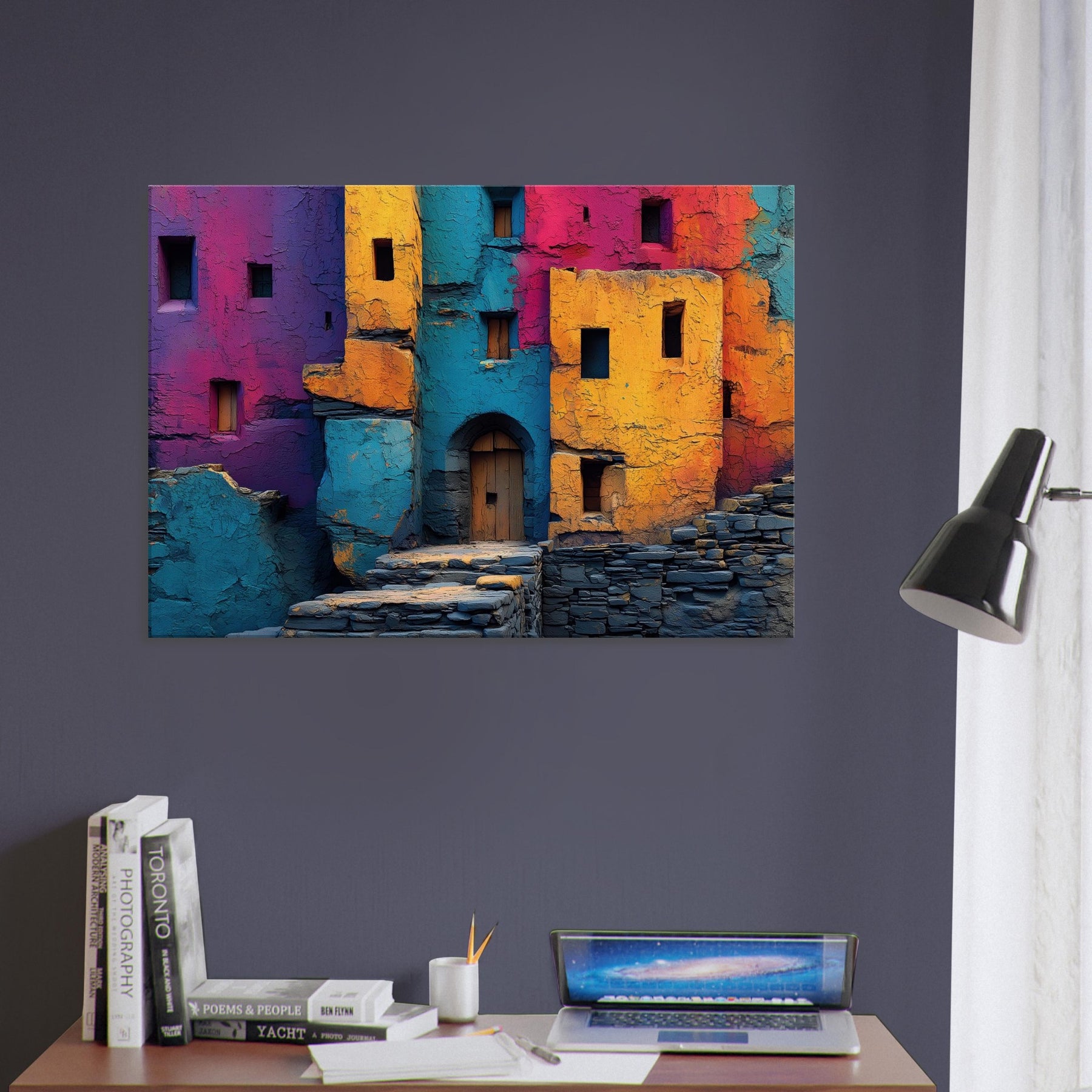This painting invites you into a sun washed hillside where a Medieval Castle rises in bold color and textured memory. Abstract shapes swirl around weathered doors, evoking mystery and quiet grandeur. Ochre, teal, and violet mingle like a living , while stone steps lead your gaze upward to imagined battlements. It adds drama and warmth to a living space, turning walls into a narrative of discovery a striking focal point that invites conversation, reflection, and a sense of timeless adventure.