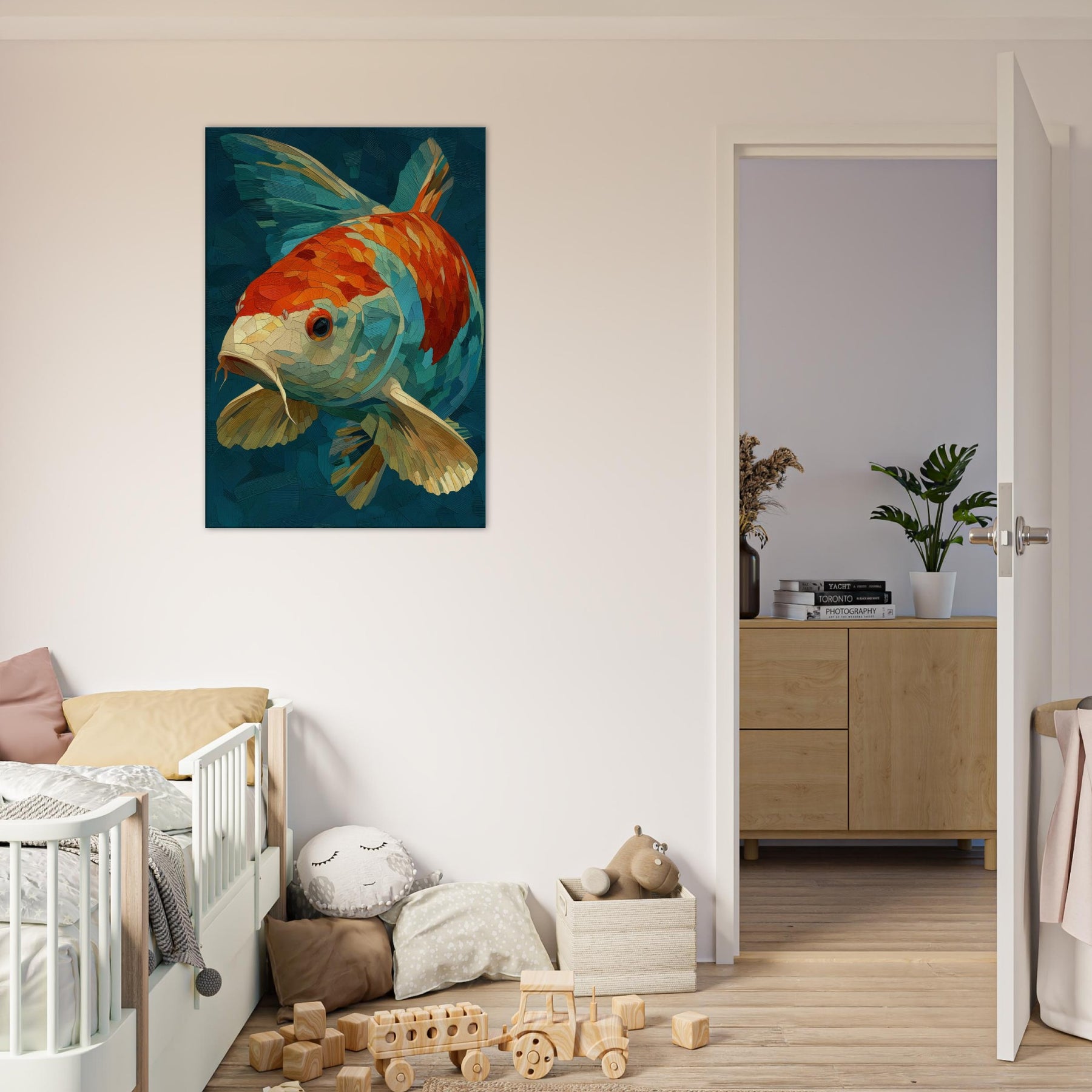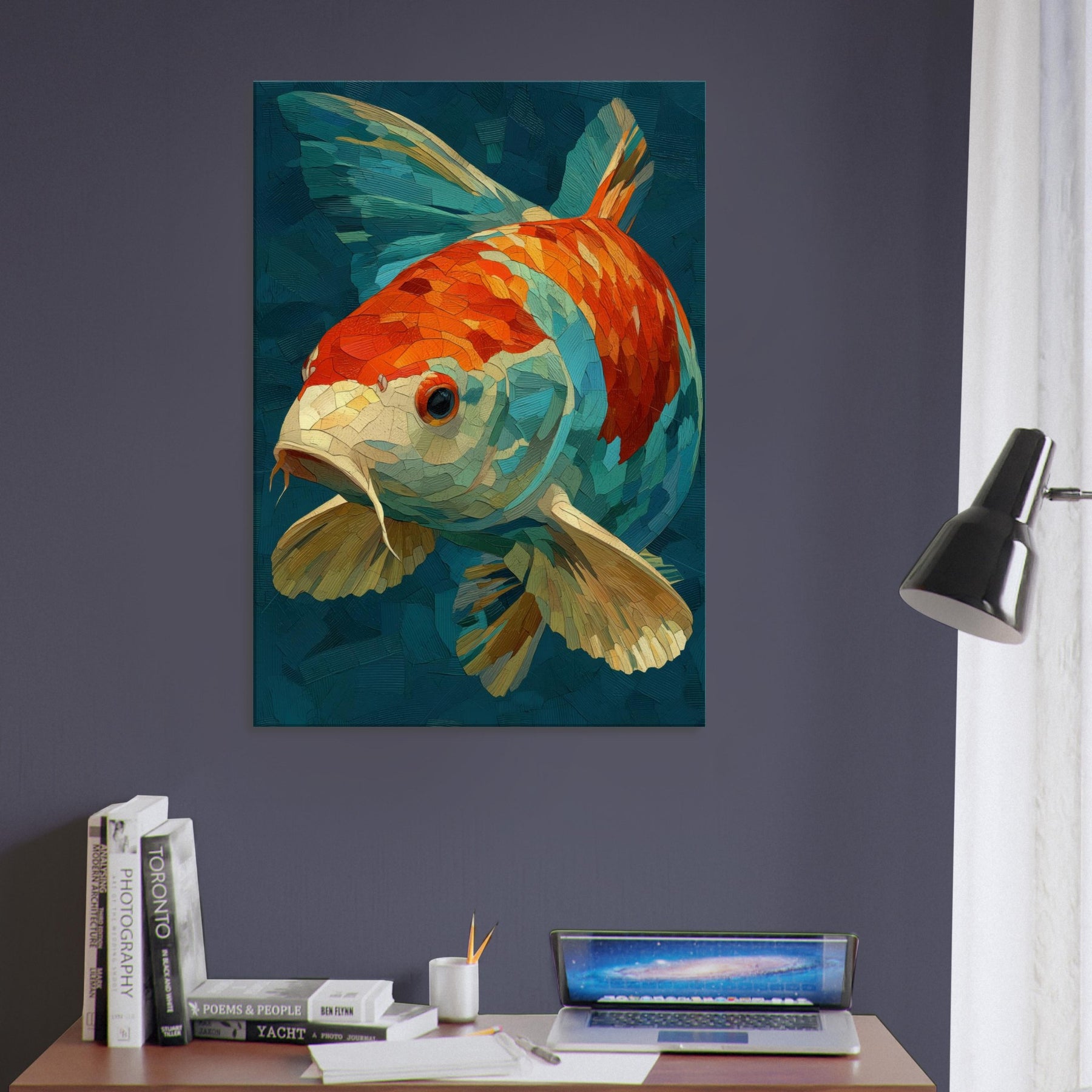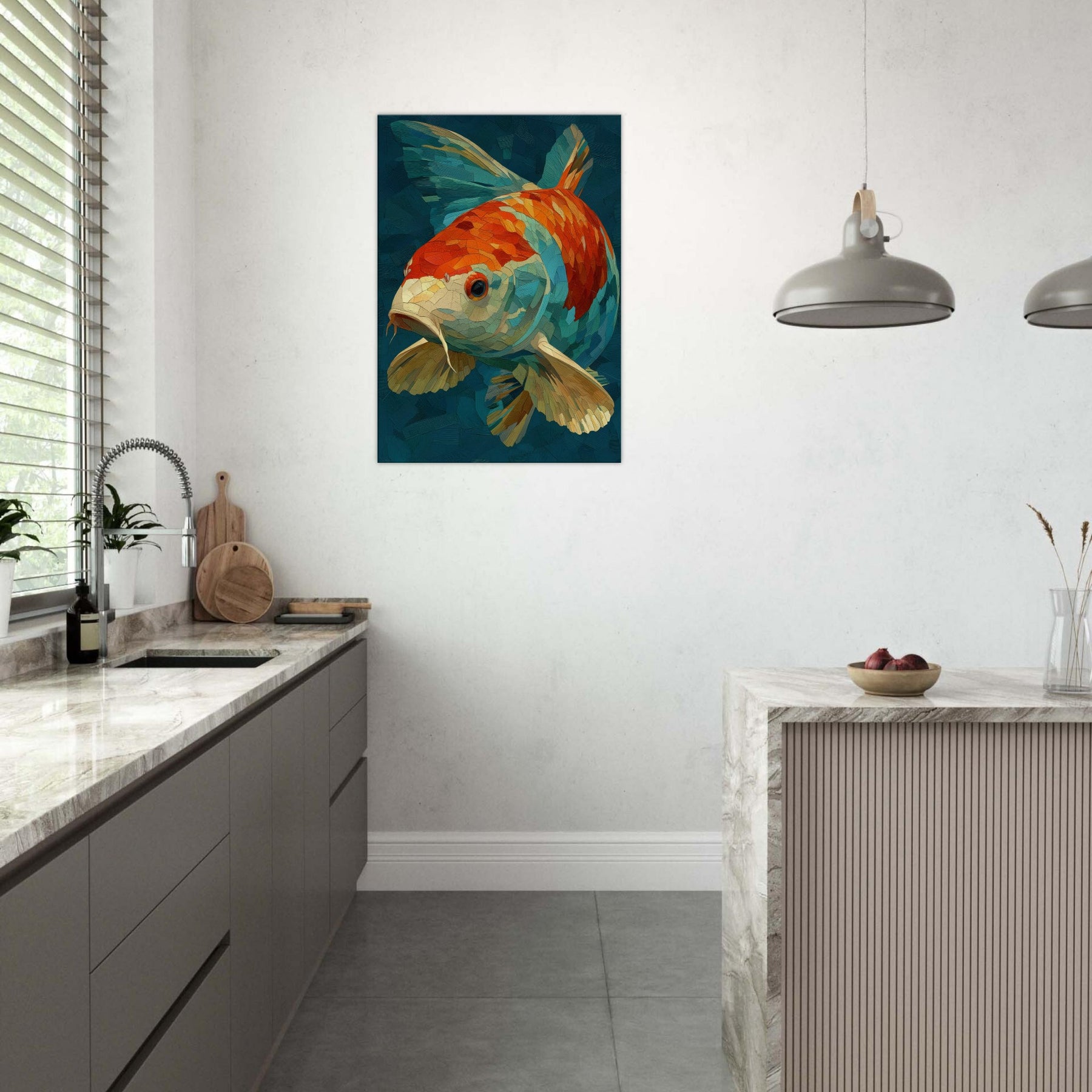 Let this luminous Koi Fish move through your space, a kinetic mosaic of copper, turquoise, and sunlit ivory. The piece channels water and light, turning a calm room into a sanctuary where color breathes and walls seem to glow. Its scales ripple in warm oranges against cool blues, inviting the eye to travel along every contour. Ideal for a living room or hallway, it adds a moment of quiet drama and a lasting sense of energy and refined balance.