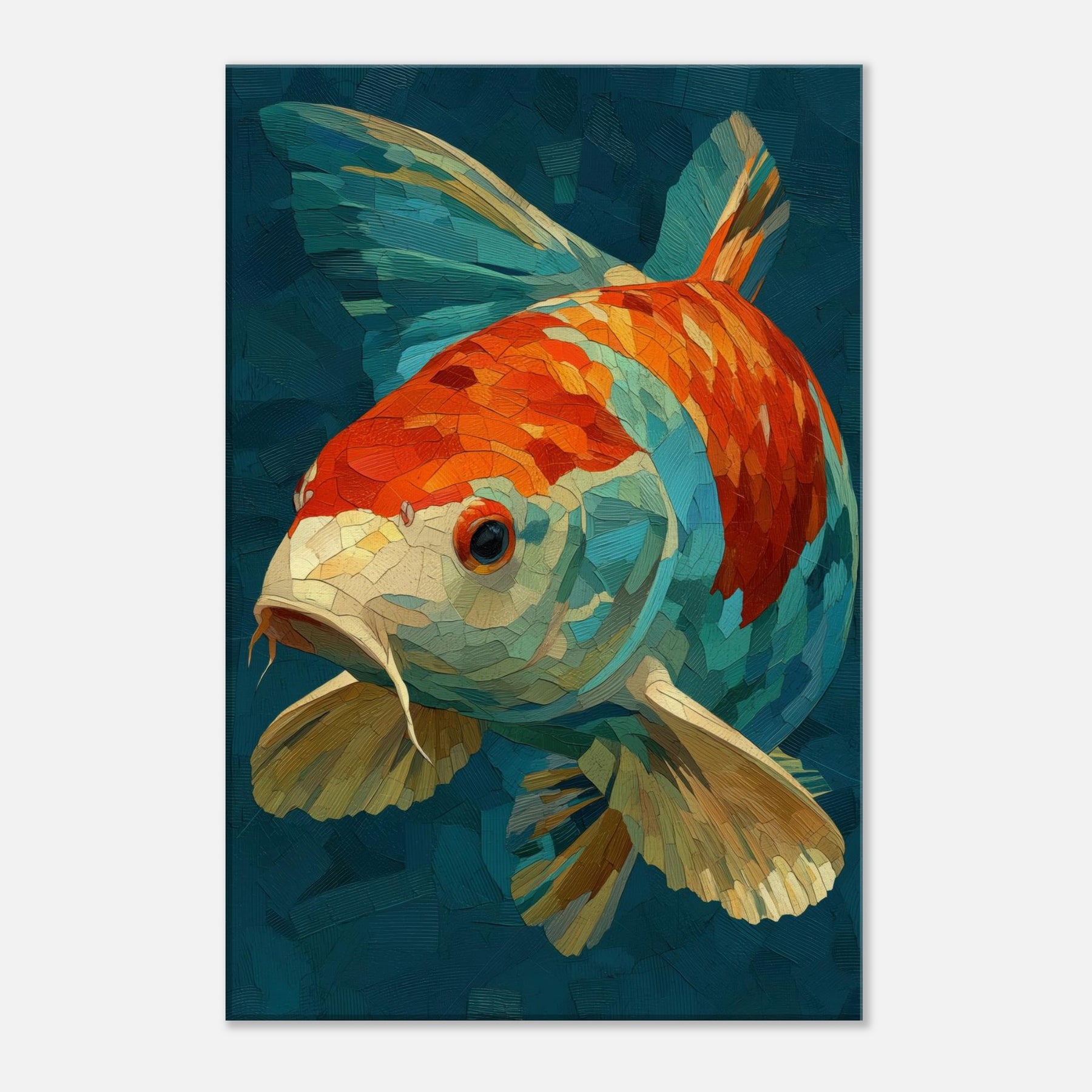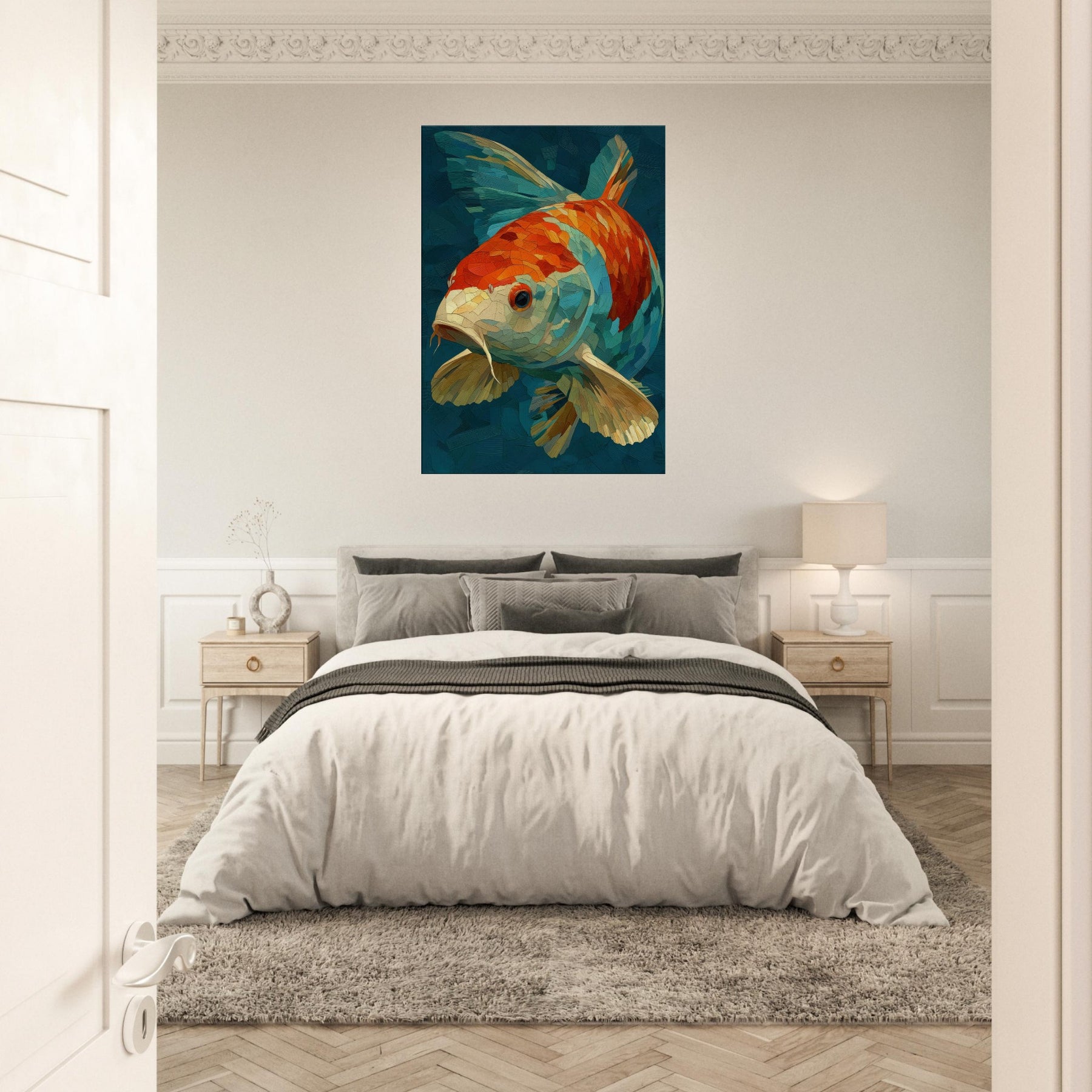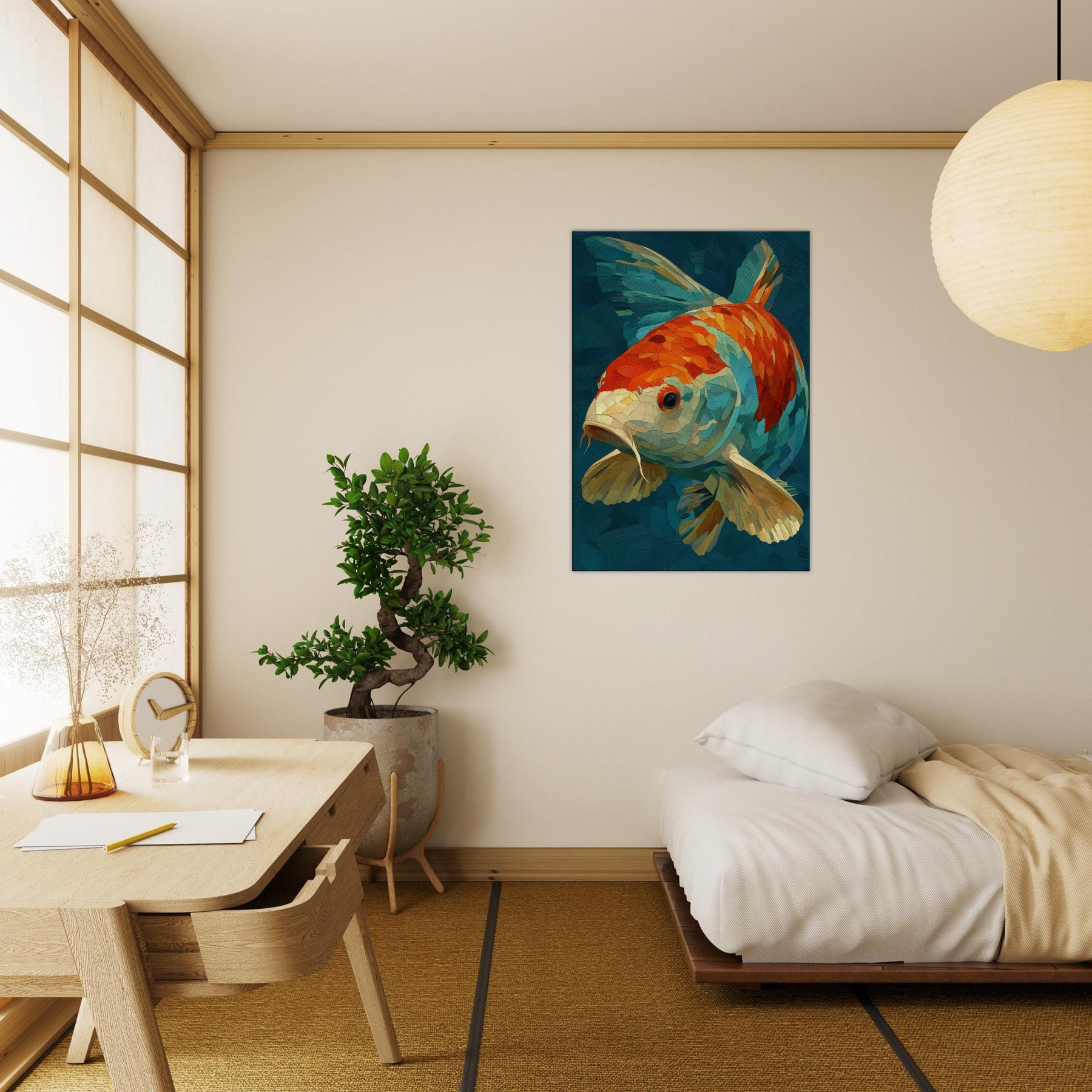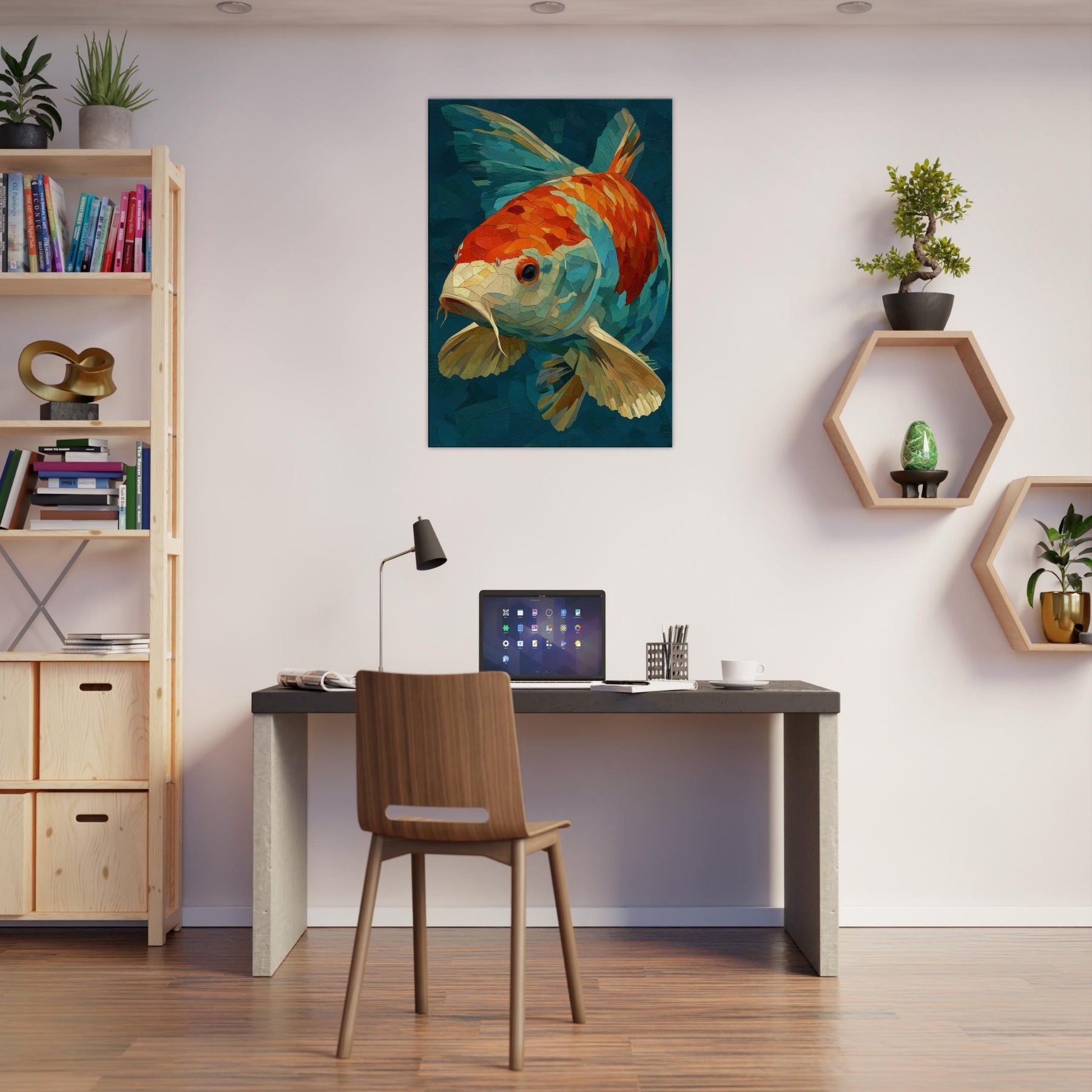 Let this luminous Koi Fish move through your space, a kinetic mosaic of copper, turquoise, and sunlit ivory. The piece channels water and light, turning a calm room into a sanctuary where color breathes and walls seem to glow. Its scales ripple in warm oranges against cool blues, inviting the eye to travel along every contour. Ideal for a living room or hallway, it adds a moment of quiet drama and a lasting sense of energy and refined balance.
