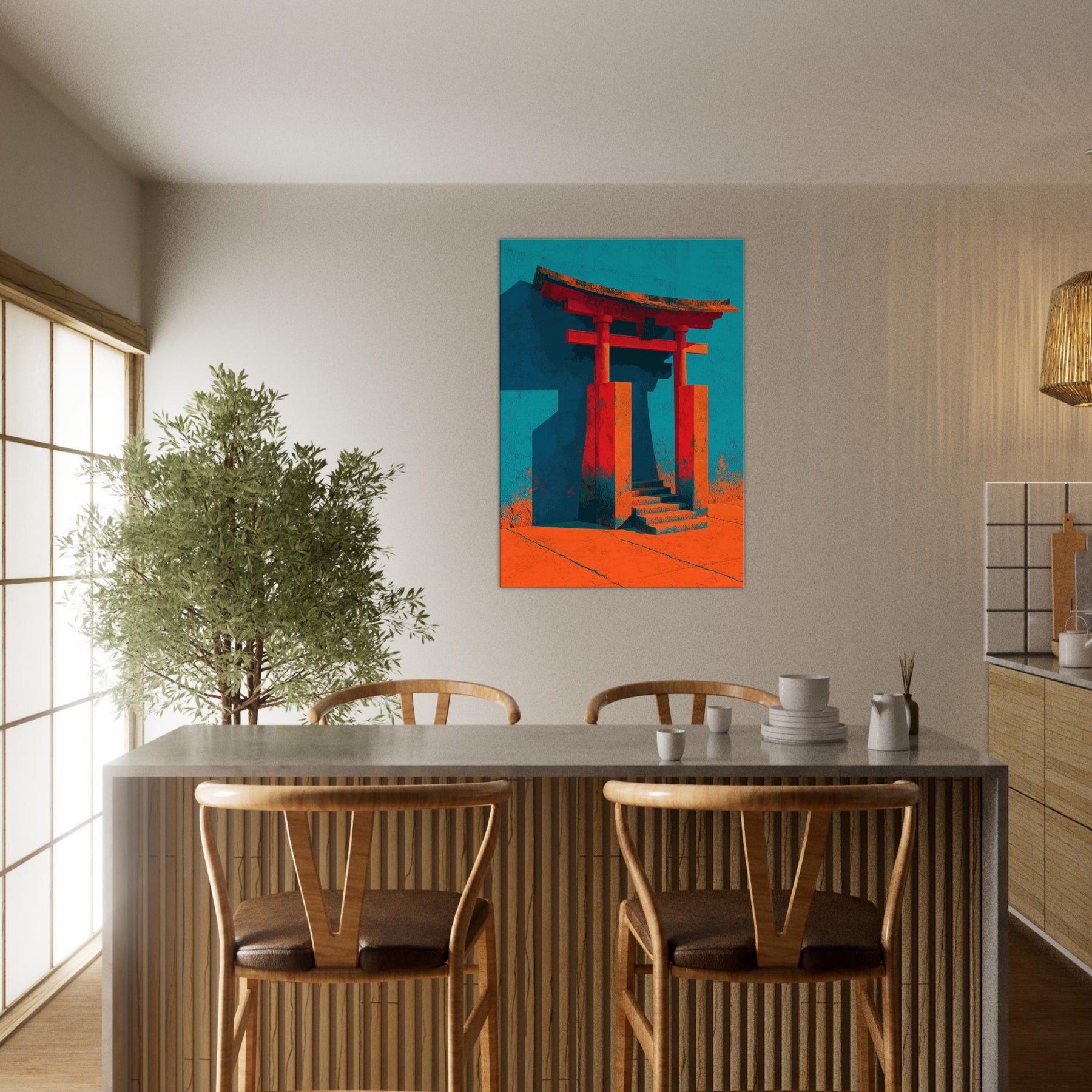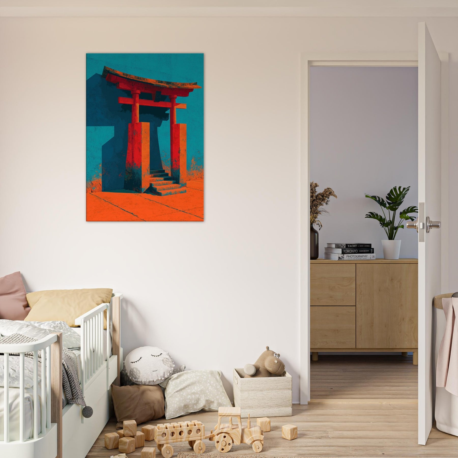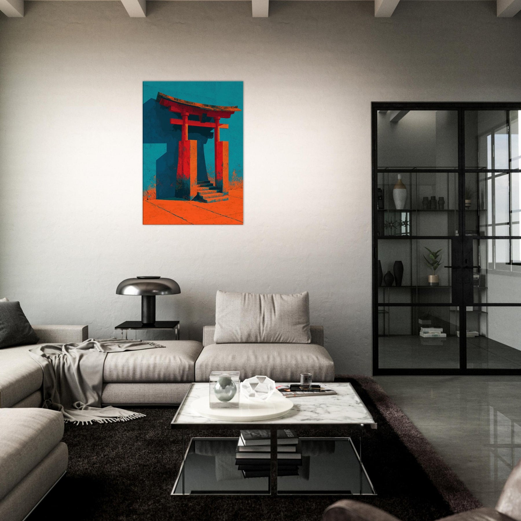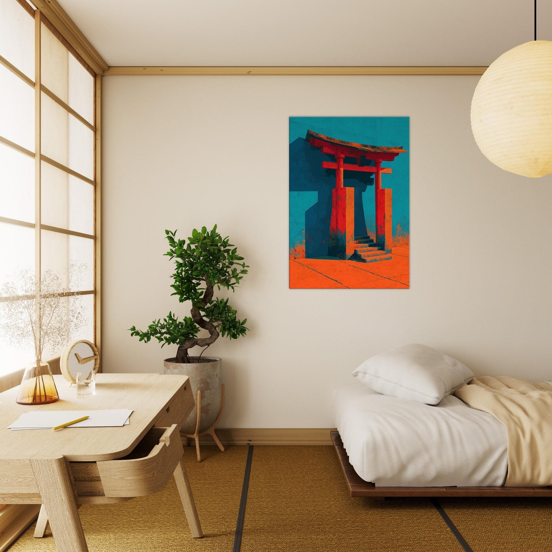 Torii Gate rises in bold, sun washed color, transformed into a luminous apparition that hovers between city and shrine. This abstract interpretation captures the ritual stillness of a gate amid urban light, where warm reds meet a cool teal backdrop. The piece exudes a sensorial calm like a morning breeze along a quiet street and invites a living space to breathe, reflect, and expand. Displaying the Torii Gate as sculpture of memory, it anchors your room with drama, texture, and contemplative color.