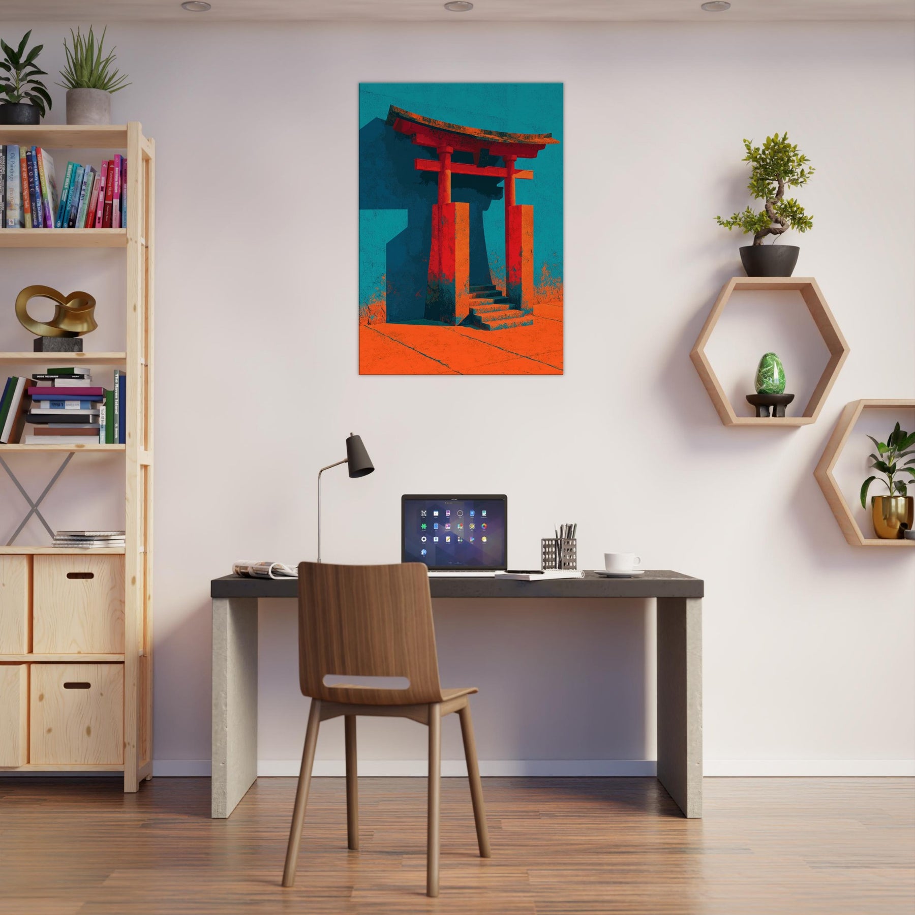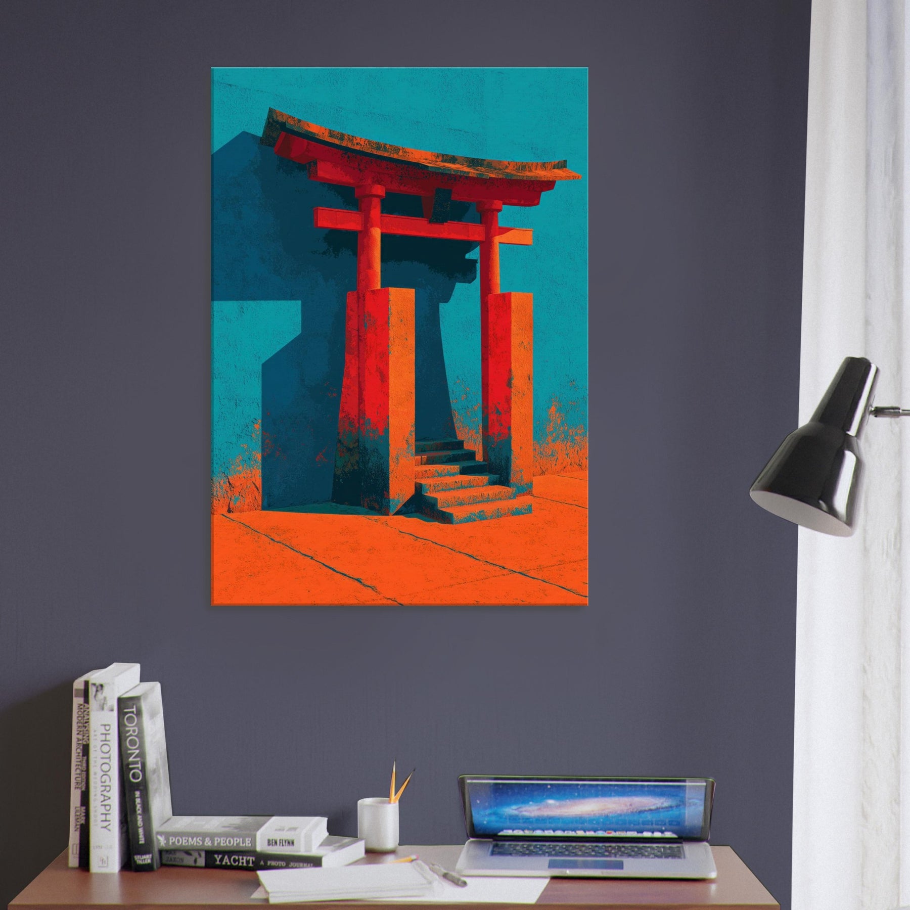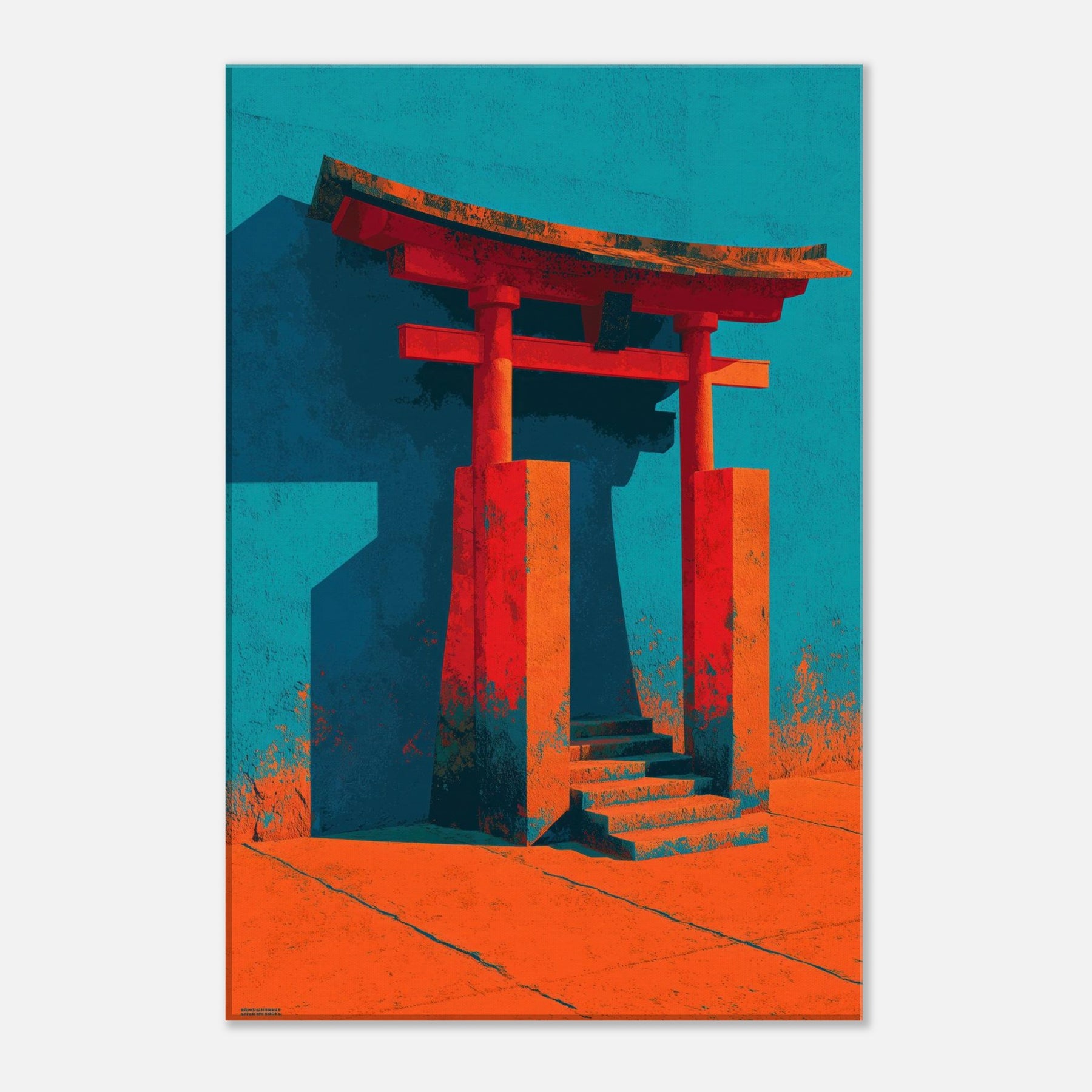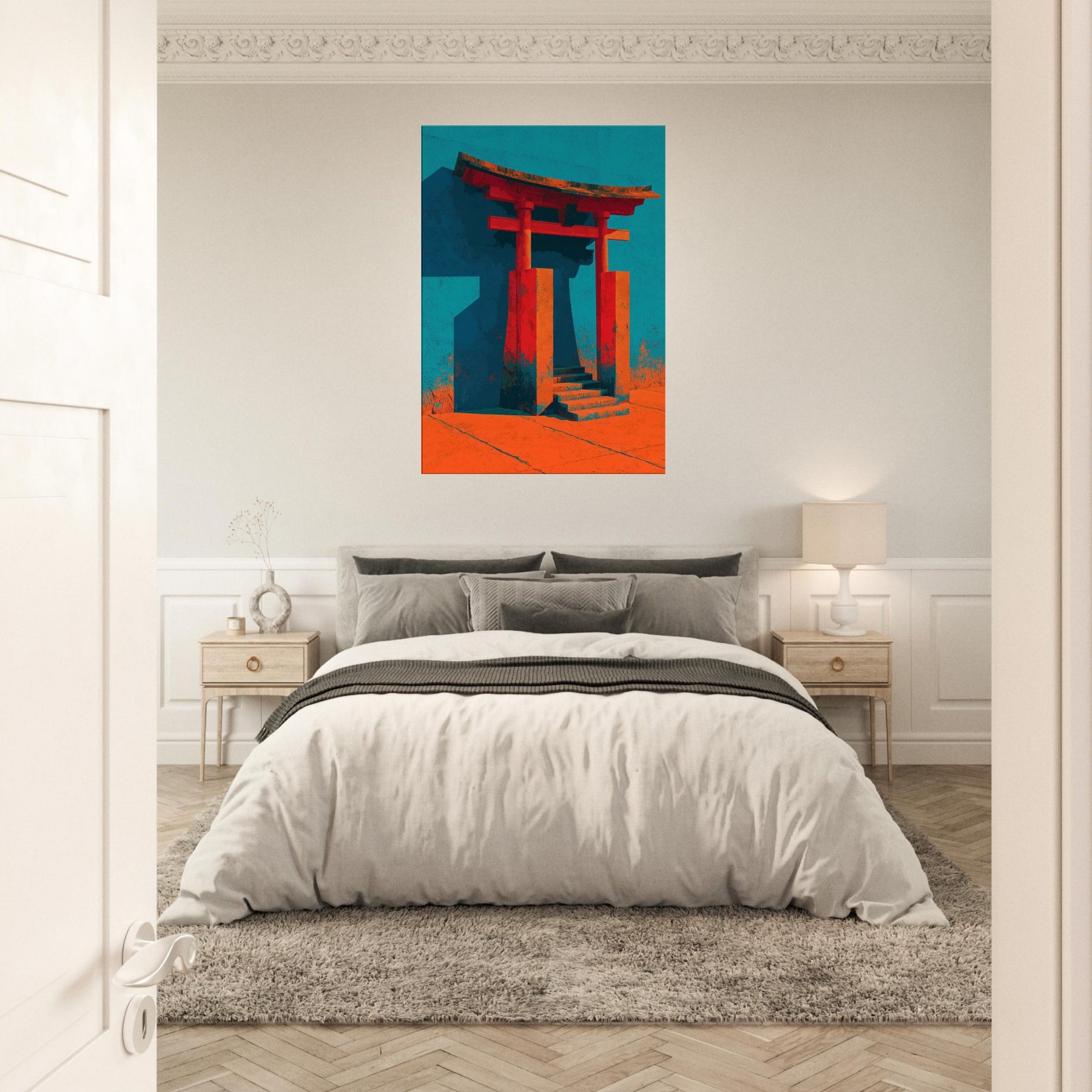 Torii Gate rises in bold, sun washed color, transformed into a luminous apparition that hovers between city and shrine. This abstract interpretation captures the ritual stillness of a gate amid urban light, where warm reds meet a cool teal backdrop. The piece exudes a sensorial calm like a morning breeze along a quiet street and invites a living space to breathe, reflect, and expand. Displaying the Torii Gate as sculpture of memory, it anchors your room with drama, texture, and contemplative color.