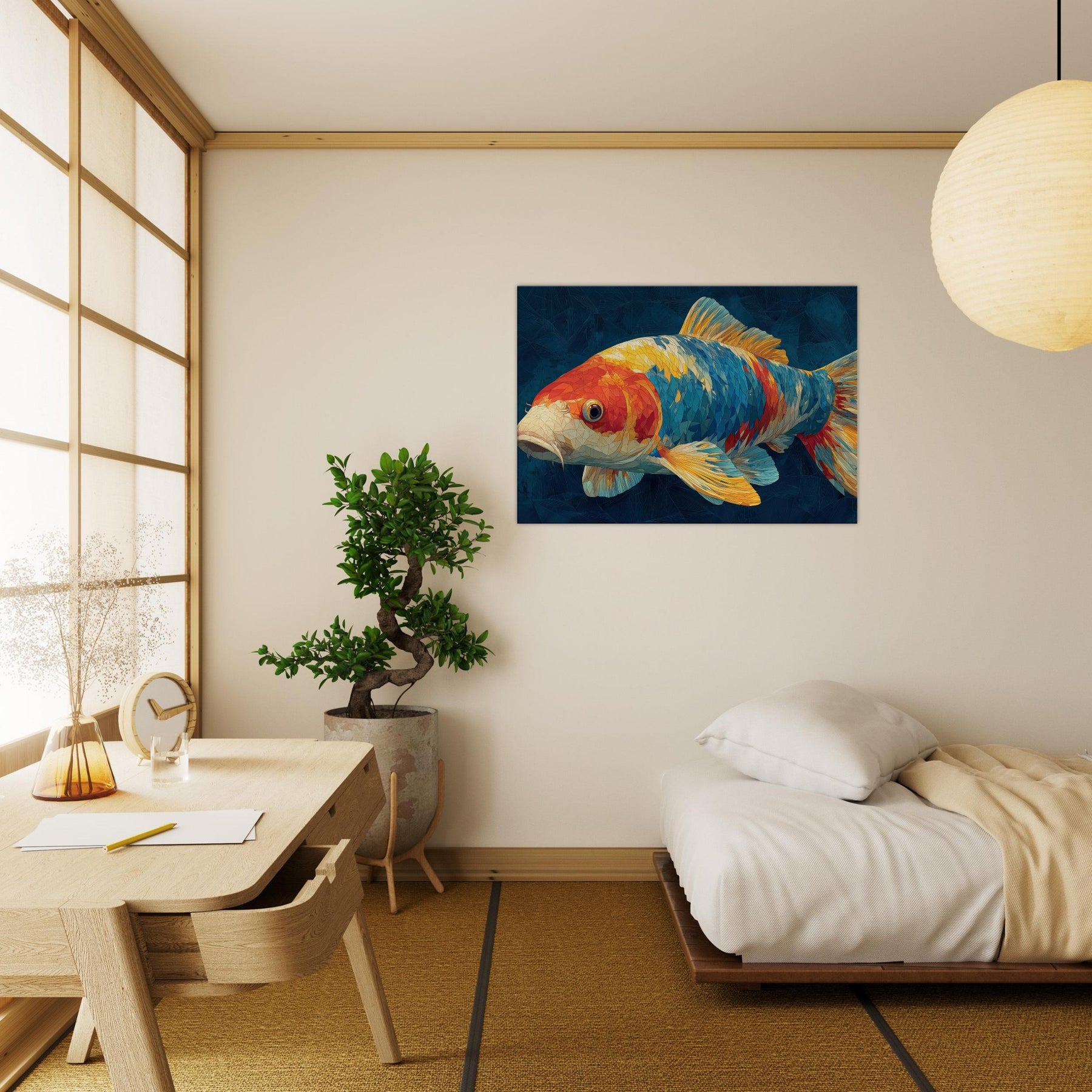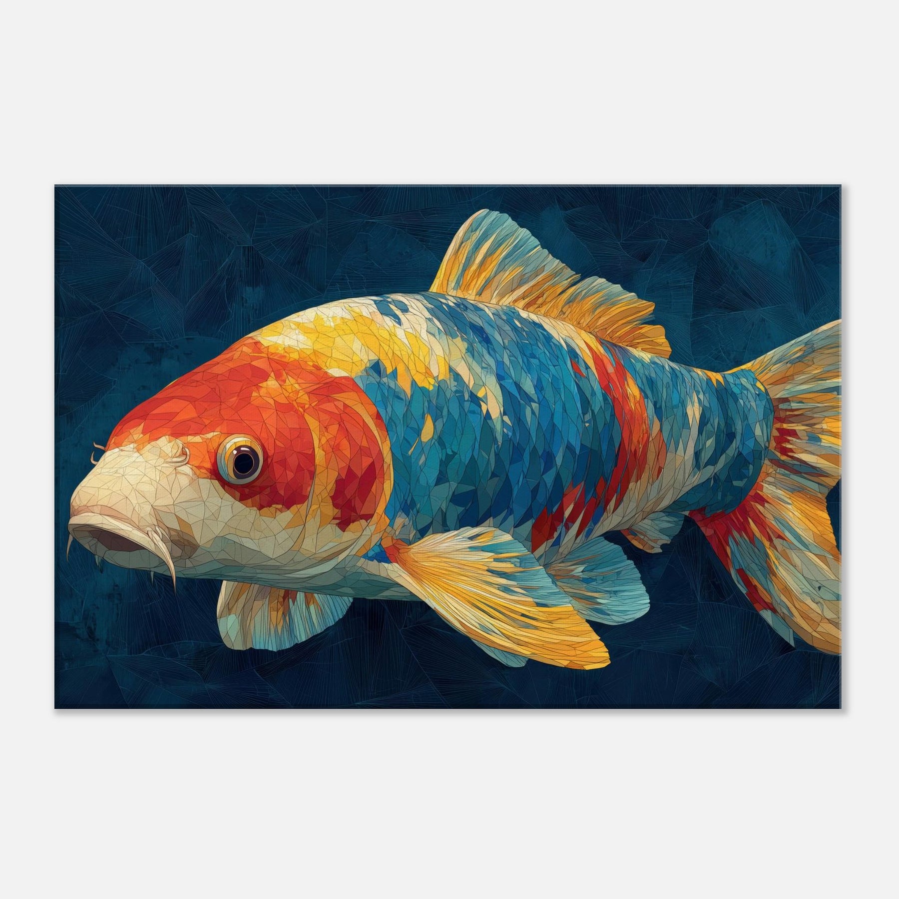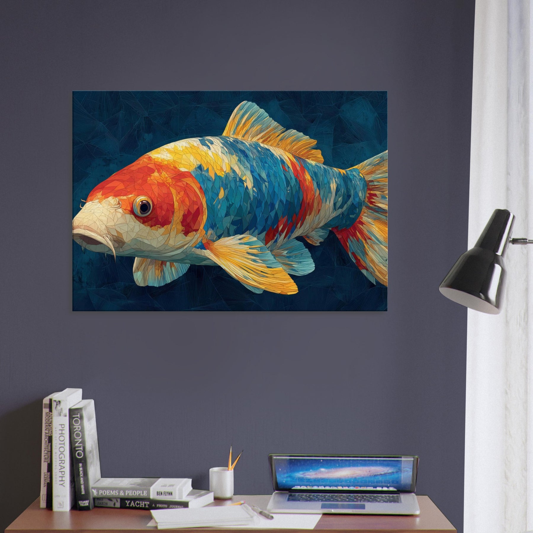 An electric current of color flows through this abstract study, where the Koi Fish becomes a living mosaic of light and motion. Each polygonal shard catches and refracts the room's glow, blending orange, gold, and cobalt into a narrative of water and fire. The piece radiates warmth and movement, turning walls into a window of energy while inviting quiet reflection. Perfect above a sofa, in a hallway, or at the dining area, it elevates atmosphere, sparks conversation, and makes everyday moments feel cinematic.