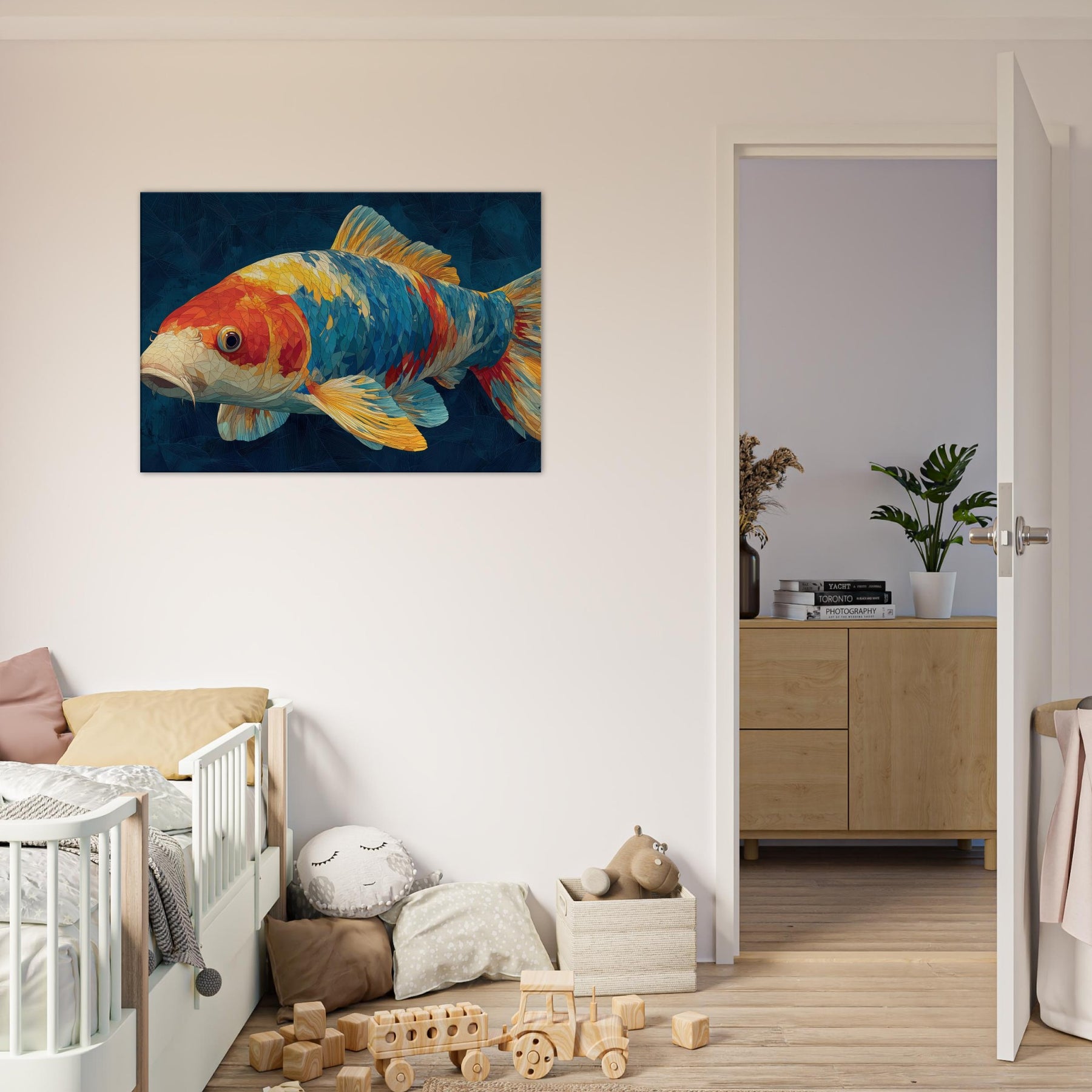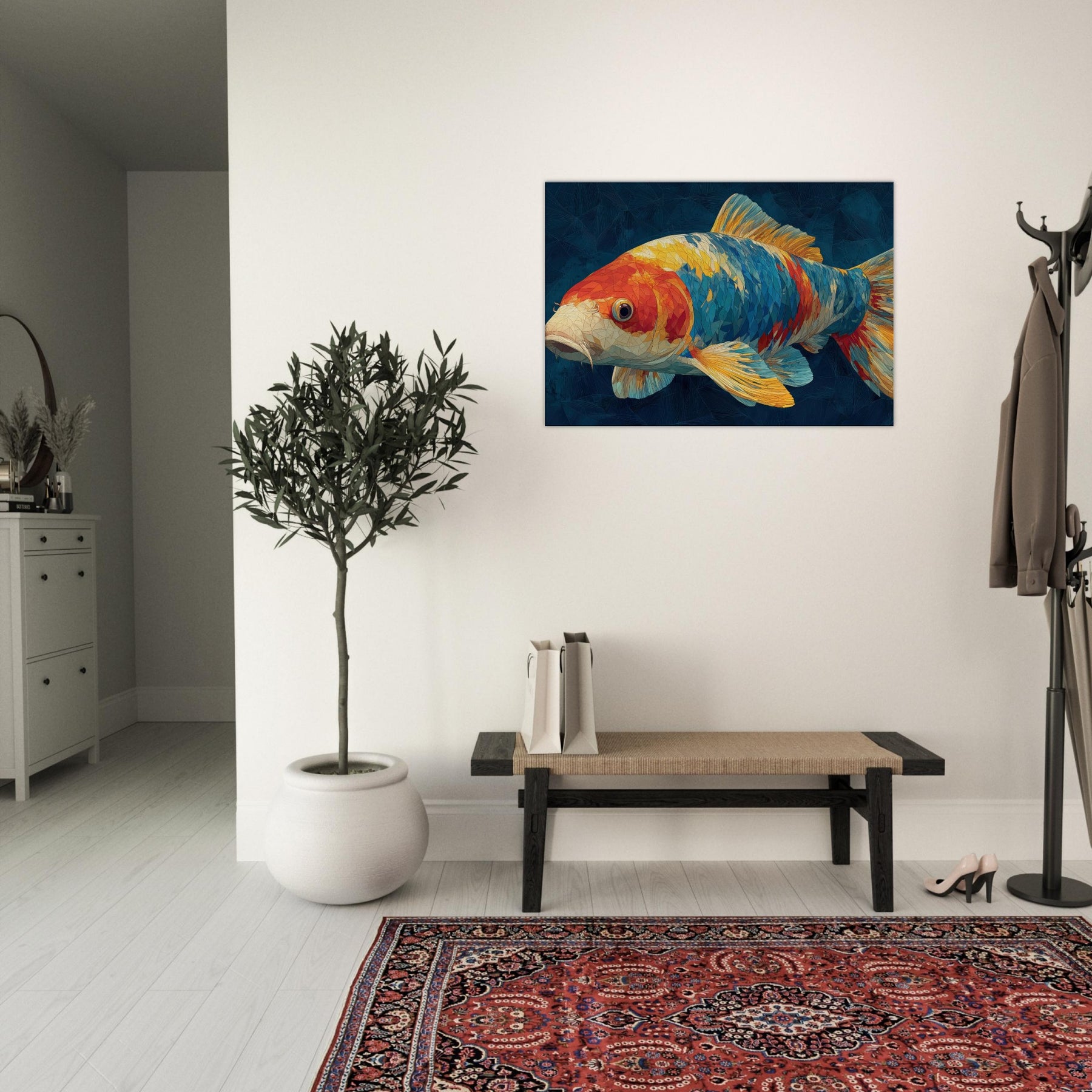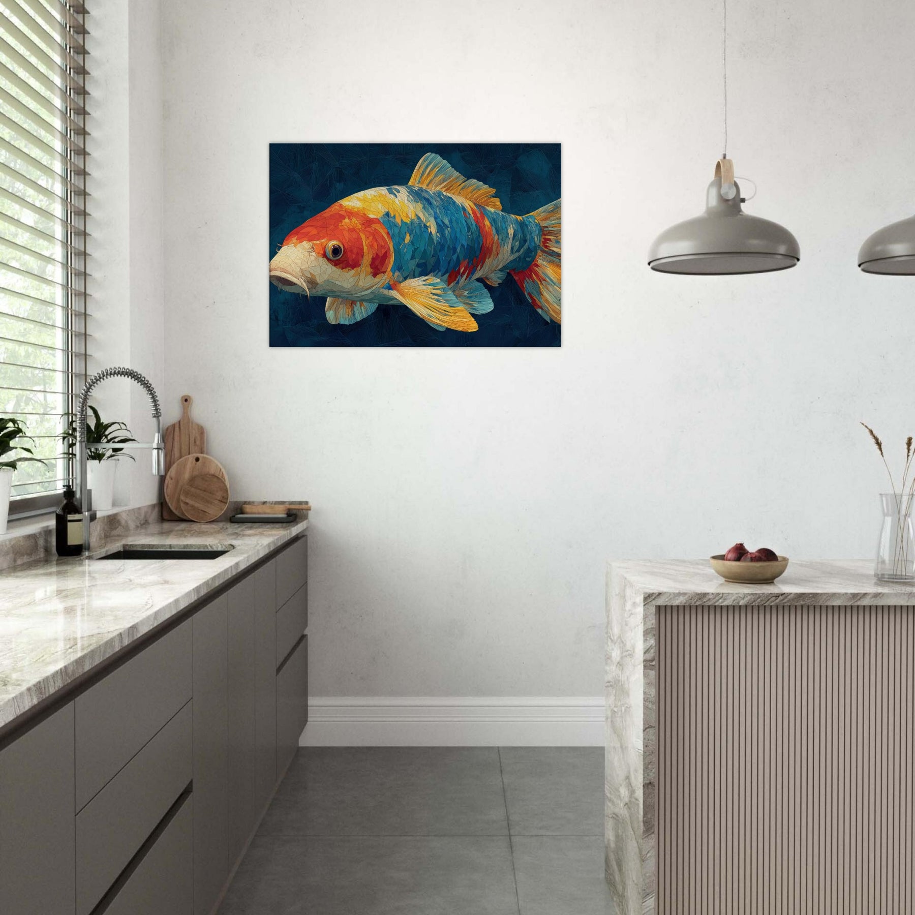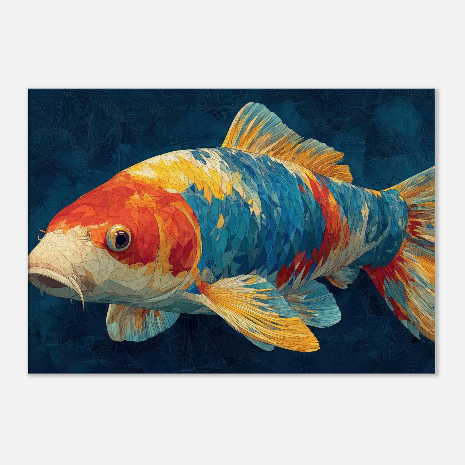 An electric current of color flows through this abstract study, where the Koi Fish becomes a living mosaic of light and motion. Each polygonal shard catches and refracts the room's glow, blending orange, gold, and cobalt into a narrative of water and fire. The piece radiates warmth and movement, turning walls into a window of energy while inviting quiet reflection. Perfect above a sofa, in a hallway, or at the dining area, it elevates atmosphere, sparks conversation, and makes everyday moments feel cinematic.