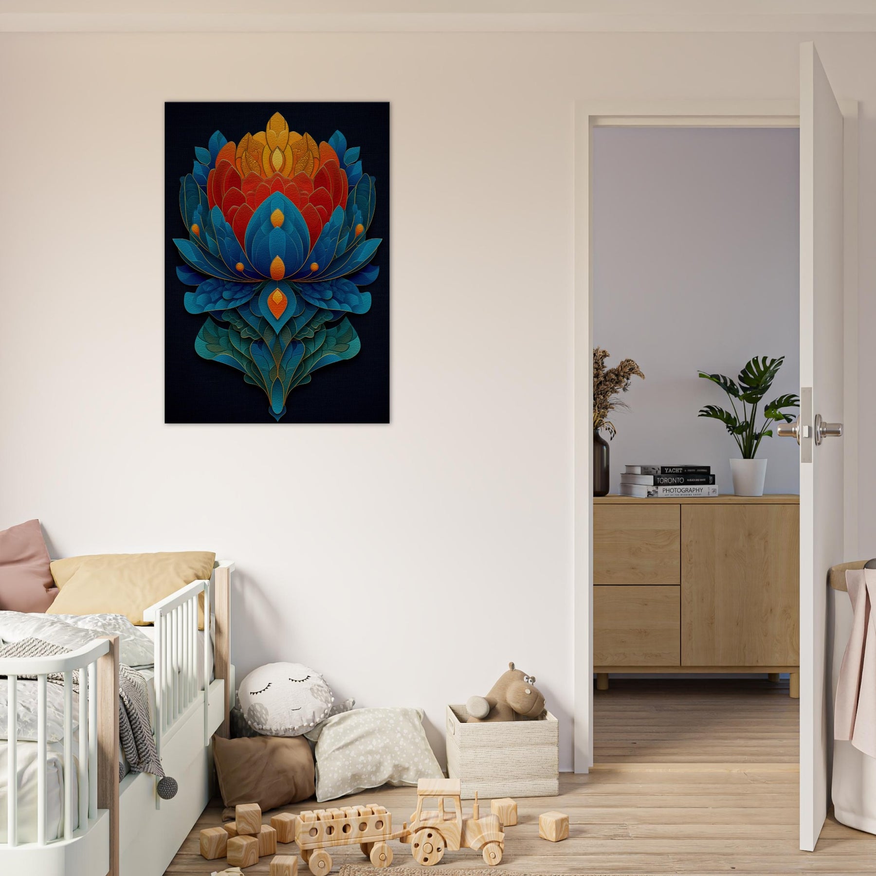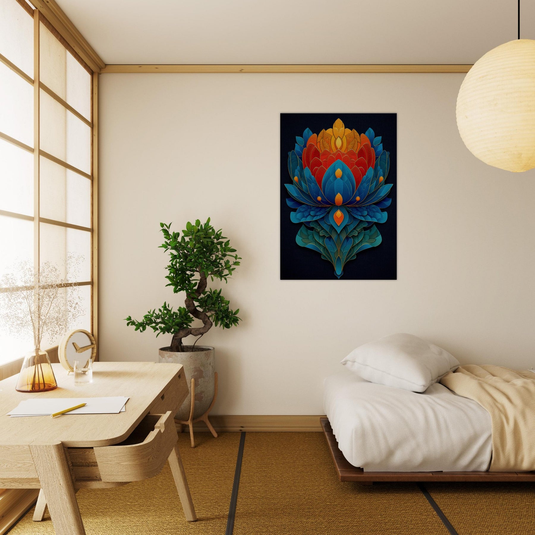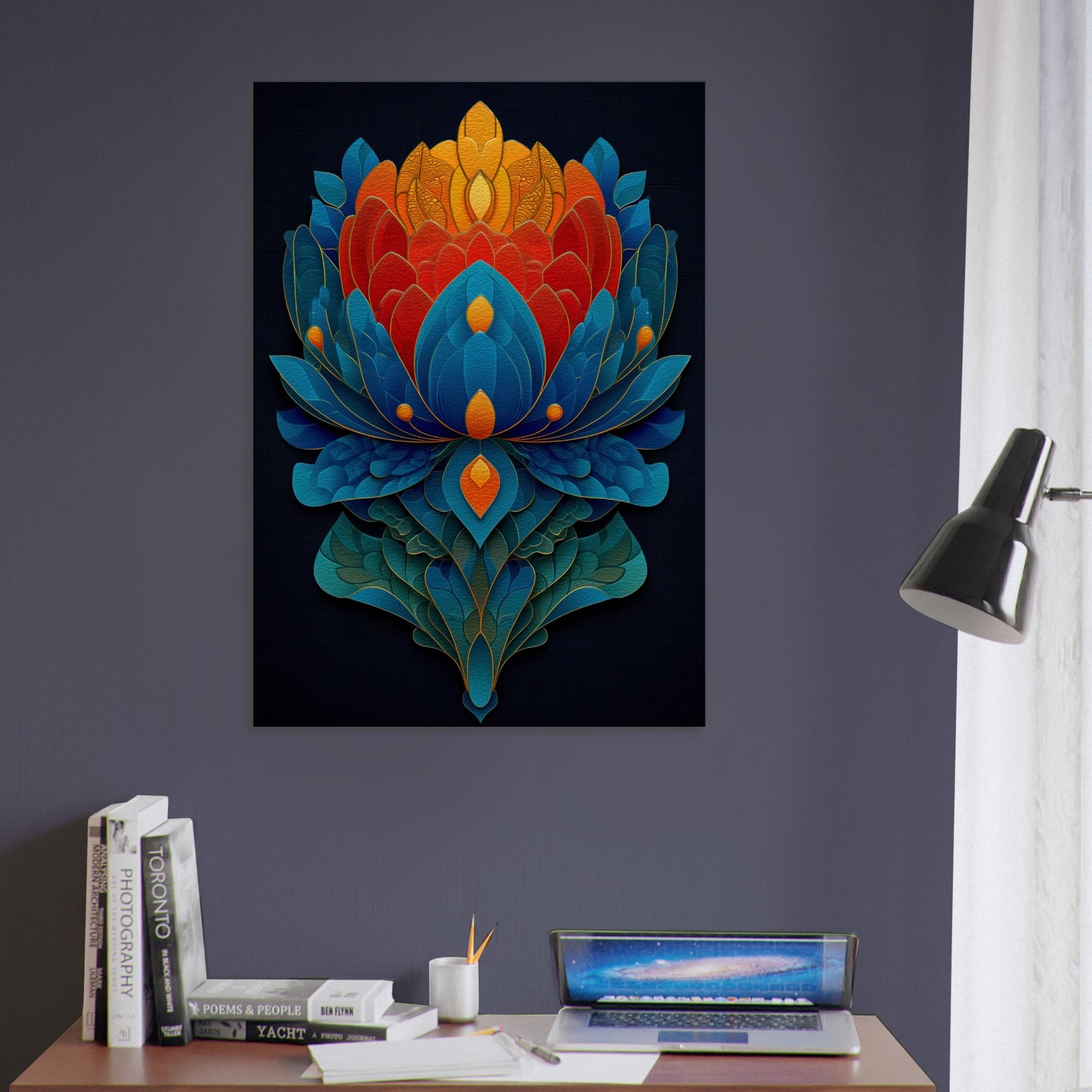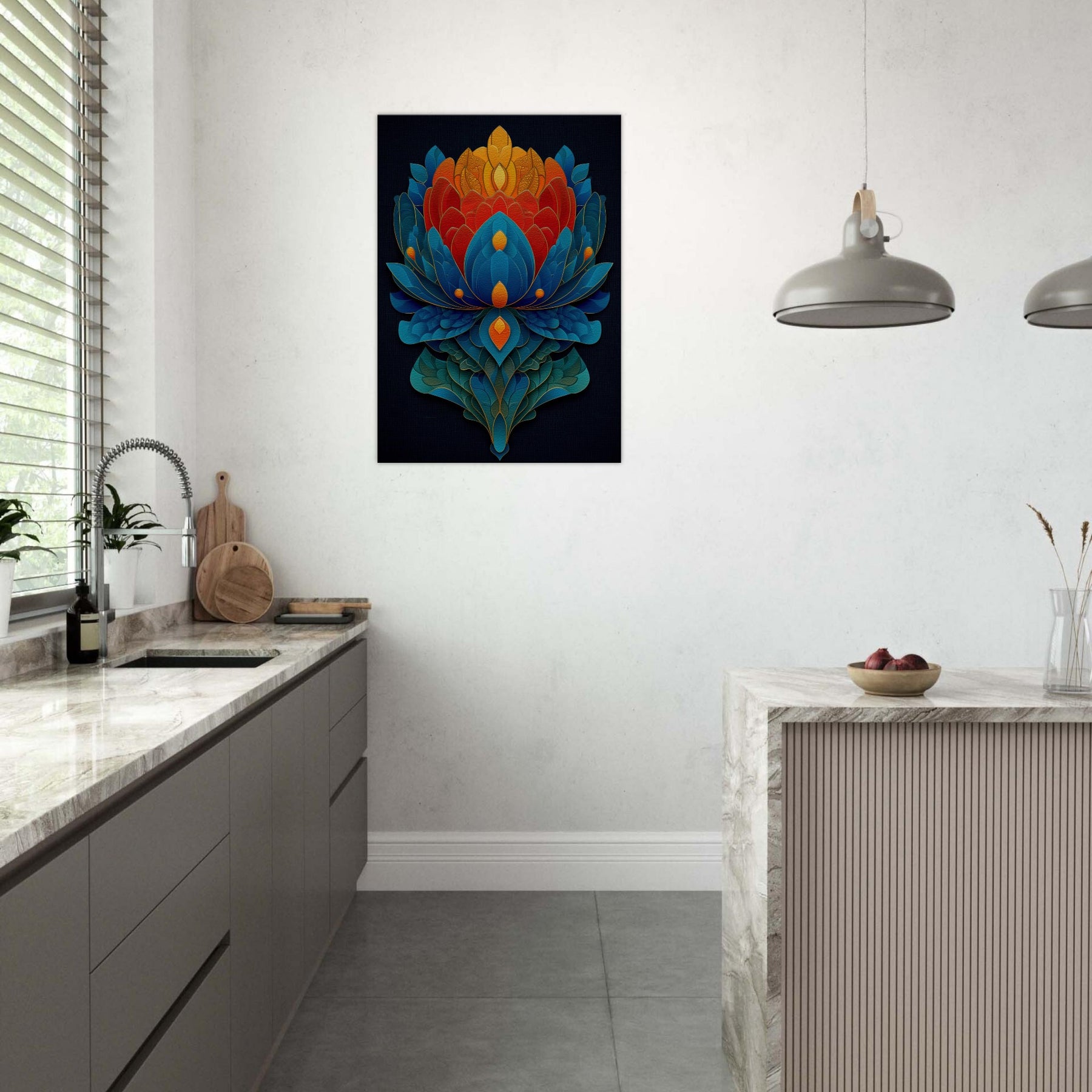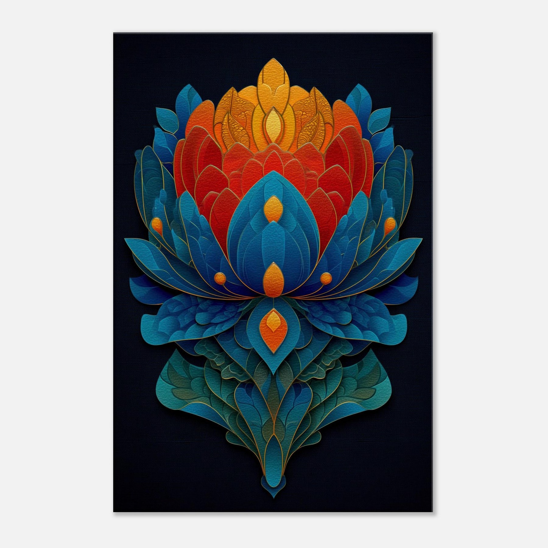 Experience the Lotus Throne as it ascends from night sky blues to sunlit oranges and golds. This abstract meditation of petals folds into a radiant centerpiece that invites quiet awe and contemplation. The layered shapes shimmer with tactile depth, evoking a temple of color that can transform a living room into a sanctuary. Let its mystical atmosphere guide the mood of conversation, candlelight, and slow evenings, where every glance reveals new detail.