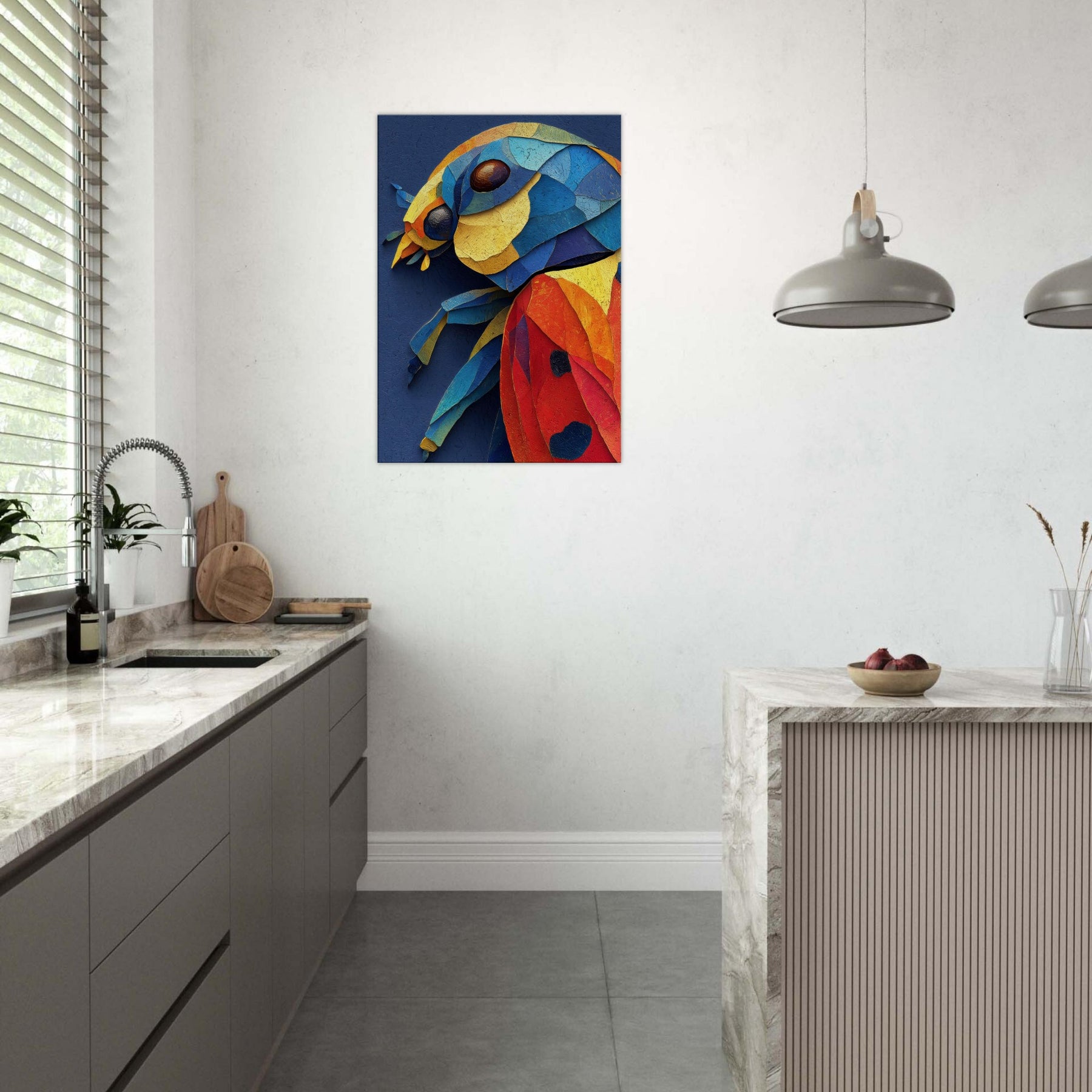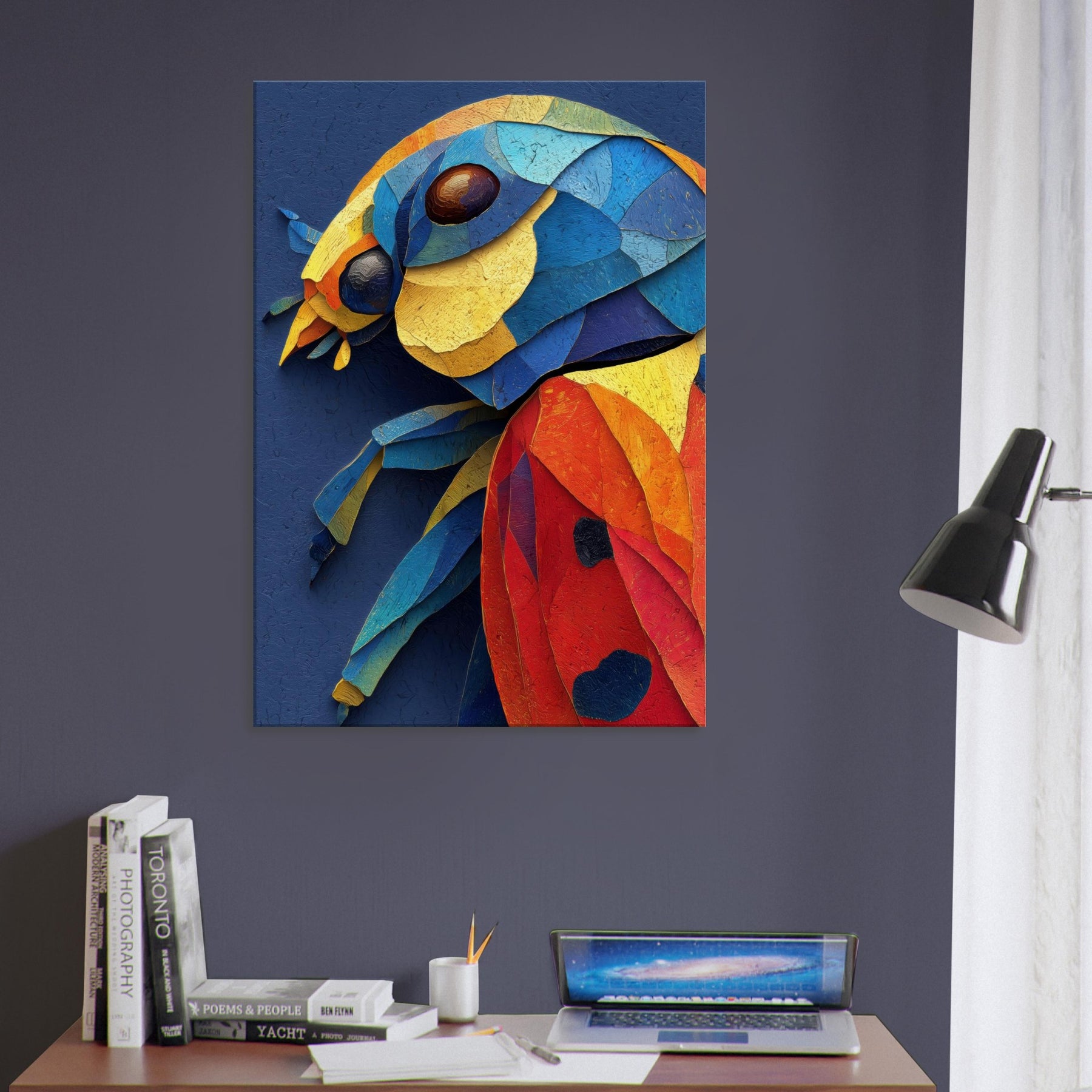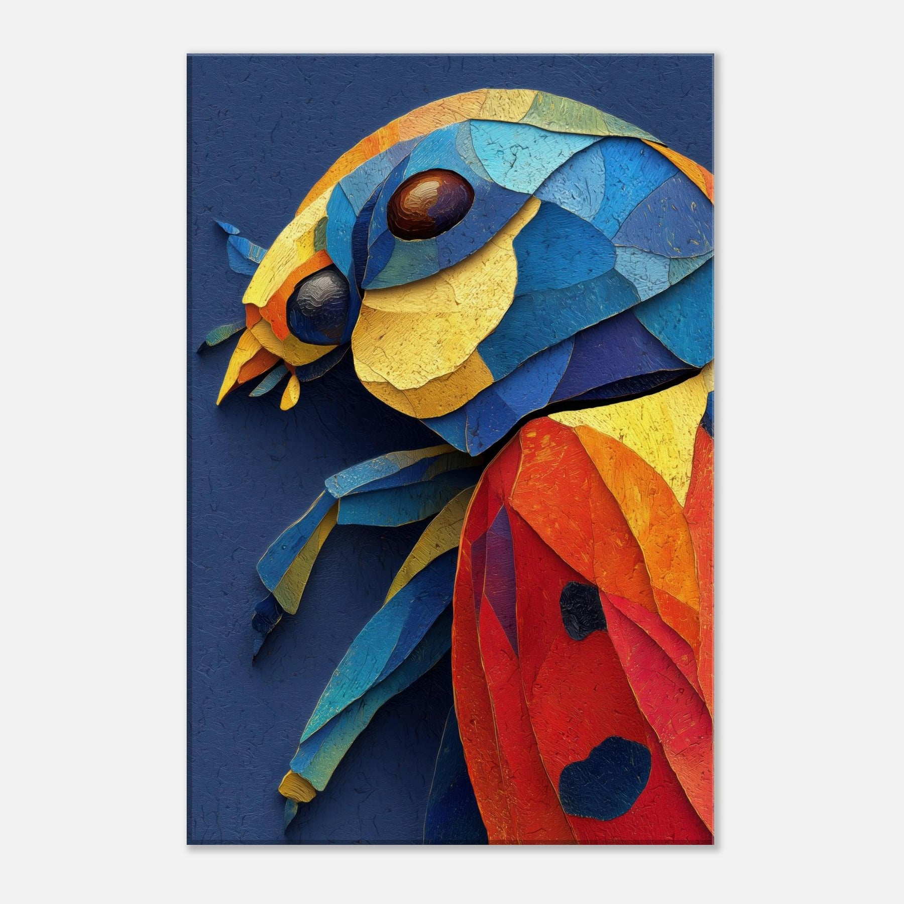 This abstract depiction of a ladybug unfolds in a vibrant collage of color and texture, inviting a playful, sunlit mood into your space. Layers of torn pigment create a tactile surface that catches the eye from every angle, like a tiny creature sketched in motion. The ladybug sits at the heart of the composition, a joyful focal point that glows against a deep indigo canvas. Perfect for a living room or bedroom, it lends warmth, curiosity, and modern elegance.