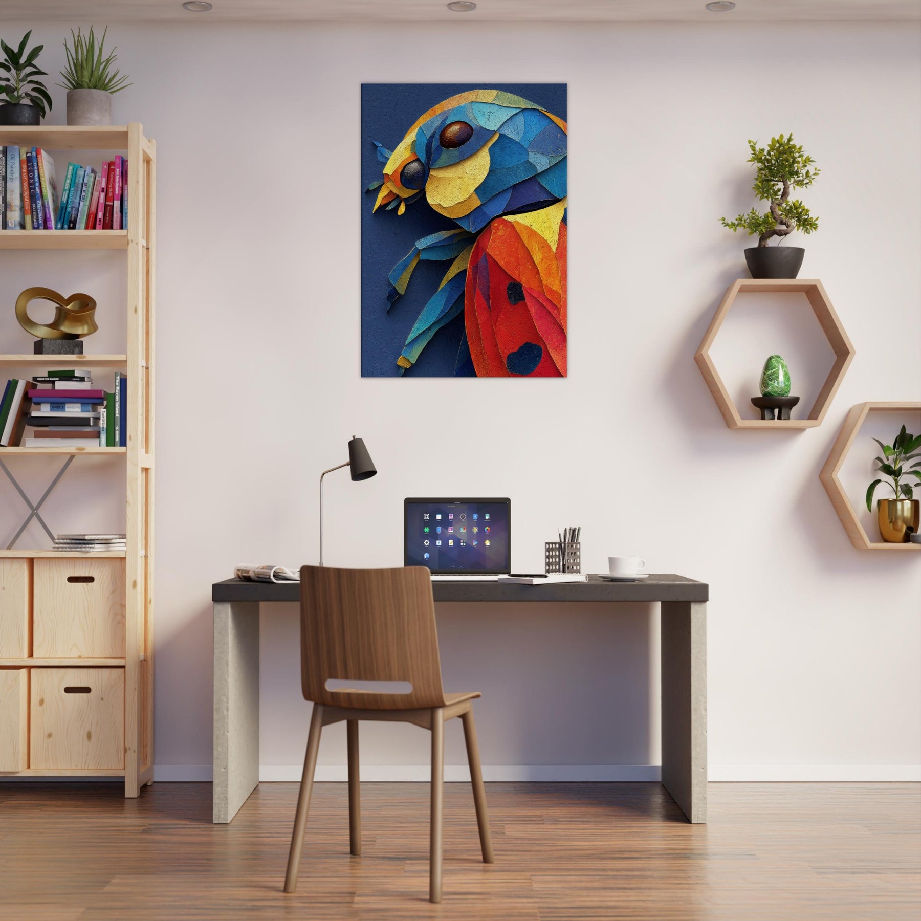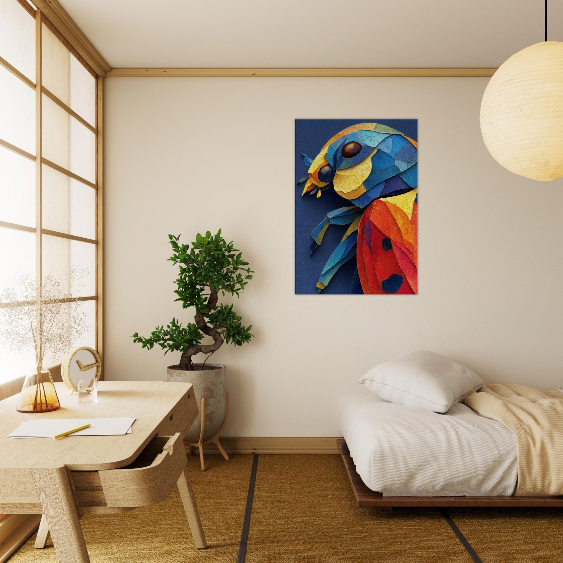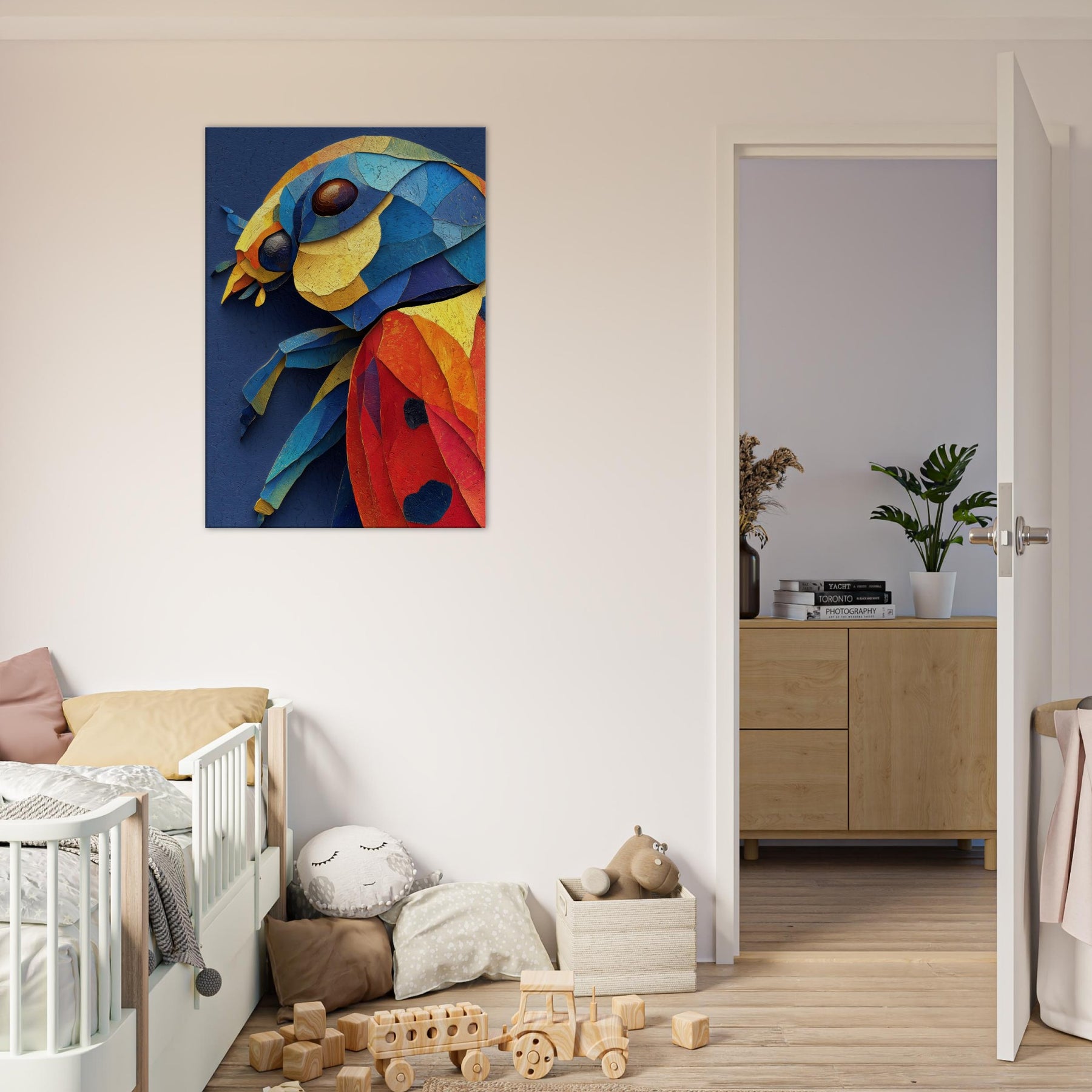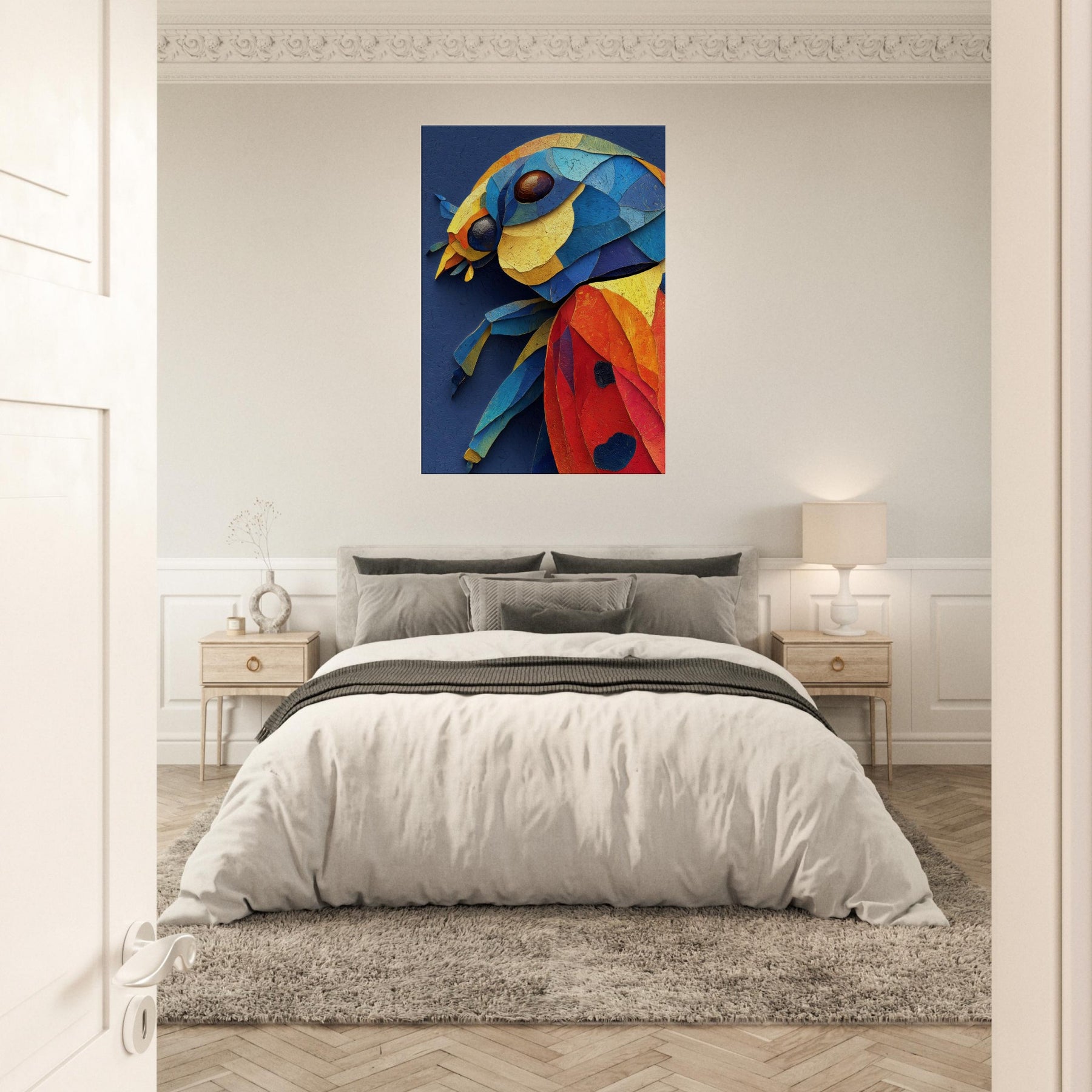 This abstract depiction of a ladybug unfolds in a vibrant collage of color and texture, inviting a playful, sunlit mood into your space. Layers of torn pigment create a tactile surface that catches the eye from every angle, like a tiny creature sketched in motion. The ladybug sits at the heart of the composition, a joyful focal point that glows against a deep indigo canvas. Perfect for a living room or bedroom, it lends warmth, curiosity, and modern elegance.
