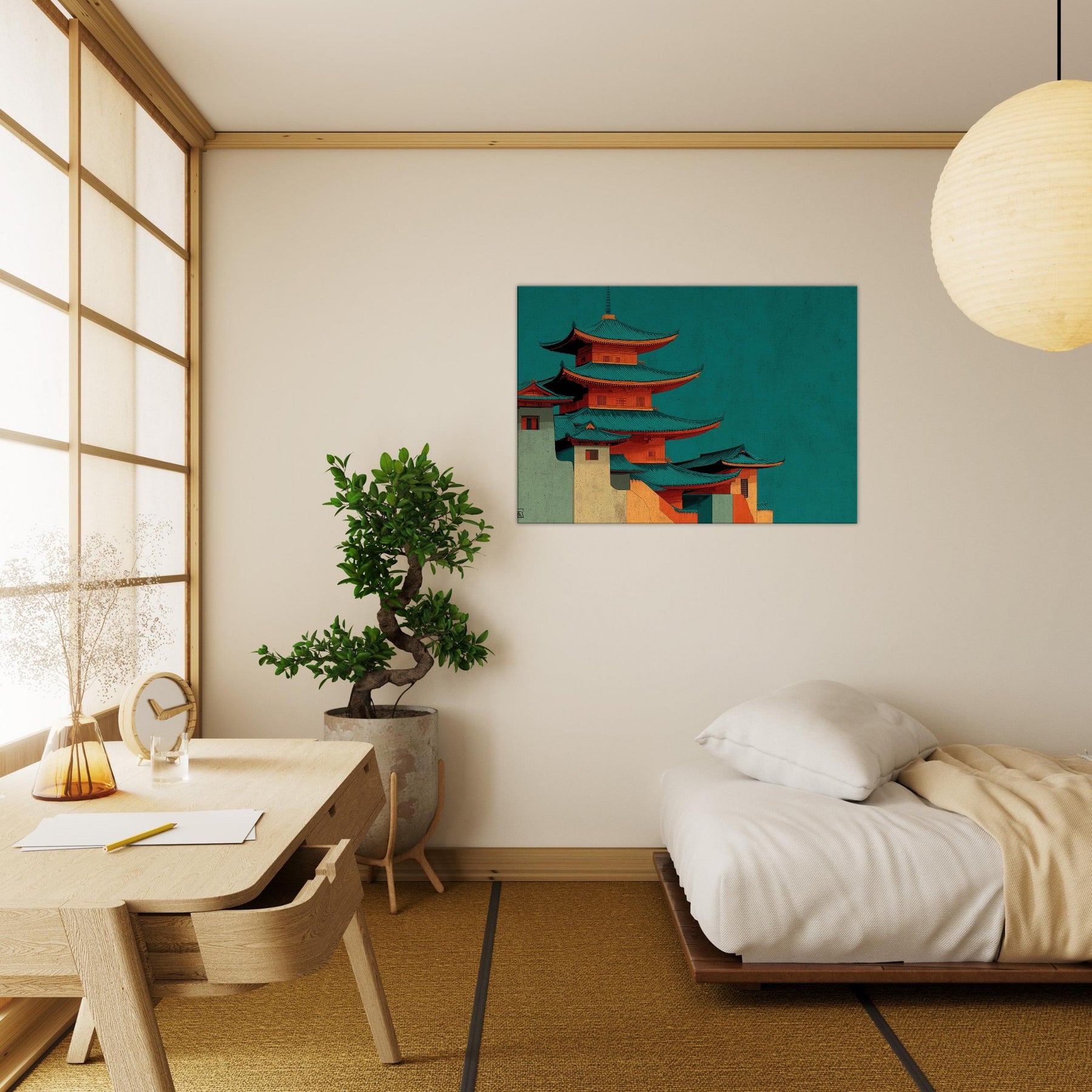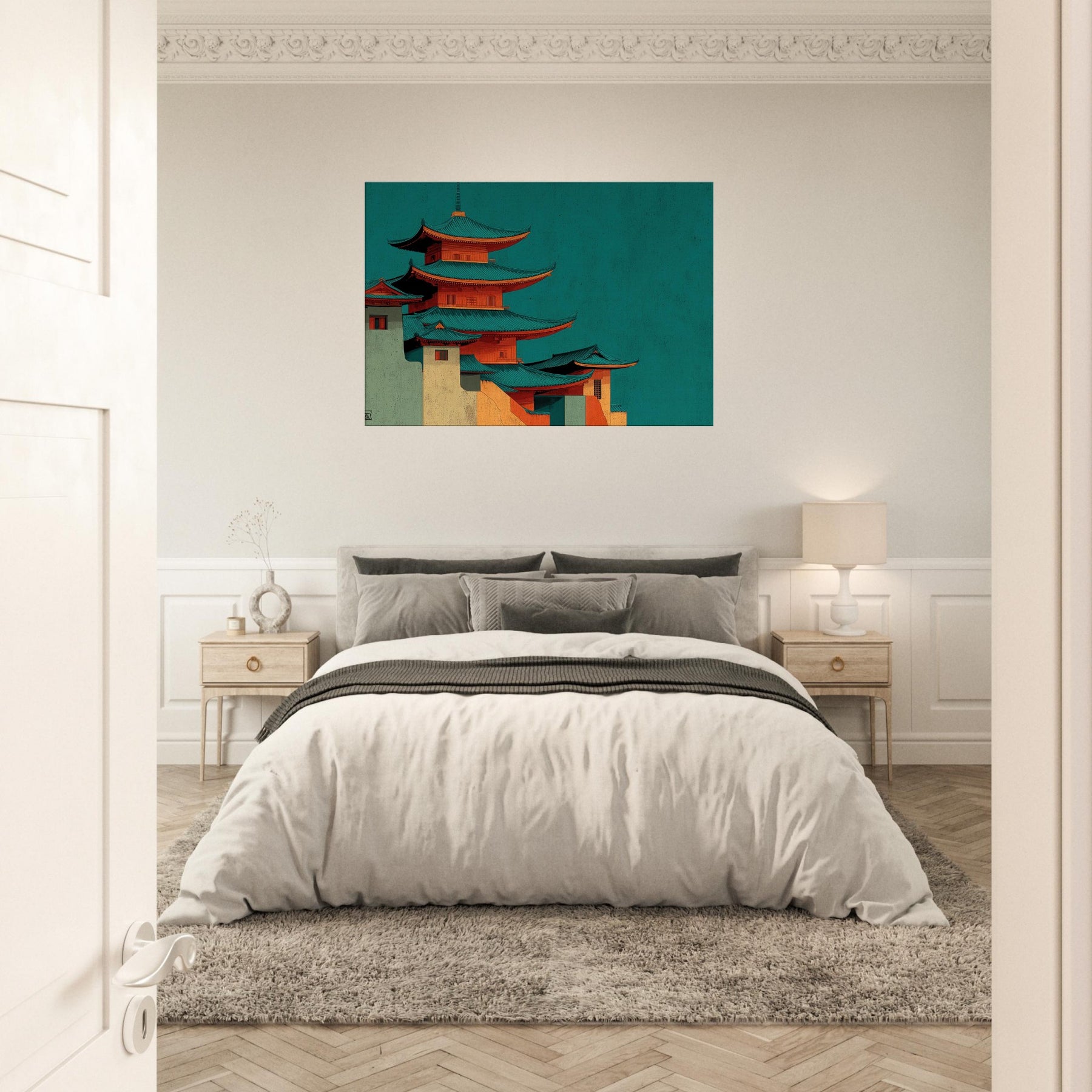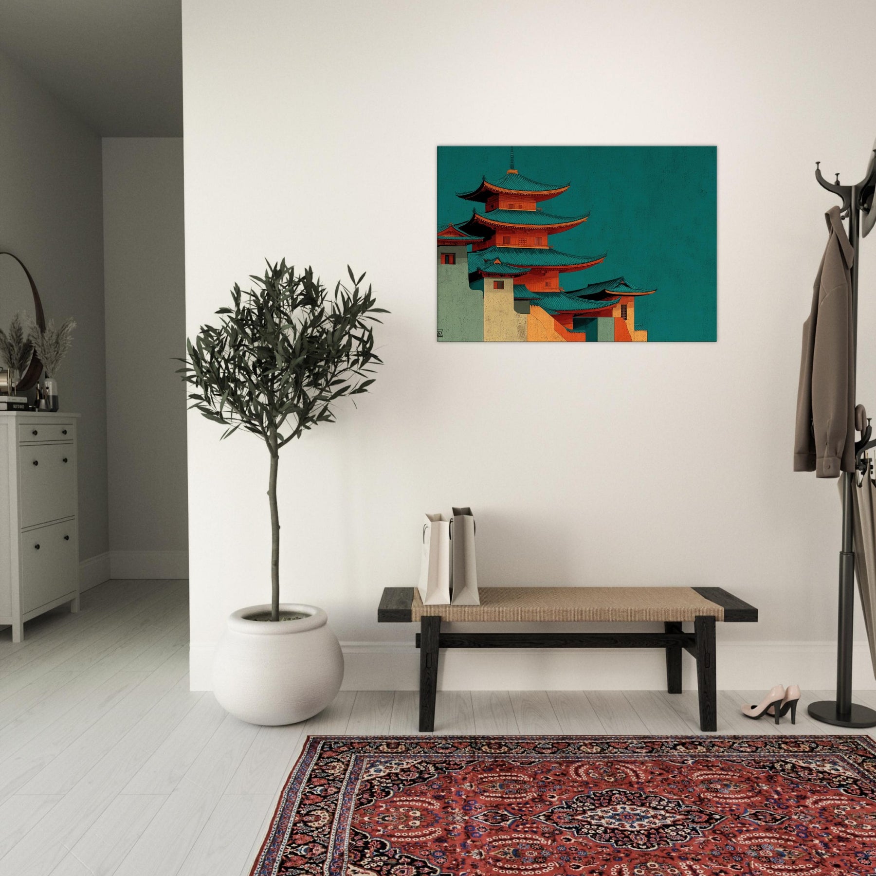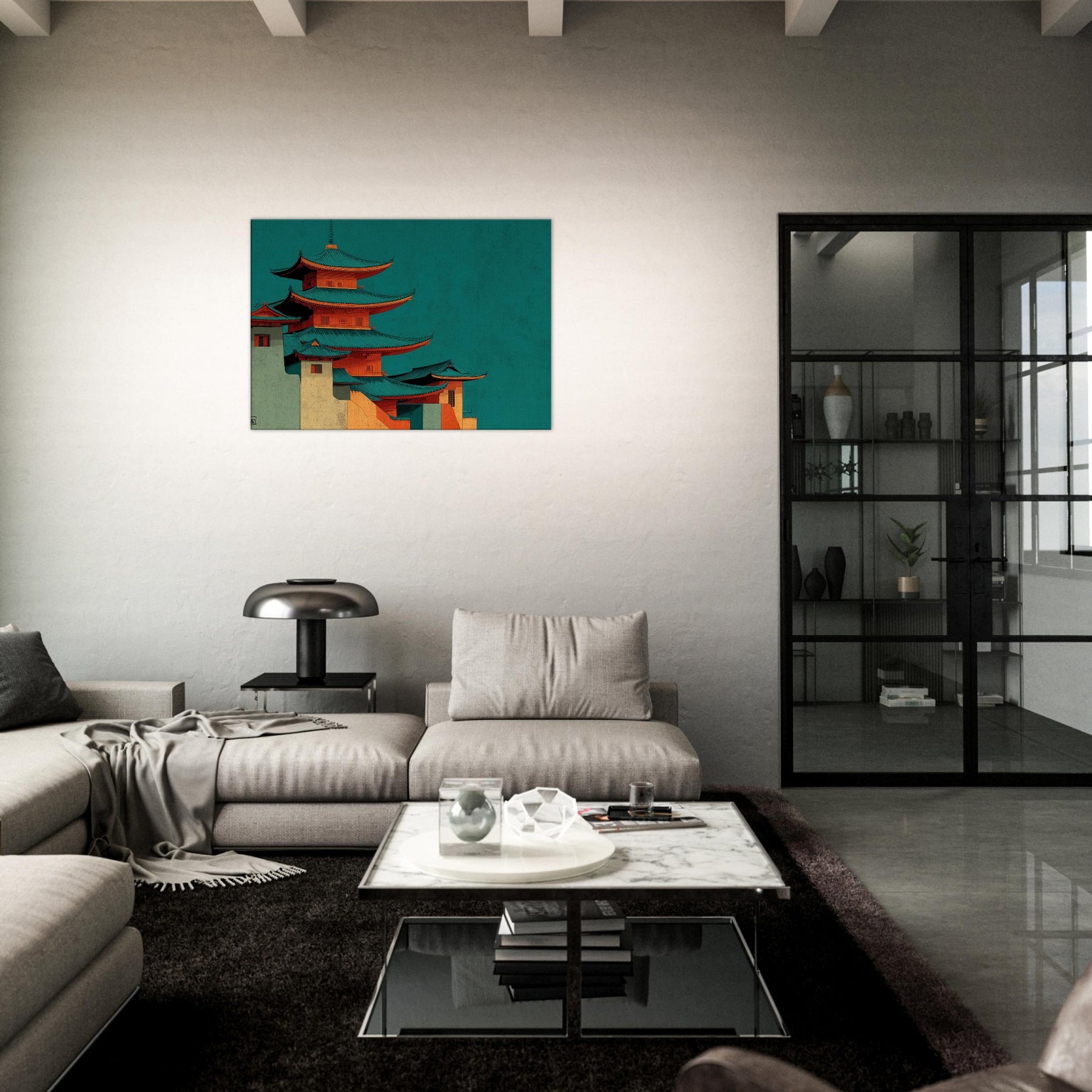 Let the Pagoda Roofline rise in your room as a lantern of color and calm. This abstract influenced composition distills architecture into sculpted echoes crisp teal roofs, burnished reds, and soft linen walls set against a deep teal field. The rhythm of layered roofs invites the eye to wander, transforming walls into a quiet horizon. With its balanced geometry and tactile grain, it pairs with warm woods and metal accents, turning everyday moments into contemplative space.