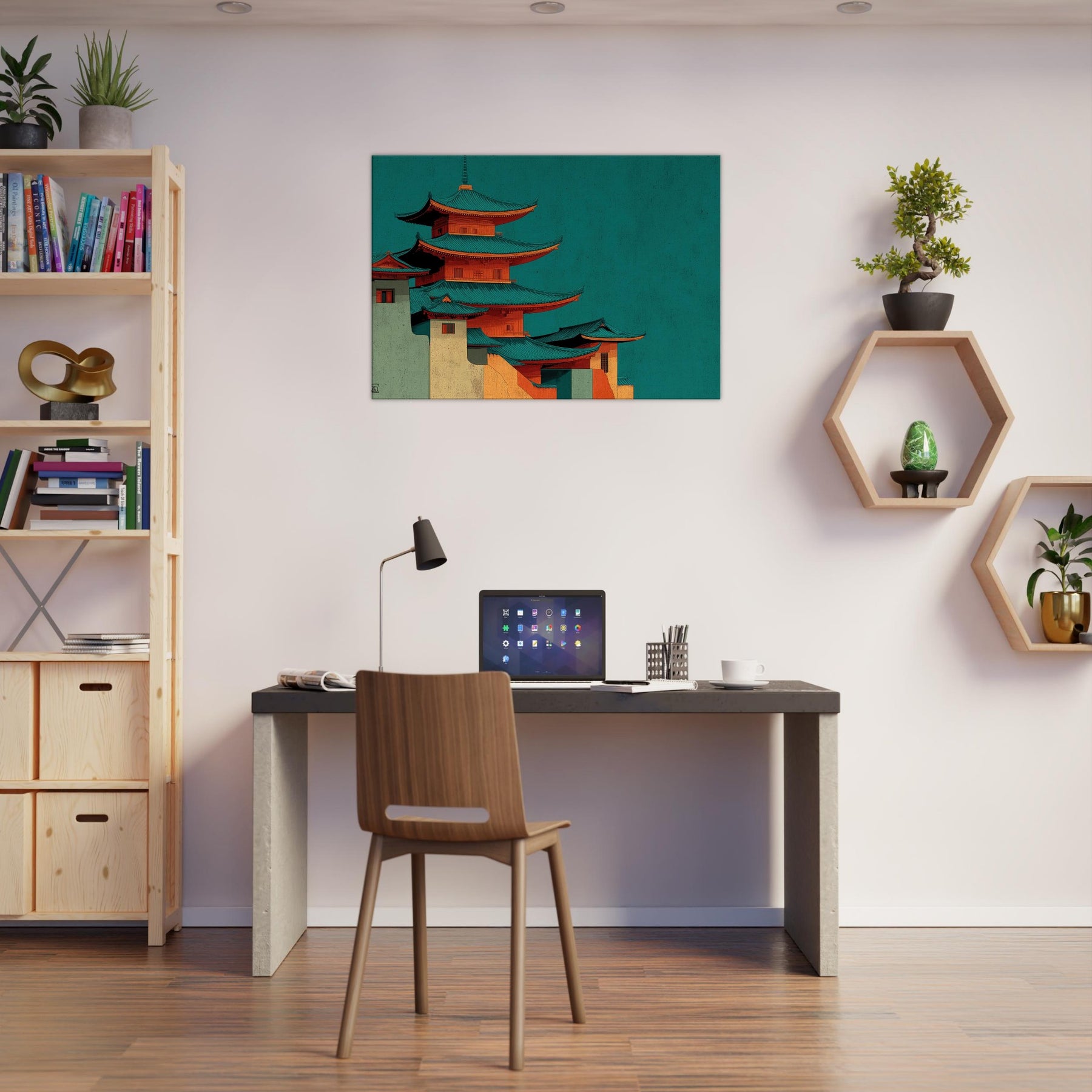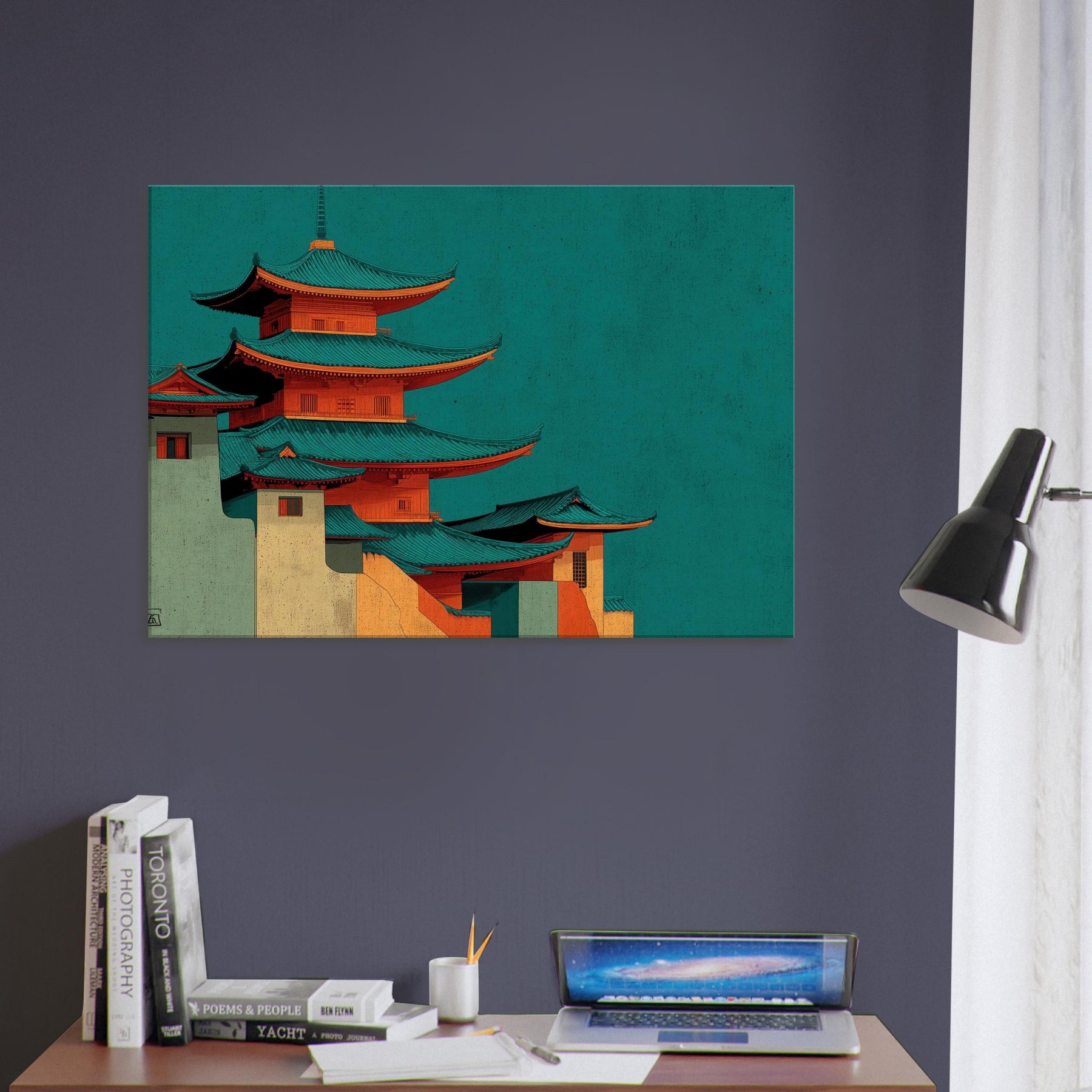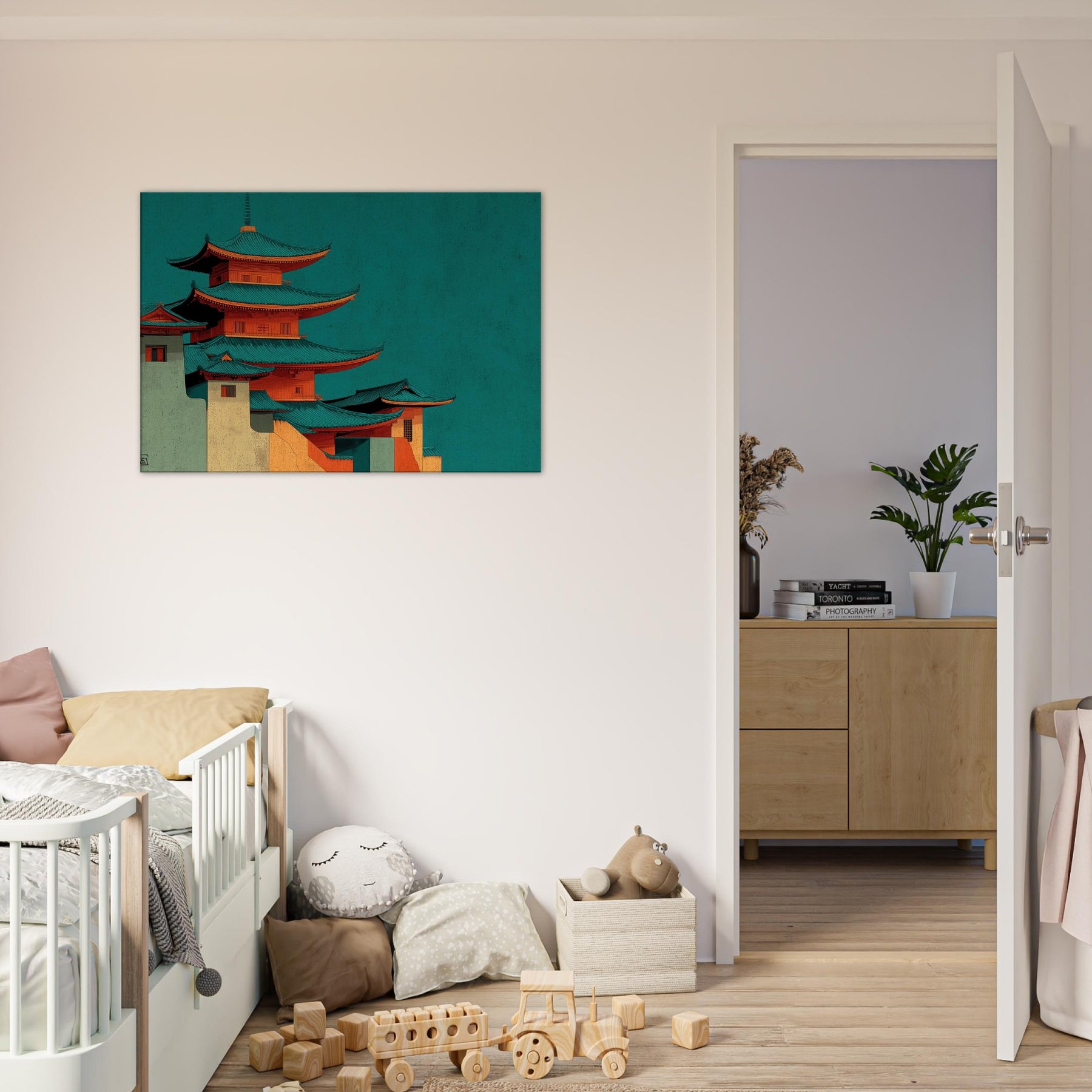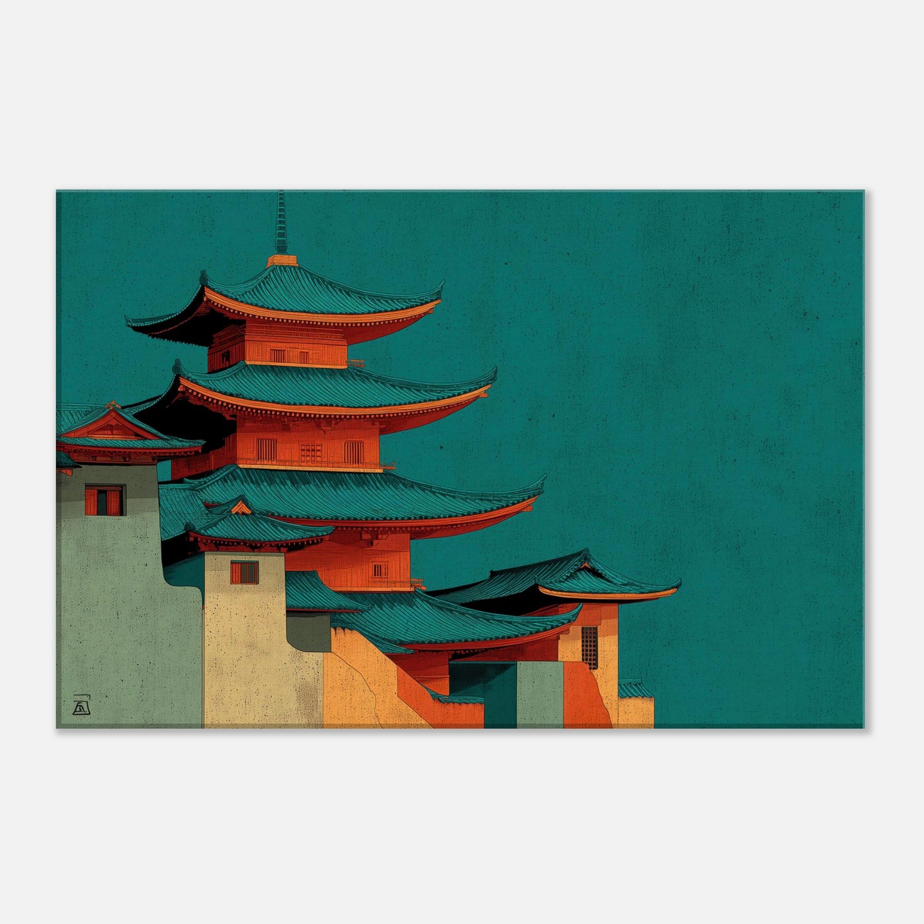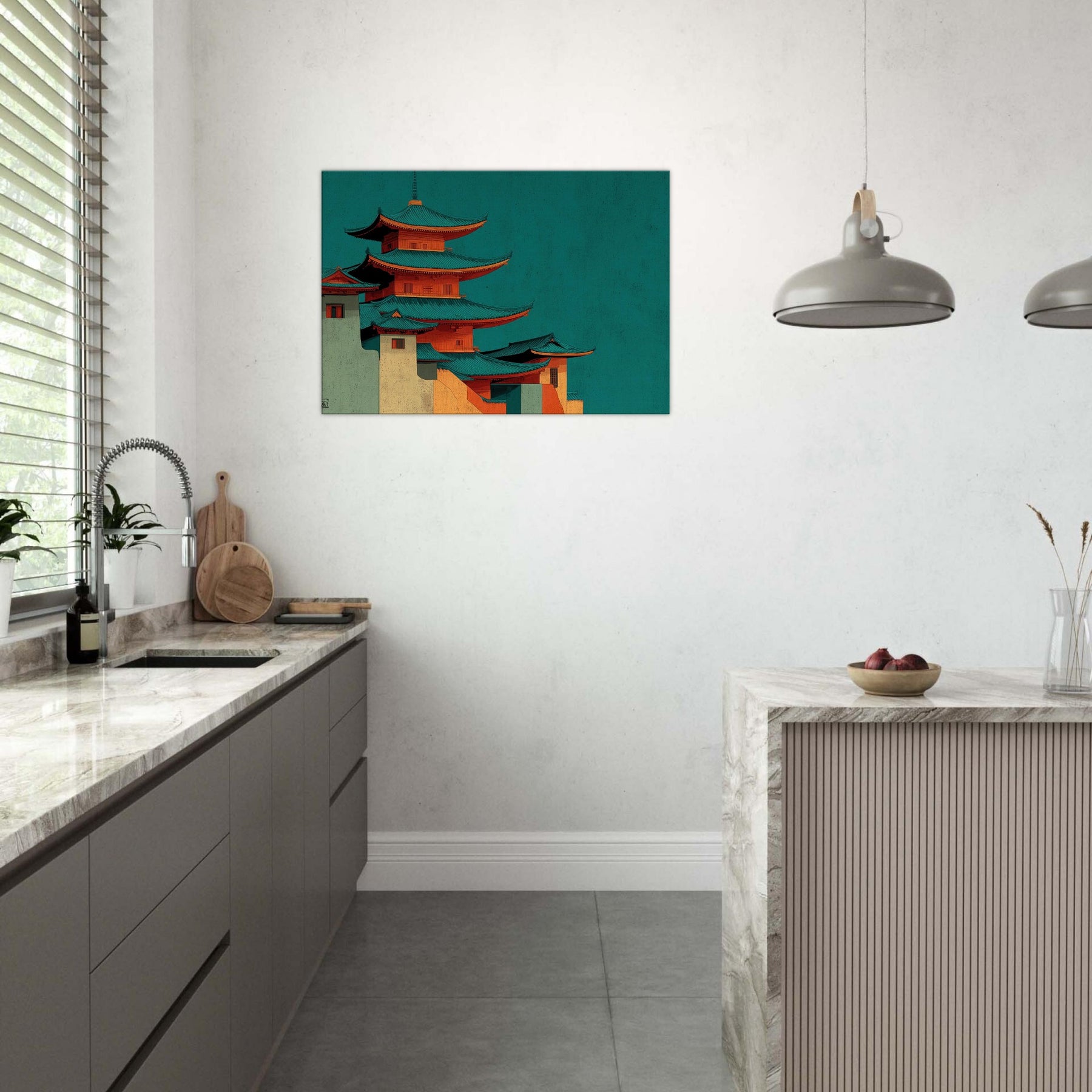 Let the Pagoda Roofline rise in your room as a lantern of color and calm. This abstract influenced composition distills architecture into sculpted echoes crisp teal roofs, burnished reds, and soft linen walls set against a deep teal field. The rhythm of layered roofs invites the eye to wander, transforming walls into a quiet horizon. With its balanced geometry and tactile grain, it pairs with warm woods and metal accents, turning everyday moments into contemplative space.