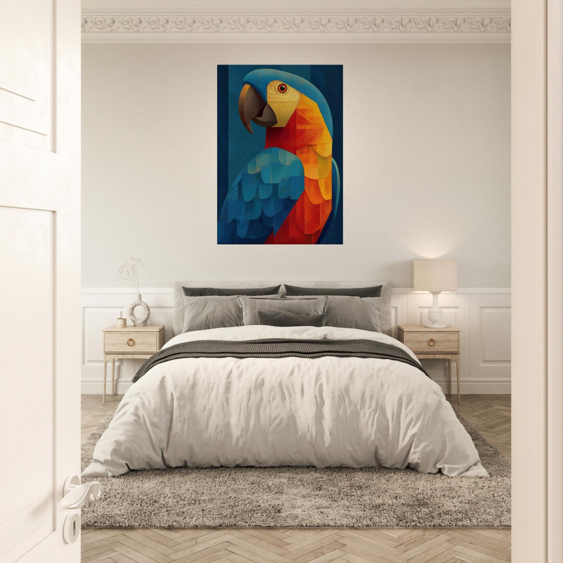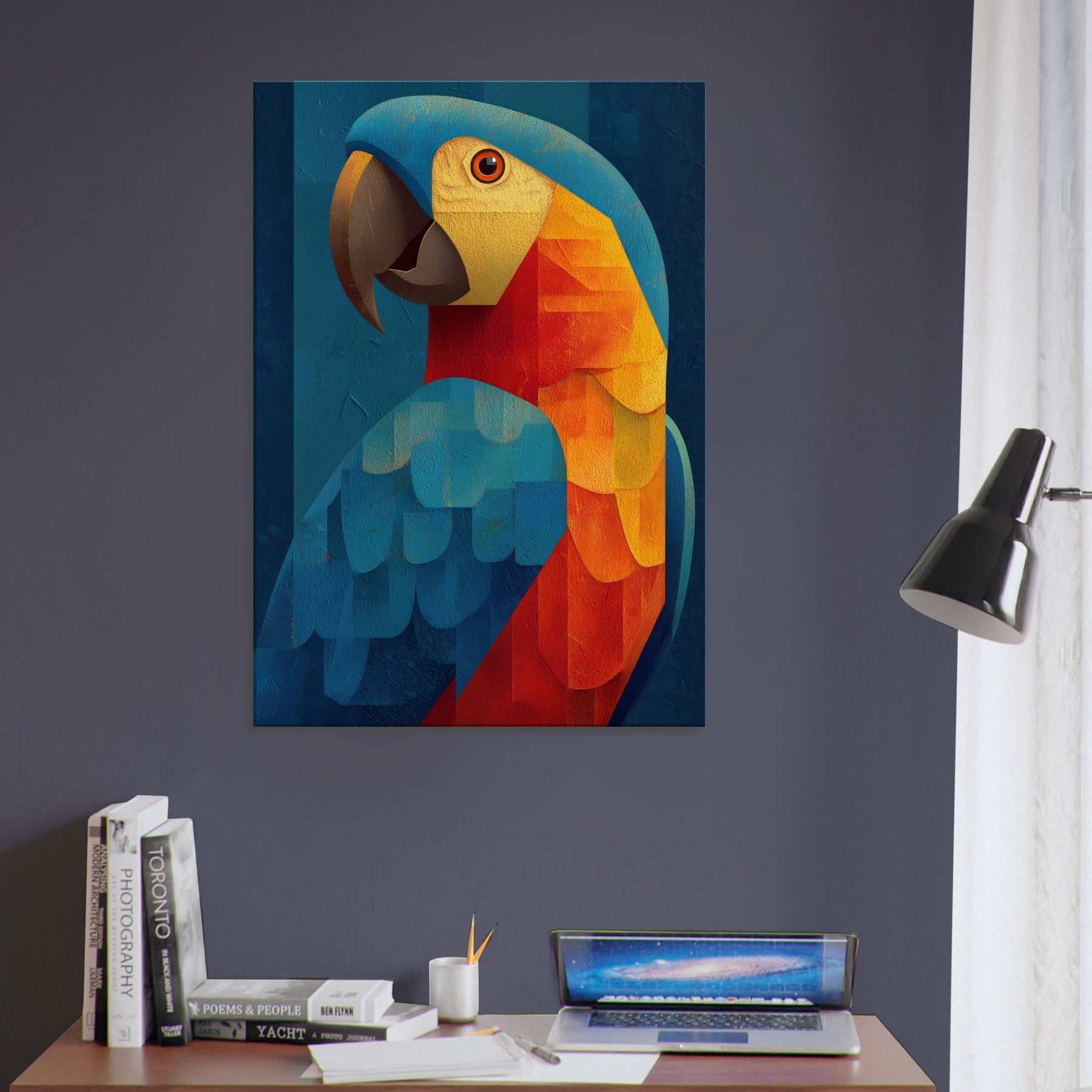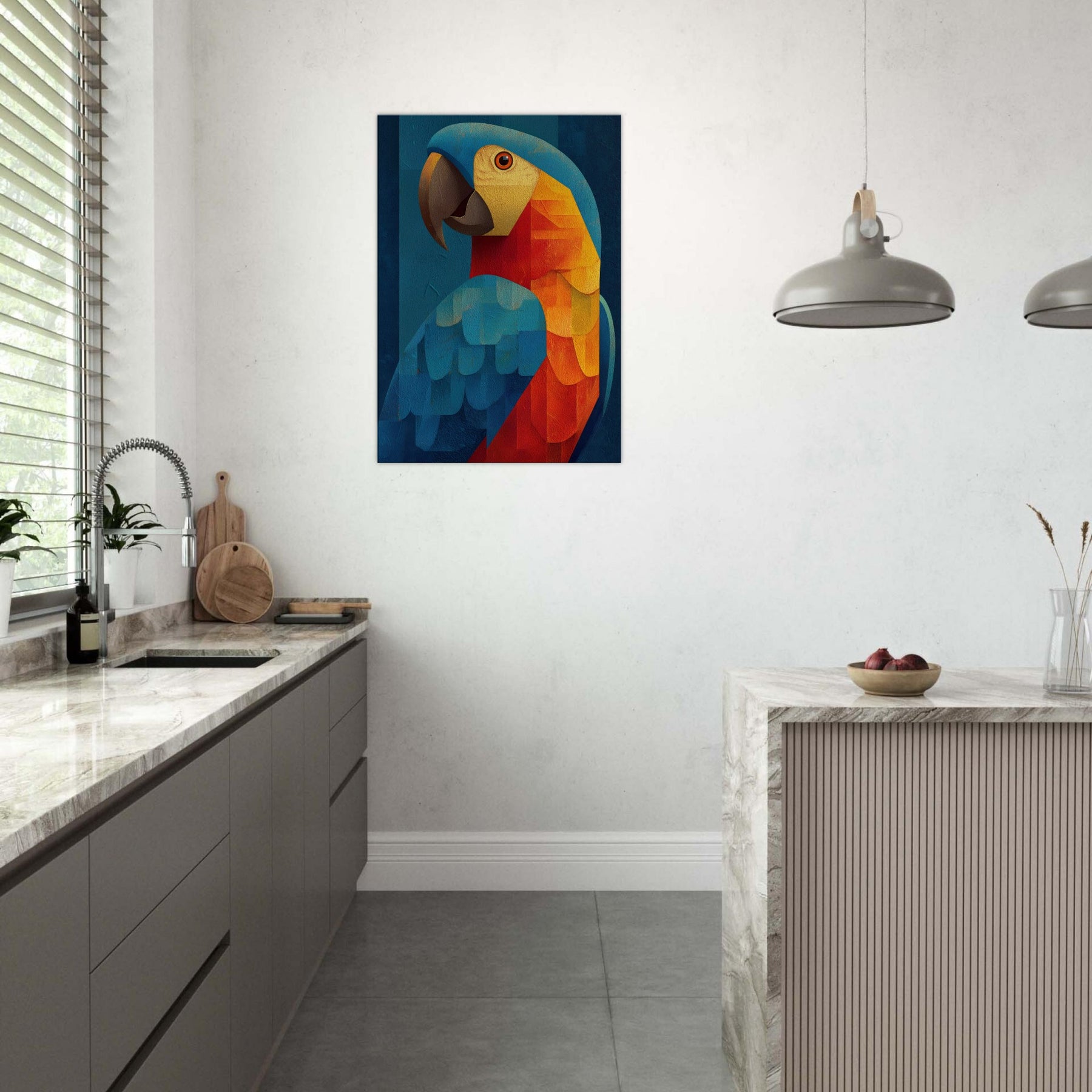 Like a sunlit jewel perched on a canvas, this Parrot radiates energy through faceted geometry and luminous color. The bold blend of cobalt blues, turquoise highlights, and blazing oranges invites the eye to travel across each angular feather, creating a living dialogue between light and shadow. In a modern living space, it swells with warmth and movement a focal point that sparks conversation and softens hard edges with its lyrical rhythm. A wall art that feels both playful and refined.