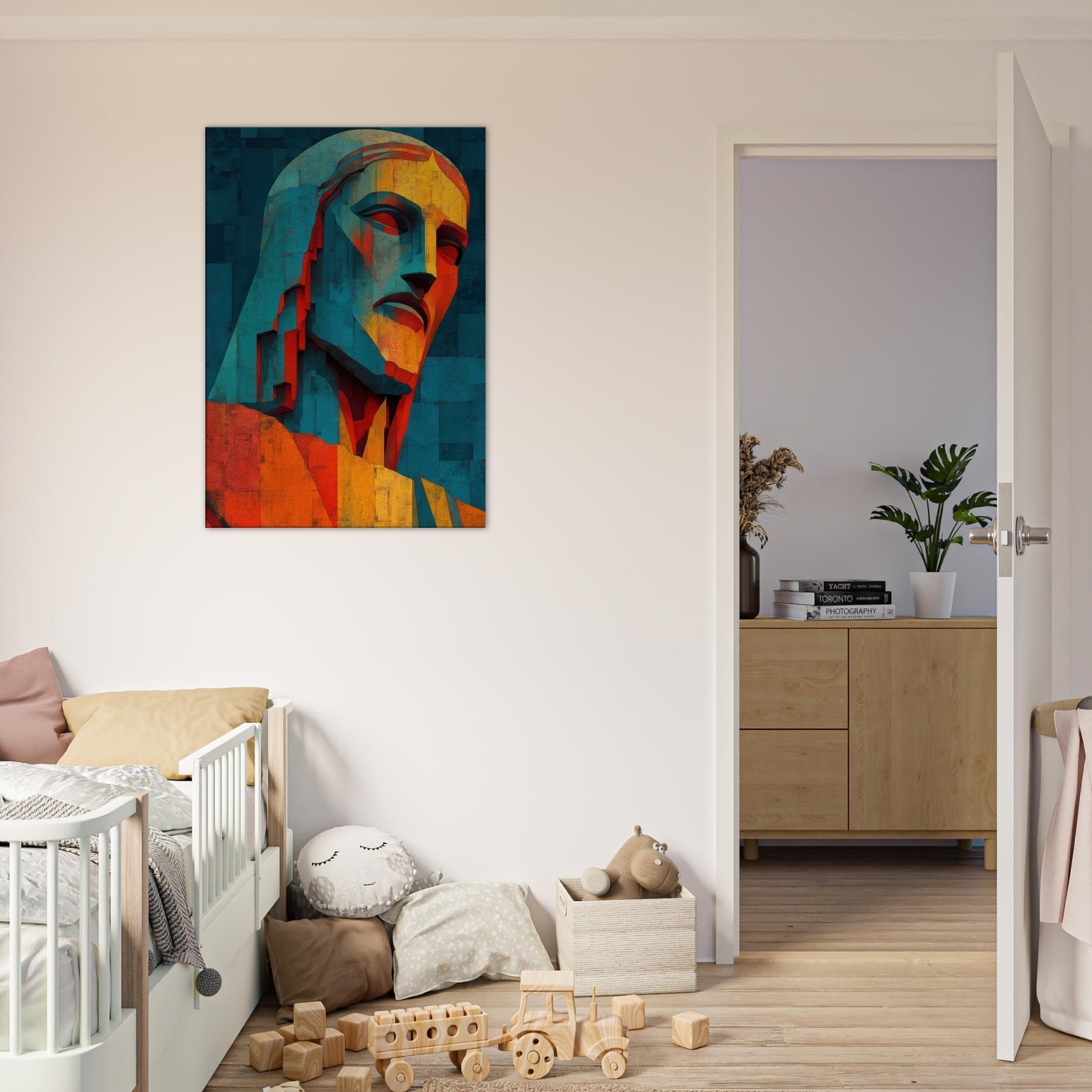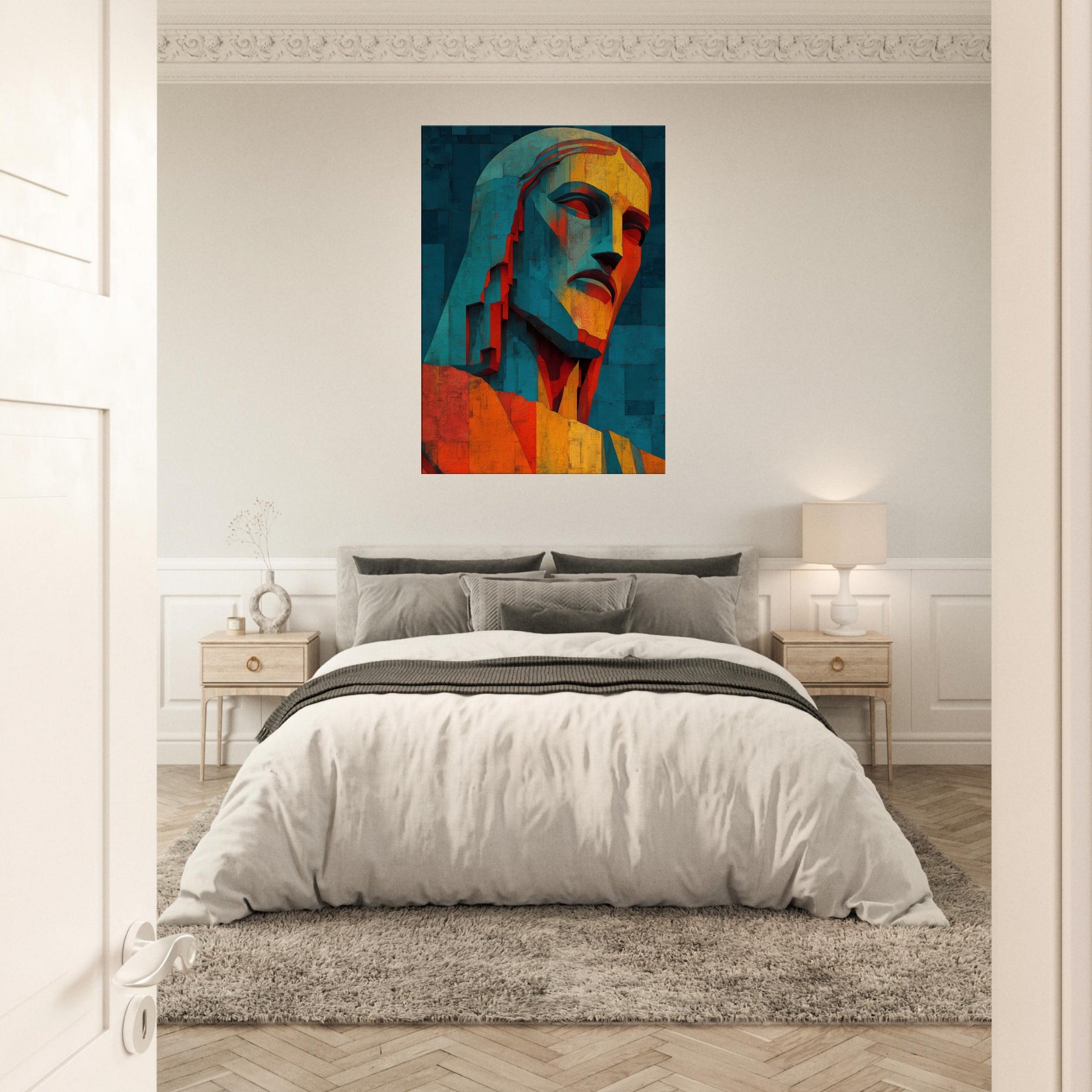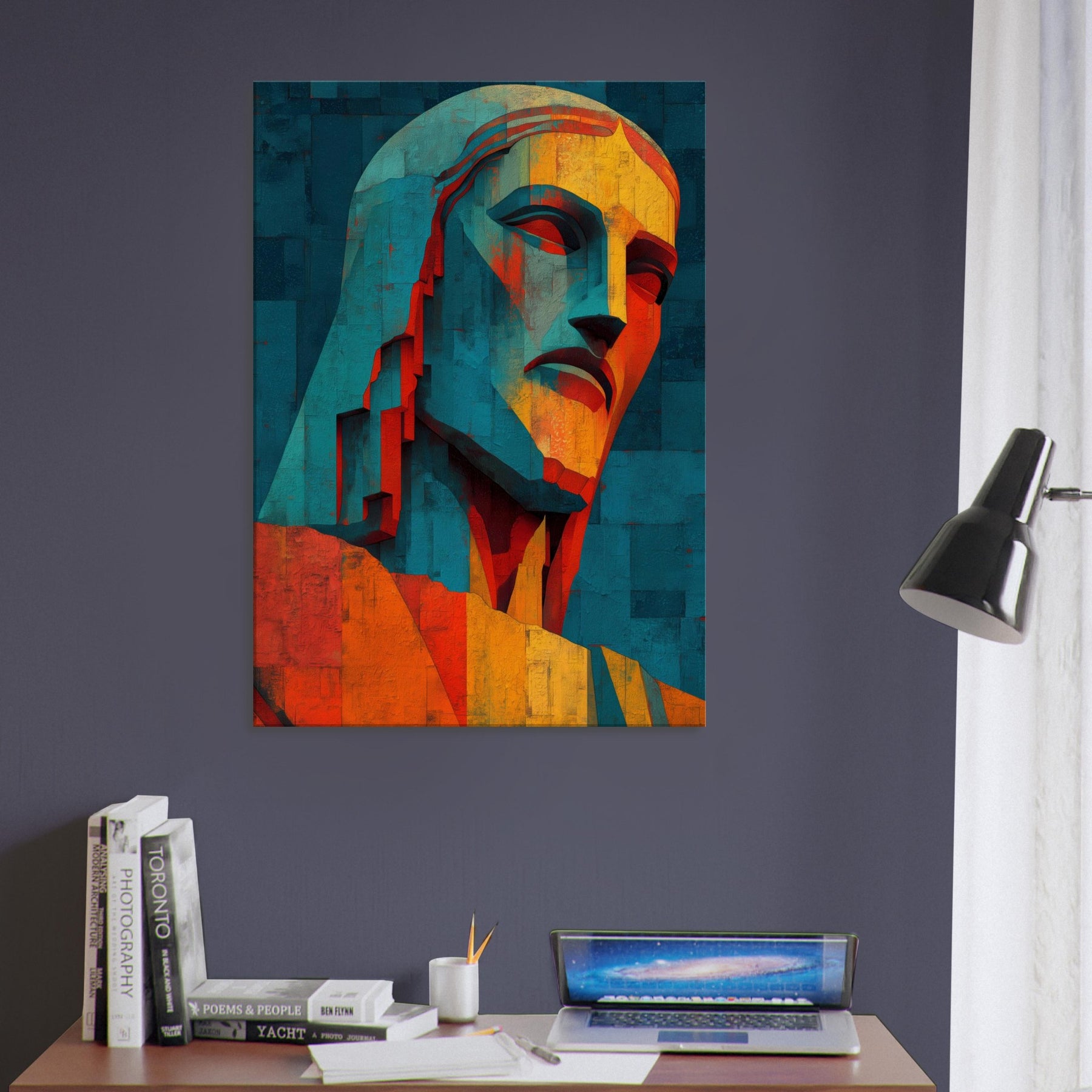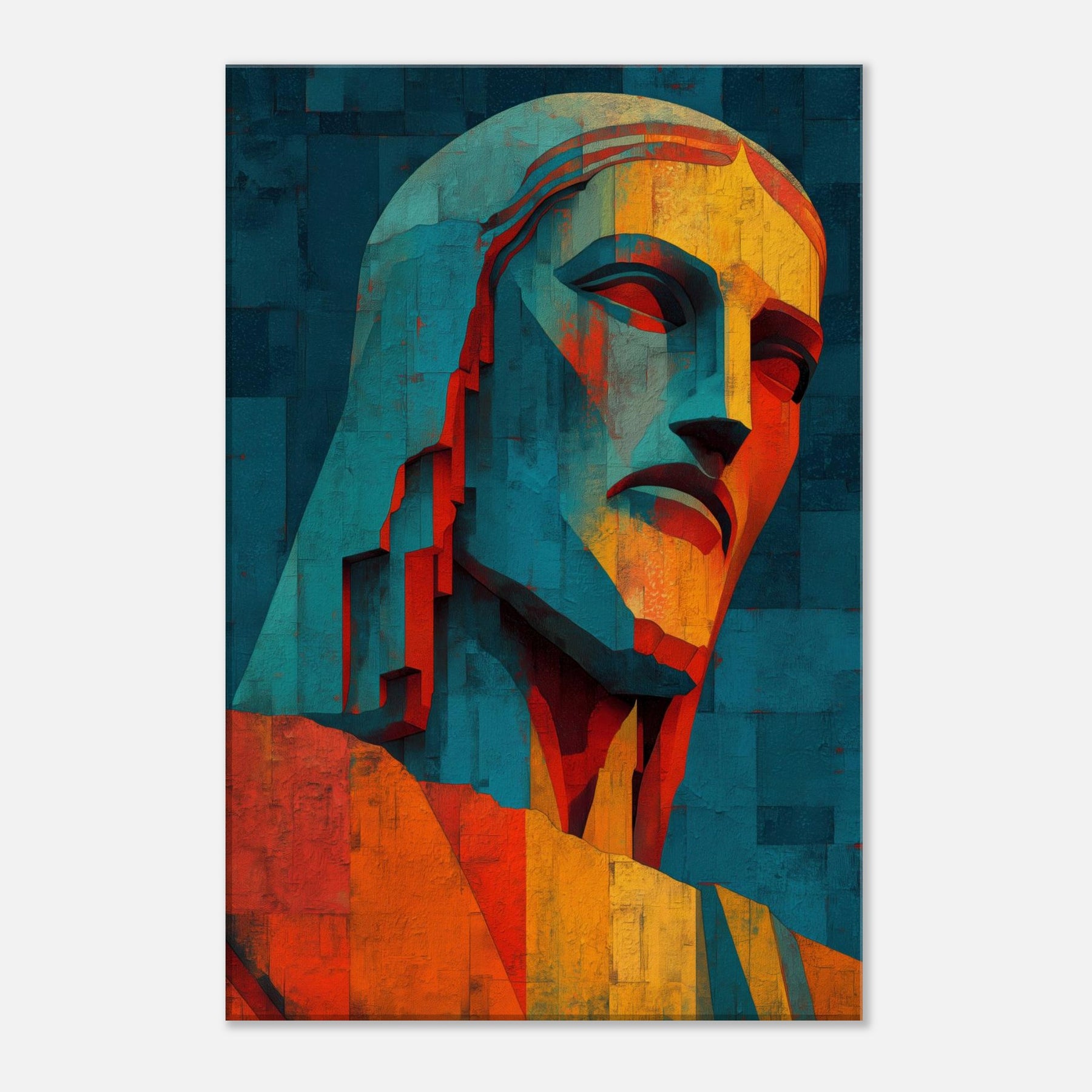 Christ the Redeemer emerges in broken planes and radiant blocks, a cityscape saint reduced to luminous facets. This abstract portrayal drapes a modern room in cool teals, electric blues, and warm ochres, turning quiet corners into a skyline of contemplation. The piece invites breath, reminding us of steadfast grace amid urban movement. Hang it in a living room or study to ground bright design with spiritual poise, creating a serene focal point that feels both monumental and intimate.