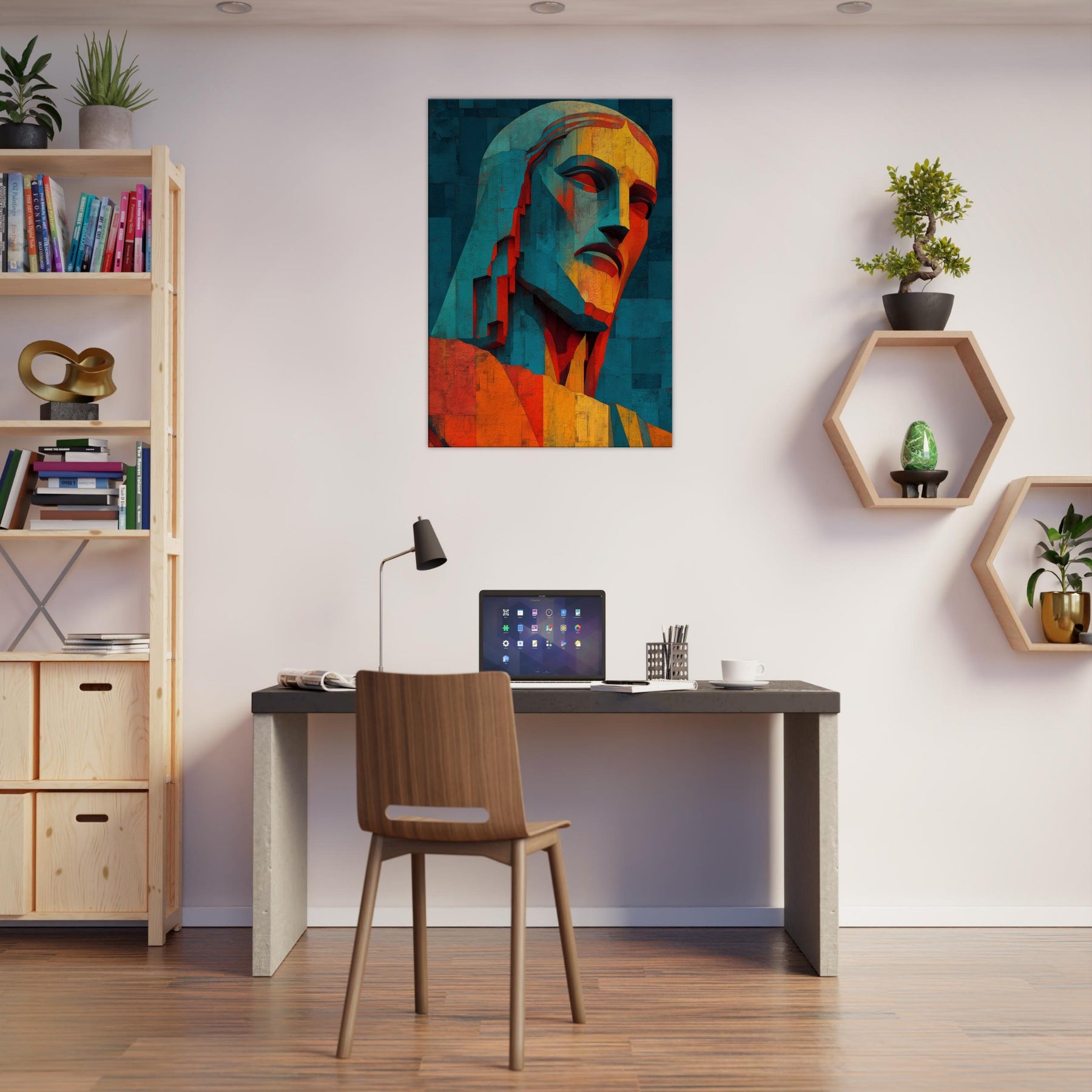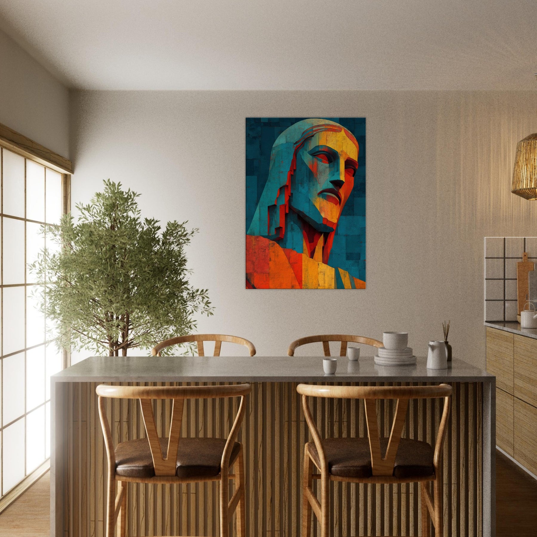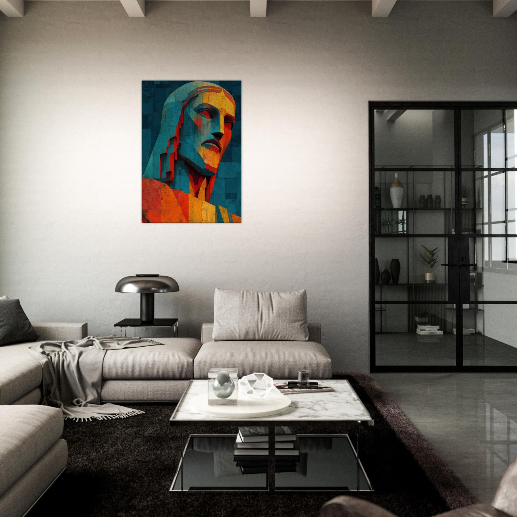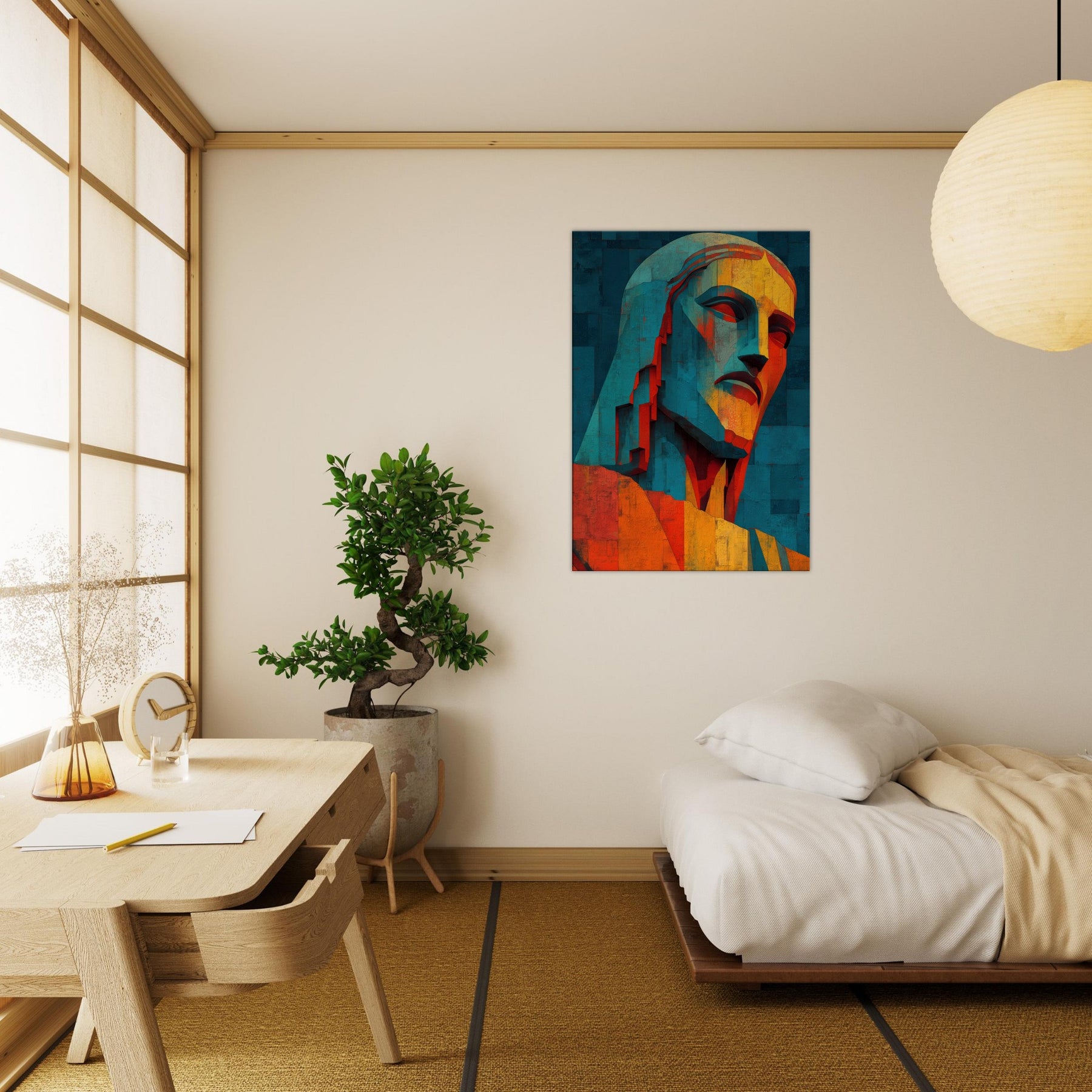 Christ the Redeemer emerges in broken planes and radiant blocks, a cityscape saint reduced to luminous facets. This abstract portrayal drapes a modern room in cool teals, electric blues, and warm ochres, turning quiet corners into a skyline of contemplation. The piece invites breath, reminding us of steadfast grace amid urban movement. Hang it in a living room or study to ground bright design with spiritual poise, creating a serene focal point that feels both monumental and intimate.