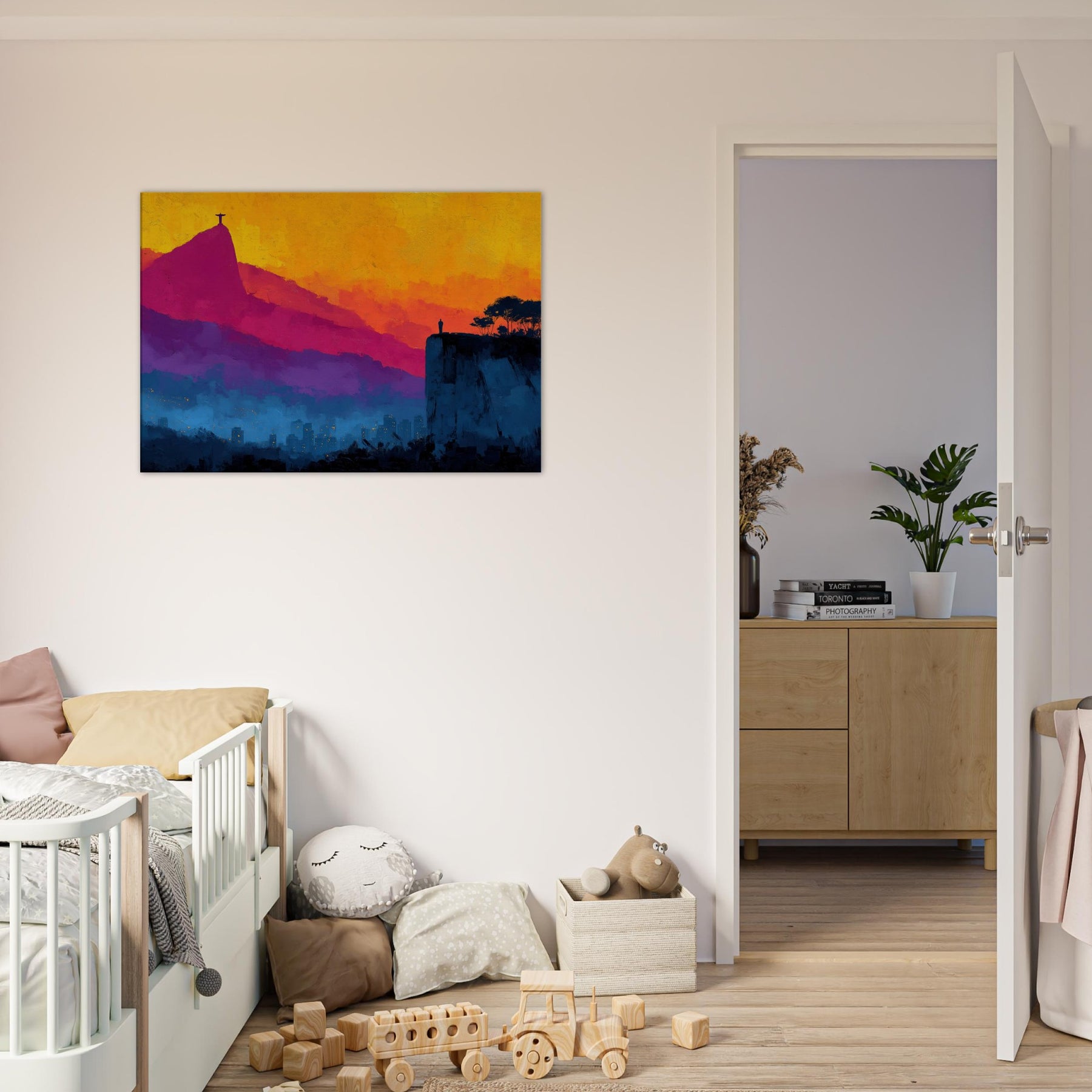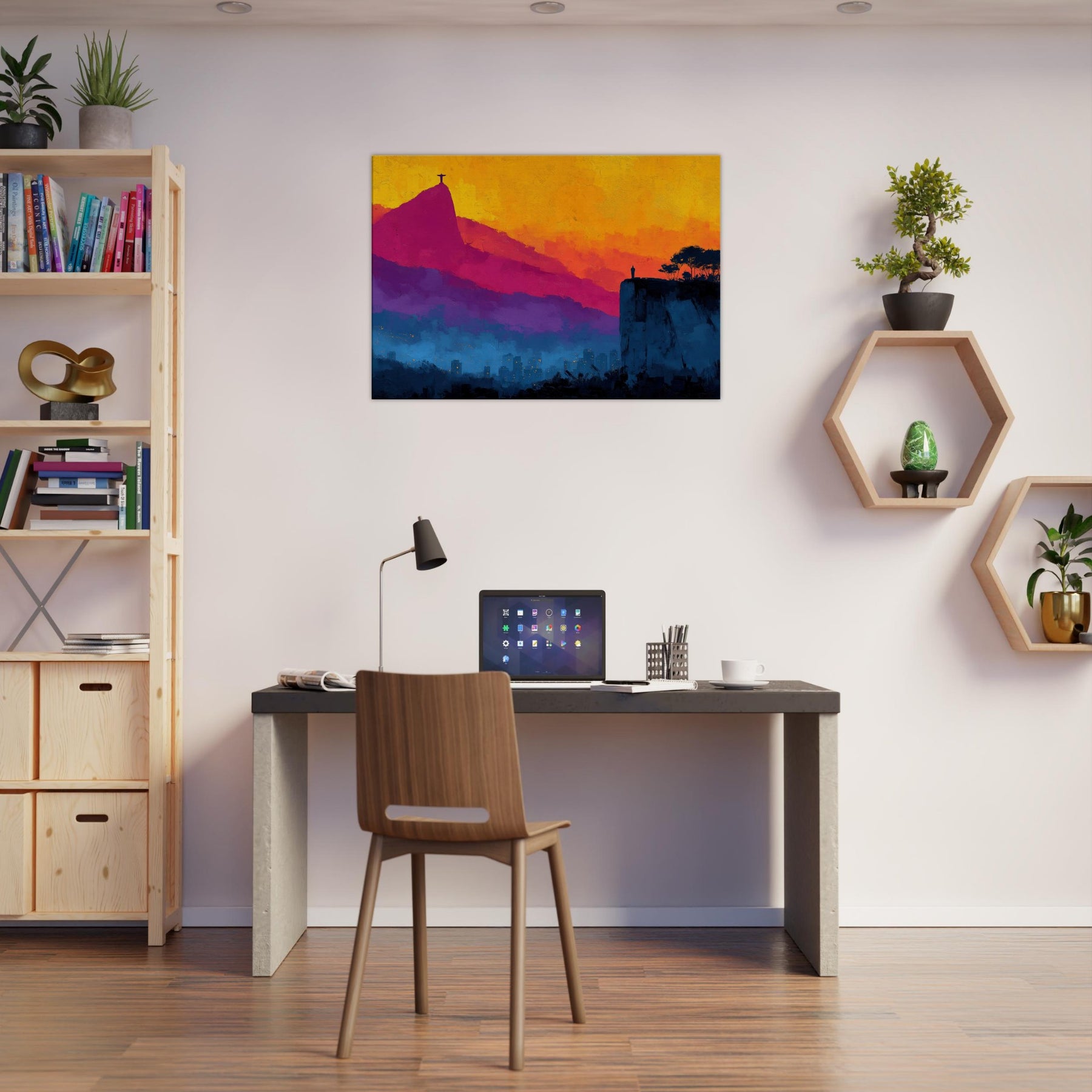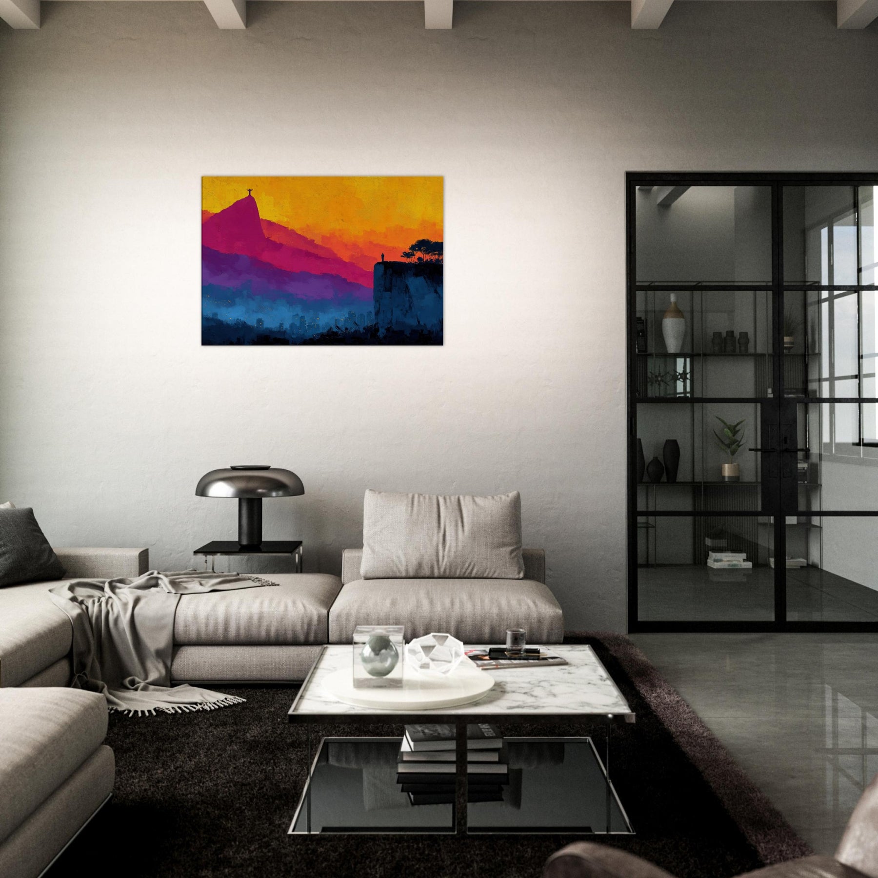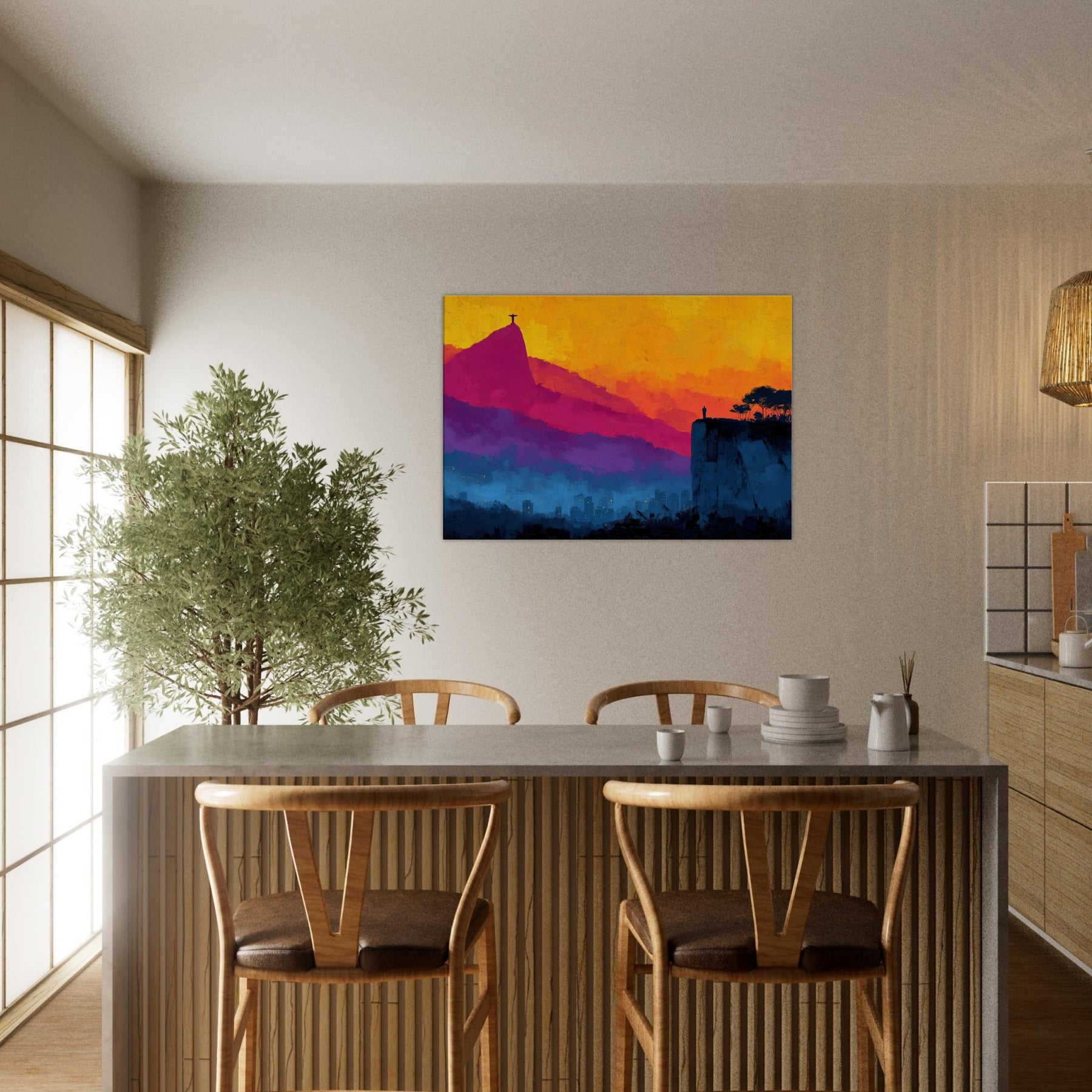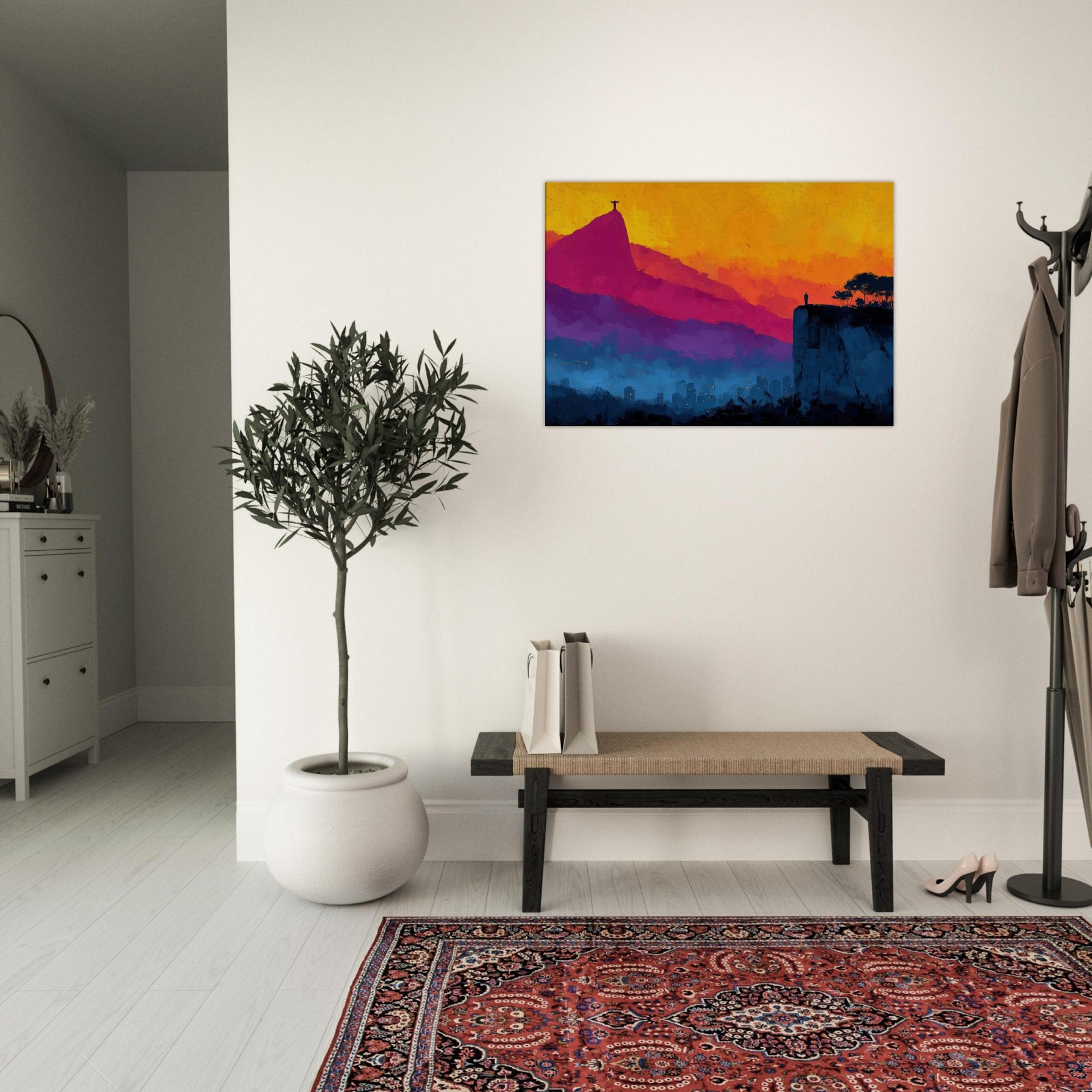 Rio De Janeiro unfurls across the wall in a blaze of color and memory. The warm yellows melt into magenta and deep indigo, while distant city lights glow like embers beneath a dramatic cliff. This abstract homage captures the city’s rhythm the lyric hush of a coastline, the silhouette of hills, the moment before night fully arrives. Perfect for a living room or study, it invites warmth, optimism, and a bold sense of travel into any space.