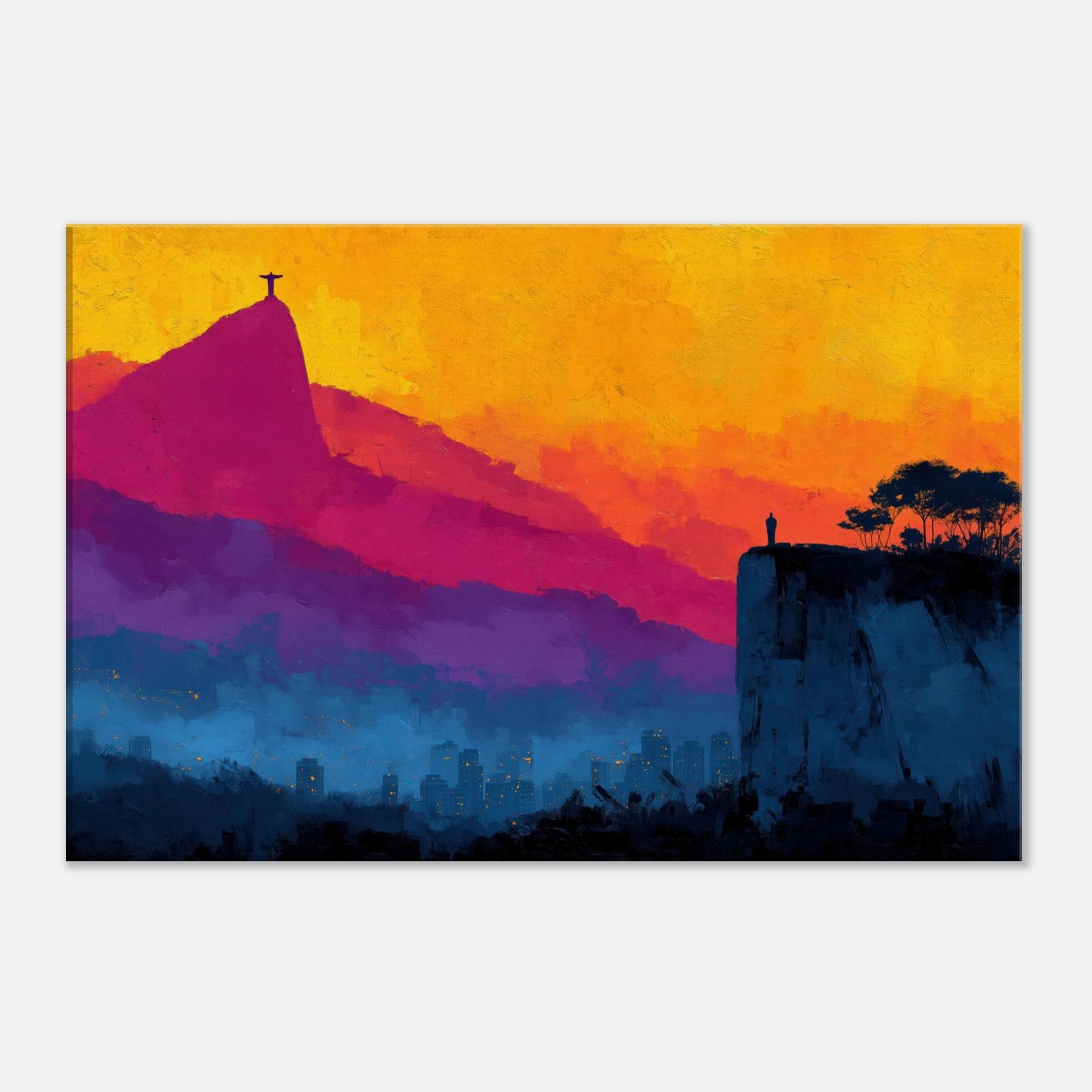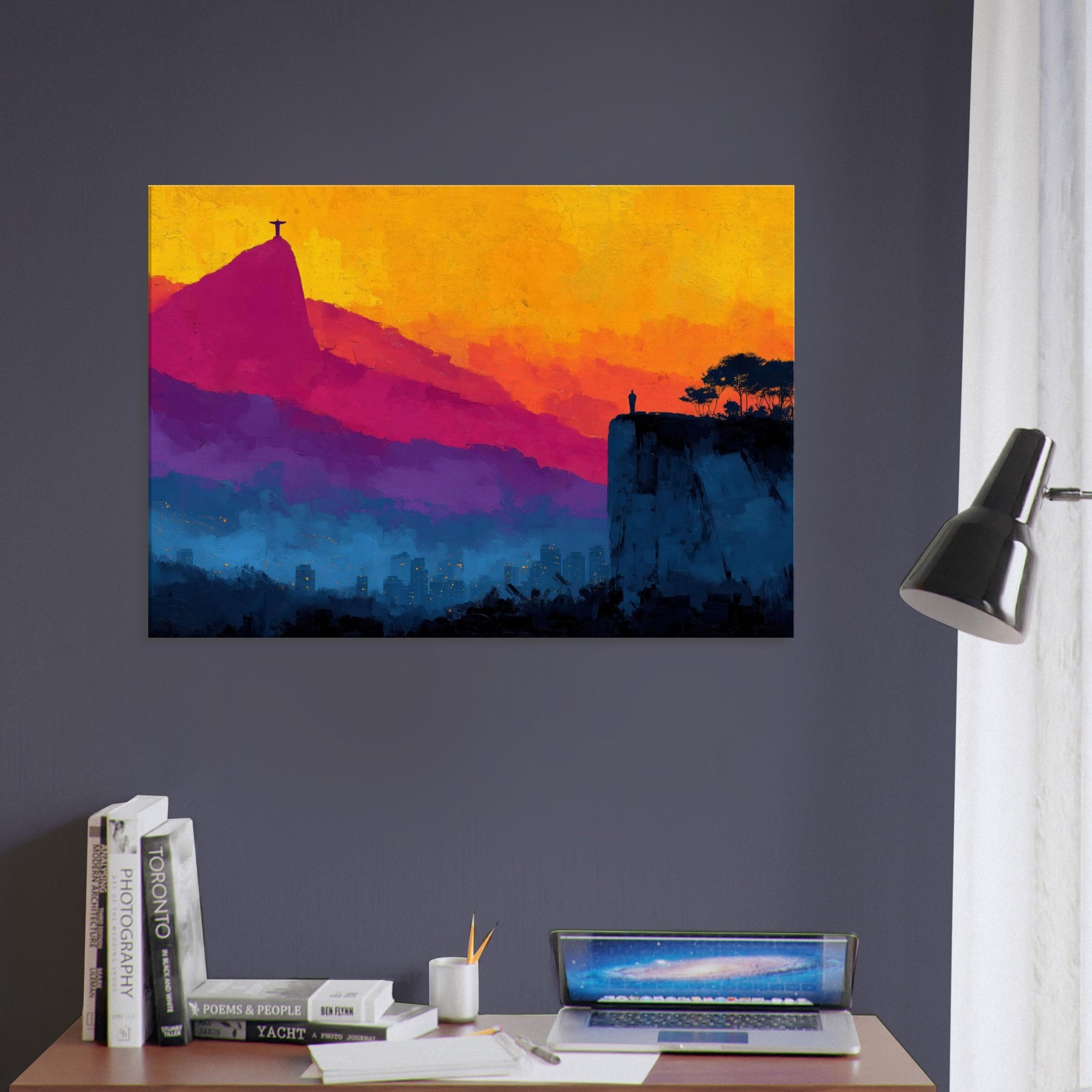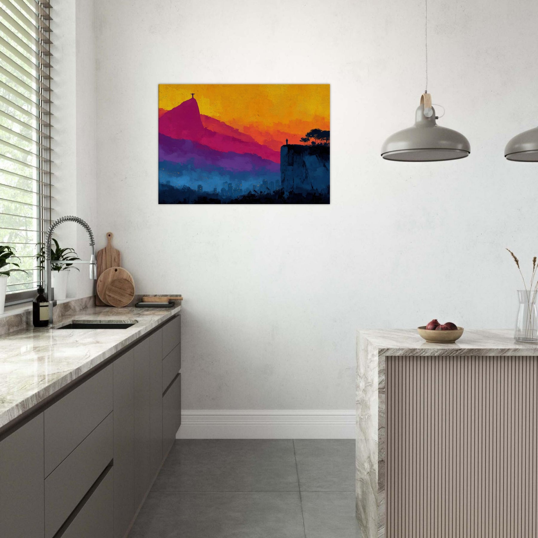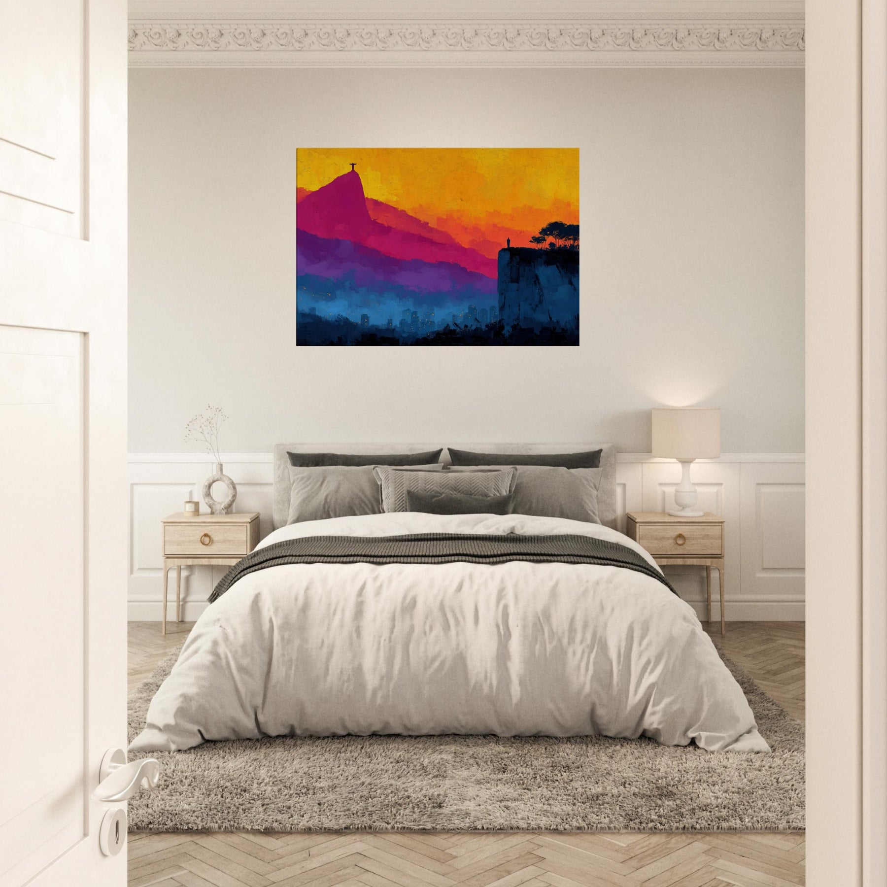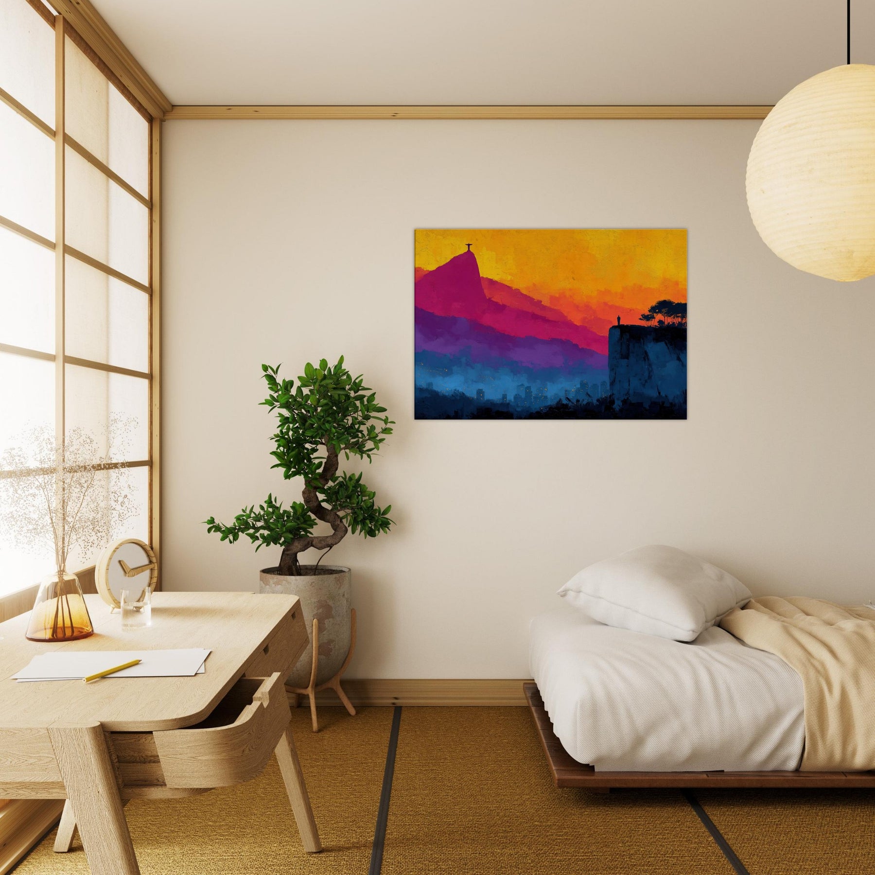 Rio De Janeiro unfurls across the wall in a blaze of color and memory. The warm yellows melt into magenta and deep indigo, while distant city lights glow like embers beneath a dramatic cliff. This abstract homage captures the city’s rhythm the lyric hush of a coastline, the silhouette of hills, the moment before night fully arrives. Perfect for a living room or study, it invites warmth, optimism, and a bold sense of travel into any space.