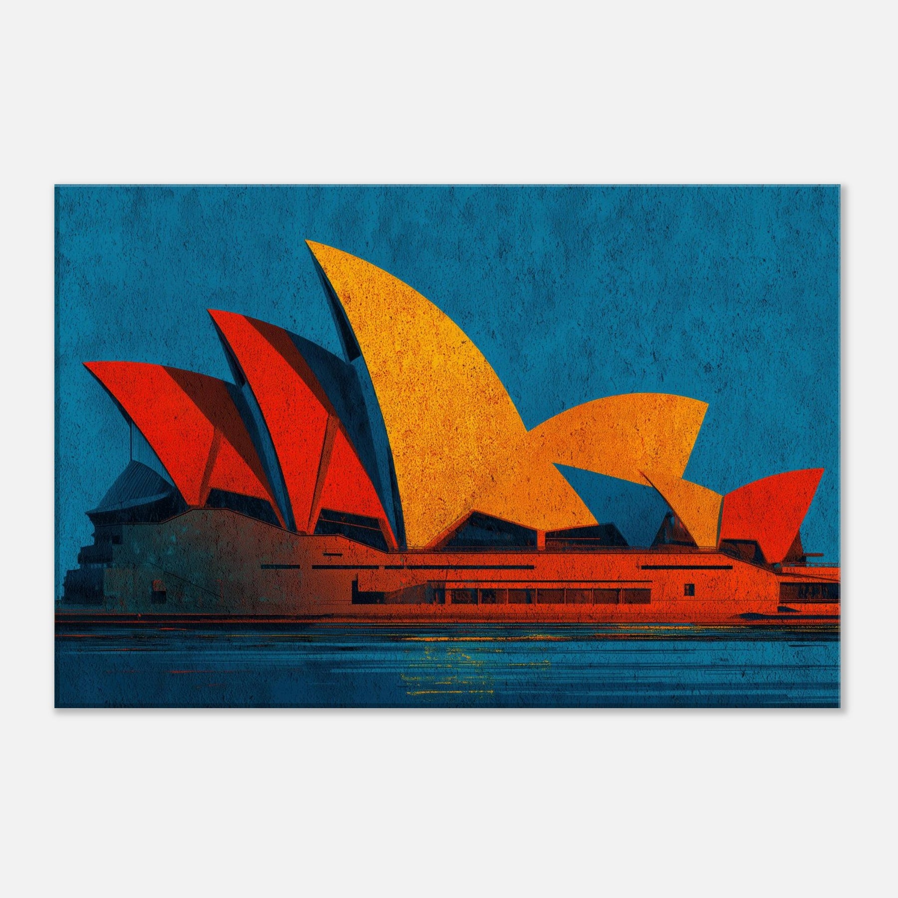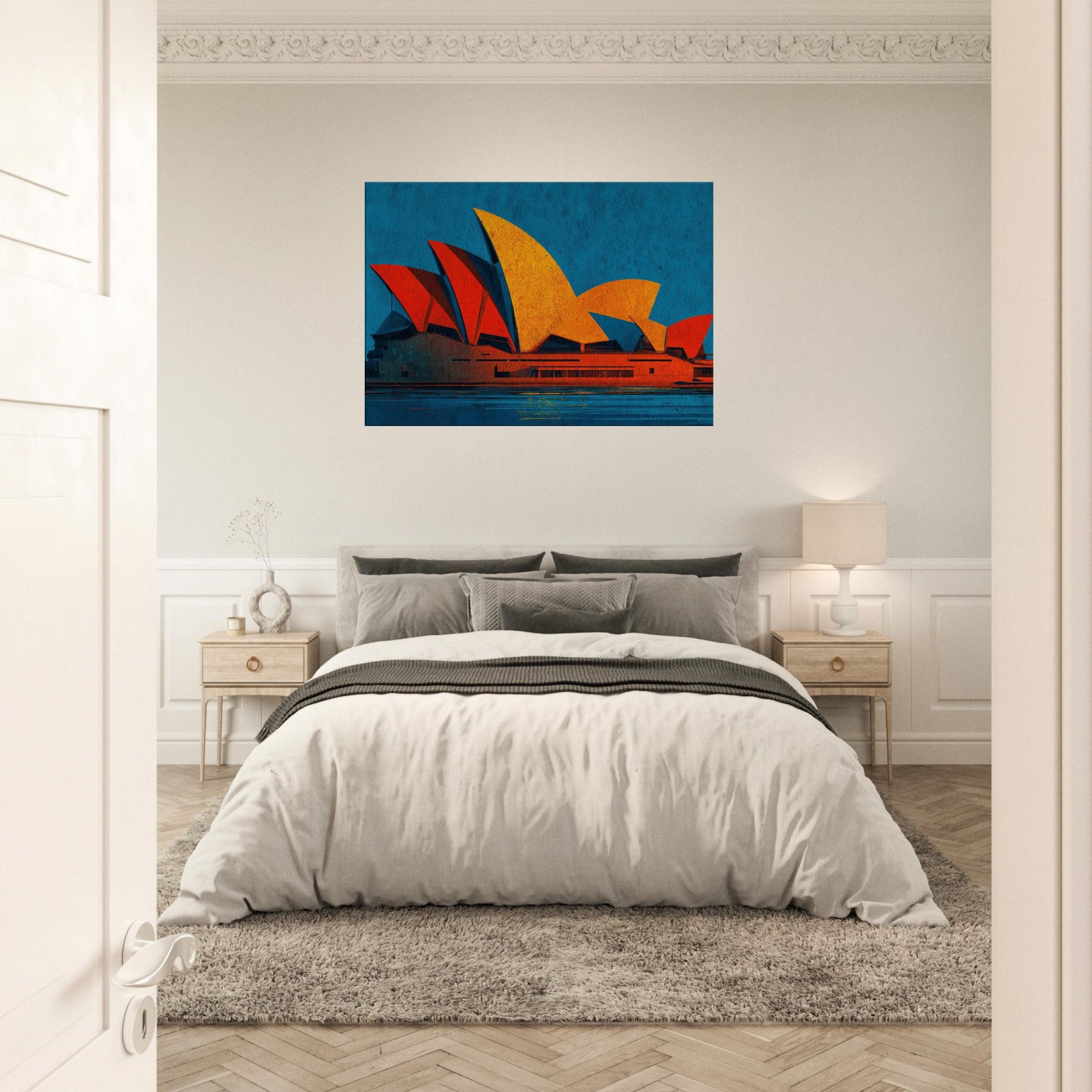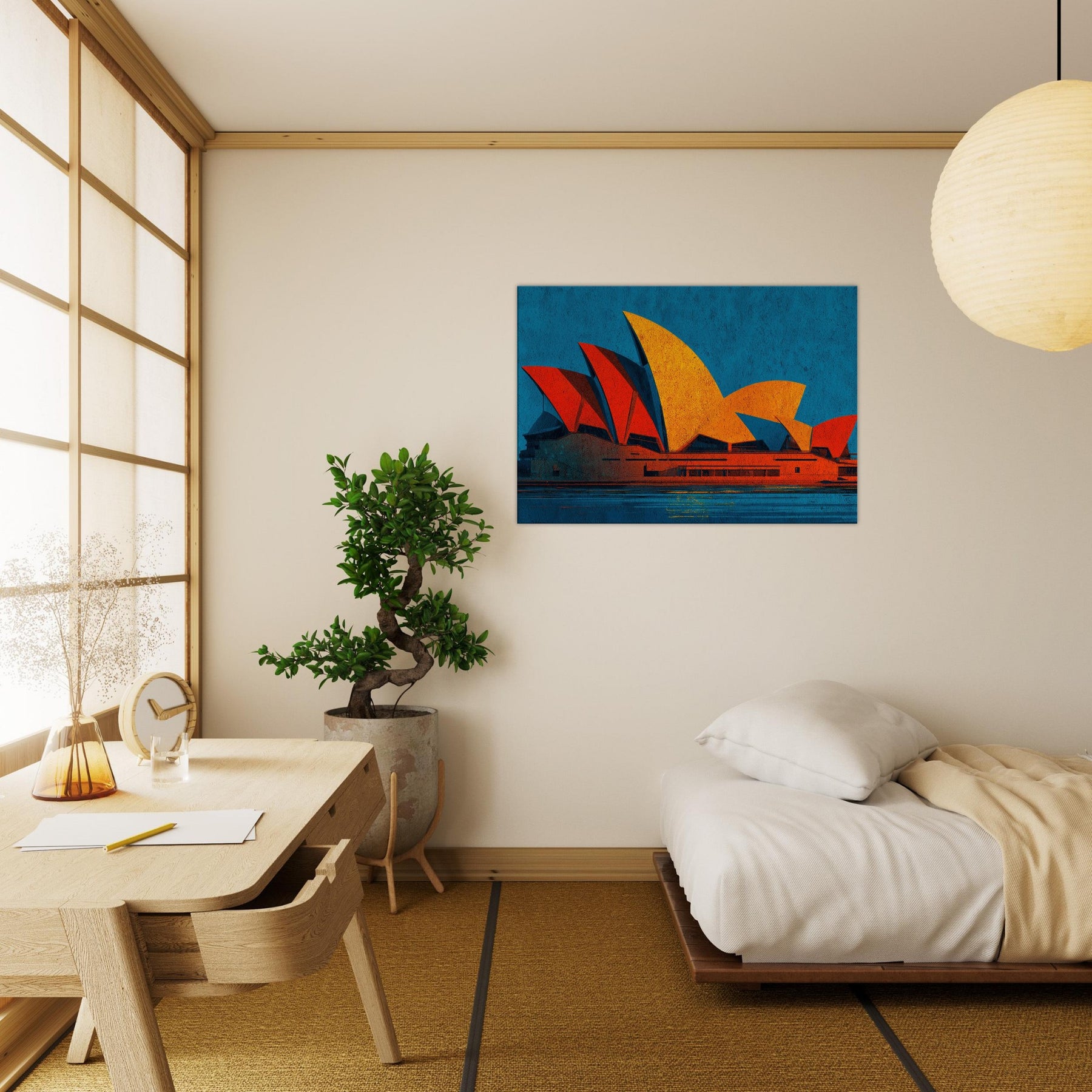 Step near this bold interpretation of the Sydney Opera House, where turbines of color ripple across a shadowed harbor. The abstract storm of flame red sails against a deep cerulean sky creates a kinetic calm like sunset strolling along the water. The gallery friendly balance of warmth and cobalt invites both focus and ease, turning walls into a stage for daily life. Hang it in a living room or study to ignite conversation, deepen texture, and make the room feel both worldly and intimately home.