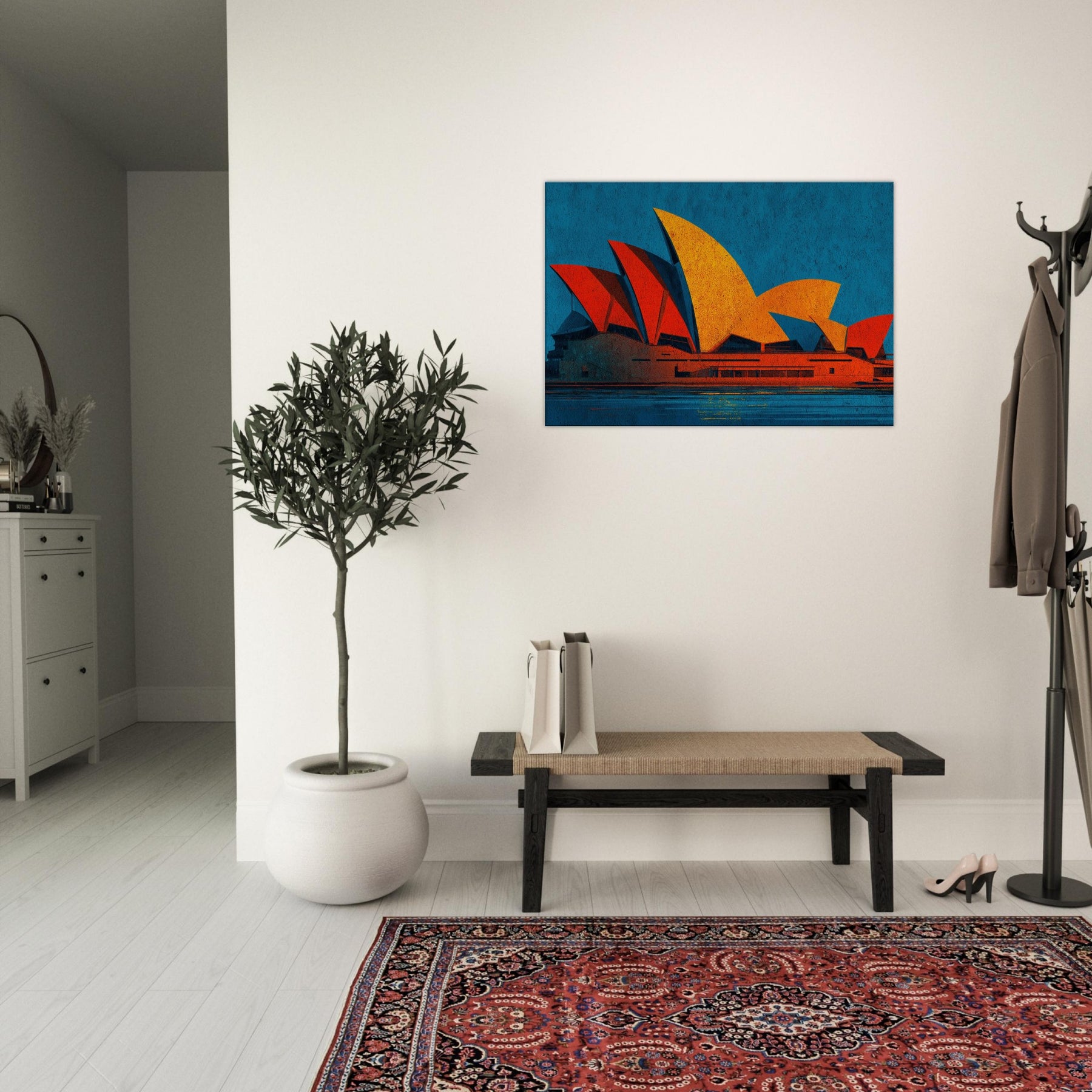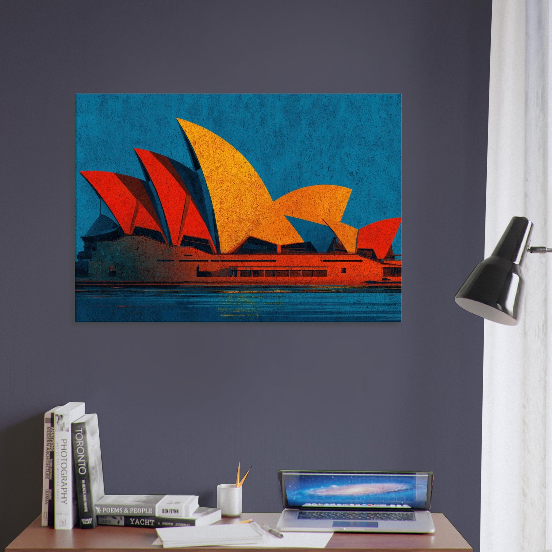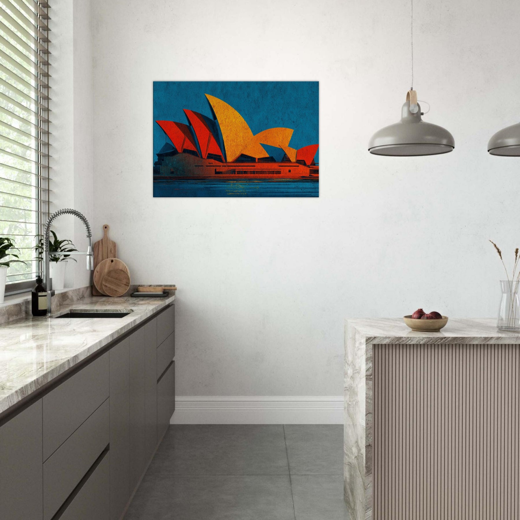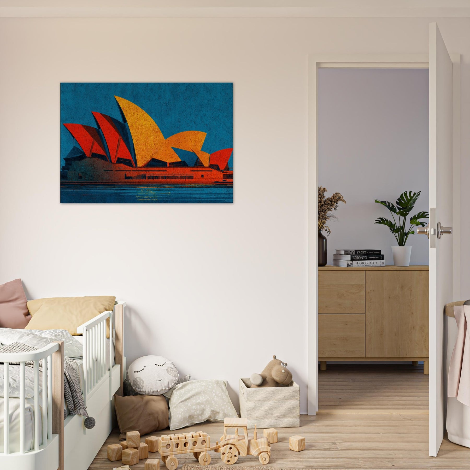 Step near this bold interpretation of the Sydney Opera House, where turbines of color ripple across a shadowed harbor. The abstract storm of flame red sails against a deep cerulean sky creates a kinetic calm like sunset strolling along the water. The gallery friendly balance of warmth and cobalt invites both focus and ease, turning walls into a stage for daily life. Hang it in a living room or study to ignite conversation, deepen texture, and make the room feel both worldly and intimately home.