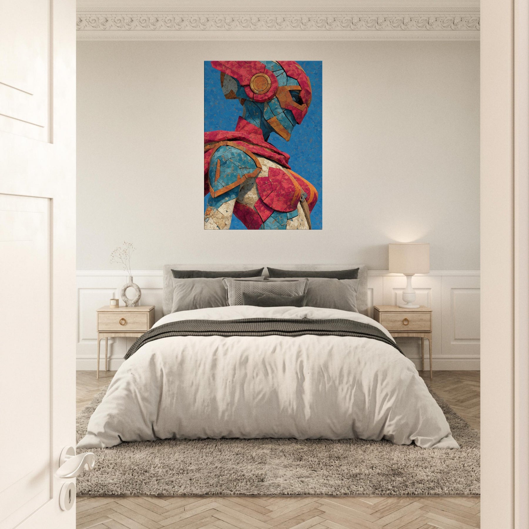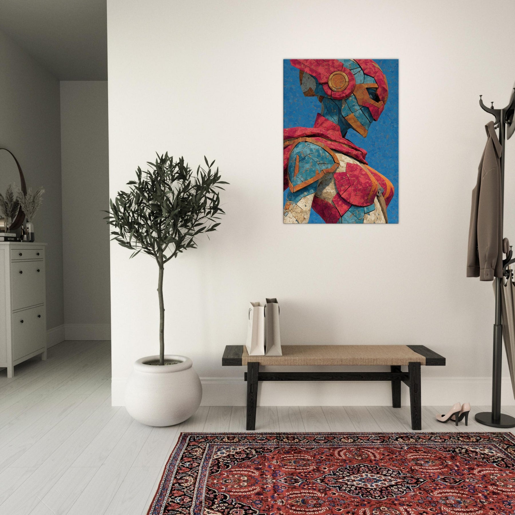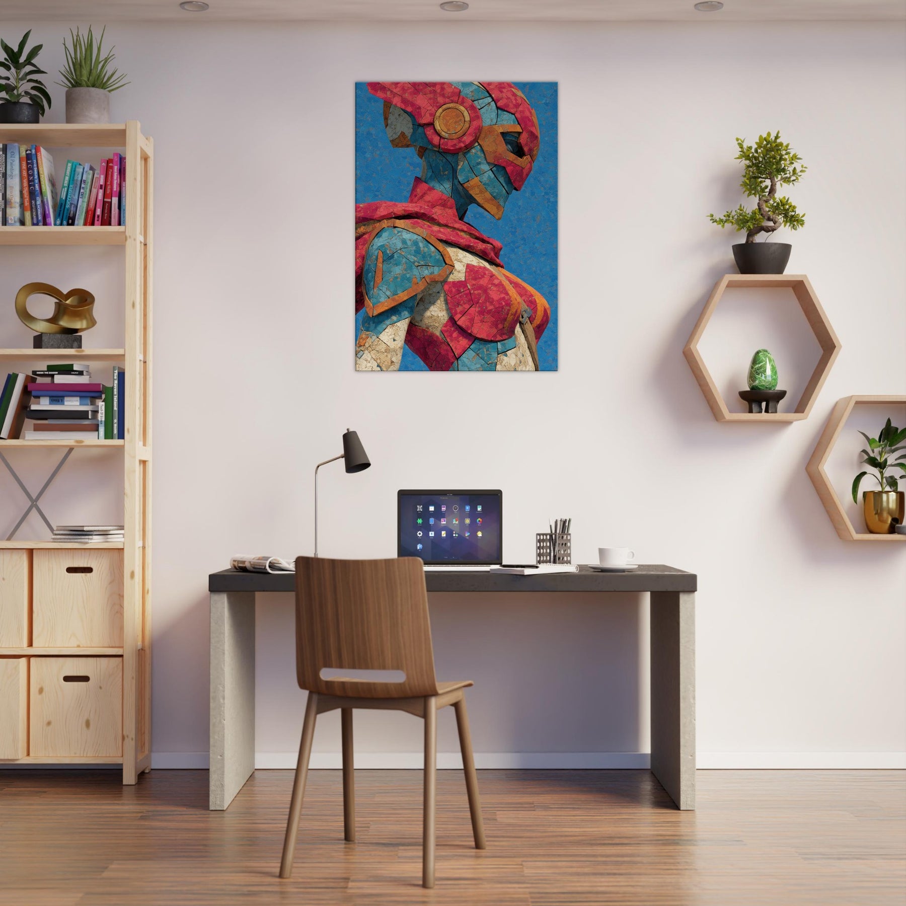 Step into a room where a Valkyrie strides through a storm of color. This abstract interpretation stitches vibrant shards of pink, blue, and bronze into a radiant silhouette, as if light itself were forged into armor. The piece exudes motion and reverent strength, a nocturnal guardian that catches sunbeams and soft lamps alike, turning any wall into a beacon of myth and modernity. Hang it to evoke transcendence in your living space, inviting contemplation, bold energy, and dreamlike escapism.